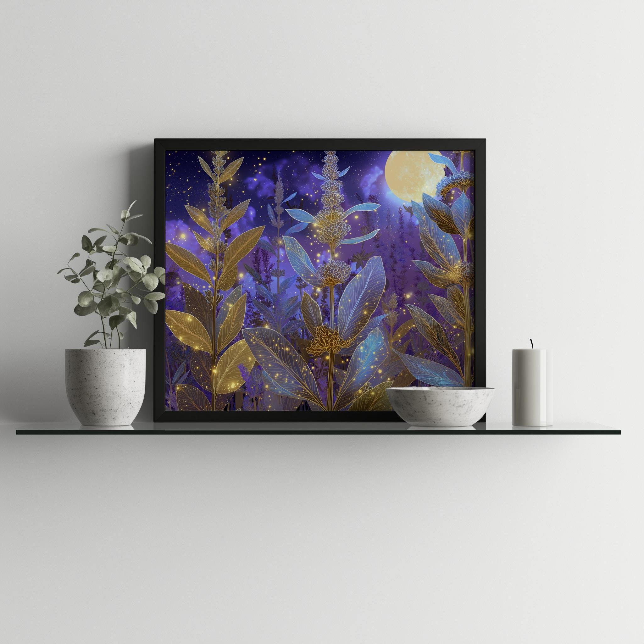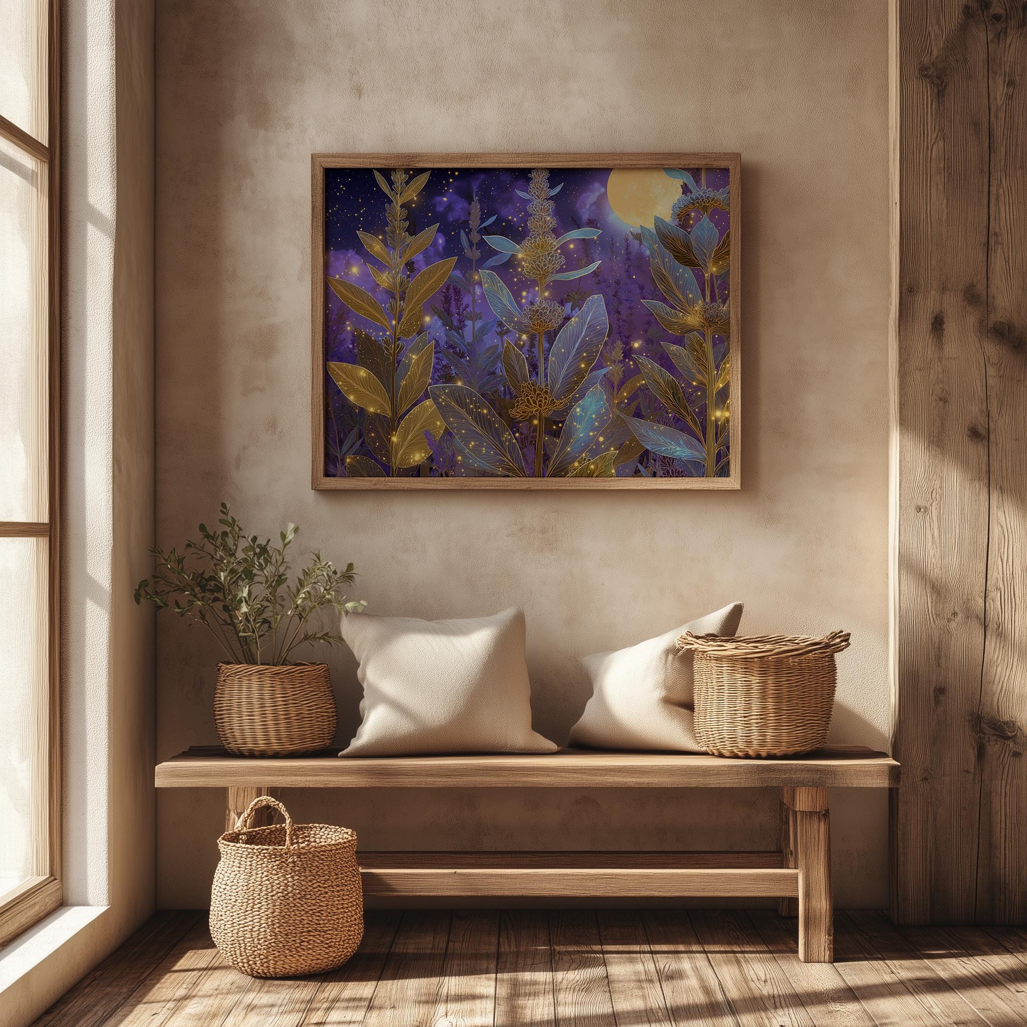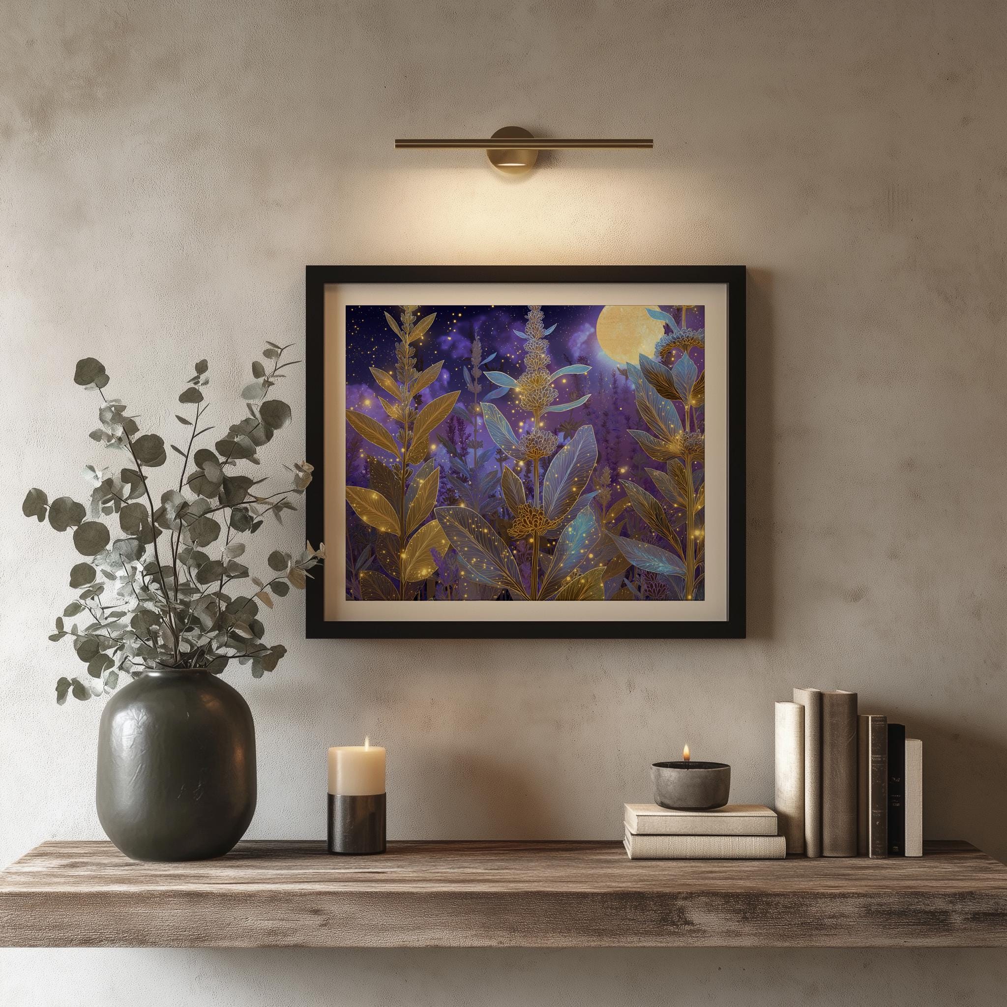 Lavender Botanical Printable Wall Art - Enchanting Herb Scene for Your Home This stunning printable wall art features a captivating lavender botanical scene, perfect for bringing a touch of nature's beauty into your space. The glowing herb design evokes a sense of tranquility and magic, making it ideal for rustic cottagecore decor. Whether displayed in your bedroom or living room, this digital painting will transform your walls into a serene retreat. Perfect for spring and summer, adding a fresh and vibrant touch to your decor.
