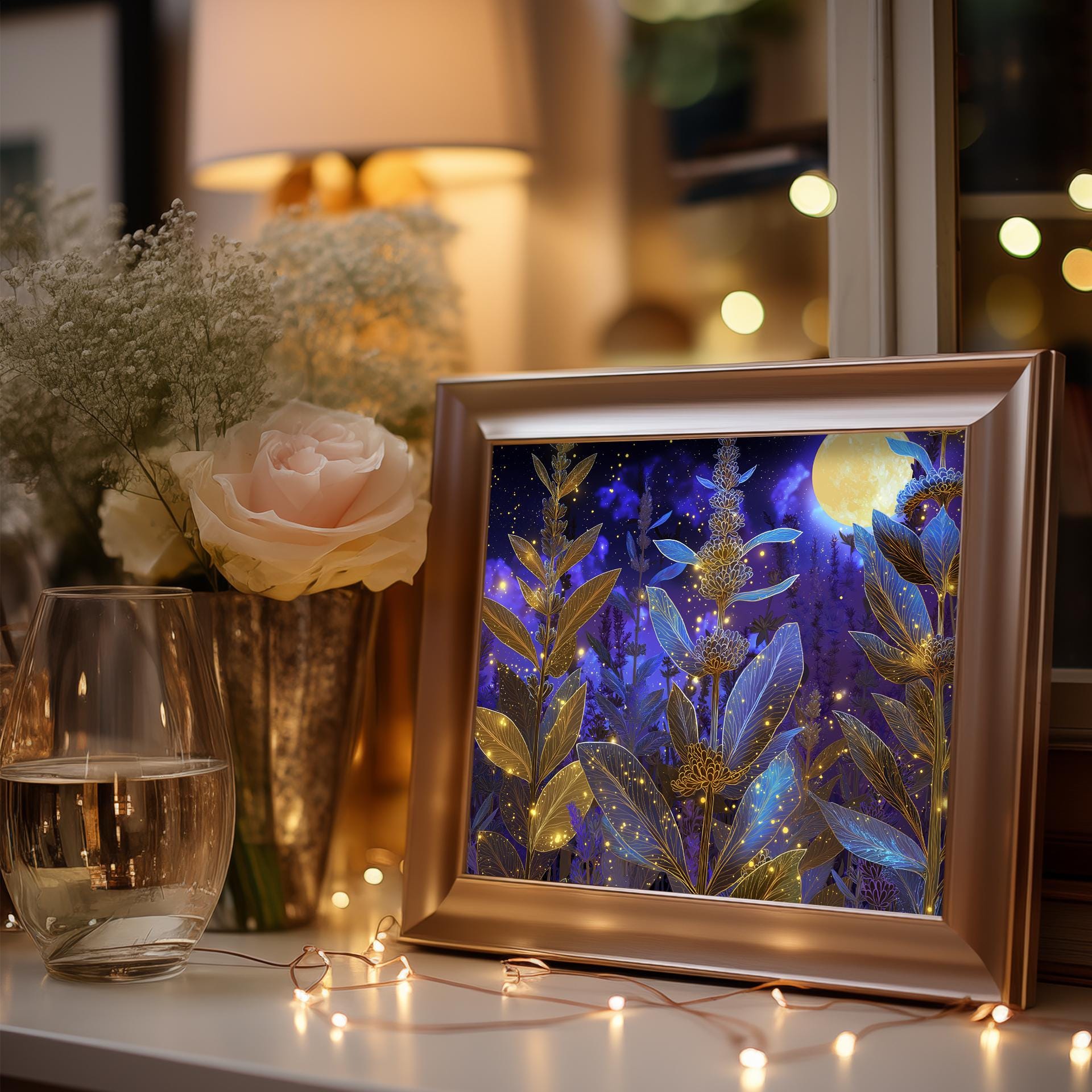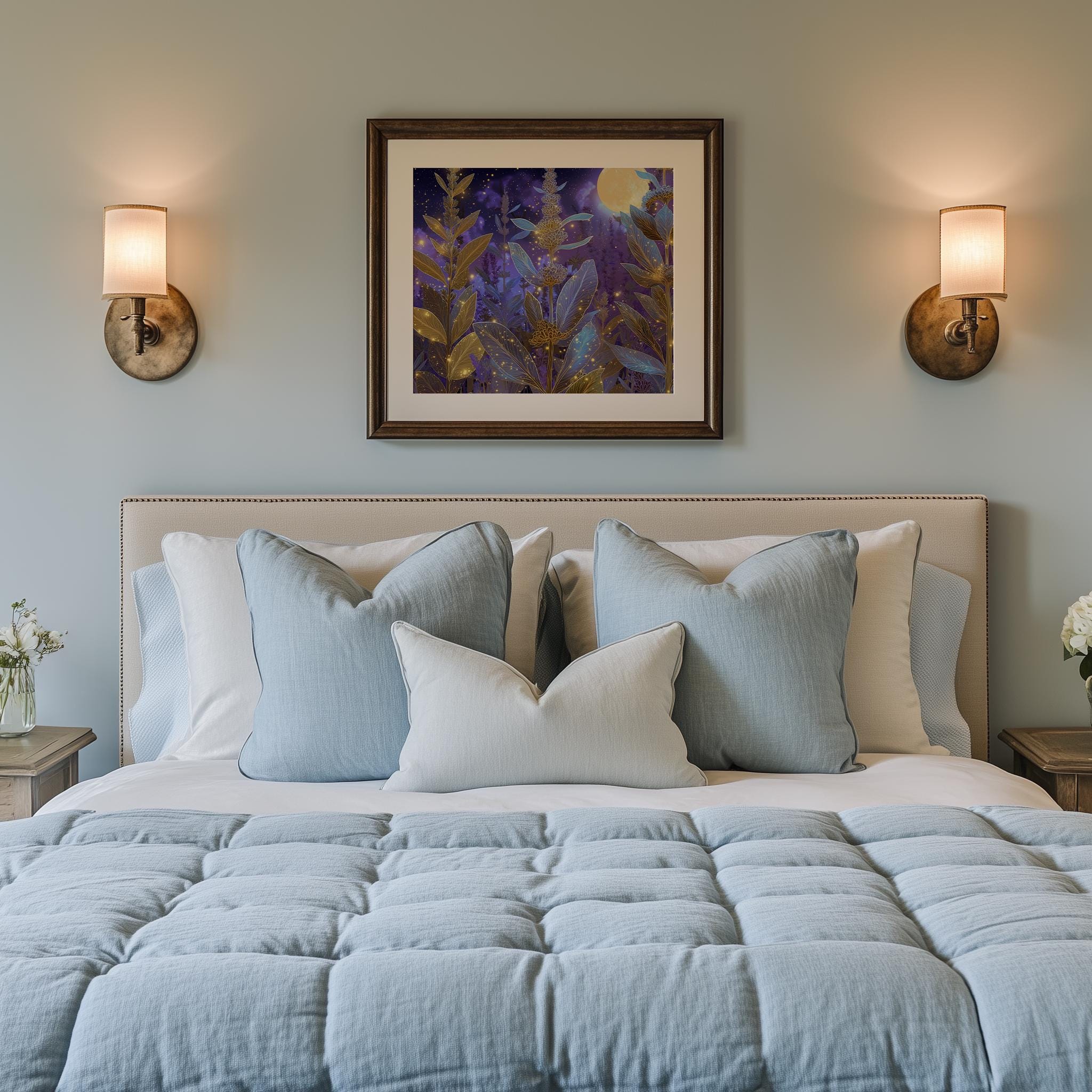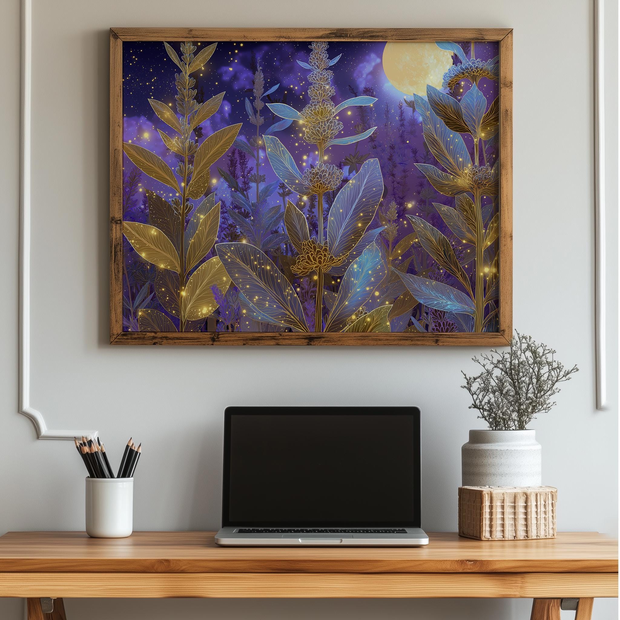 Lavender Botanical Printable Wall Art - Enchanting Herb Scene for Your Home This stunning printable wall art features a captivating lavender botanical scene, perfect for bringing a touch of nature's beauty into your space. The glowing herb design evokes a sense of tranquility and magic, making it ideal for rustic cottagecore decor. Whether displayed in your bedroom or living room, this digital painting will transform your walls into a serene retreat. Perfect for spring and summer, adding a fresh and vibrant touch to your decor.