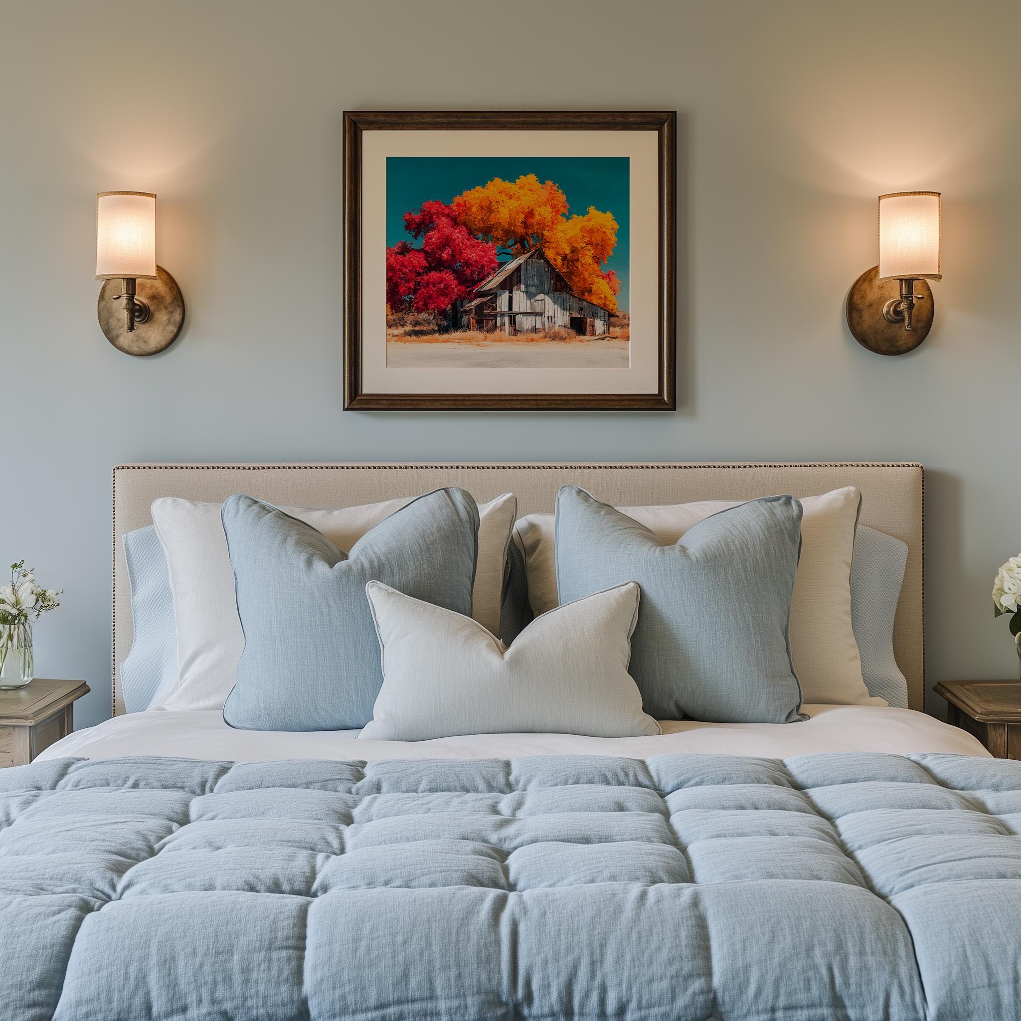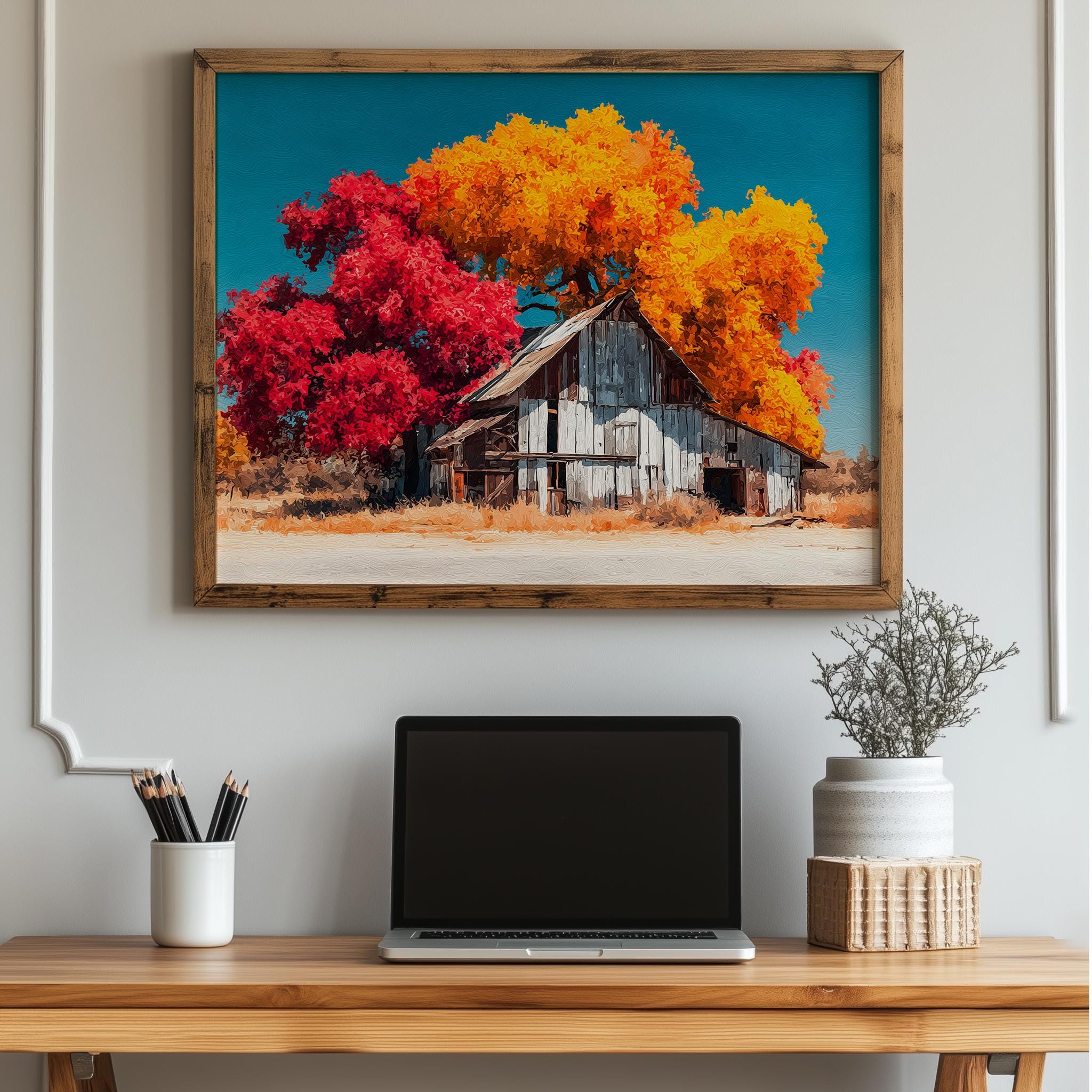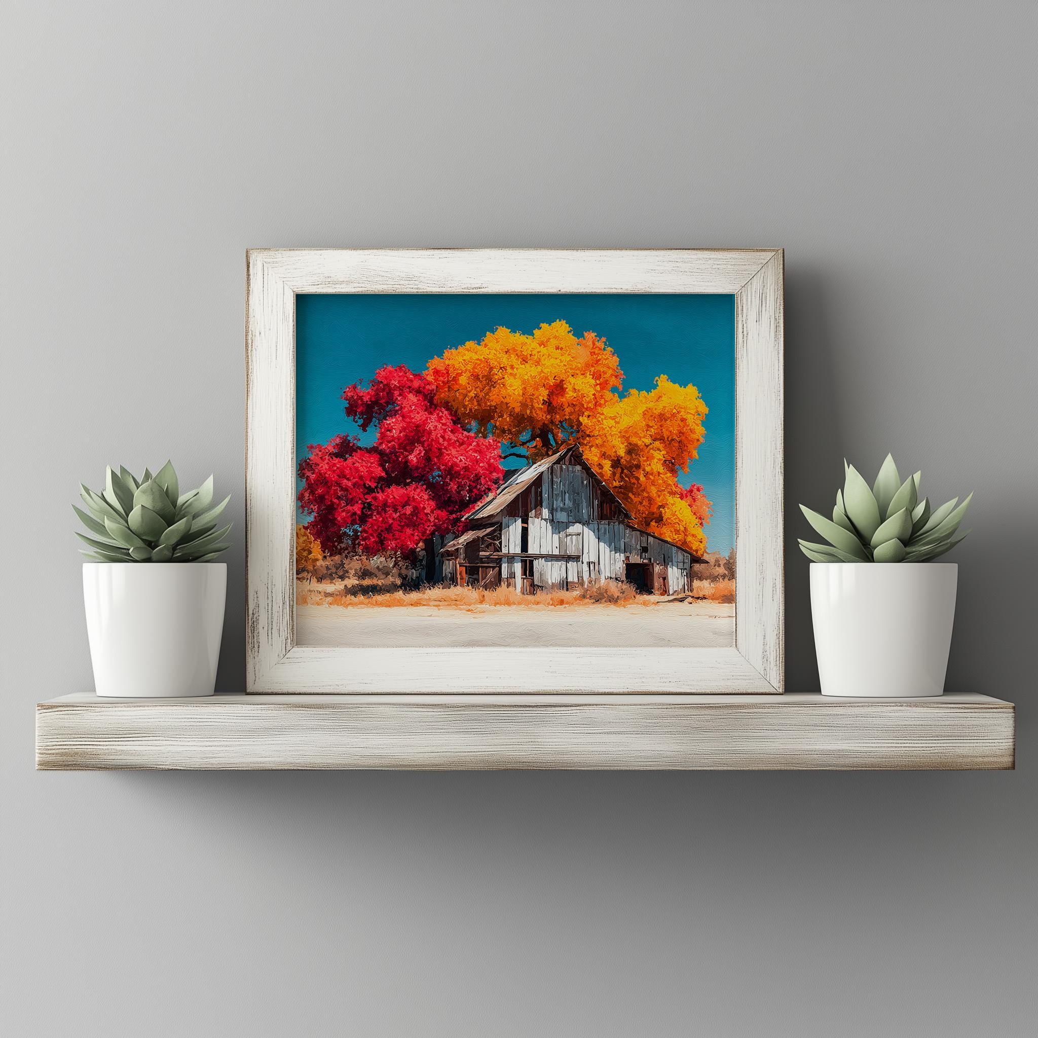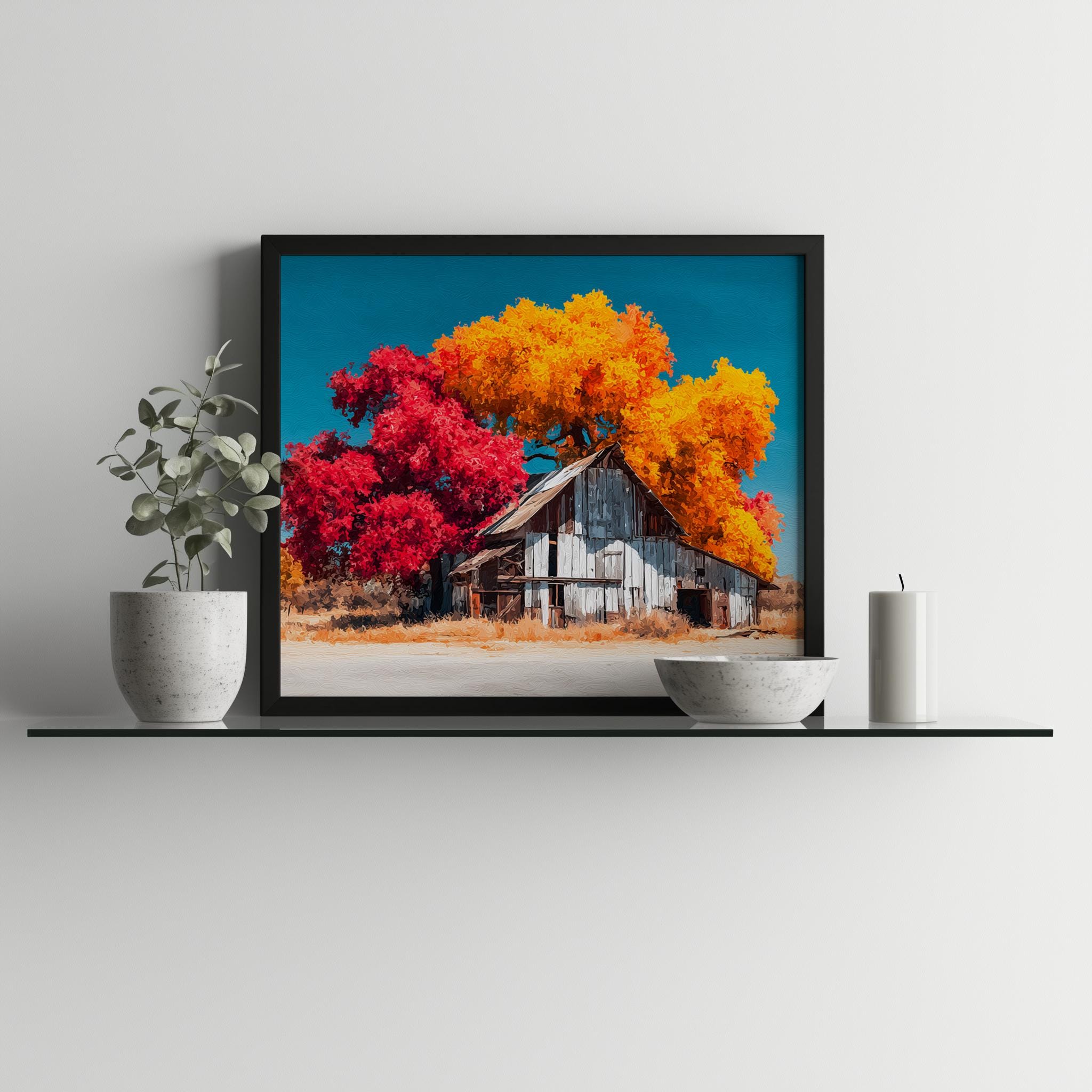 Rustic Barn Autumn Print - Embrace the Beauty of Fall This stunning print captures the essence of autumn with vibrant fall colors, showcasing a cozy barn nestled in a sprawling landscape. Perfect for adding a touch of cottagecore charm to your home, this printable wall art evokes feelings of warmth and nostalgia, making it an ideal piece for any country decor enthusiast. Autumn