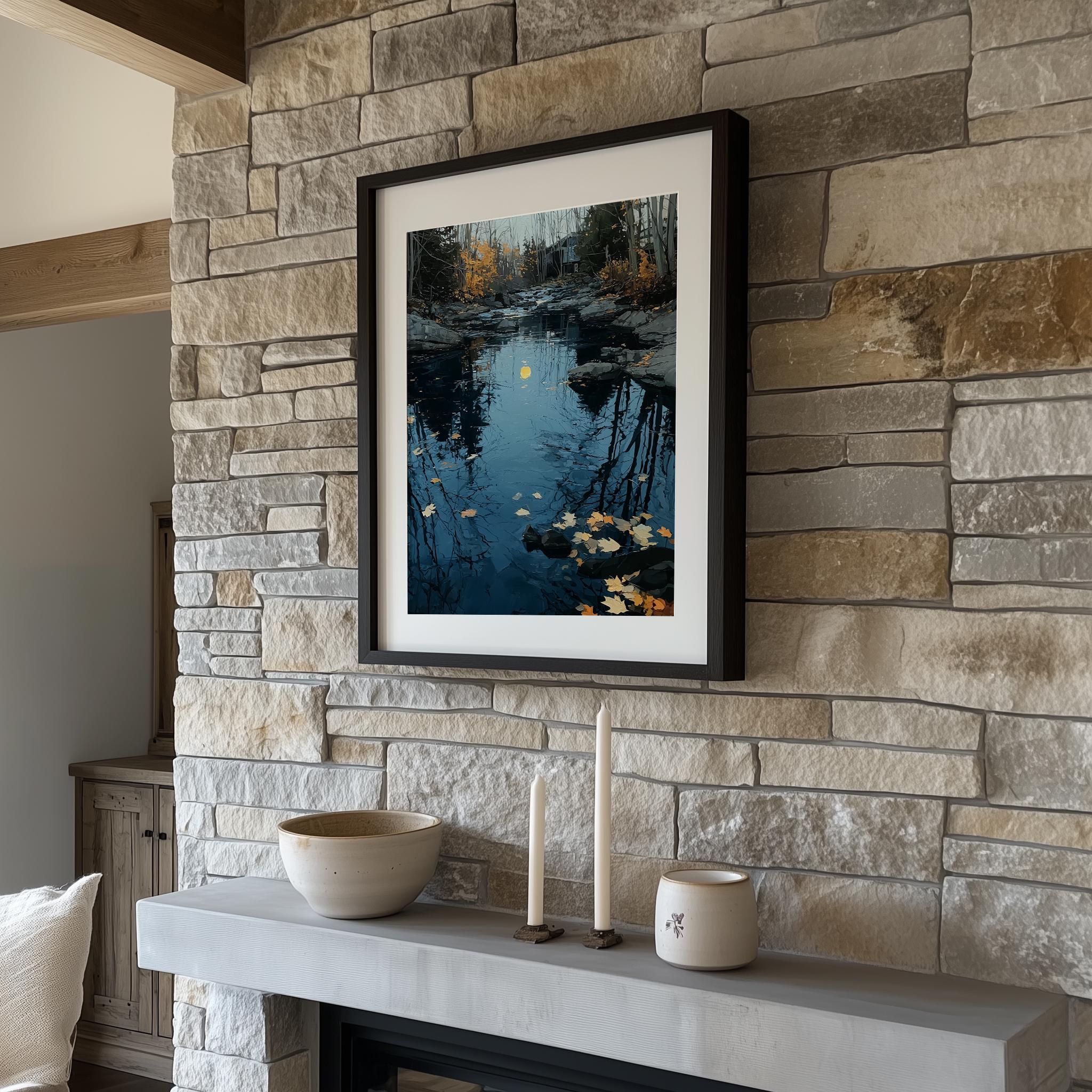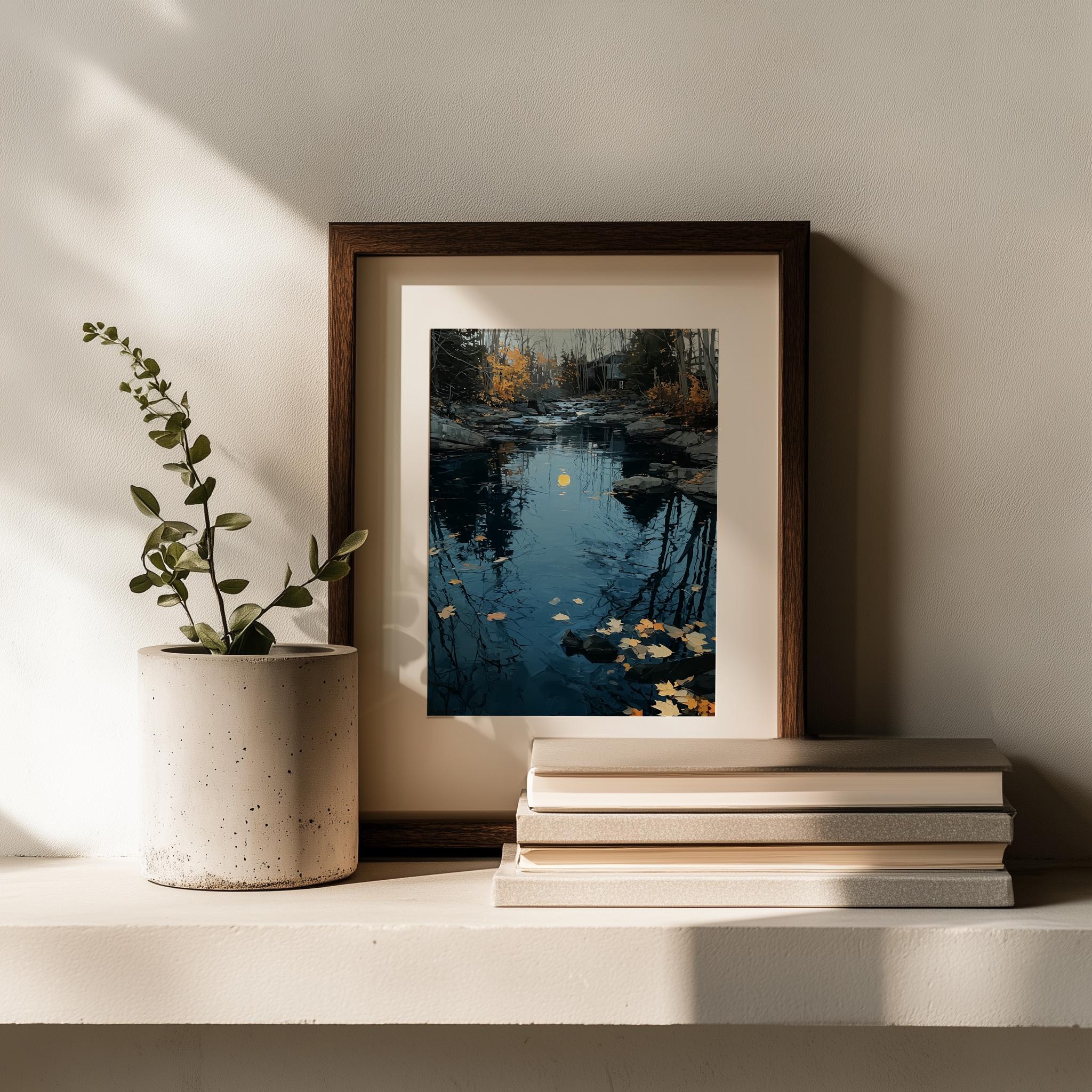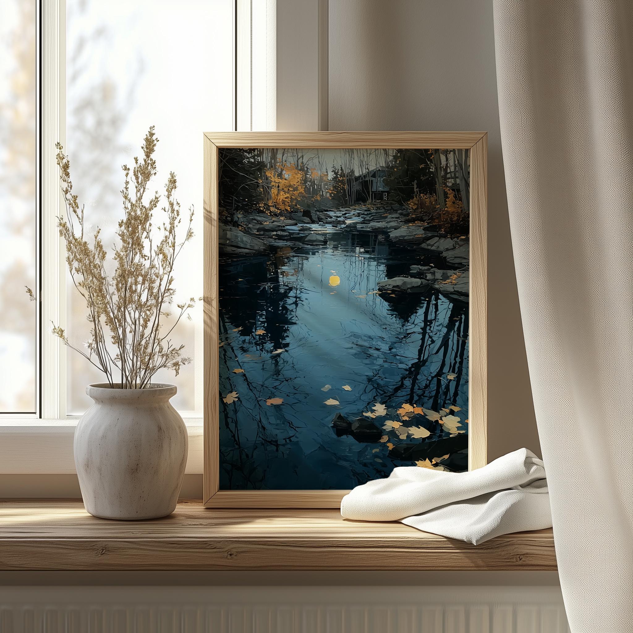 Rustic River Reflection Art - Moody River Oil Painting Immerse yourself in the serene beauty of this moody river oil painting, capturing the essence of autumn with its rich colors and textured brushstrokes. This vintage-inspired landscape evokes a sense of nostalgia, making it a perfect addition to any rustic or cottagecore decor. With its enchanting reflection of the river, this artwork brings a touch of nature's tranquility into your home. Fall