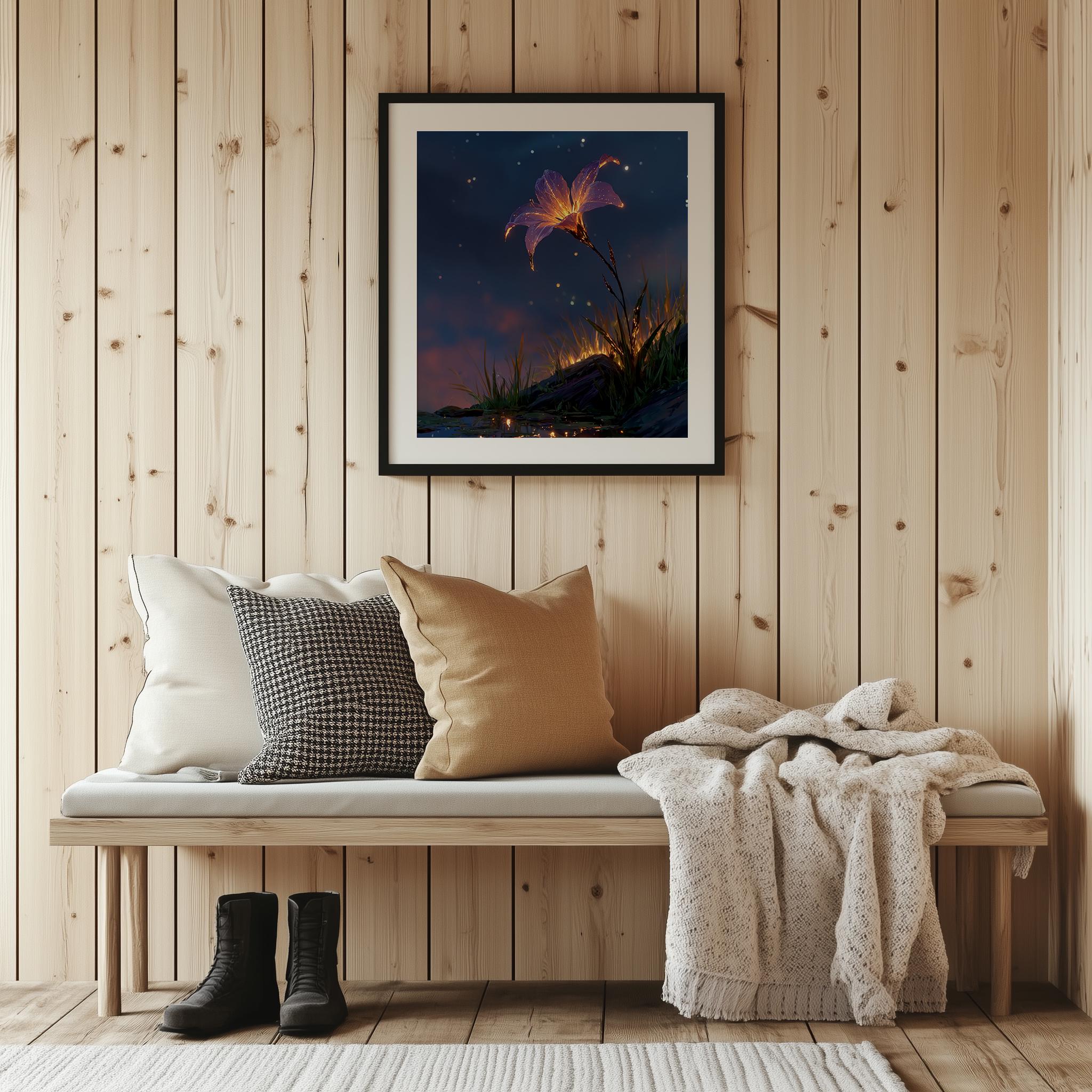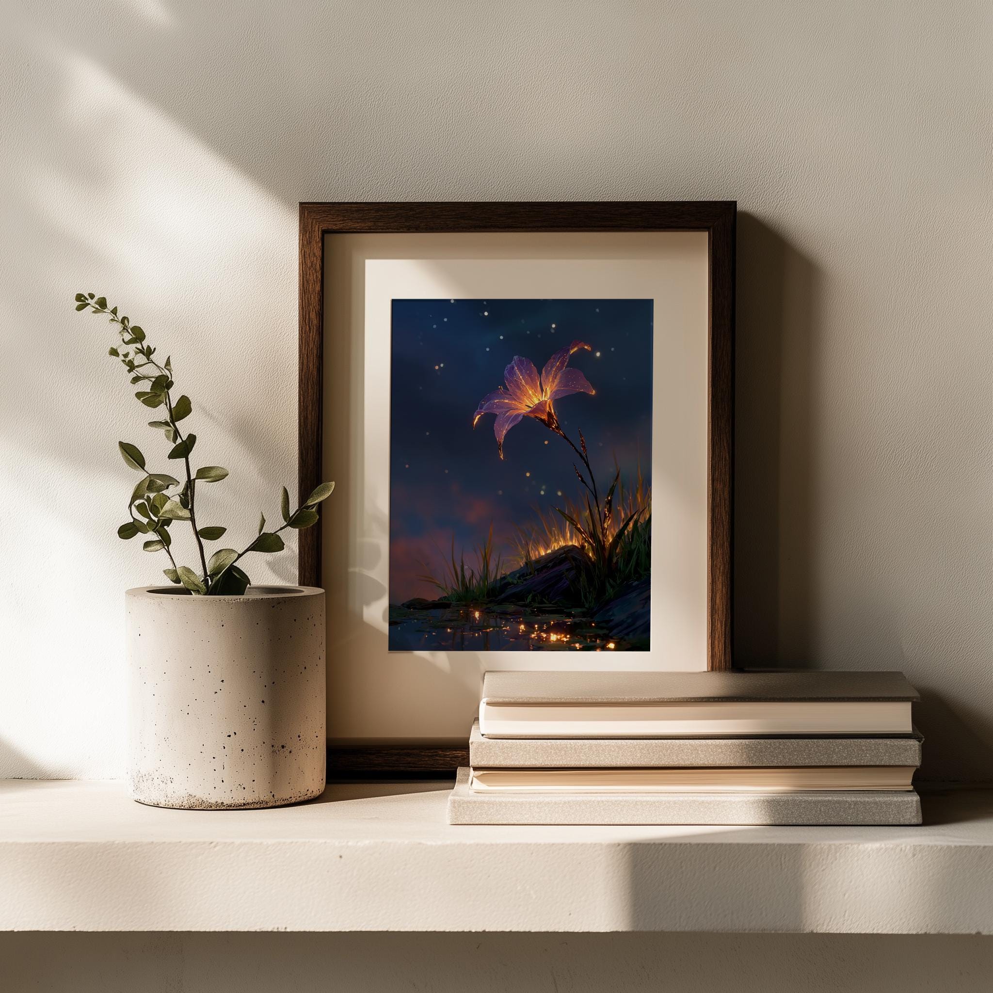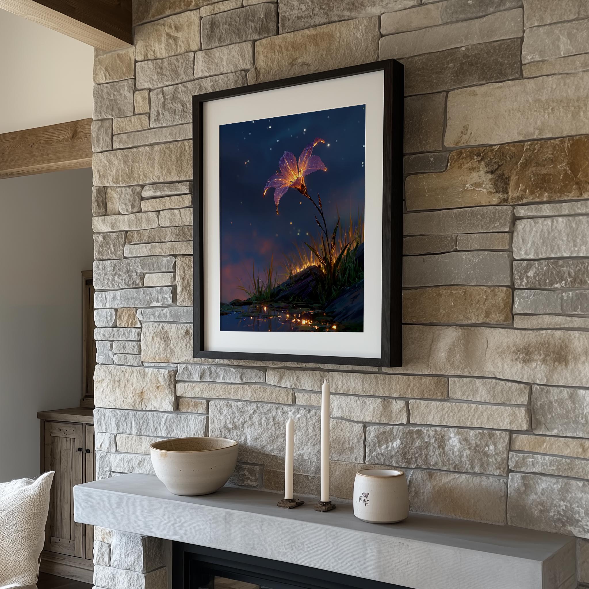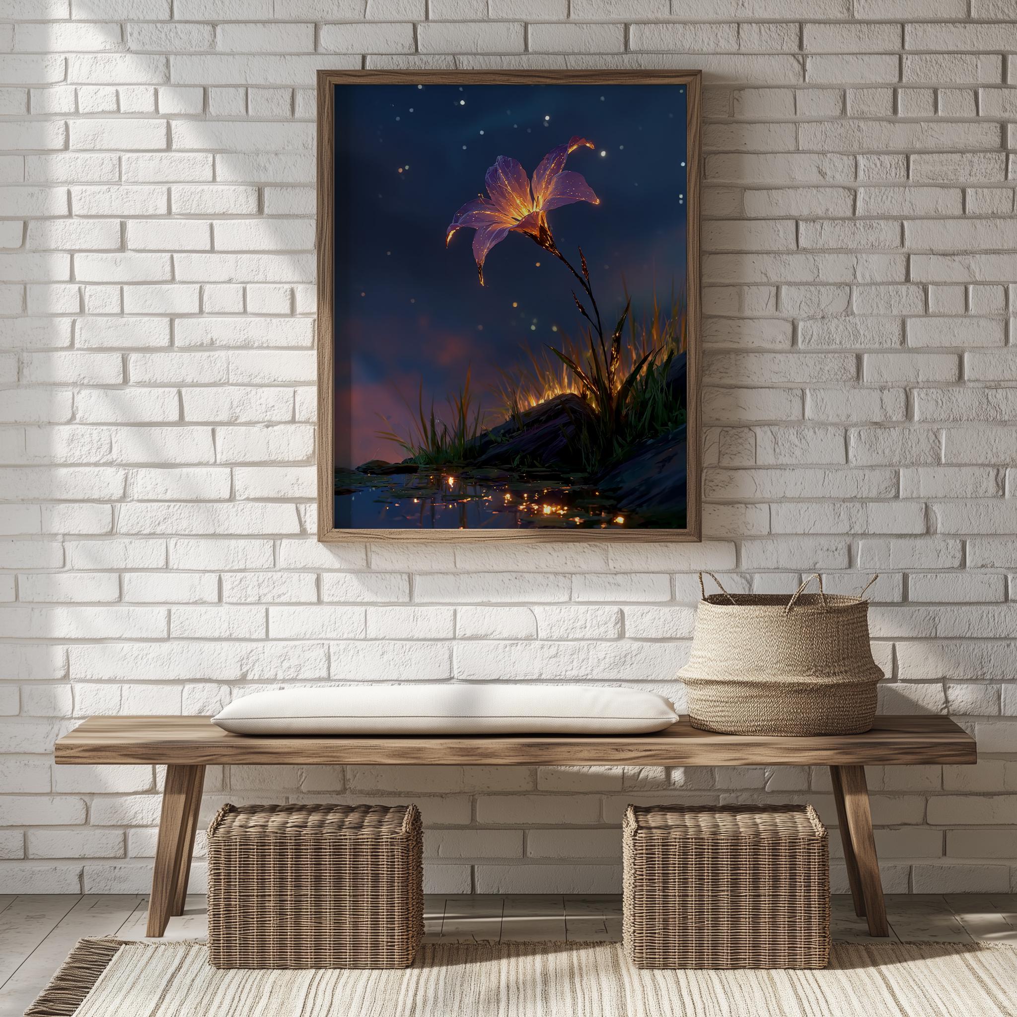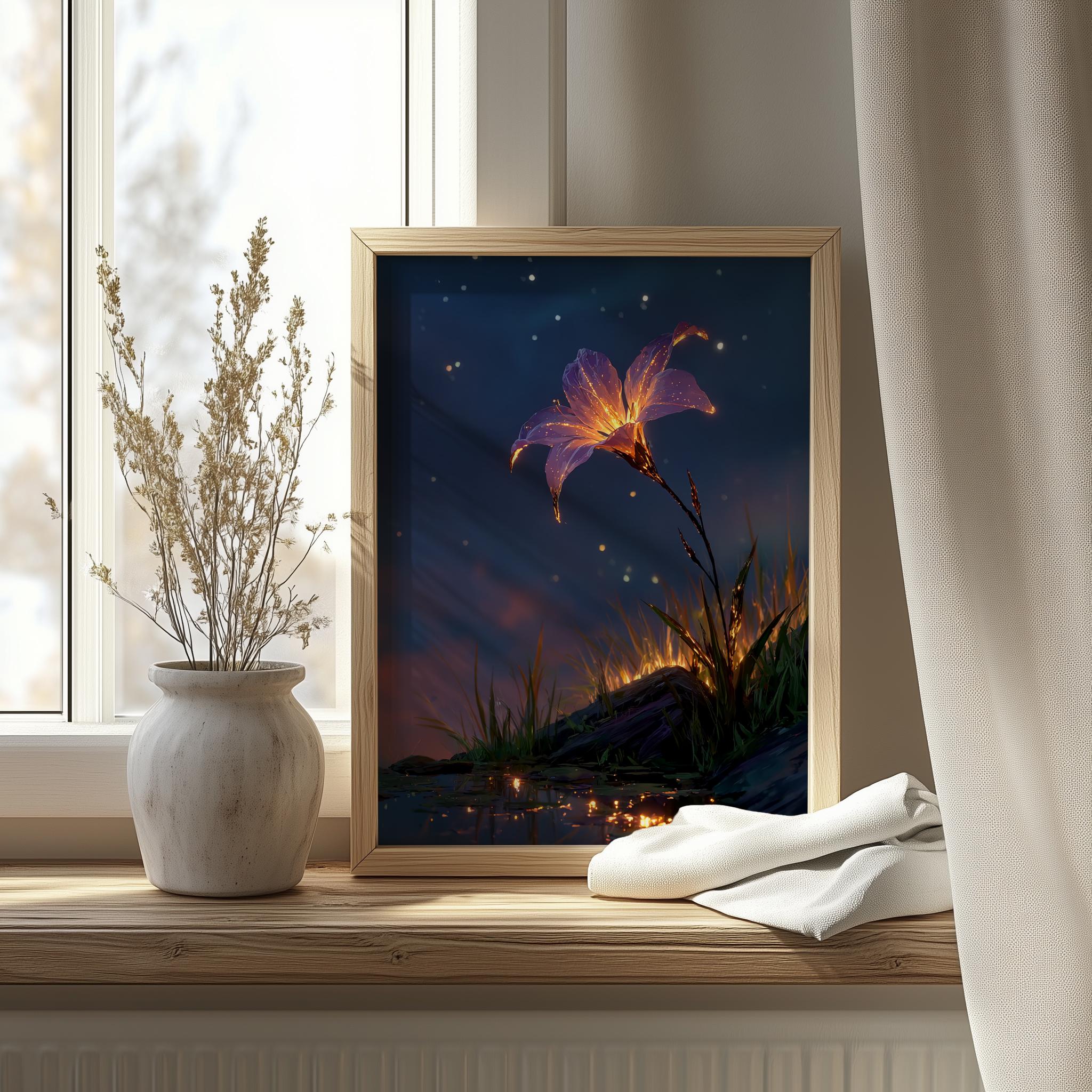 Starflower Bloom in Night Sky - Printable Wall Art This enchanting artwork captures the ethereal beauty of a radiant starflower blooming under a moody night sky, perfect for adding a touch of cottagecore charm to your home. Ideal for creating a serene atmosphere, this digital print brings together the delicate nuances of nature and the tranquil vibe of a sunset landscape, making it a versatile addition to your wall decor. Perfect for all seasons, it adds a cozy and whimsical touch to any room throughout the year.