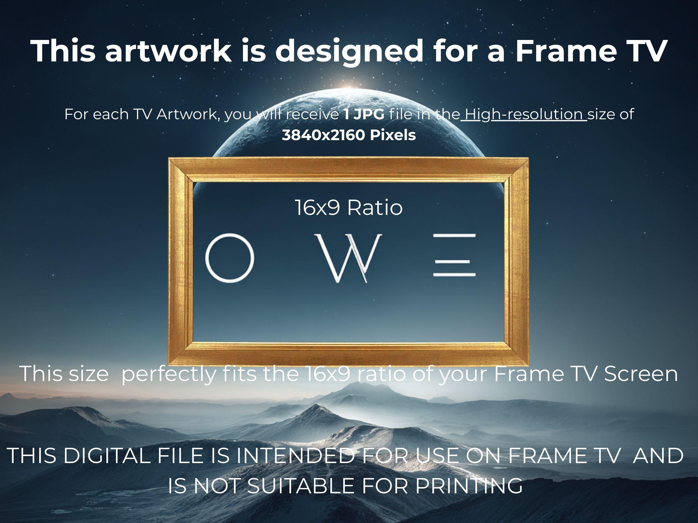 With this purchase from OtherWorld Editions, you will receive 1 high-resolution JPG file sized at 3840 x 2160 pixels (16:9 ratio). This size is specifically designed to fit Samsung Frame TVs perfectly, but can also be displayed on most modern widescreen TVs.