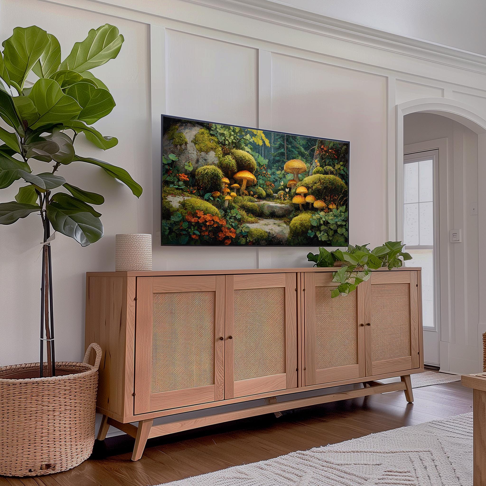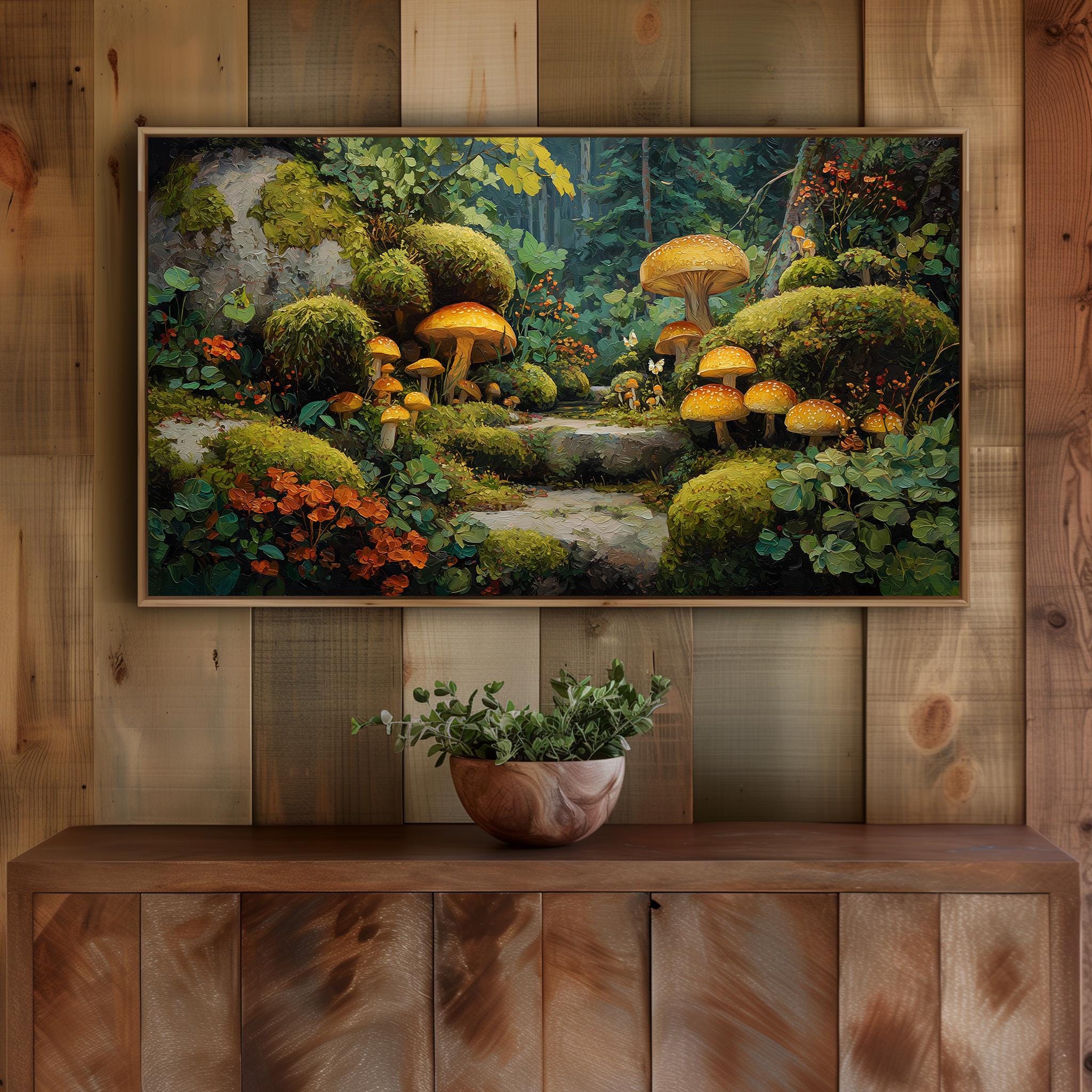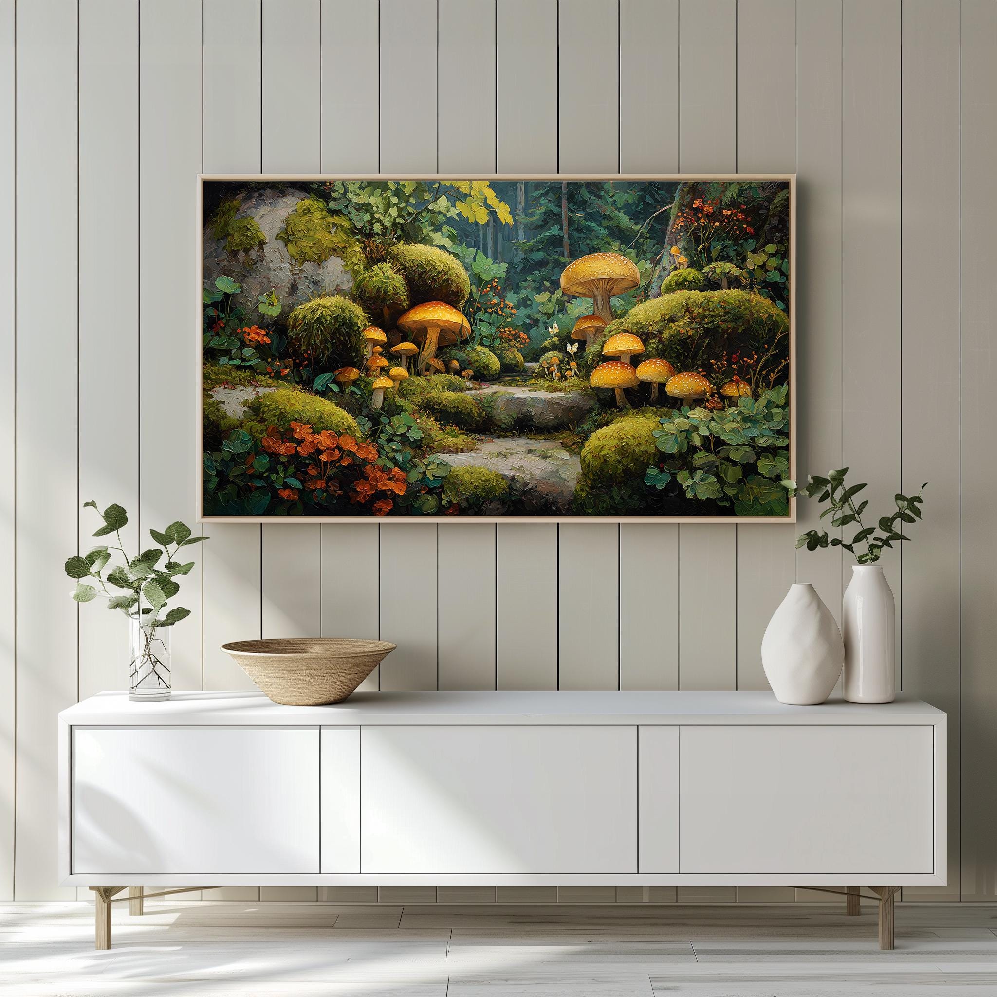 Rustic Forest Frame TV Art: A Cozy Escape into Nature's Embrace This enchanting digital painting captures the serene beauty of a mossy forest floor adorned with whimsical mushrooms and smooth stones. Perfect for adding a touch of woodland charm to your home, this artwork transforms your Samsung Frame TV into a stunning focal point, creating an inviting atmosphere that celebrates the earthy tones of nature. Perfect for all seasons, but especially captivating in the fall when earthy colors reign.
