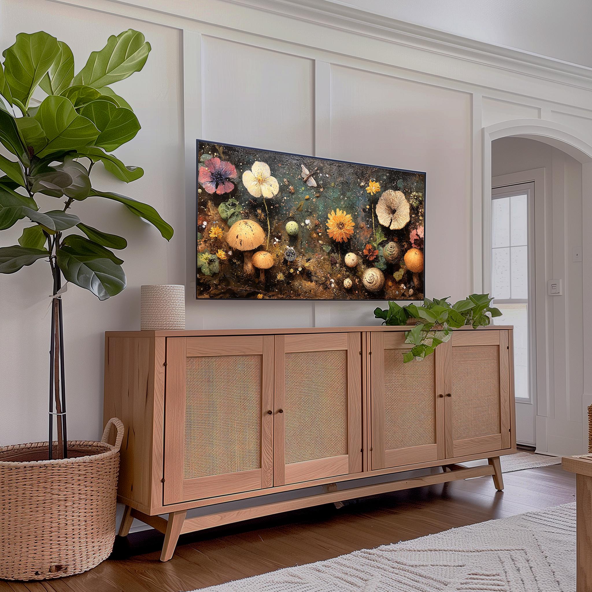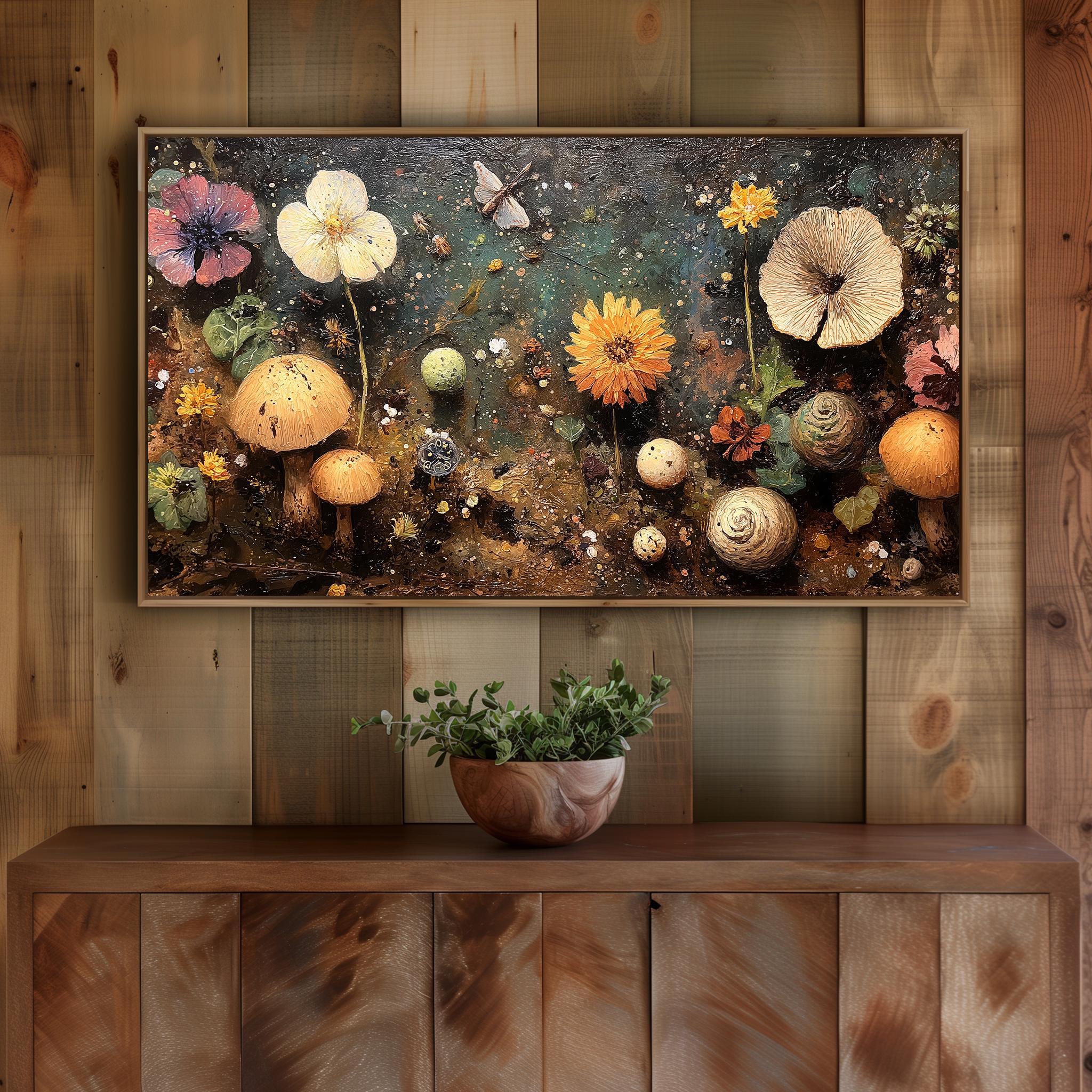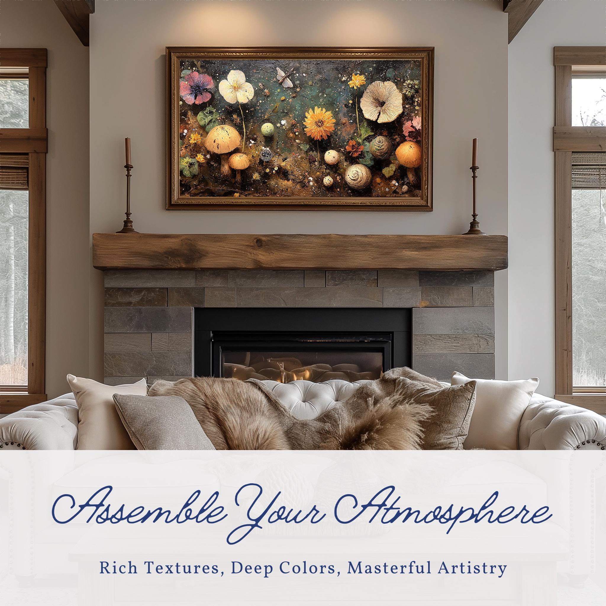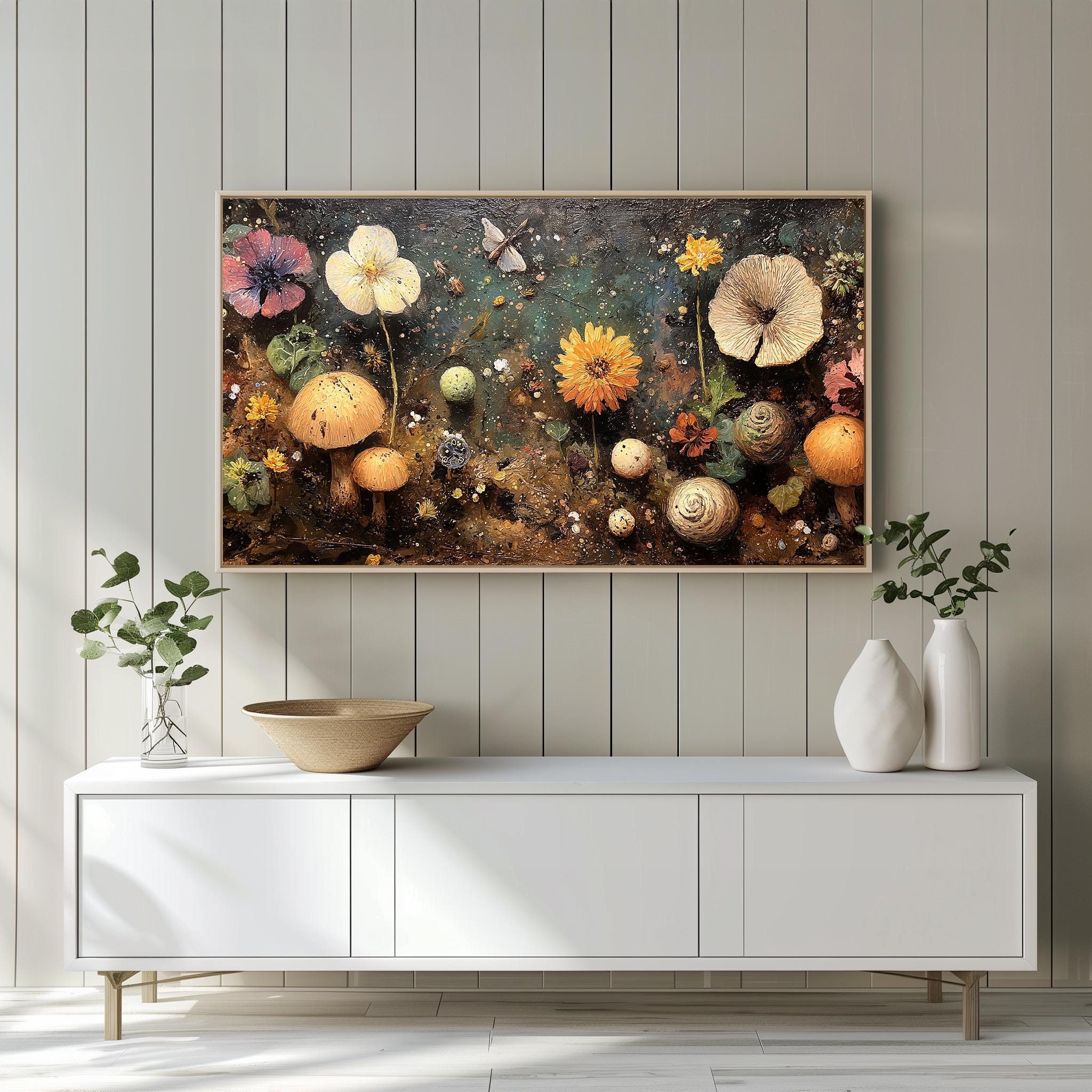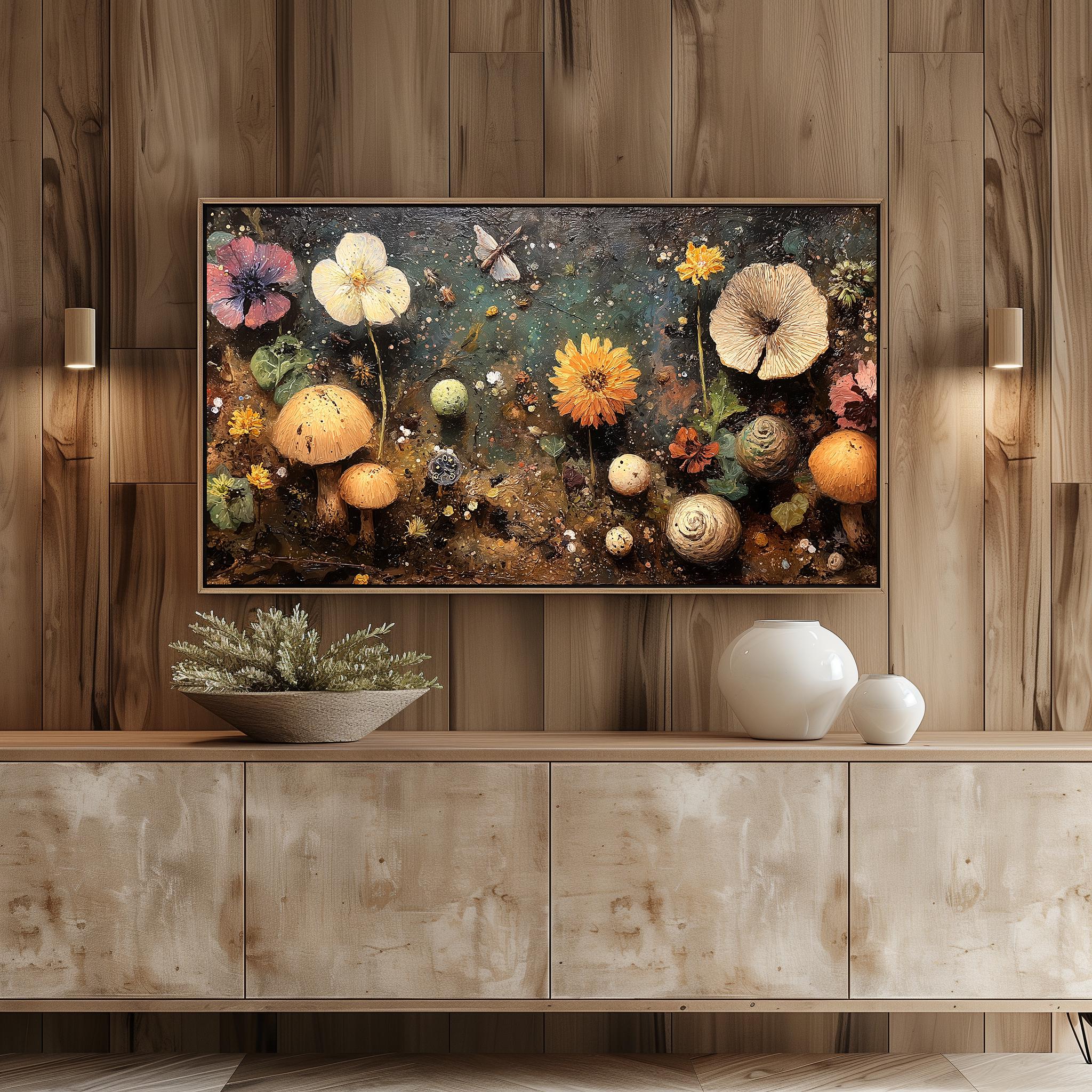 Rustic Enchanted Forest Floor Samsung Frame TV Art Immerse yourself in a whimsical world with our Rustic Enchanted Forest Floor art. Featuring vibrant magic mushrooms and vintage botanical elements, this piece transforms your space into a serene woodland escape. Perfect for adding a touch of nature-inspired charm to your home decor, this digital download is ideal for framing on your Samsung Frame TV, allowing you to showcase the beauty of the enchanted forest all year round. Perfect for cozy autumn evenings or refreshing spring mornings