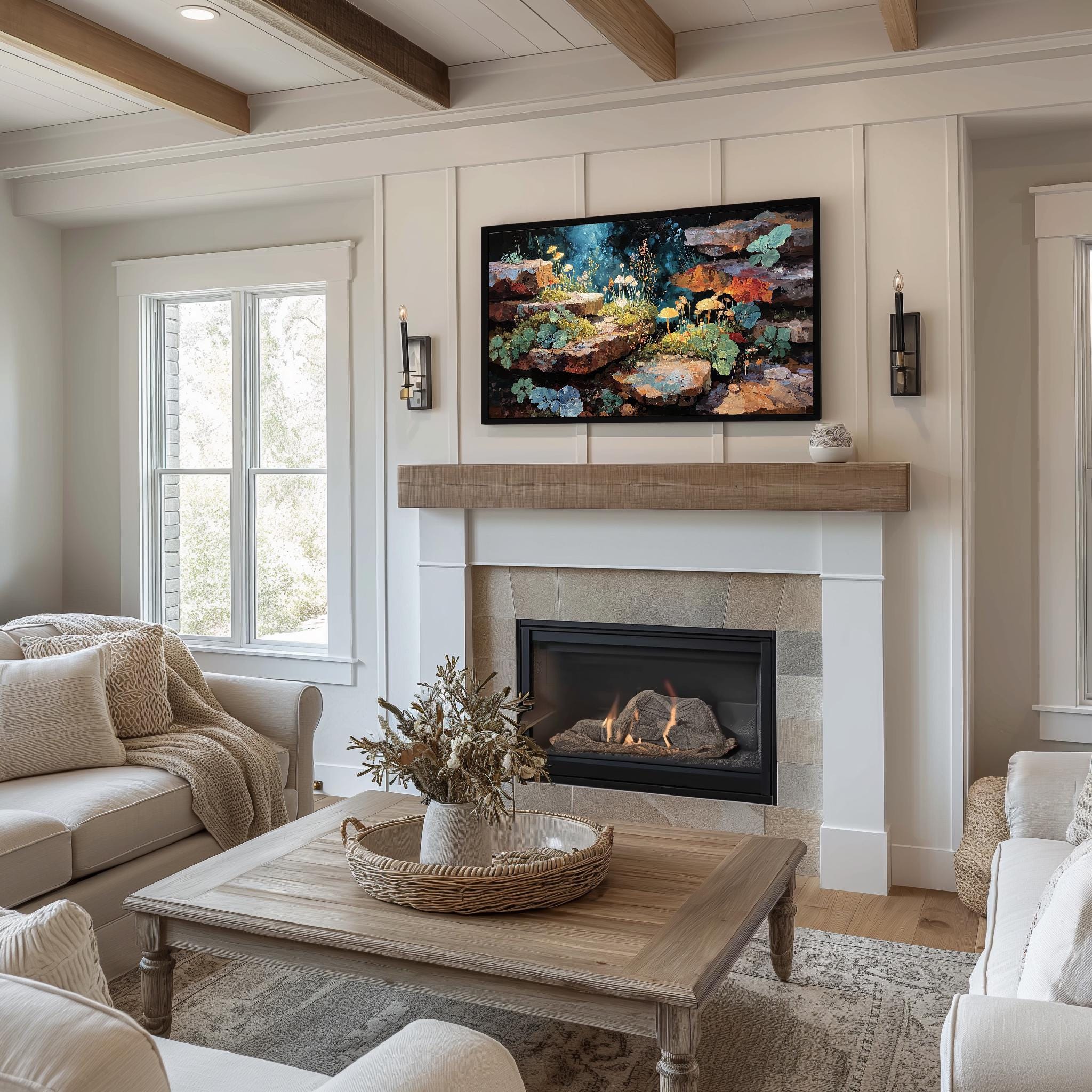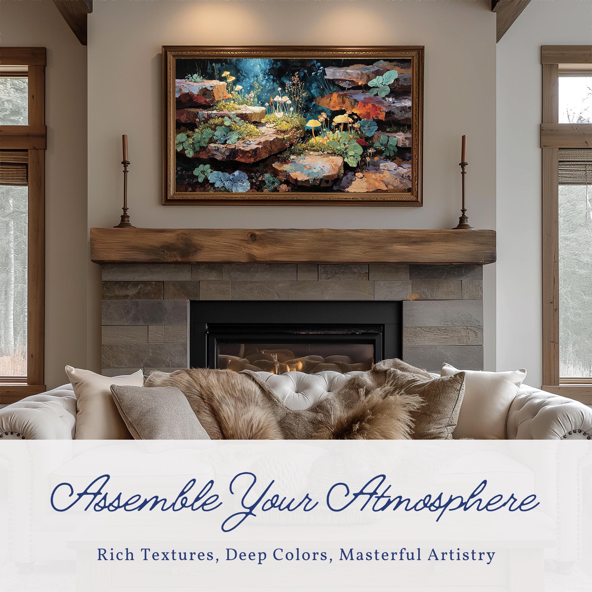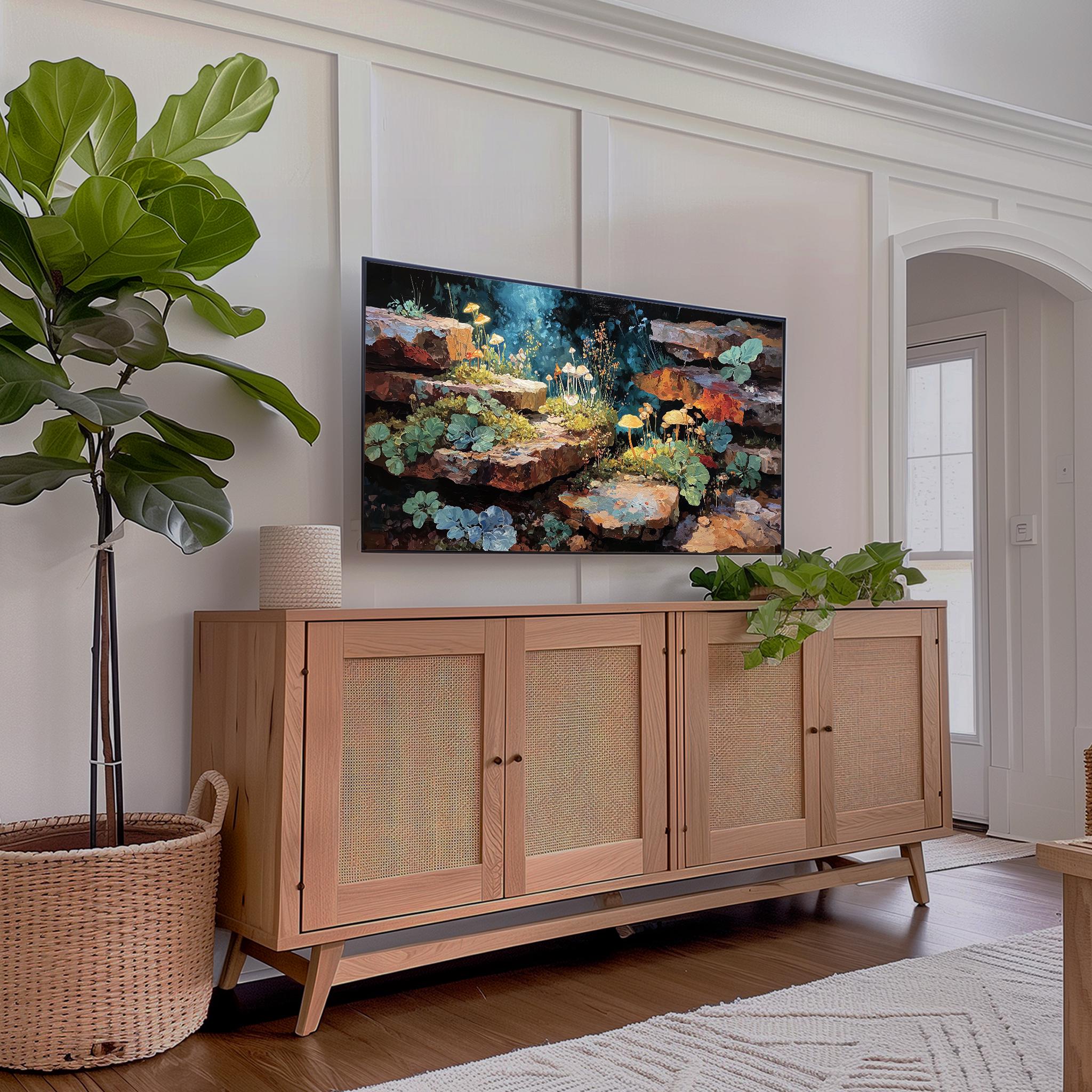 Enchanted Forest TV Art: A Rustic Stones Painting for Your Samsung Frame TV Transform your living space with this enchanting digital download featuring a serene forest landscape. Perfectly suited for cottagecore aesthetics, this artwork captures the essence of nature with rustic stones nestled among lush greenery. Ideal for adding a touch of tranquility and rustic charm to your walls, this piece is designed for easy display on your Samsung Frame TV, seamlessly blending technology with art. Perfect for all seasons, bringing a touch of nature indoors year-round.