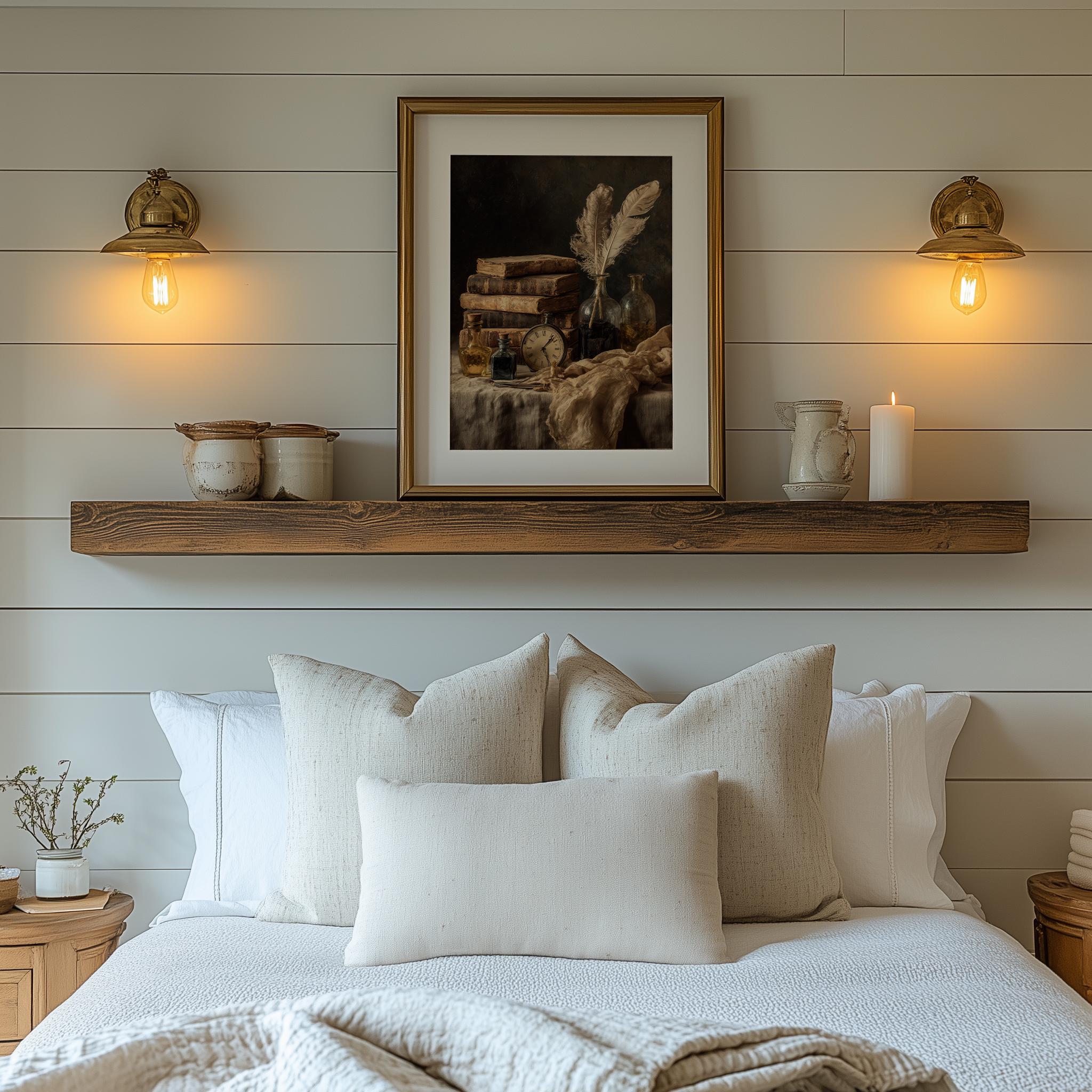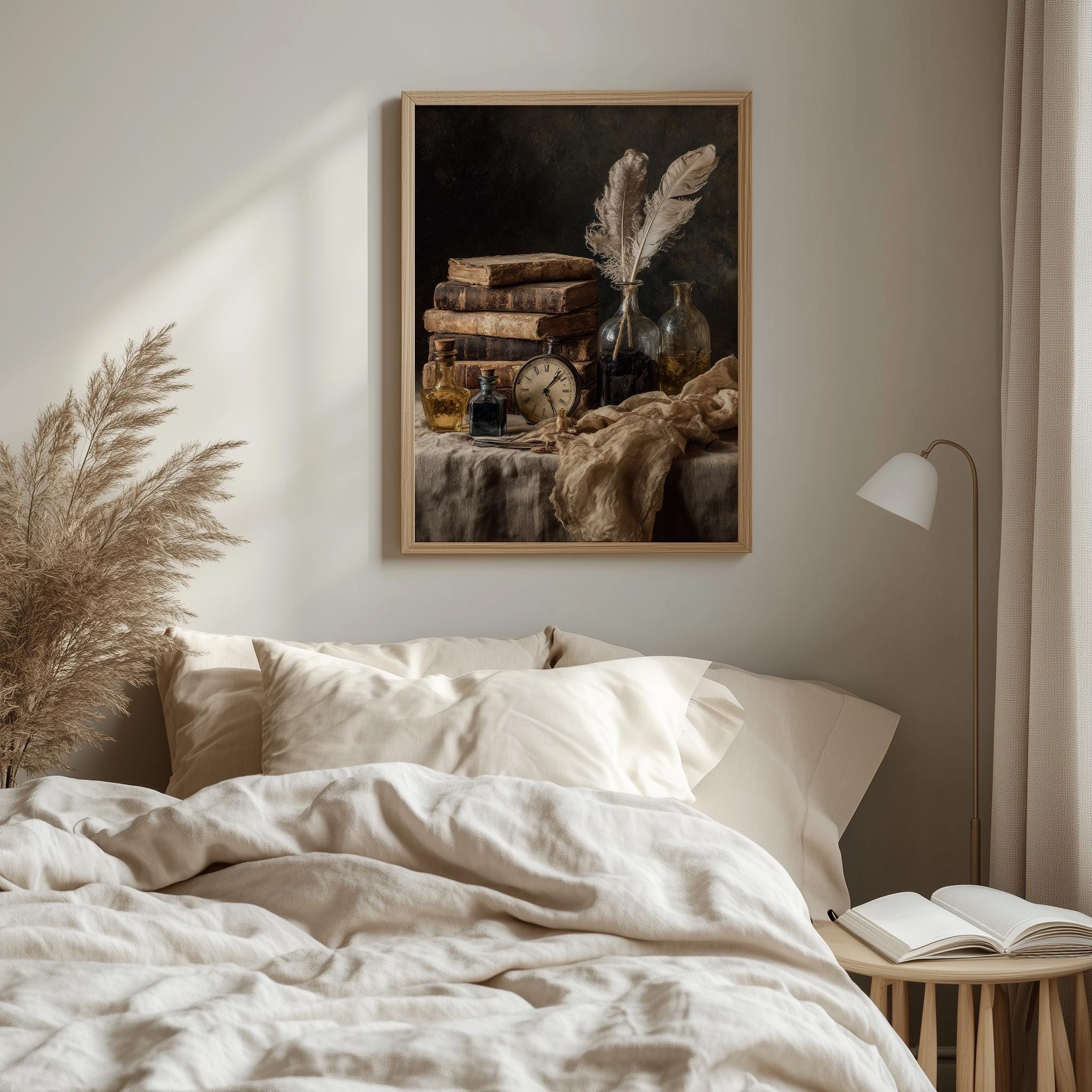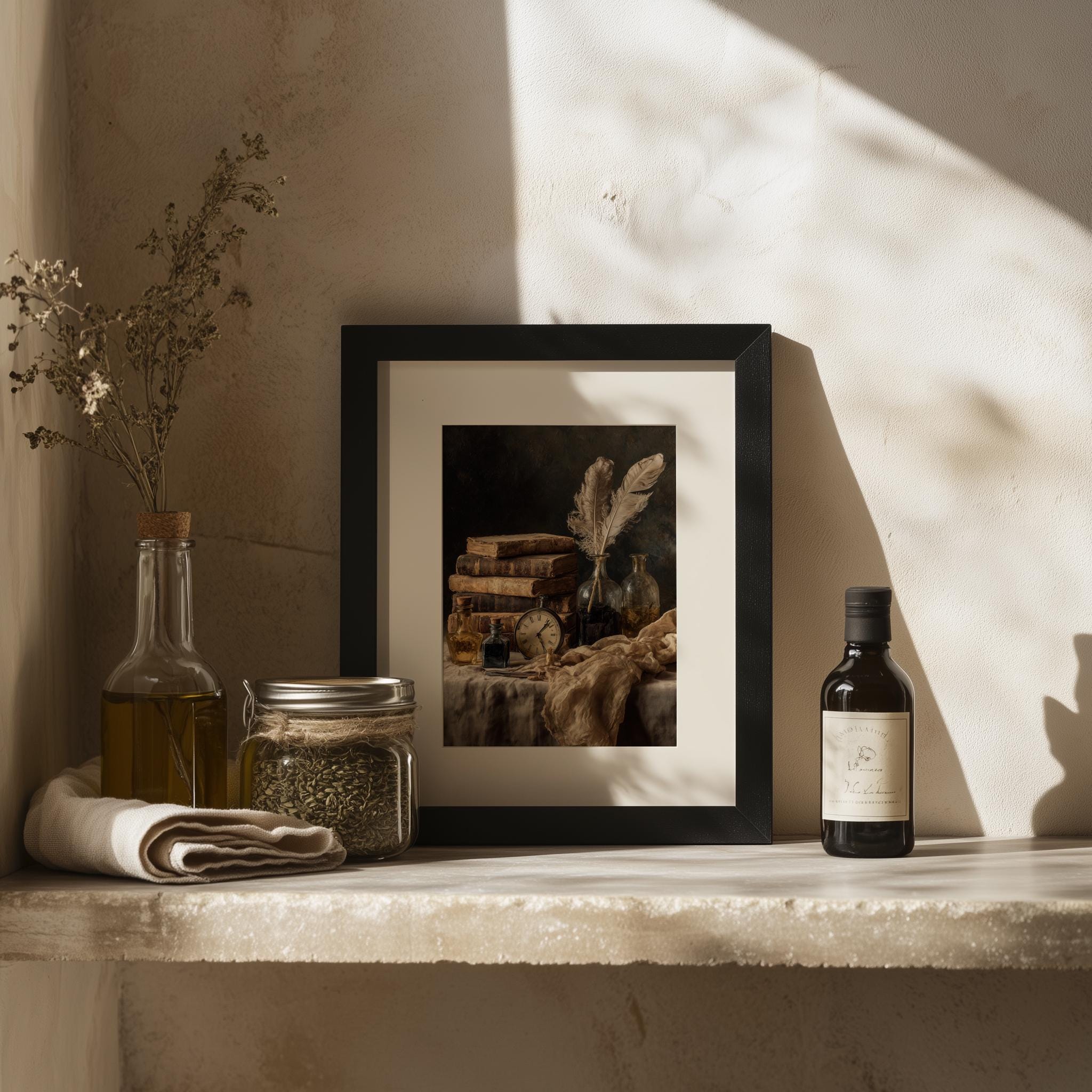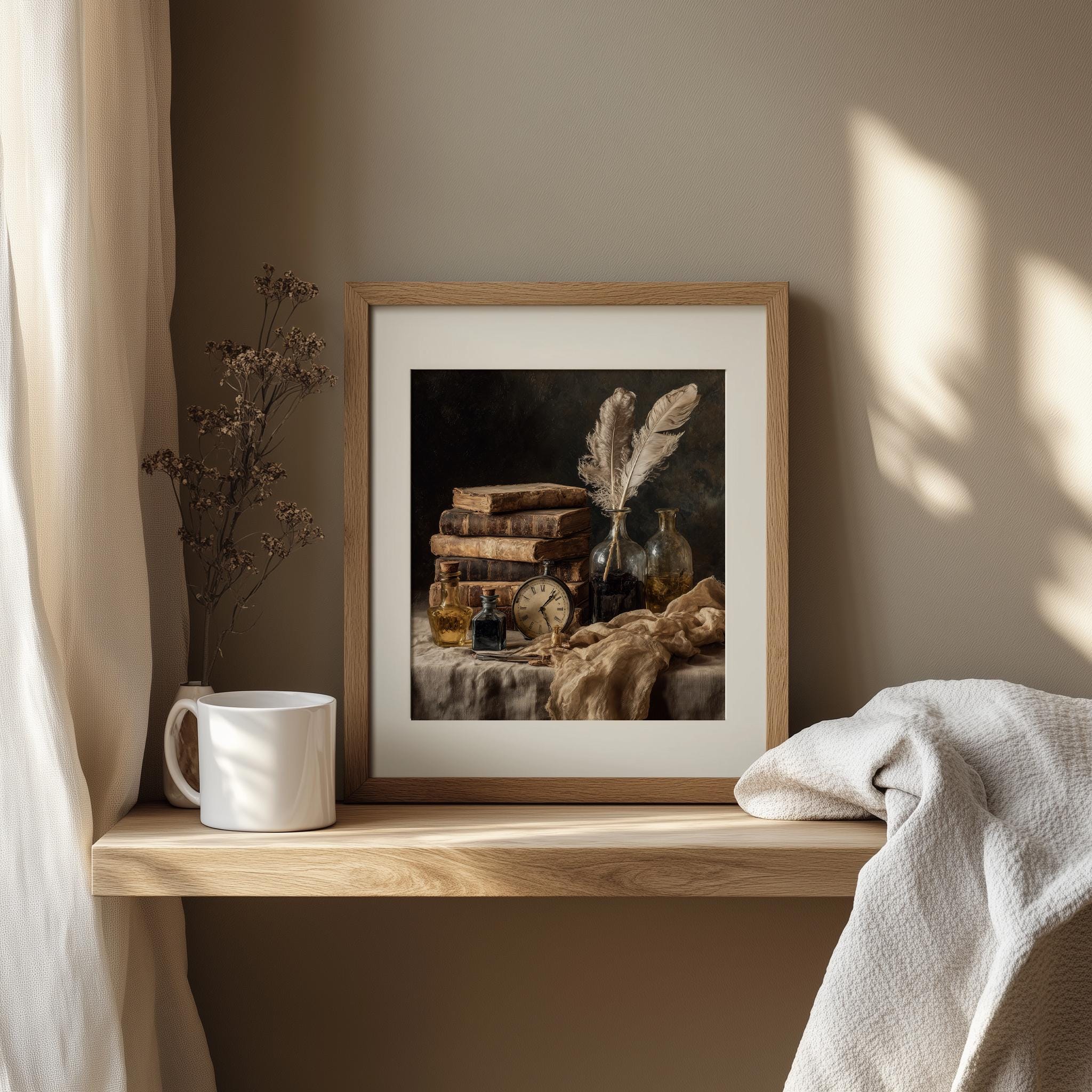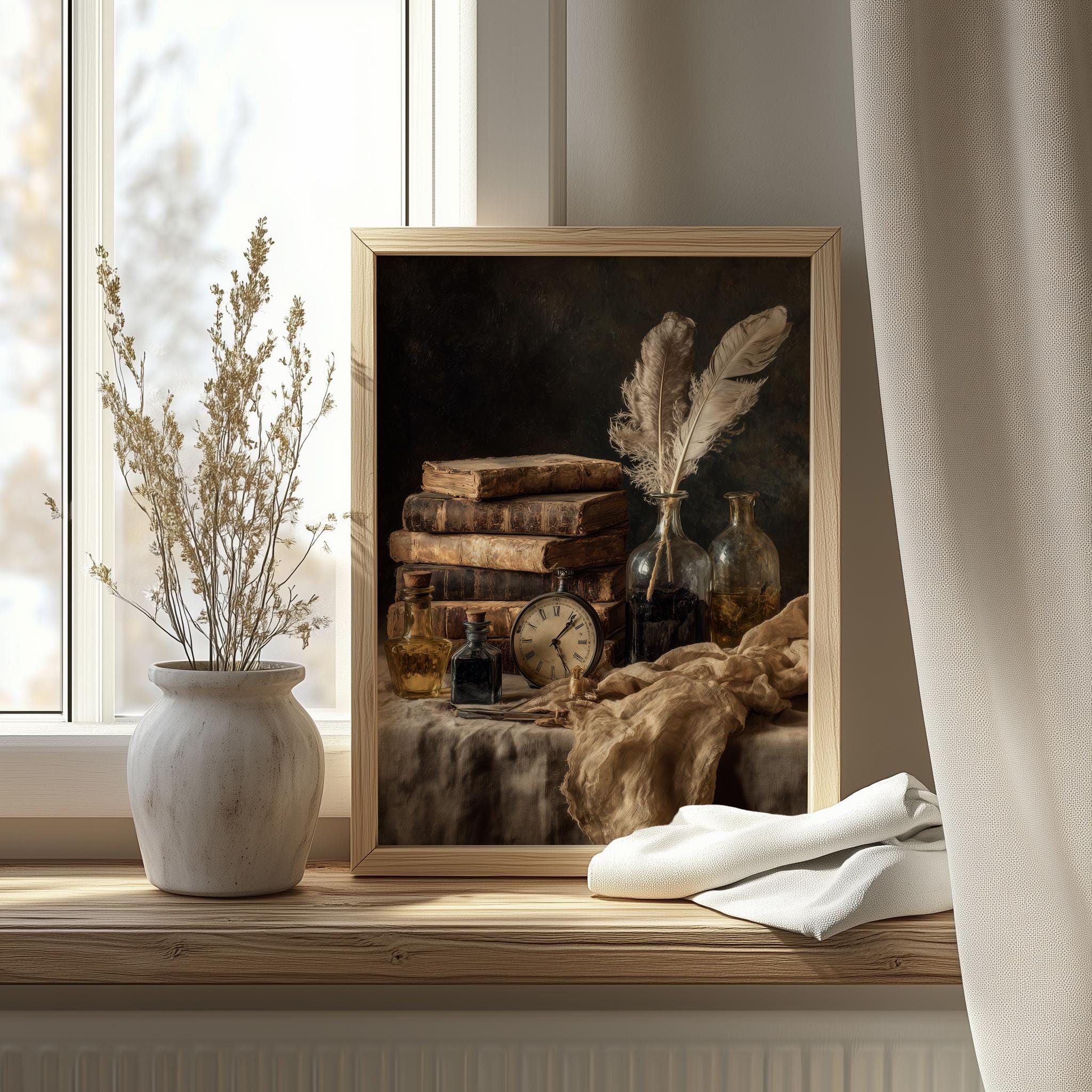 Vintage Printable Still Life Oil Painting - Rustic Scholarly Art, Books and Quill Scene, Classic Neutral Wall Decor This exquisite vintage printable still life oil painting captures the essence of scholarly pursuits. Featuring a beautifully arranged scene with books, a quill, and rustic elements, it adds a touch of classic elegance to any home library or study space. The neutral tones make it a versatile addition to your wall decor, blending seamlessly with various interior styles while evoking a sense of nostalgia and intellectual charm. Perfect for all seasons, this artwork brings warmth and sophistication to your home, making it an ideal choice for year-round decor.