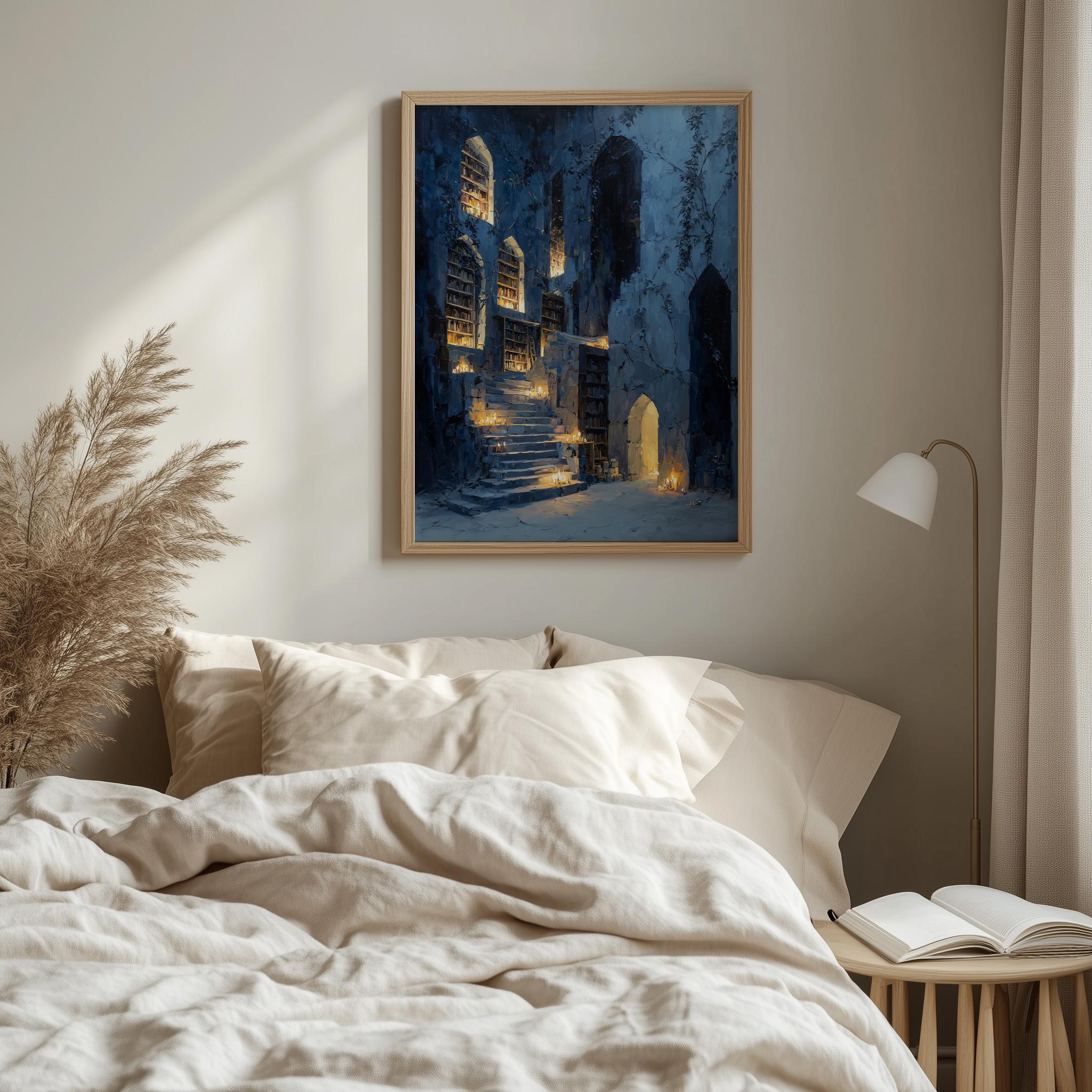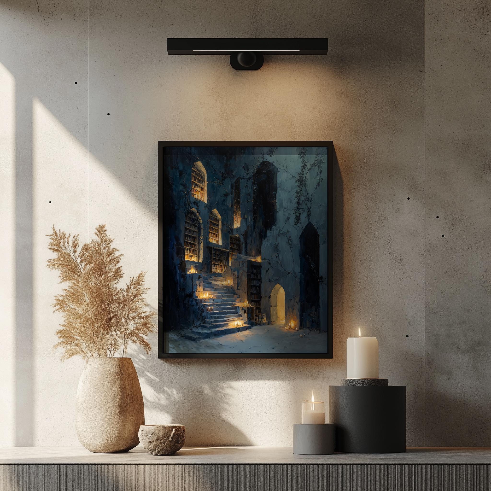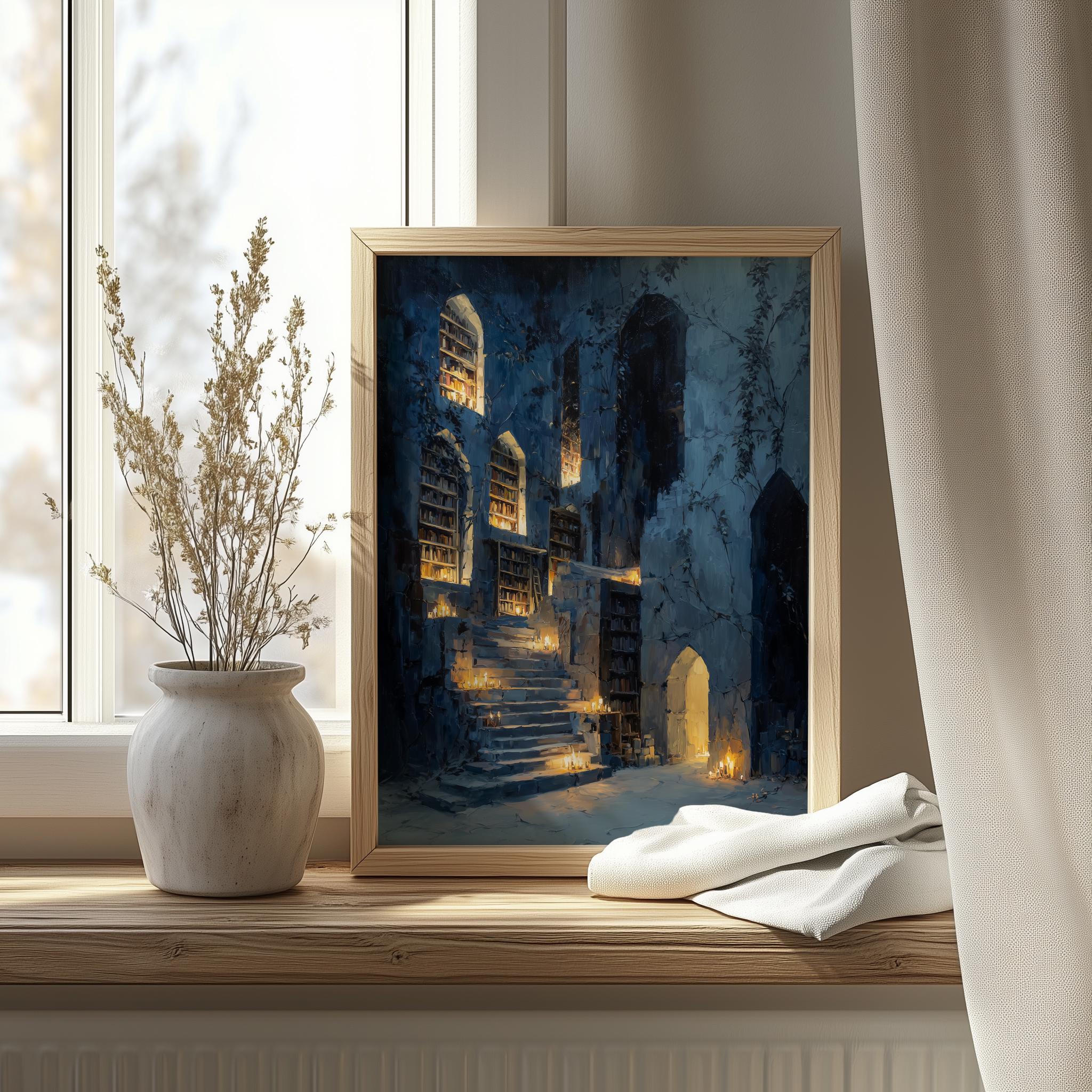 Moody Gothic Library Painting - A Haunting Journey Through Time Immerse yourself in the enchanting world of our Moody Gothic Library Painting, where the shadows of the past whisper secrets from haunted shelves. This exquisite wall art captures the essence of dark vintage decor, perfect for adding a touch of mystery to your space. The printable gothic scene combines intricate details and a rich color palette, creating a mesmerizing atmosphere that draws the viewer in. Ideal for lovers of spooky aesthetics, this art print will transform any room into a sanctuary of the unknown. Perfect for autumn evenings, when the veil between worlds feels thinnest.