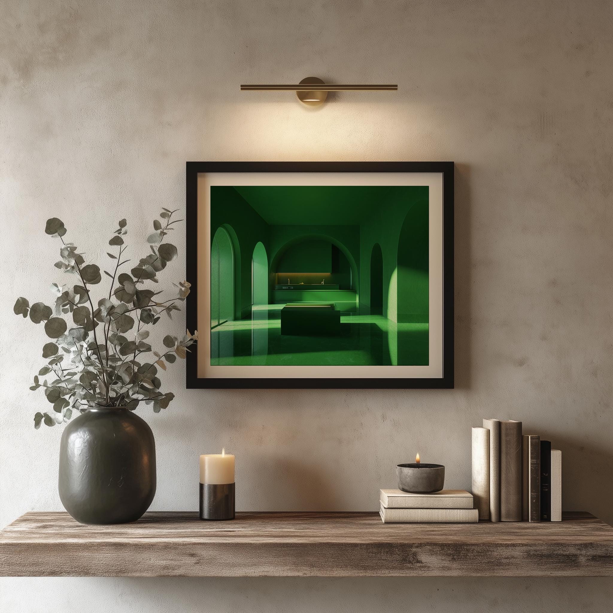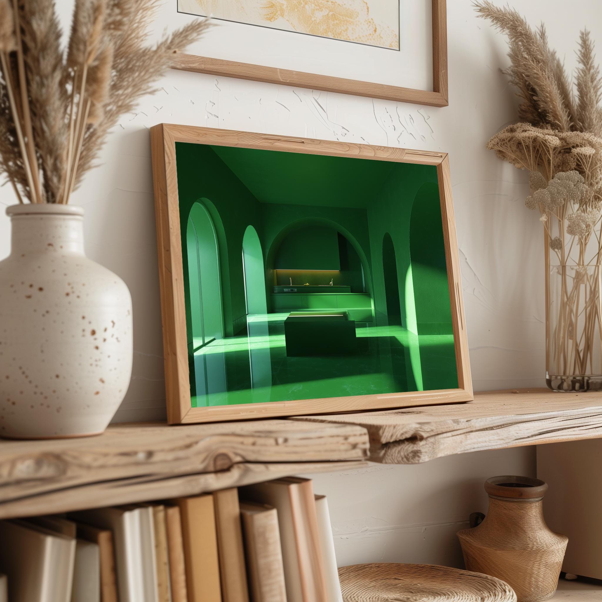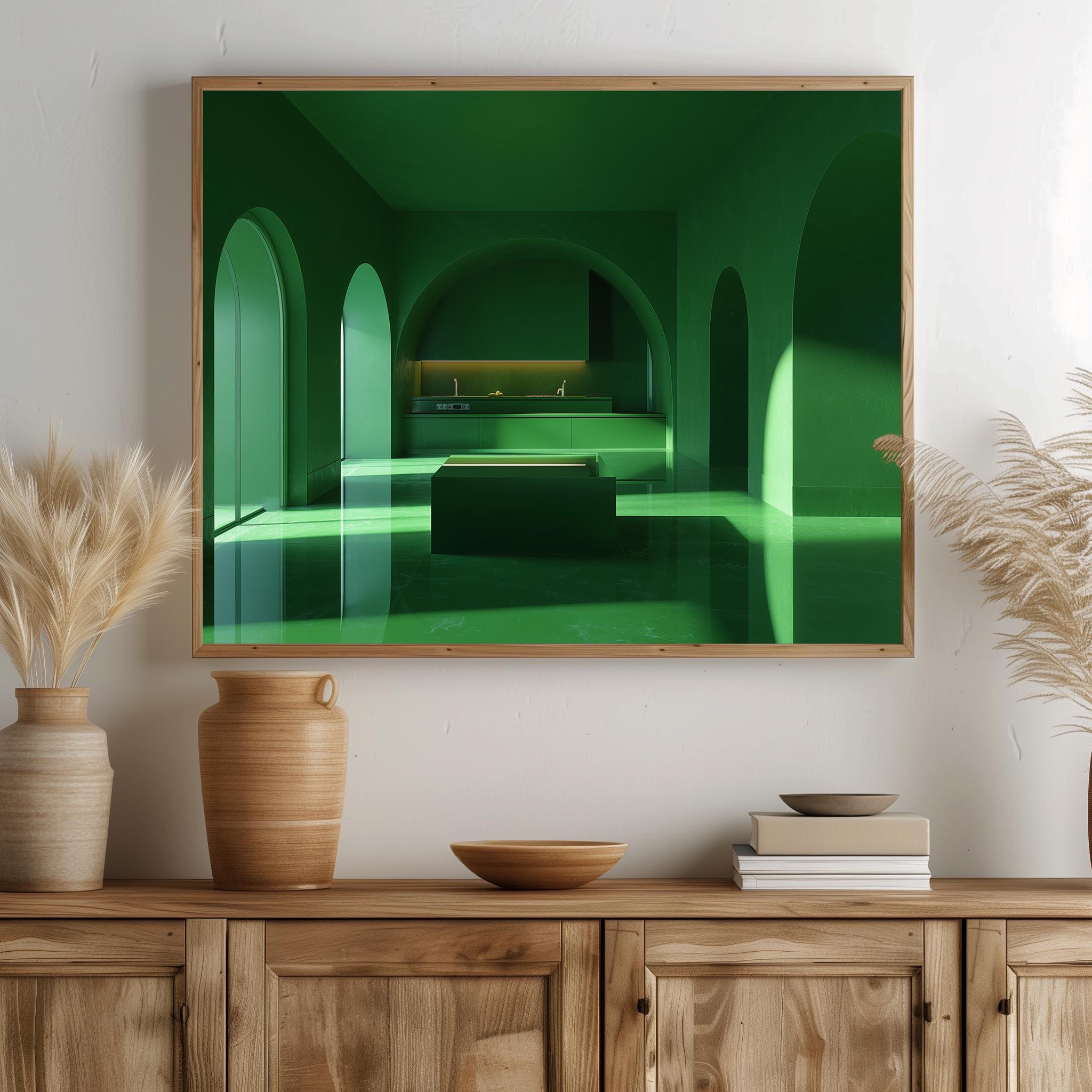 Moody Monochromatic Interior - Printable Green Abstract Wall Art Transform your space with this stunning piece that embodies the essence of modern minimalism. The rich green tones and abstract design create a serene atmosphere, perfect for enhancing any room in your home. Ideal for those who appreciate immersive art that invites contemplation and reflection. Perfect for year-round decor, bringing a touch of tranquility to your home in every season.