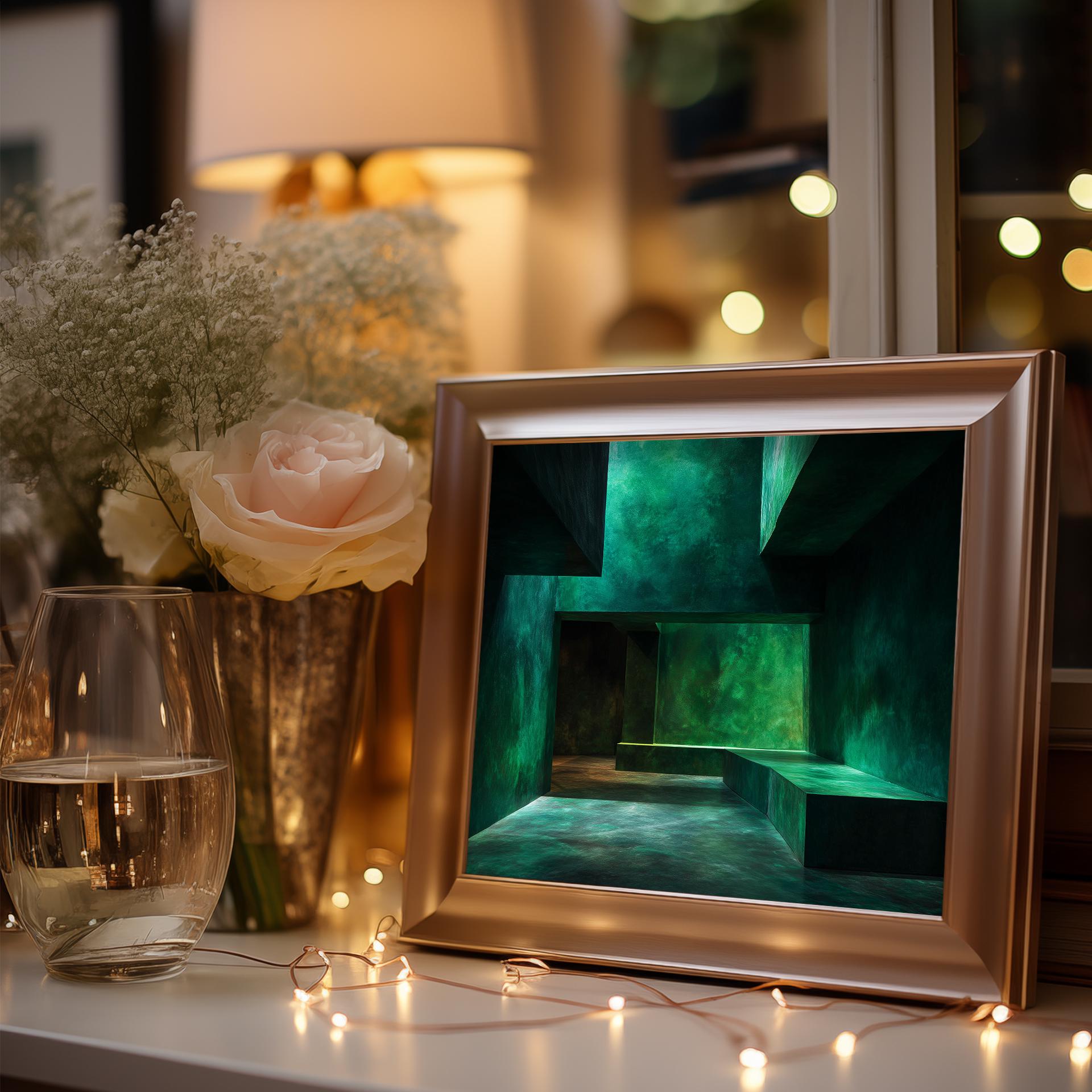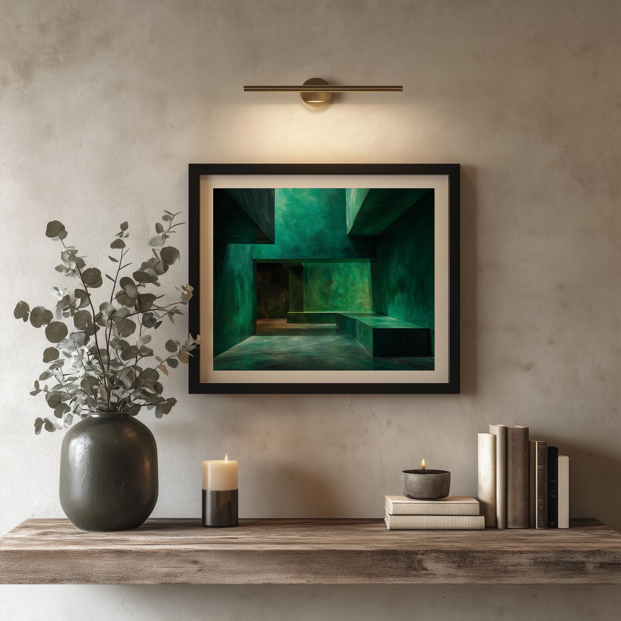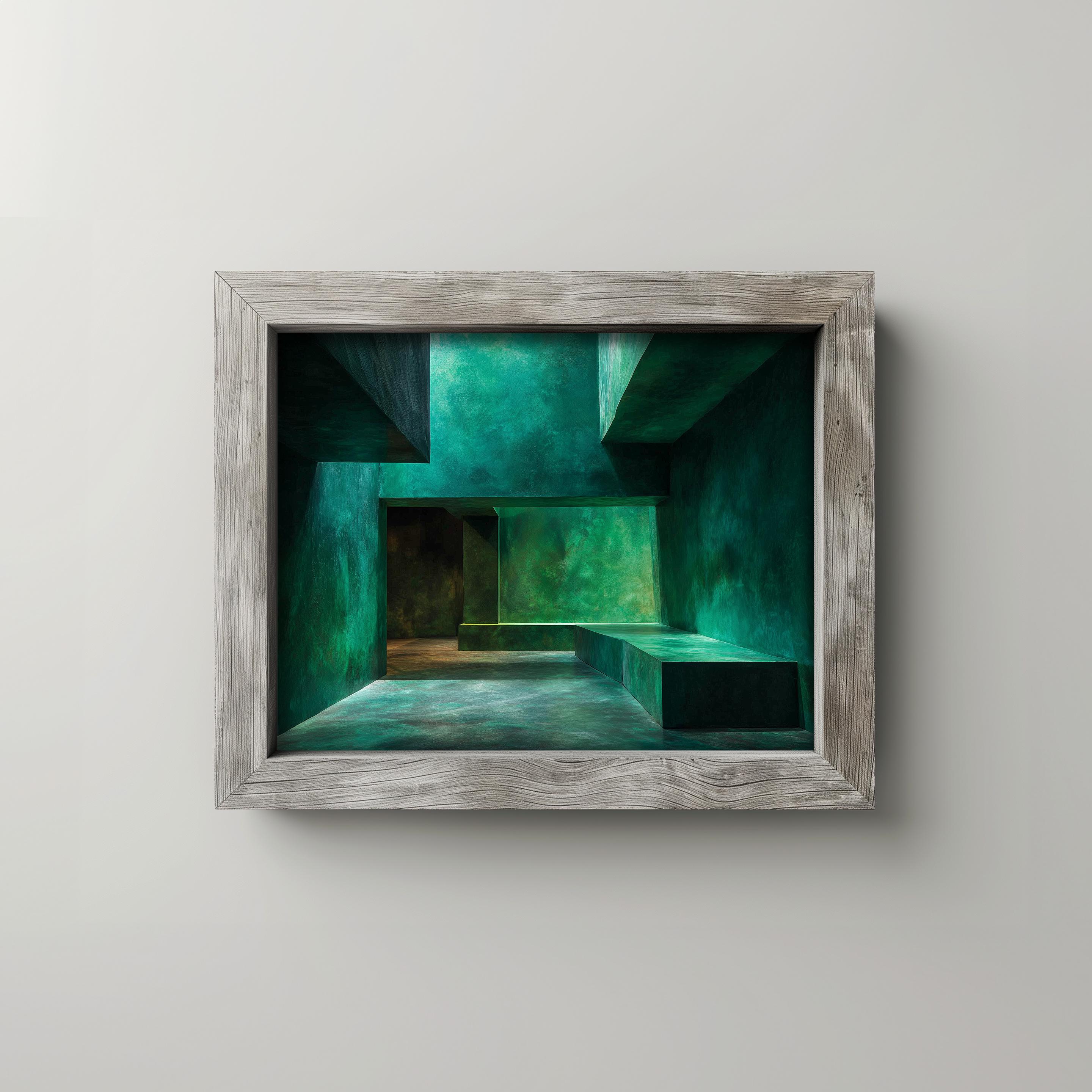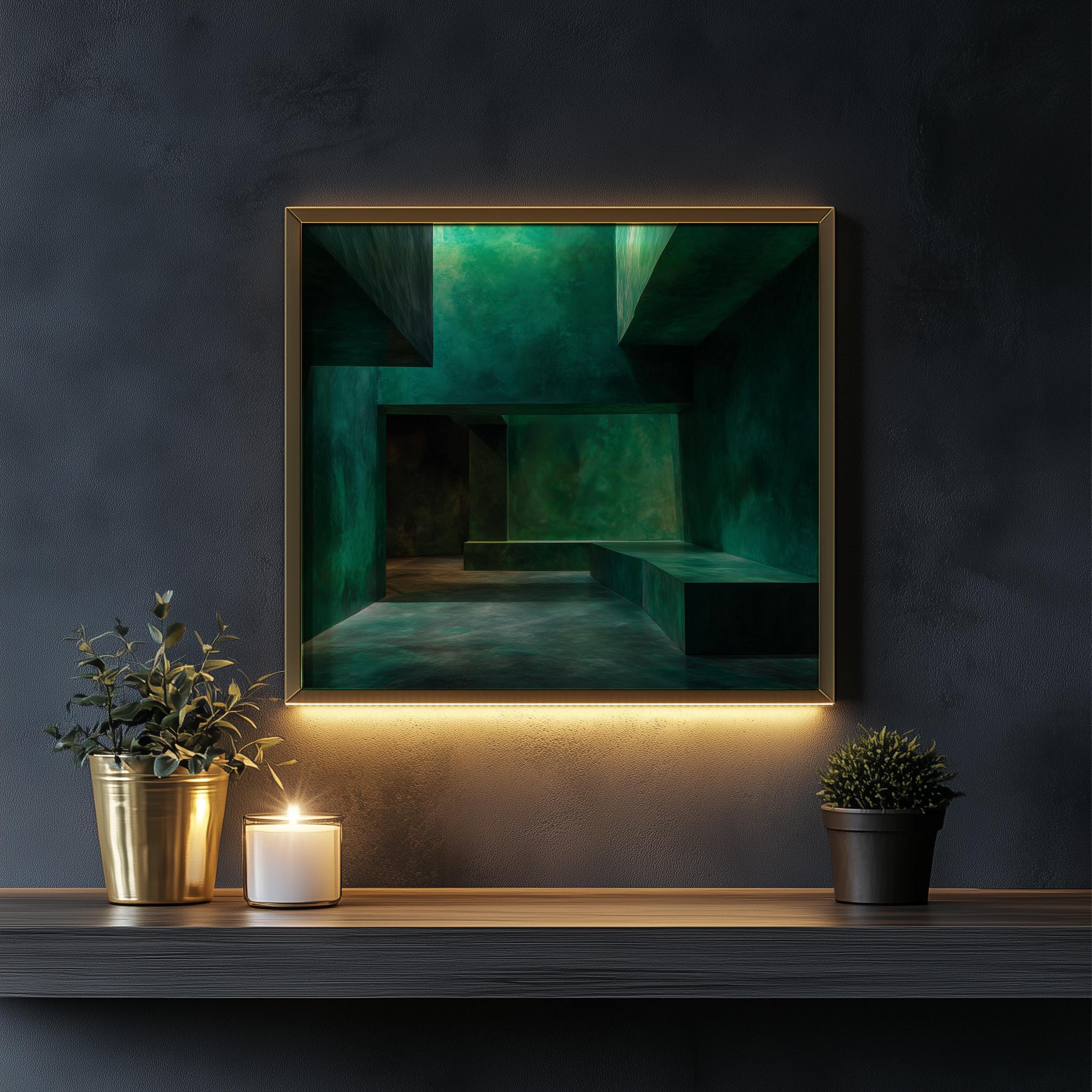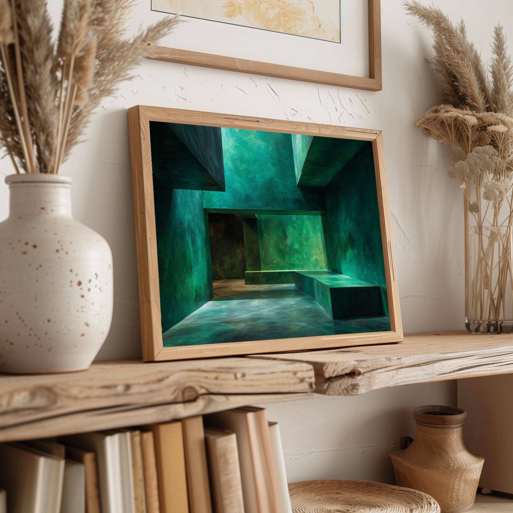 Abstracted Interior Space - Moody Emerald Green Wall Art This striking piece captures the essence of modern elegance, featuring deep emerald hues that evoke a sense of tranquility and introspection. Perfect for adding a touch of sophistication to any room, this digital art print effortlessly complements both contemporary and traditional decor. Ideal for your home or office, it brings a unique artistic flair that inspires creativity and relaxation. All Year Round
