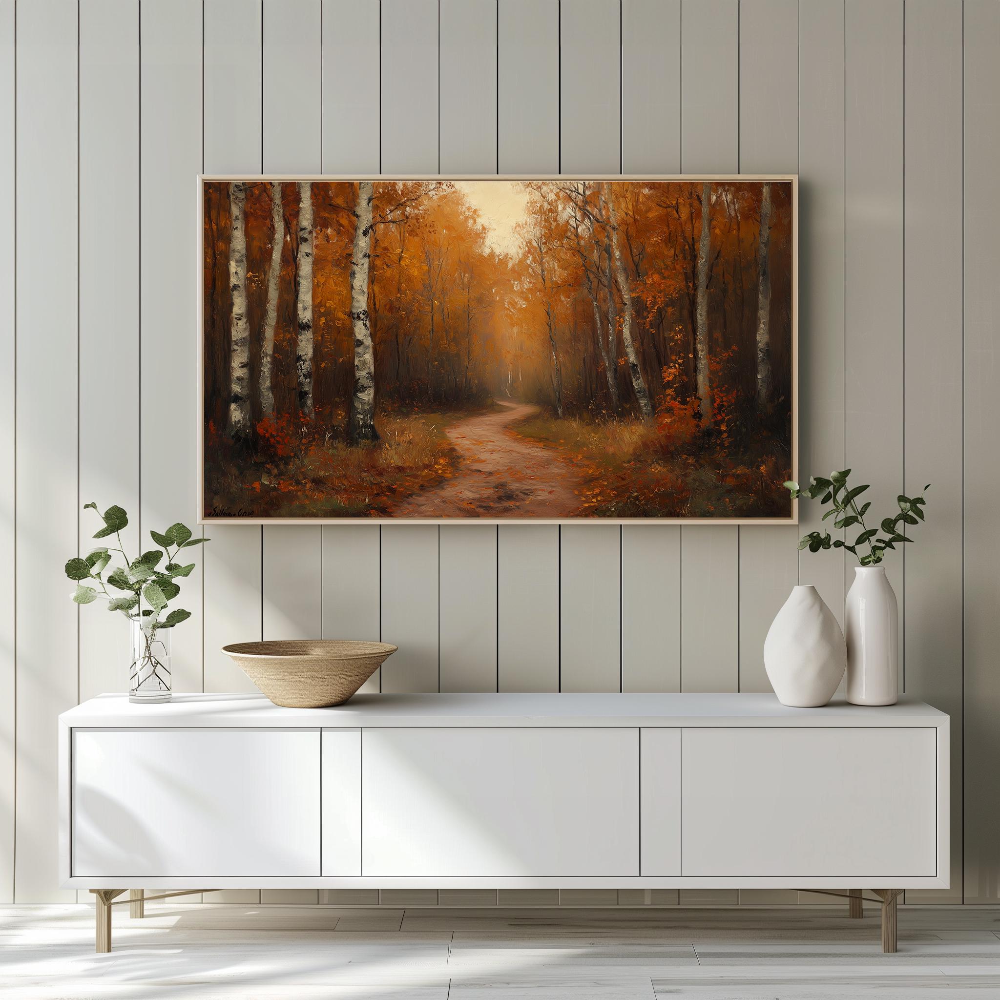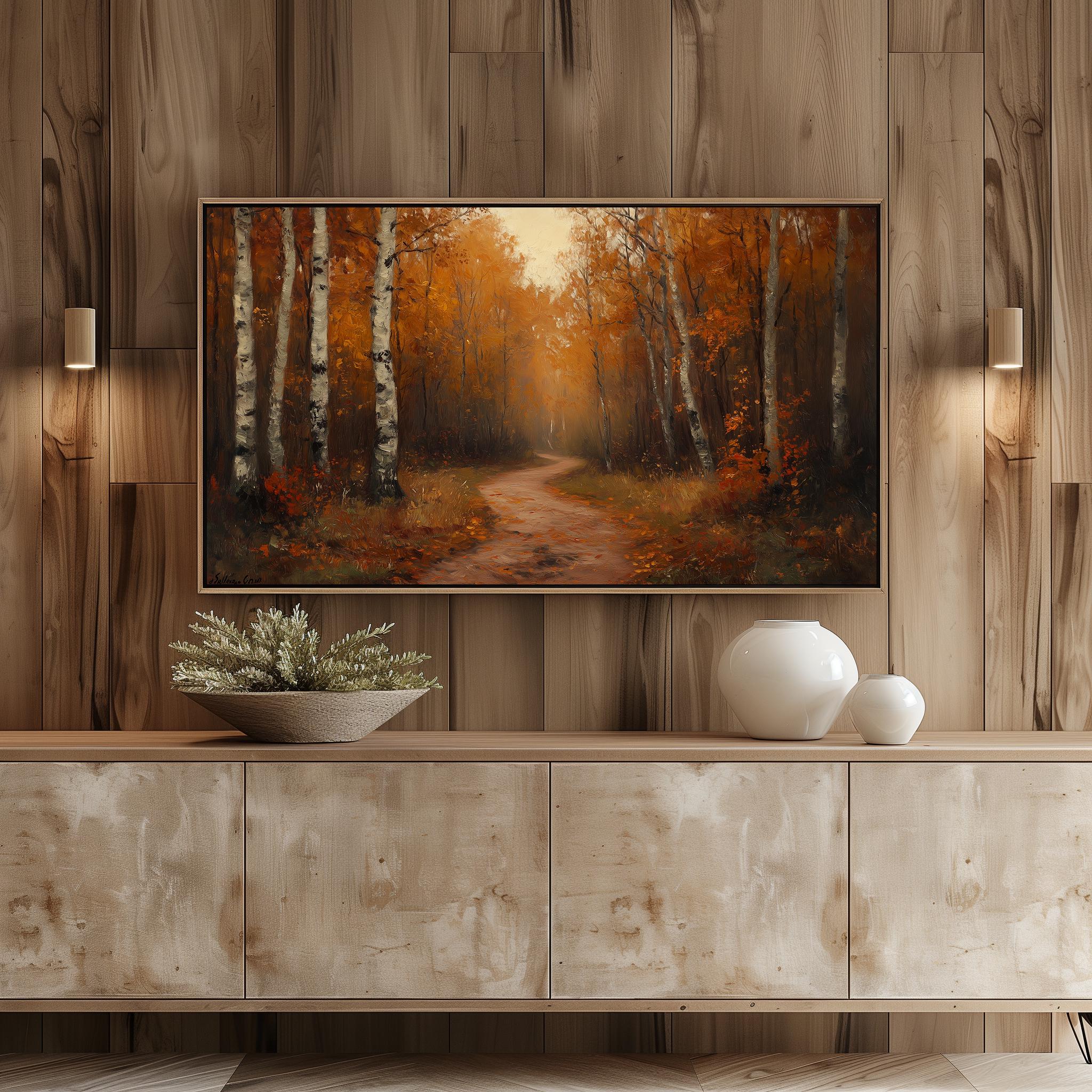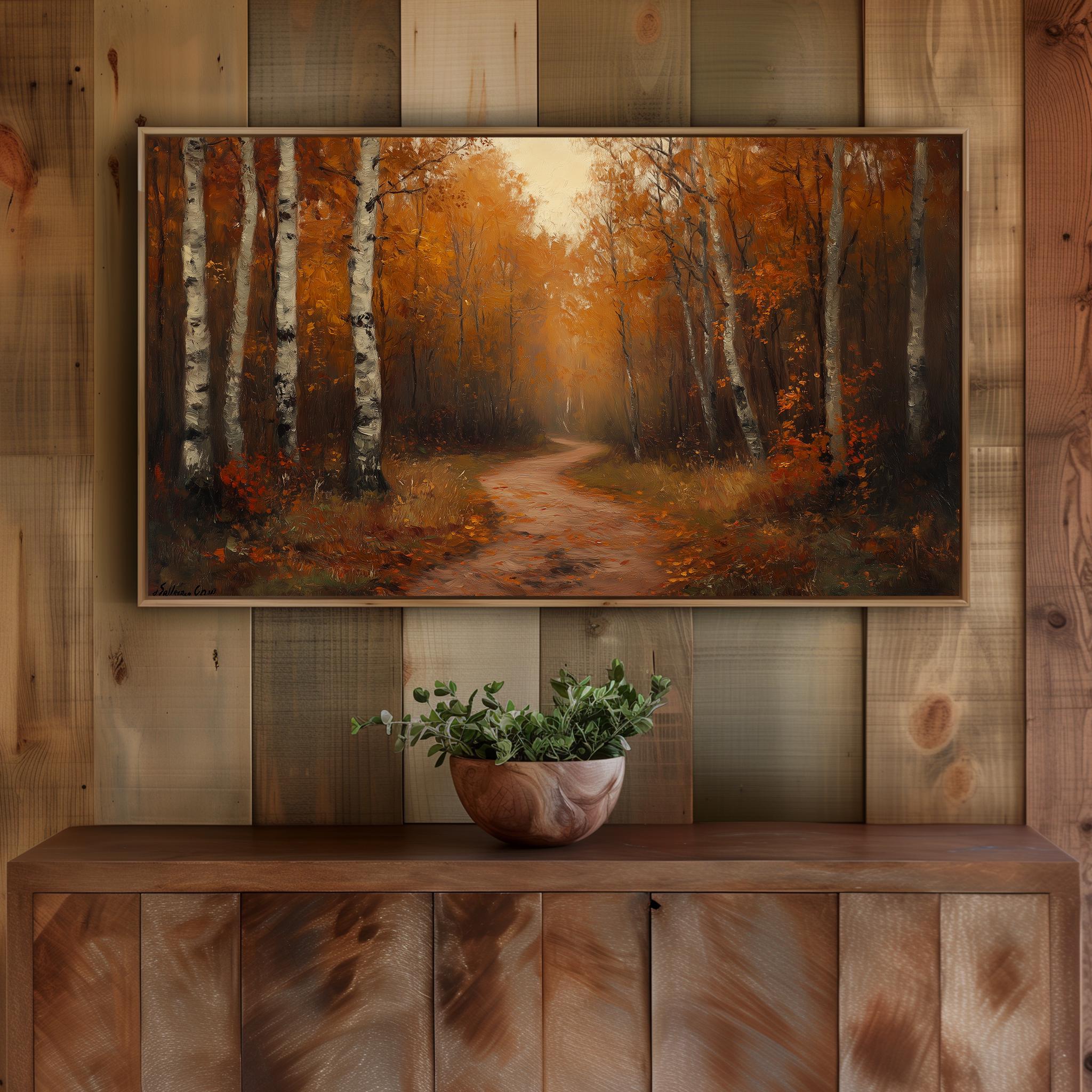 Rustic Autumn Trail Oil Painting Frame TV Art This enchanting oil painting captures the serene beauty of a forest path during the fall season, perfect for enhancing your living space. Ideal for display on your Samsung Frame TV, it brings a touch of nature-inspired charm and warmth to your home decor. The earthy tones and rustic aesthetic make it a stunning focal point for any room, inviting the cozy essence of autumn into your surroundings. Autumn