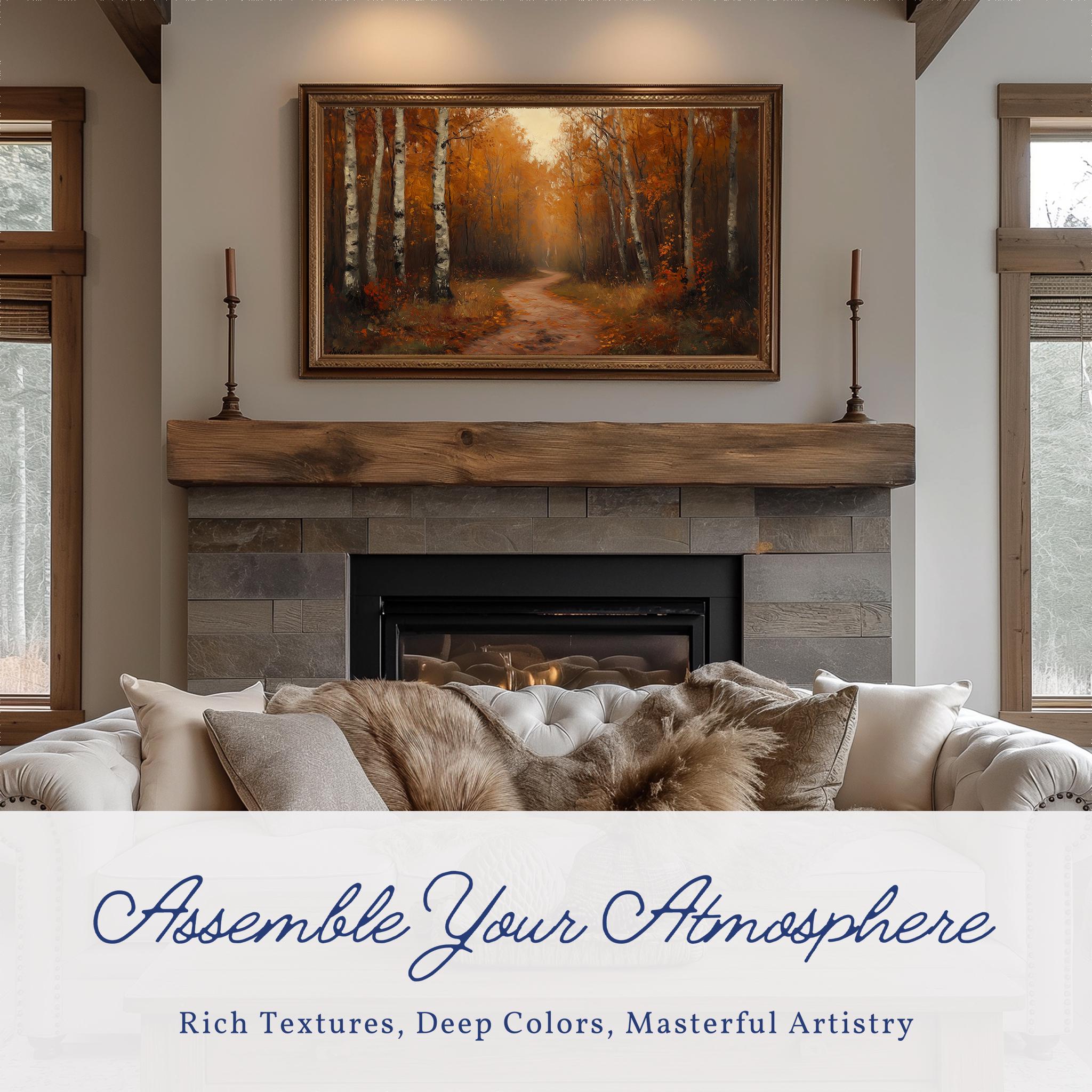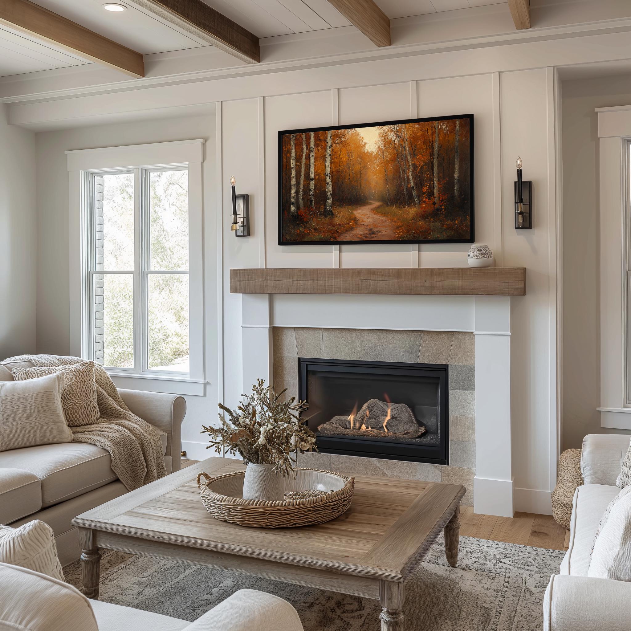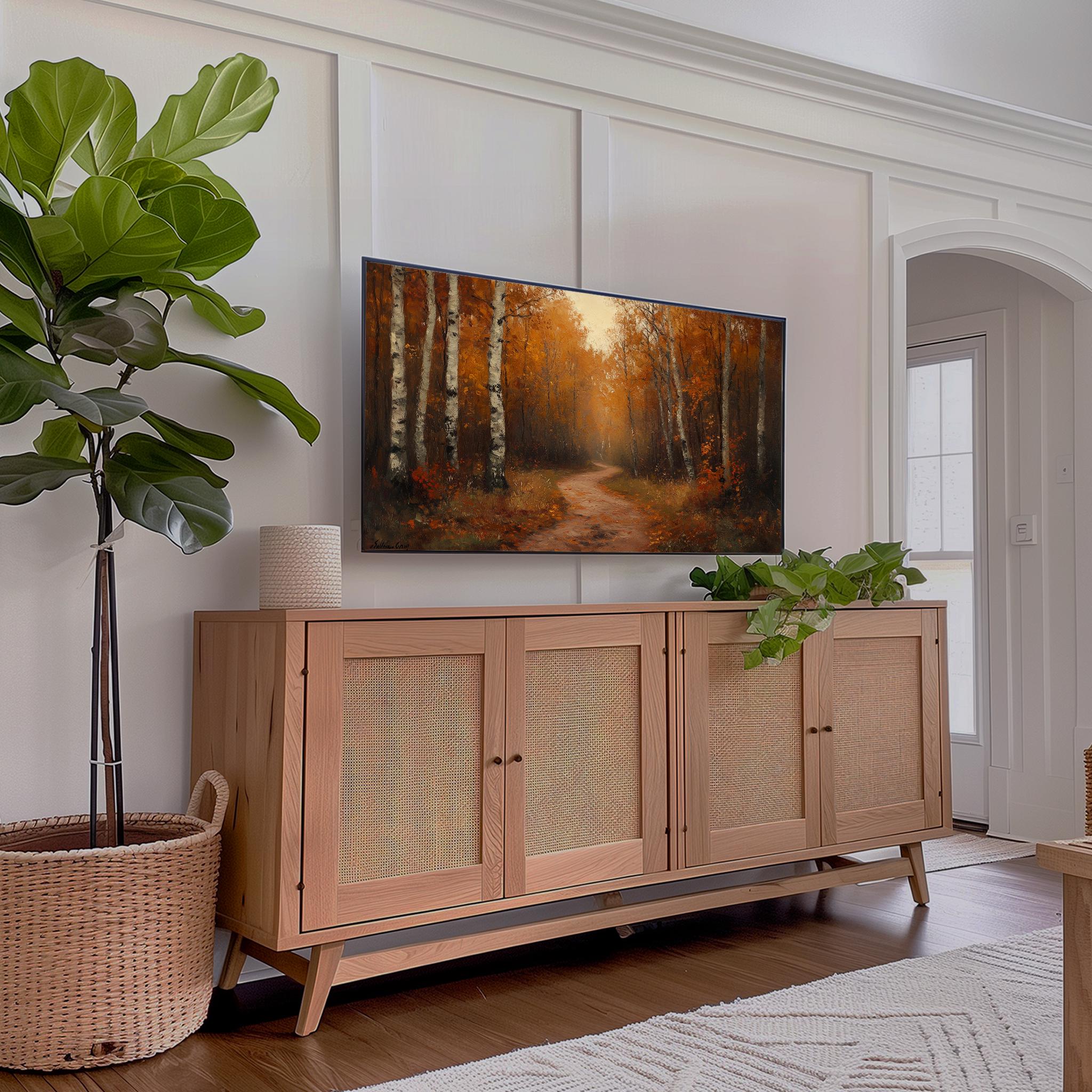 Rustic Autumn Trail Oil Painting Frame TV Art This enchanting oil painting captures the serene beauty of a forest path during the fall season, perfect for enhancing your living space. Ideal for display on your Samsung Frame TV, it brings a touch of nature-inspired charm and warmth to your home decor. The earthy tones and rustic aesthetic make it a stunning focal point for any room, inviting the cozy essence of autumn into your surroundings. Autumn