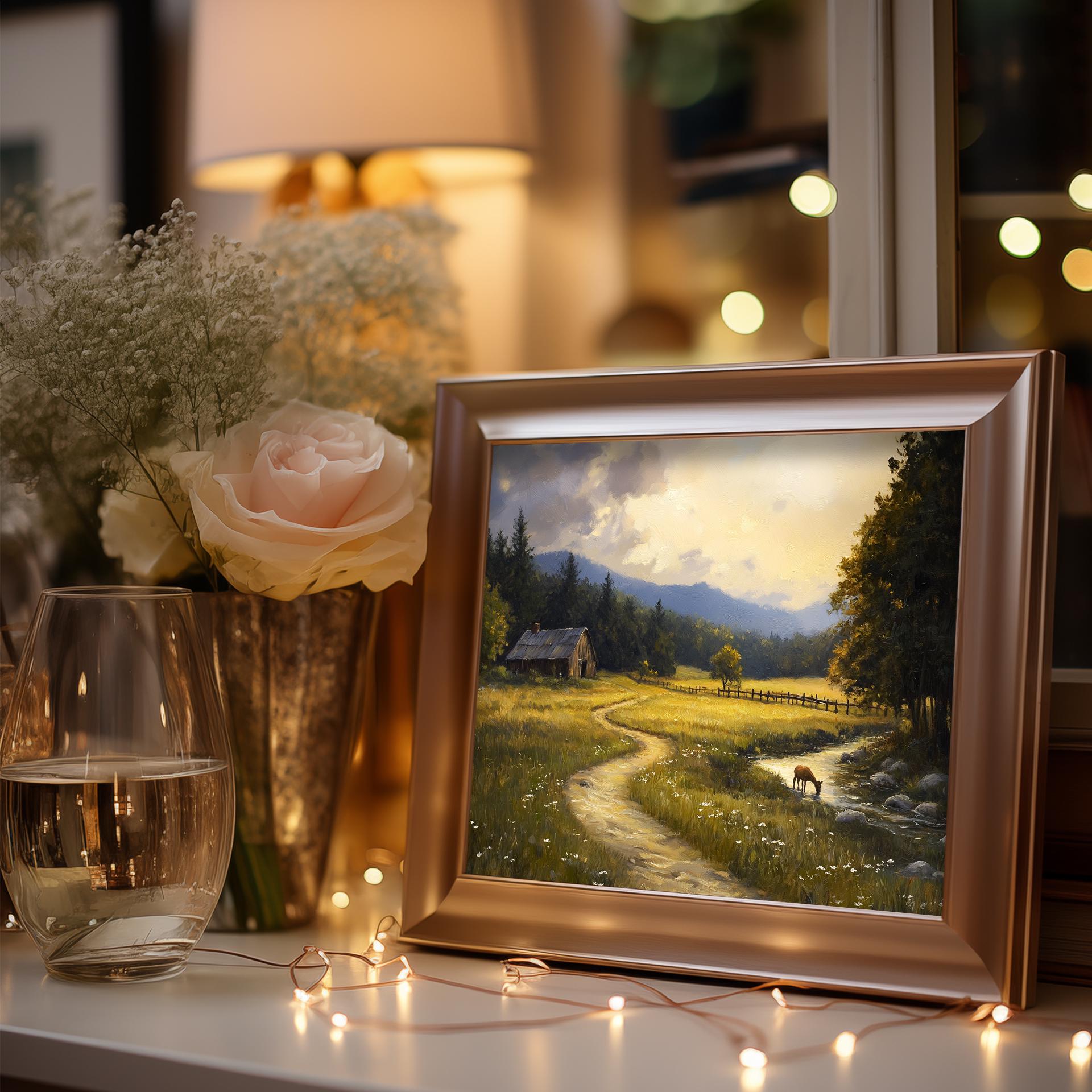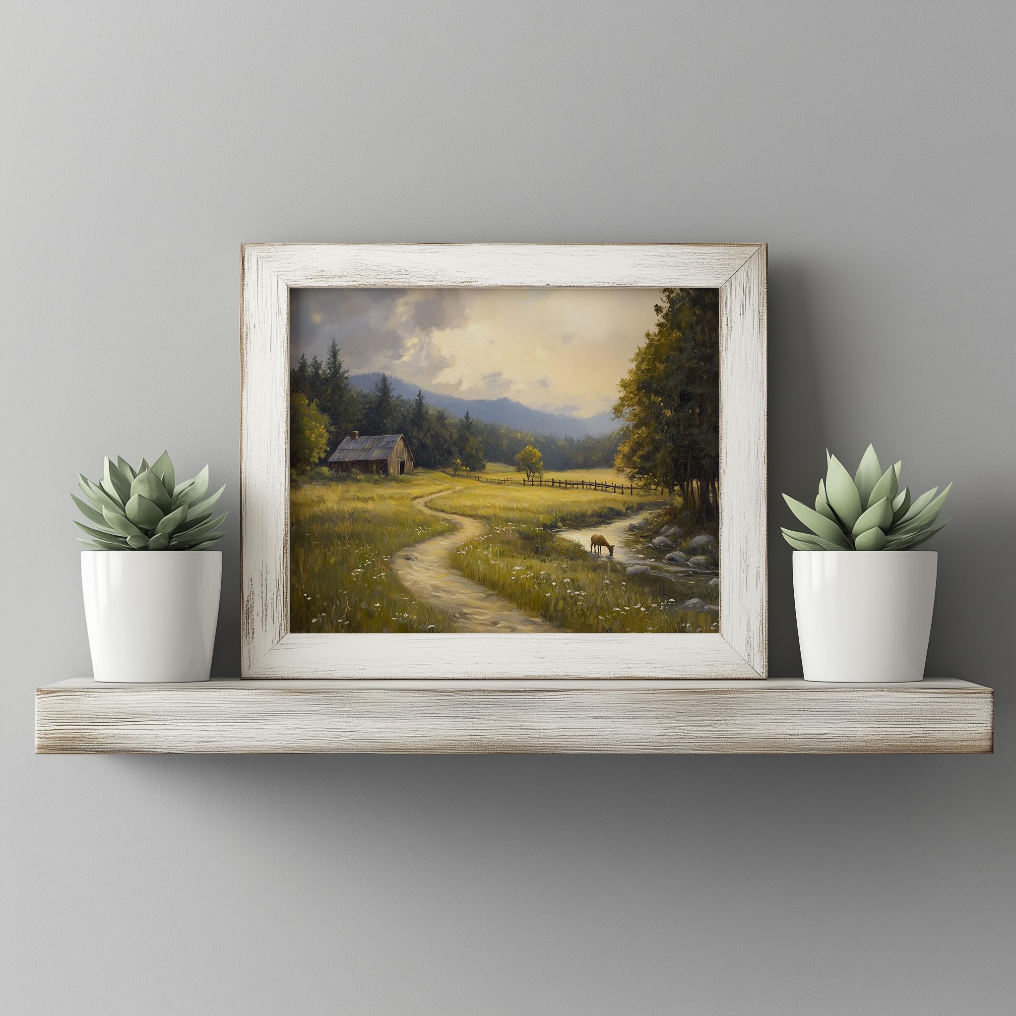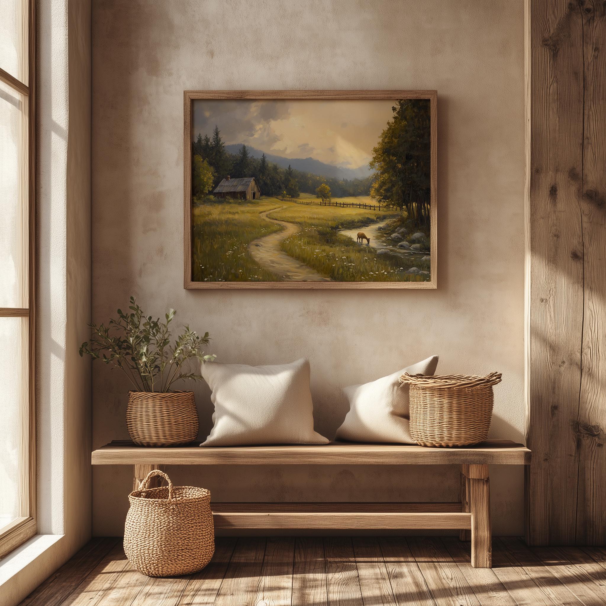 Golden Meadow Landscape Print: Rustic Cottagecore Oil Painting (Digital Download)