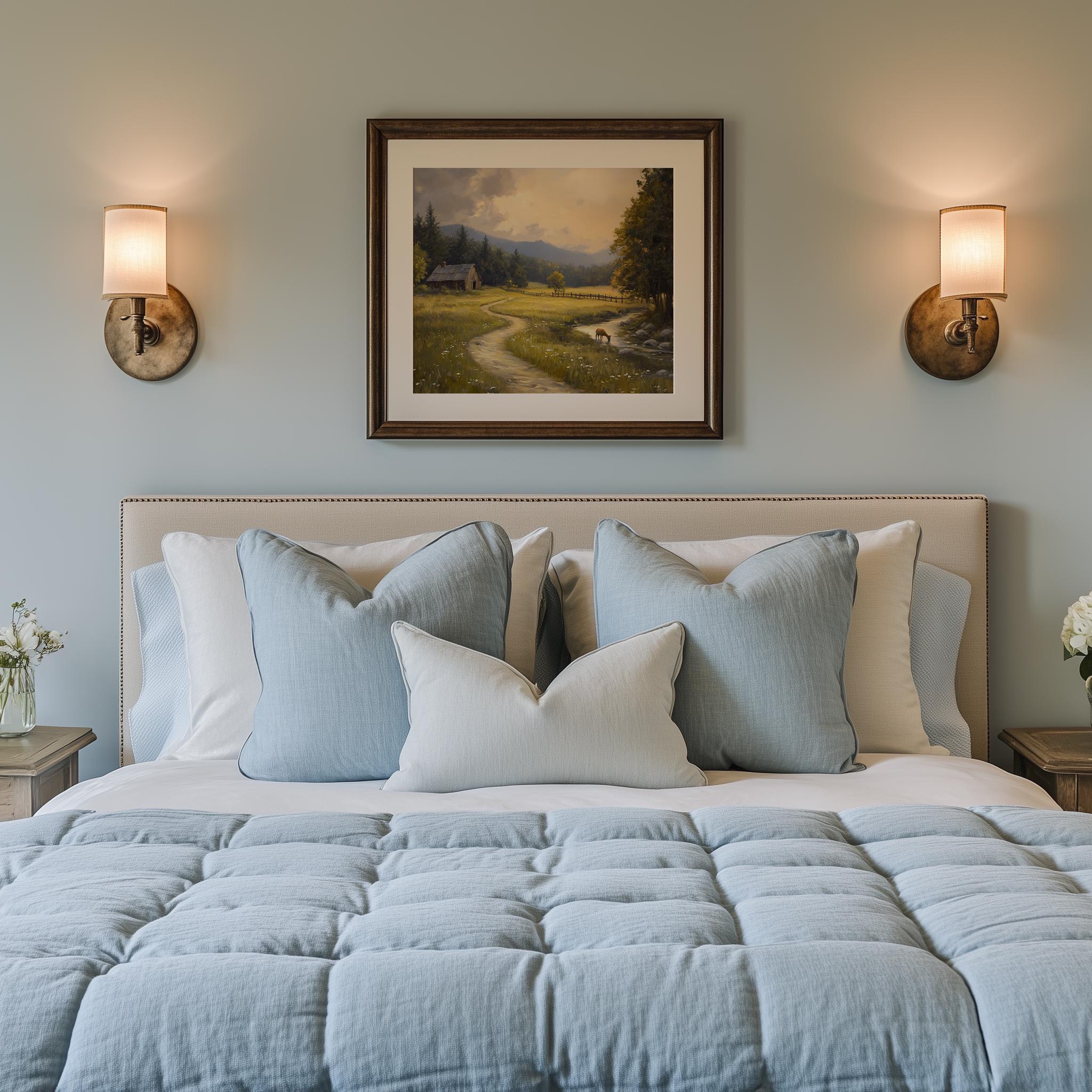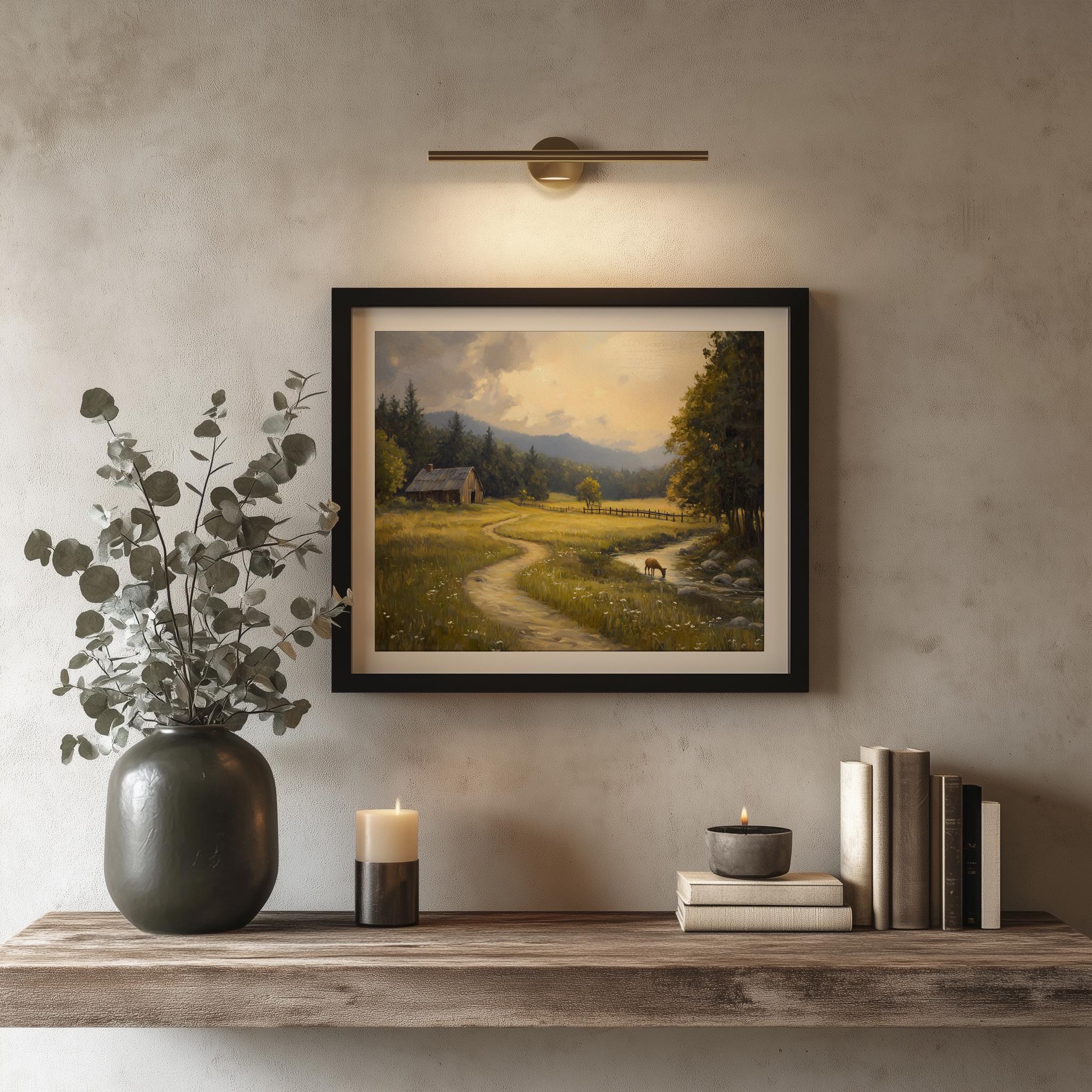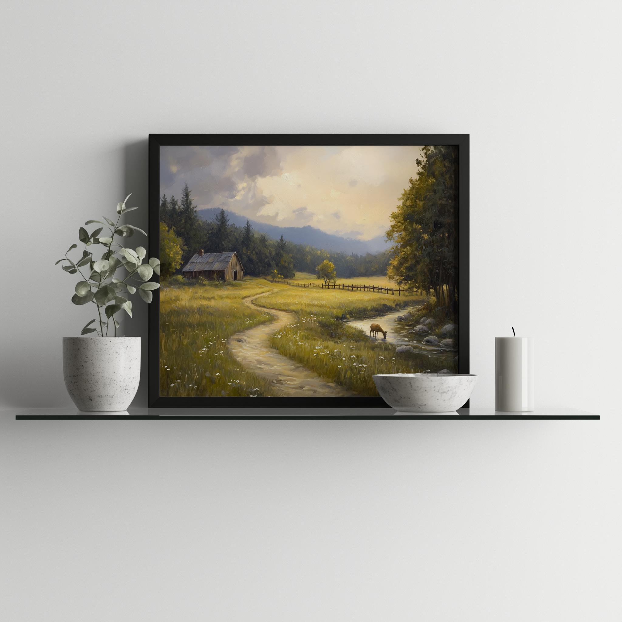 Golden Meadow Landscape Print: Rustic Cottagecore Oil Painting (Digital Download)