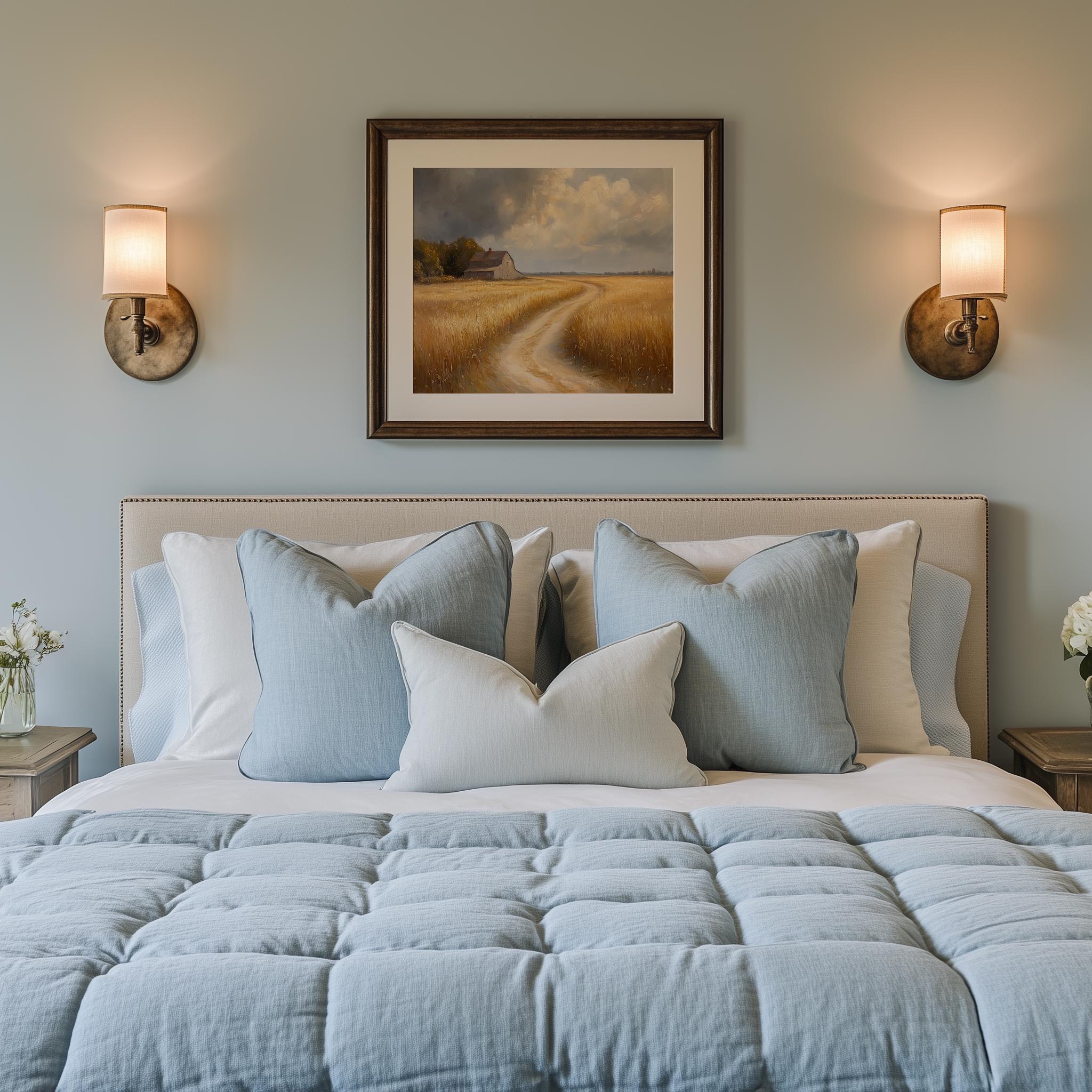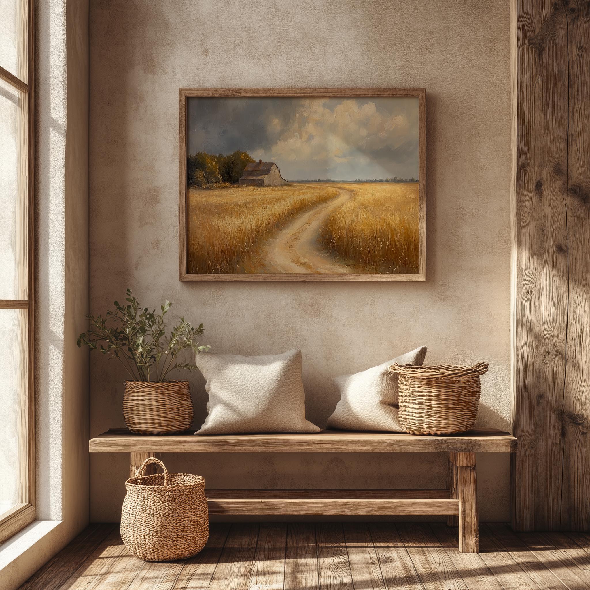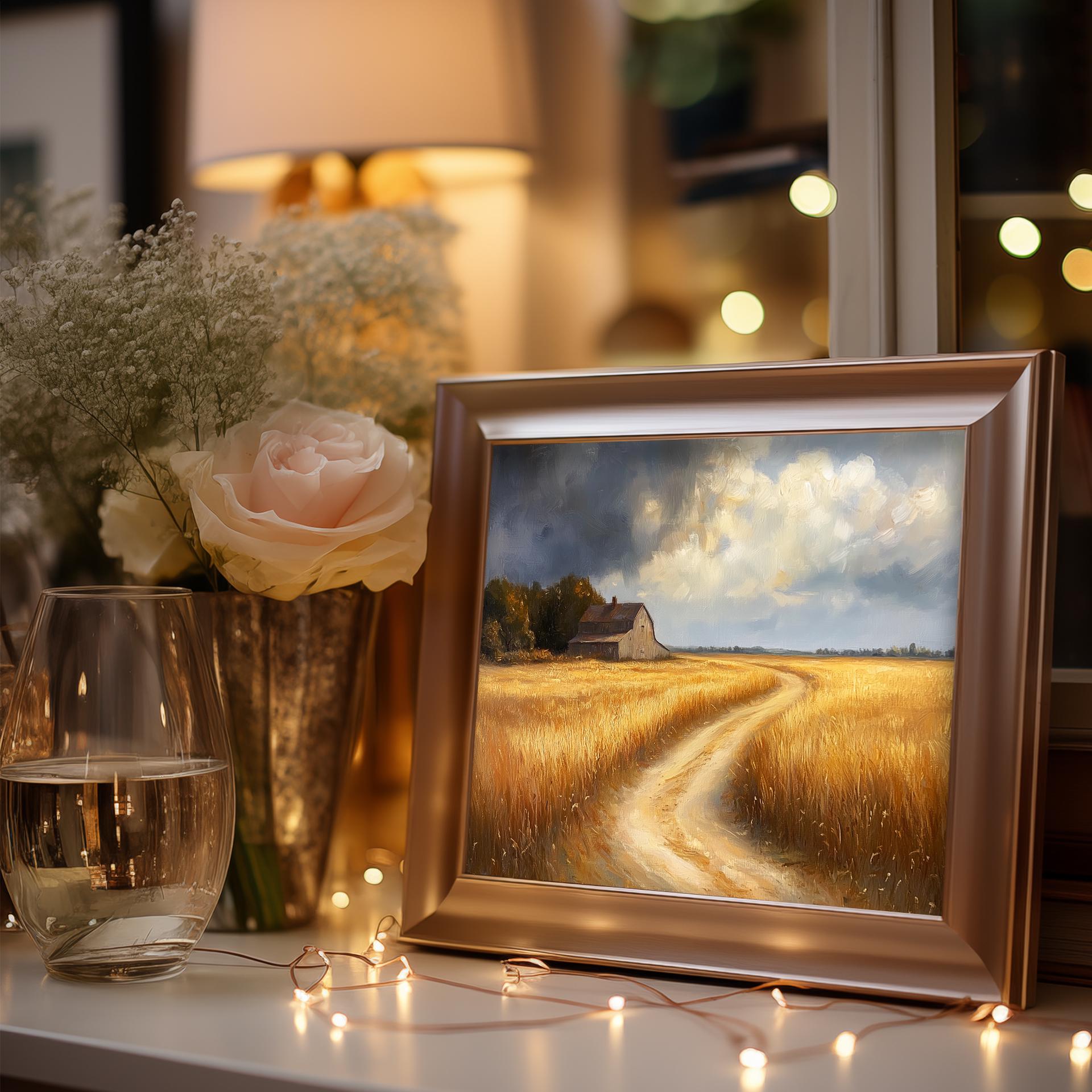 Rustic Golden Fields Oil Painting: Cottagecore Landscape Art (Digital Download