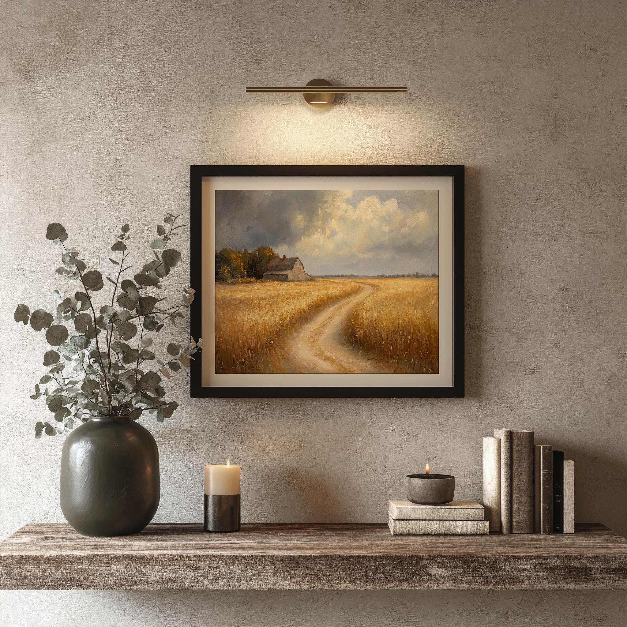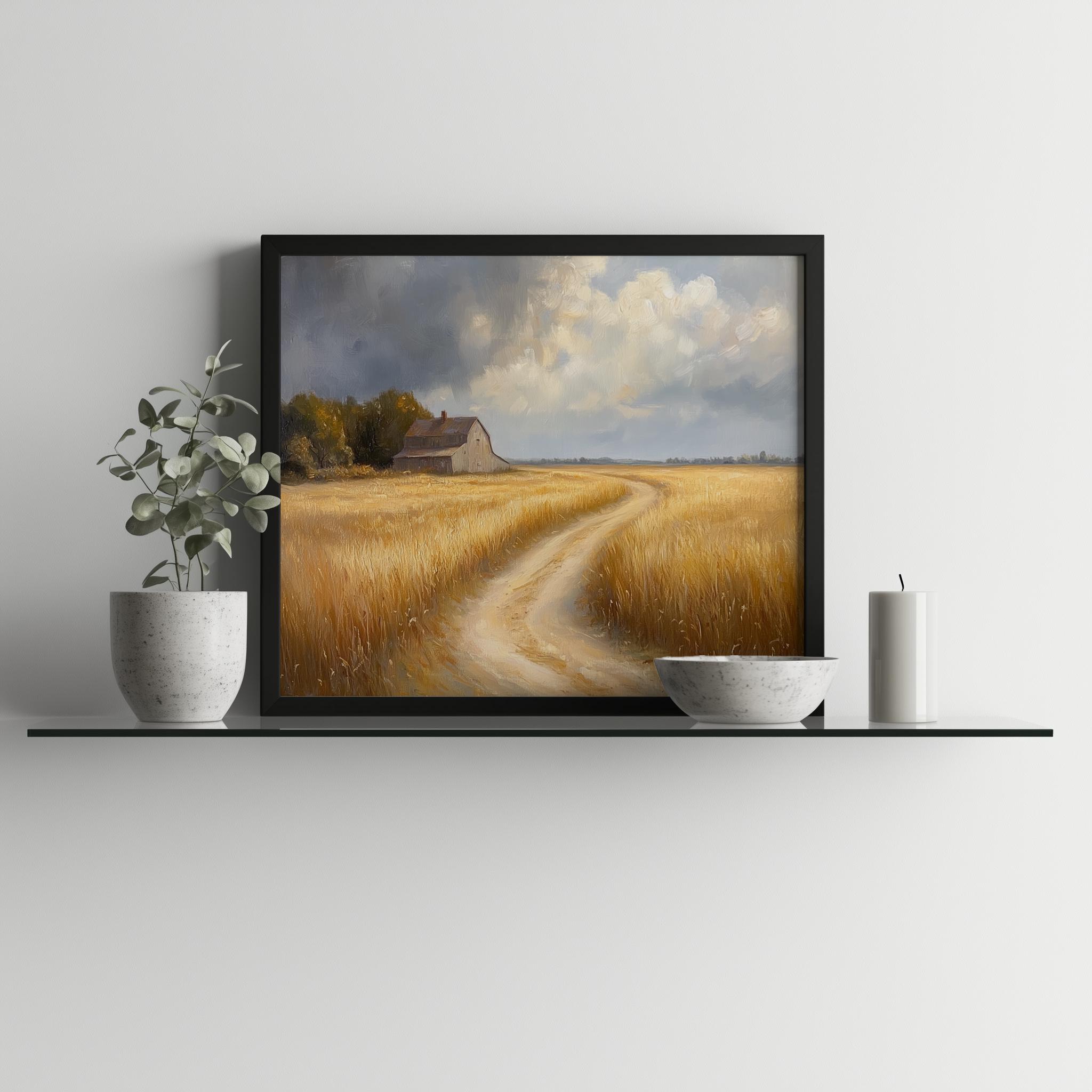 Rustic Winding Dirt Path Oil Painting - A Serene Escape into Nature Immerse yourself in the tranquil beauty of our Rustic Winding Dirt Path Oil Painting. This enchanting artwork captures the golden fields and earthy tones of the countryside, inviting you to explore the serene landscapes that inspire peace and reflection. Perfect as a printable wall art piece, it brings a touch of cottagecore charm to your home decor. Whether you're looking to elevate your living space or searching for a thoughtful gift, this digital download will transform any room into a cozy retreat. Perfect for showcasing during the vibrant autumn months, when nature's colors are at their peak.