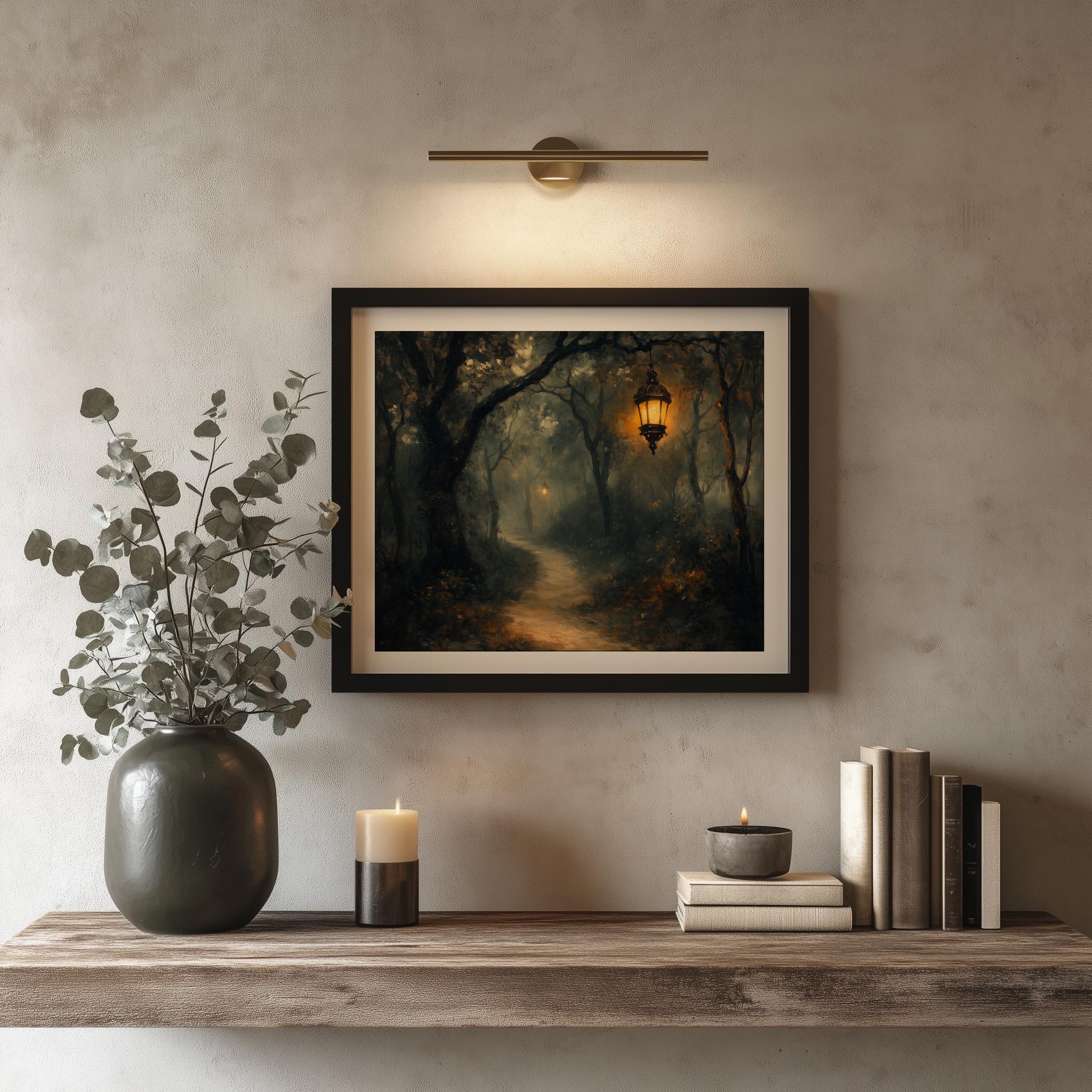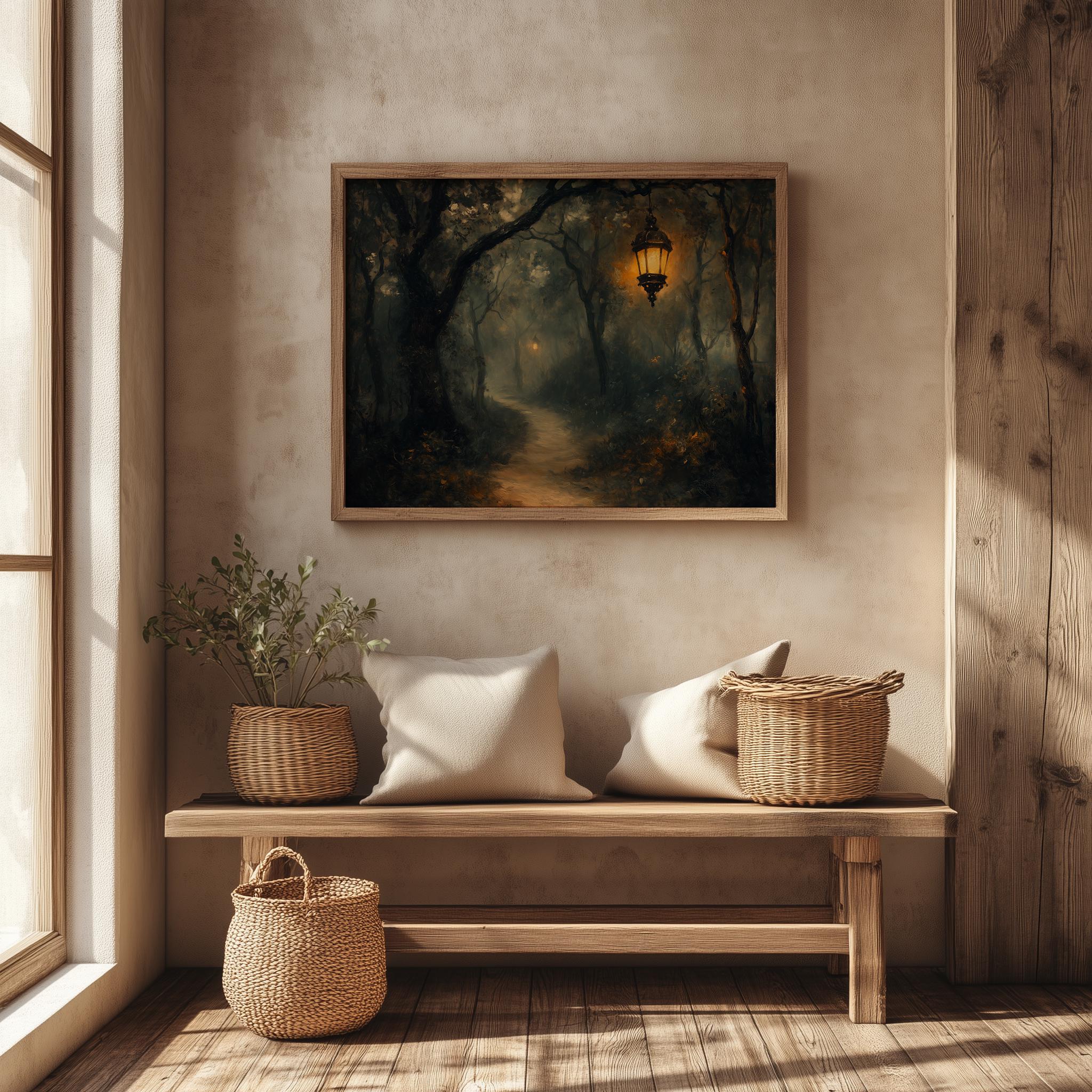 Rustic Forest Oil Painting - Shadowy Woods with Winding Path, Moody Nature Decor Immerse yourself in the enchanting beauty of our Rustic Forest Oil Painting. This captivating artwork features a mystical scene of shadowy woods and a winding path, inviting you to explore the tranquility of nature. Ideal for adding a touch of vintage charm to your home, this piece captures the essence of moody landscapes, making it a perfect accent for any room. Whether you're looking for printable art to elevate your decor or a statement piece for your living space, this painting embodies the allure of country landscapes and cottagecore aesthetics. Perfect for cozy autumn days and serene winter evenings, bringing warmth and comfort to your home.