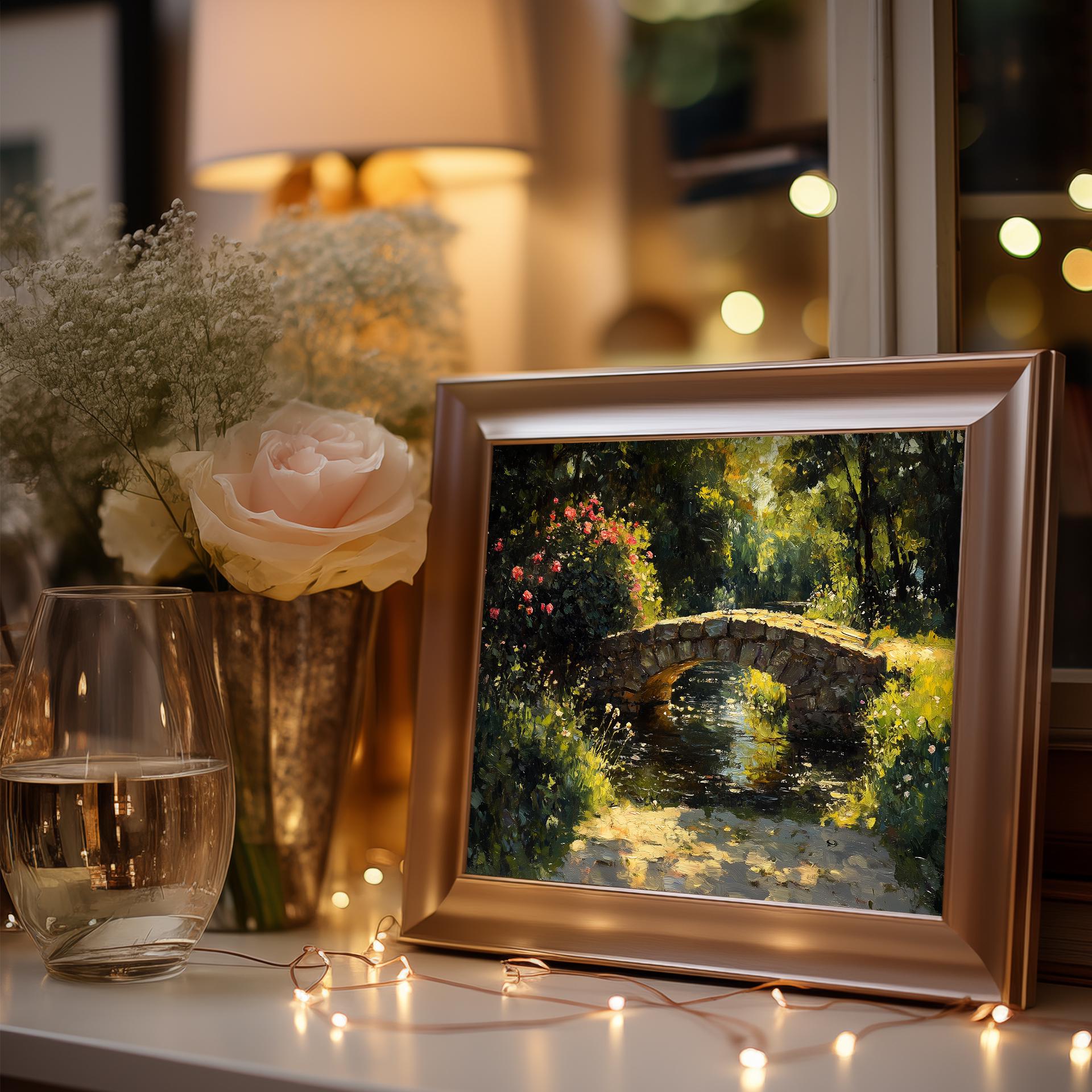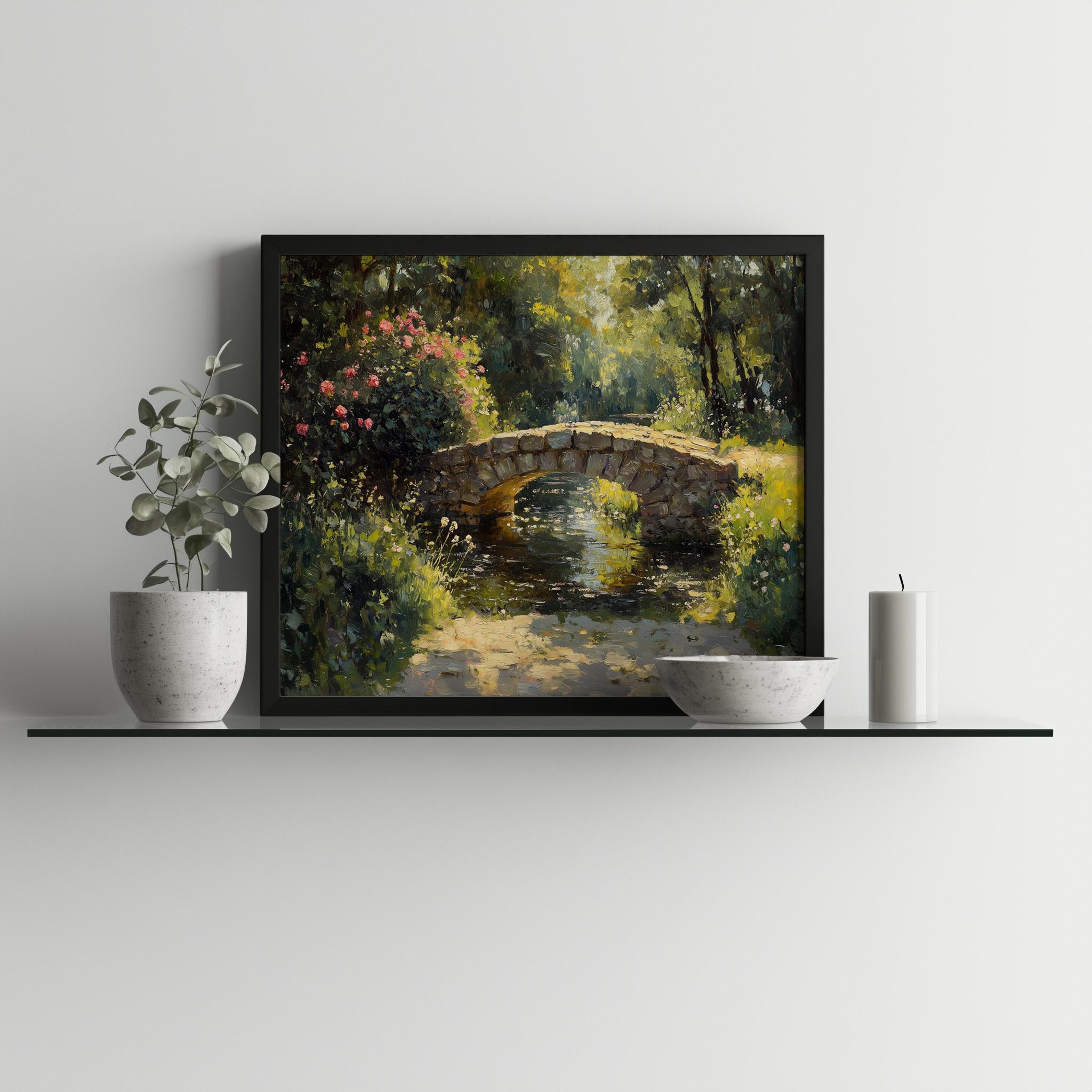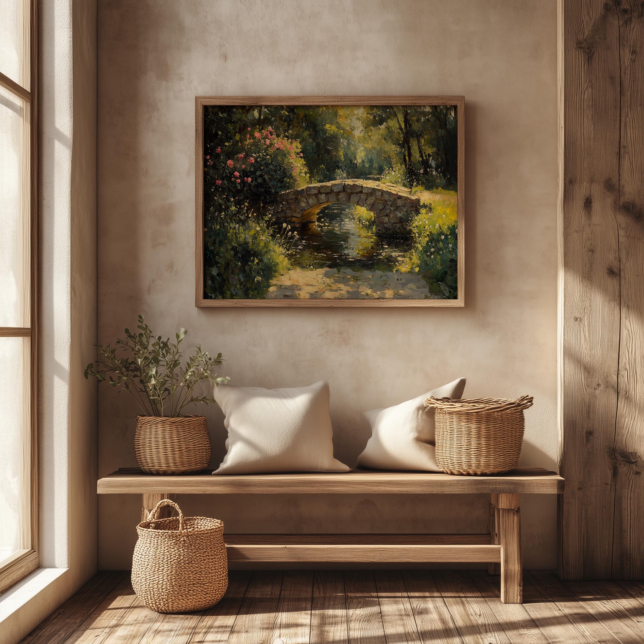 Vintage Stone Bridge Oil Painting: Rustic Cottagecore Landscape Art (Digital Download)