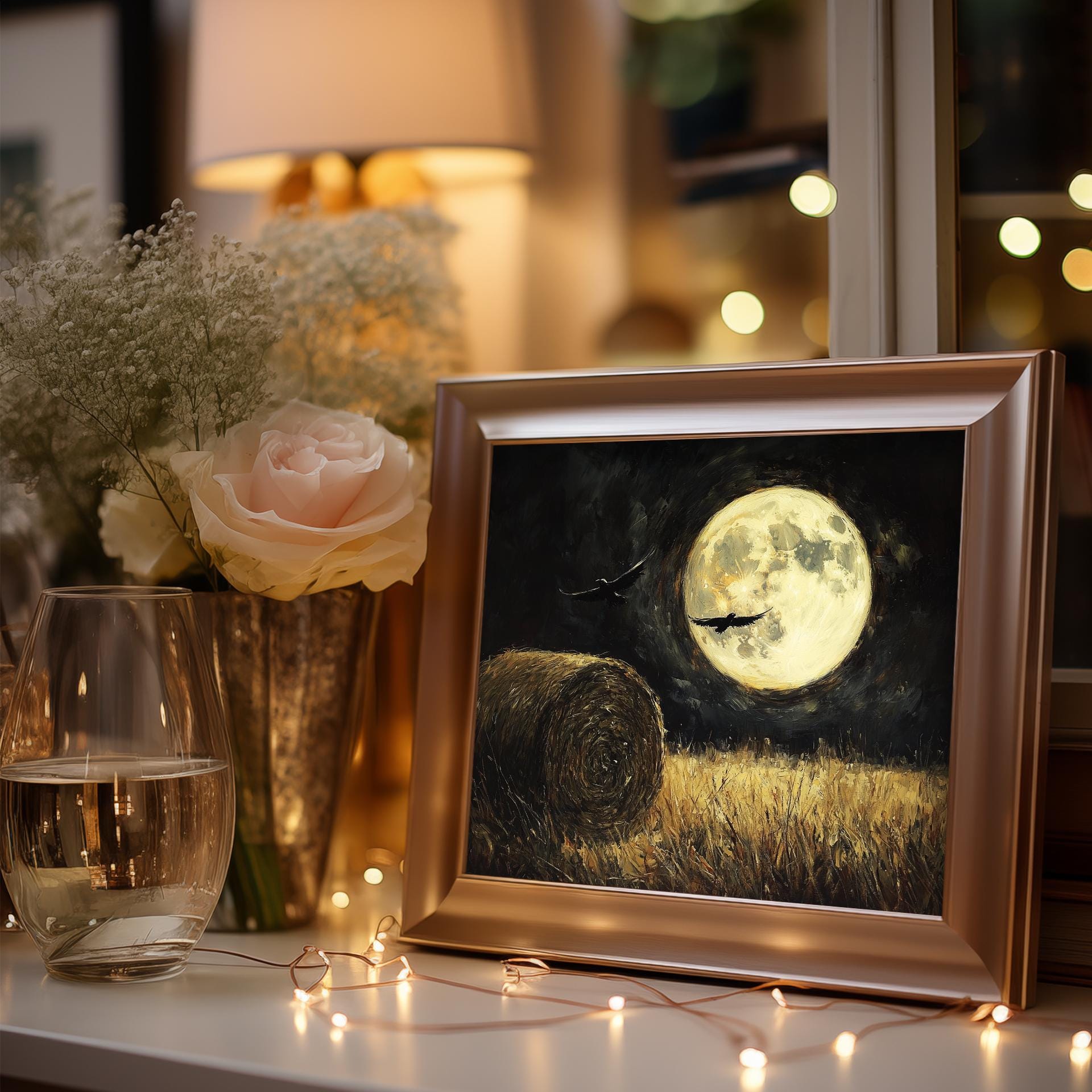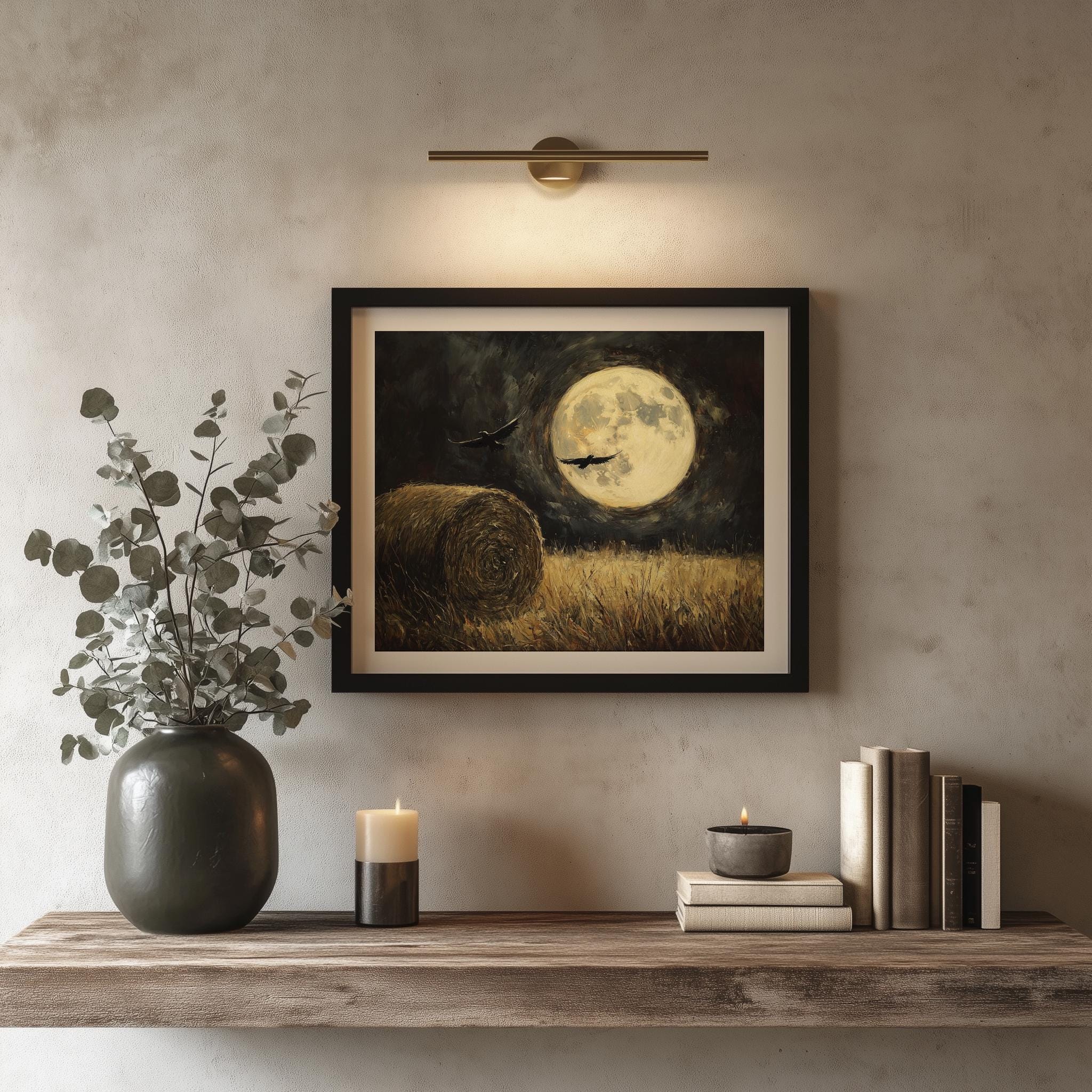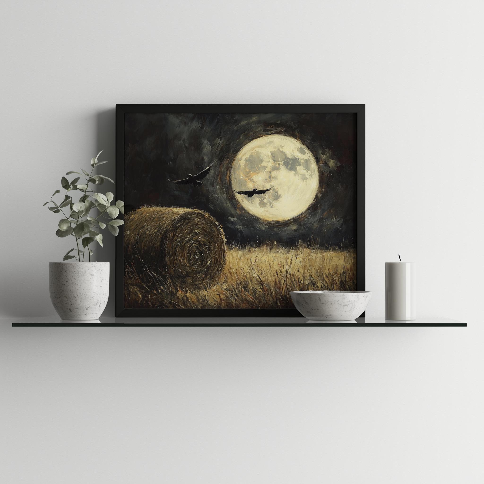 Full Moon Over Field Printable - Rustic Moonlit Night Landscape Art This enchanting digital download captures the serene beauty of a moonlit night over a lush hay field. Perfect for adding a touch of rustic charm to your home, this artwork evokes a sense of tranquility and connection to nature. Ideal for cottagecore enthusiasts and those who appreciate the magic of night scenes, this piece is a versatile addition to any wall decor. Perfect for cozy autumn evenings, this artwork enhances the warmth of your home as the nights grow longer.