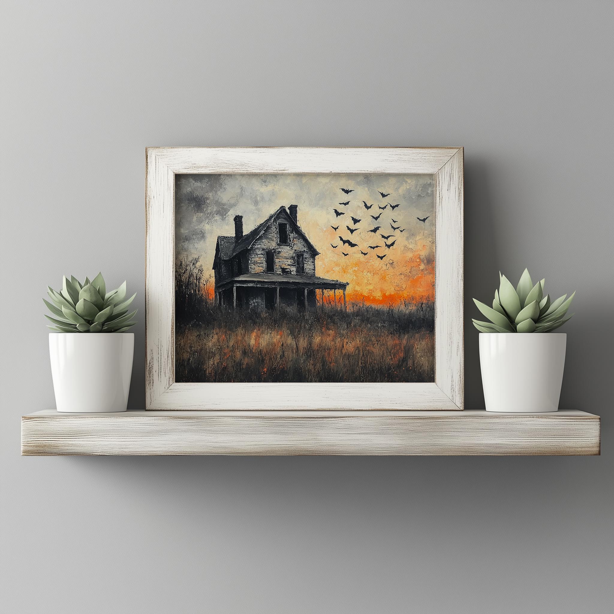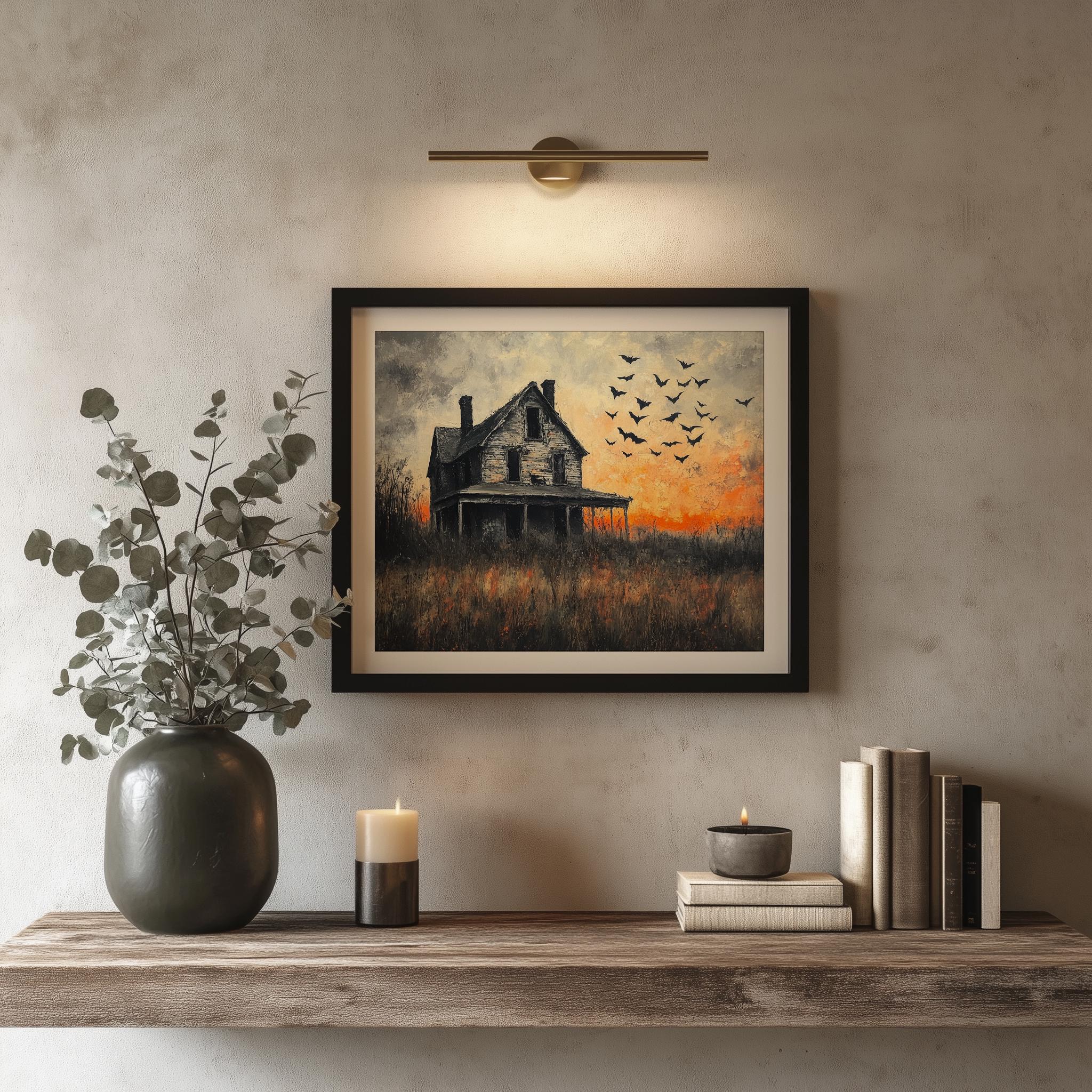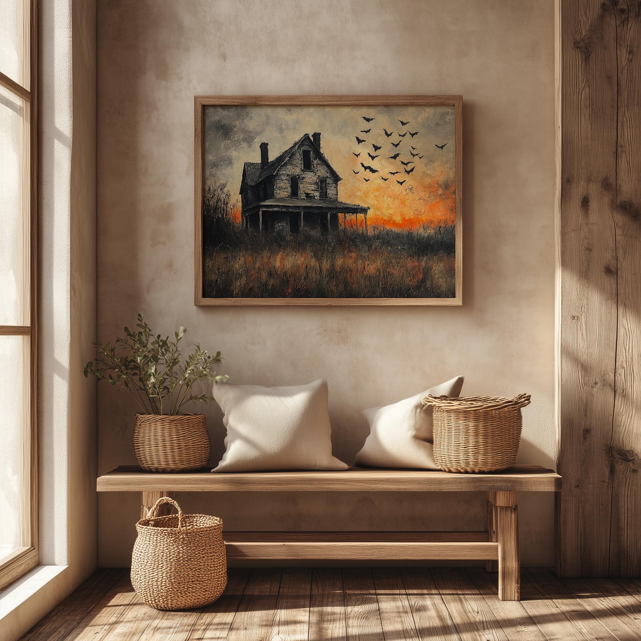 Rustic Autumn Farmhouse Scene - Printable Wall Art Immerse yourself in the tranquil beauty of an abandoned farmhouse at sunset with this stunning vintage landscape painting. Perfectly capturing the essence of countryside charm, this printable decor brings warmth and nostalgia to any space. Ideal for cottagecore enthusiasts and those who appreciate rustic aesthetics, this artwork invites a sense of peace and reflection into your home. Autumn