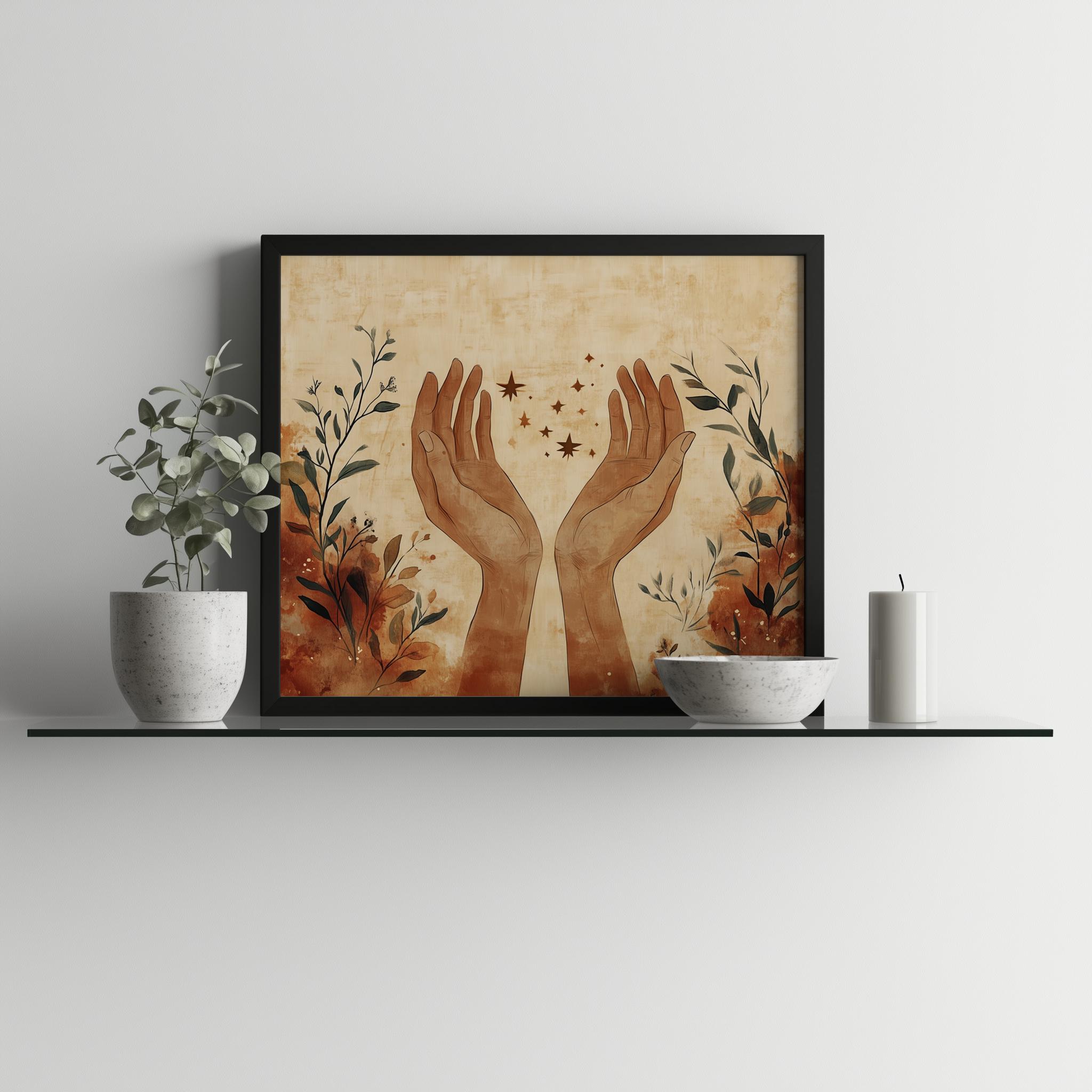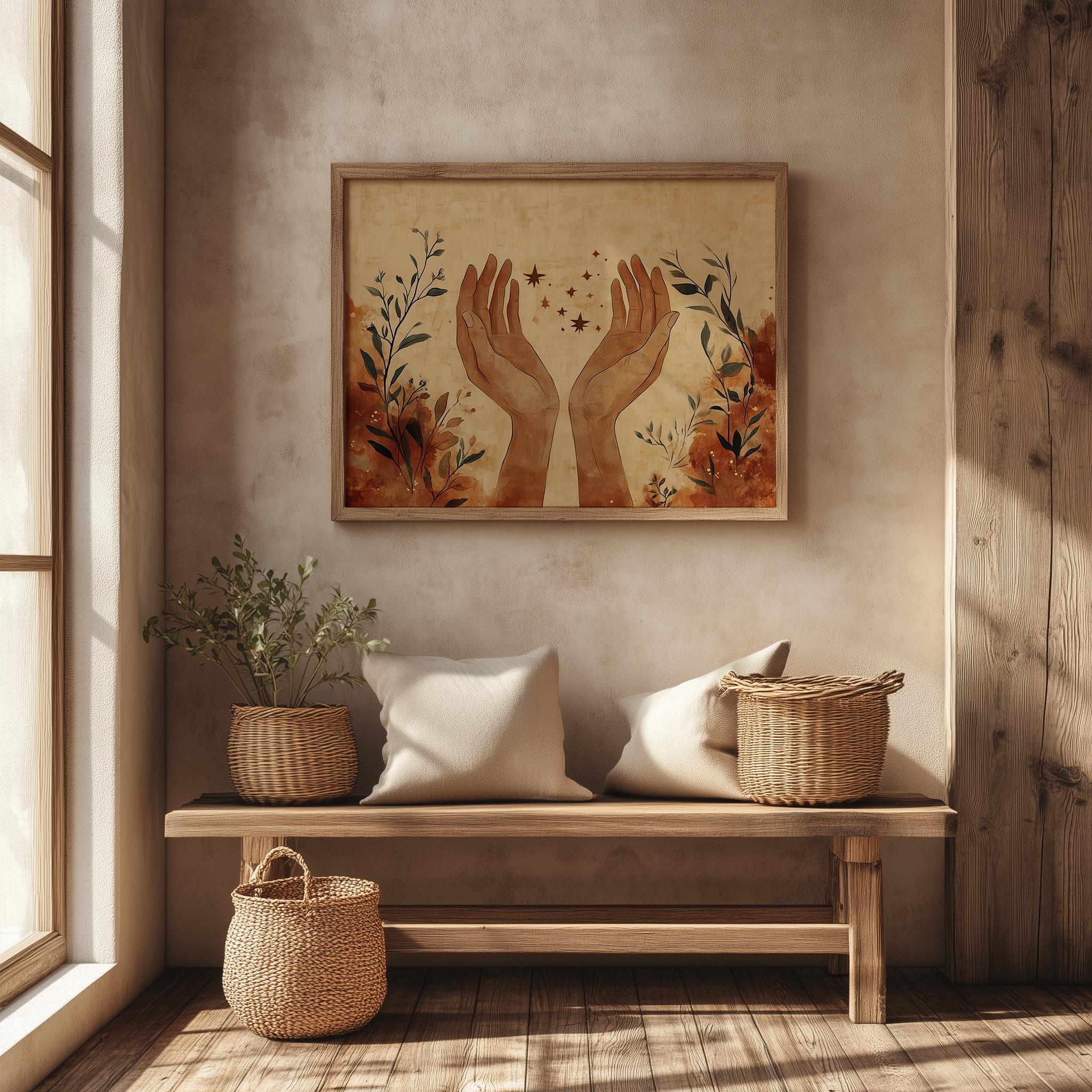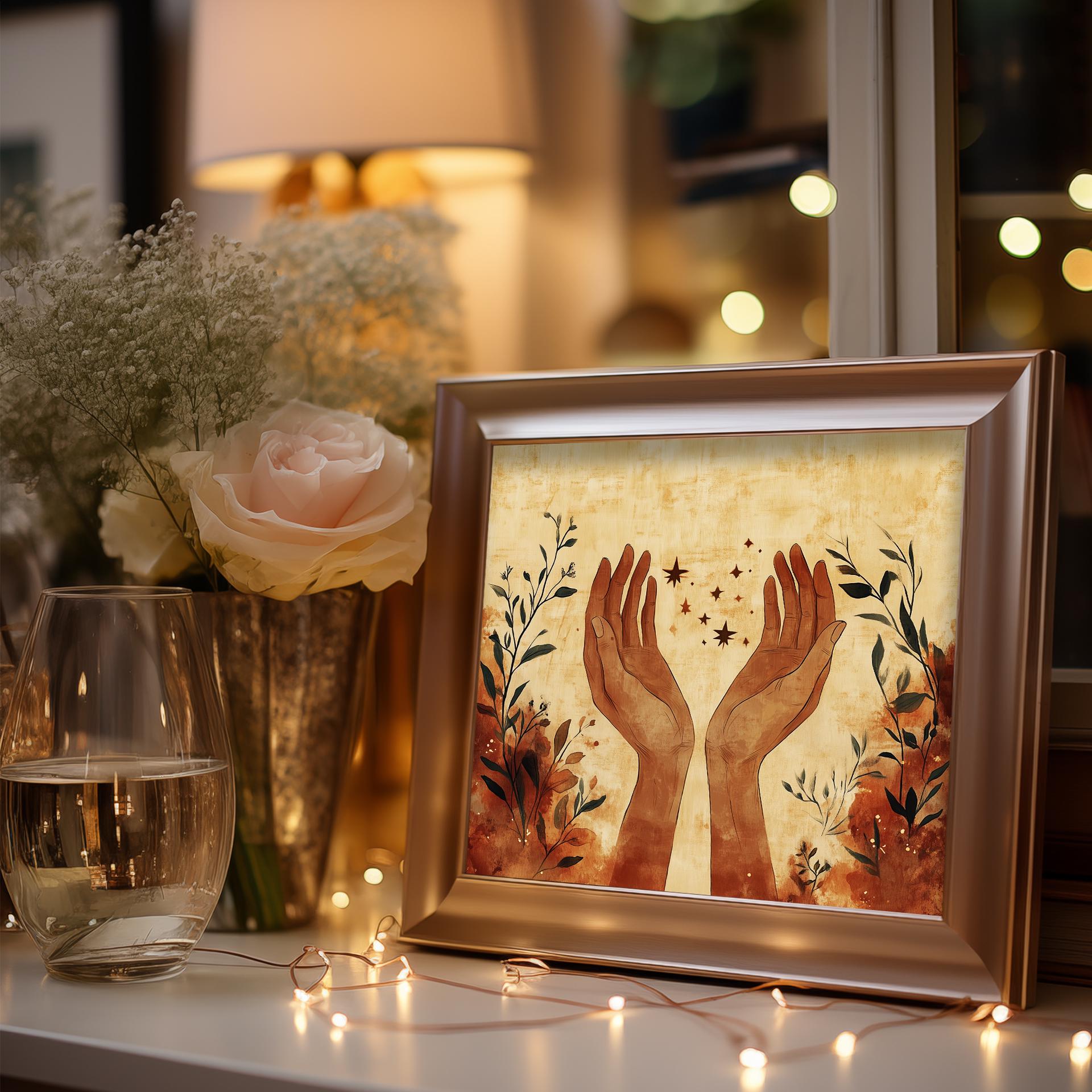 Minimalistic Boho Printable Art - Elegant Sketch of Open Hands This stunning piece features an elegant sketch of open hands, embodying a sense of serenity and connection. Crafted in earthy tones, this modern abstract art print is perfect for adding a touch of minimalistic boho decor to your bedroom or any living space. The digital download format allows you to instantly elevate your wall decor with contemporary elegance, making it an ideal choice for those who appreciate the beauty of simplicity and artistic expression. Perfect for year-round decoration, enhancing your space with warmth and tranquility.