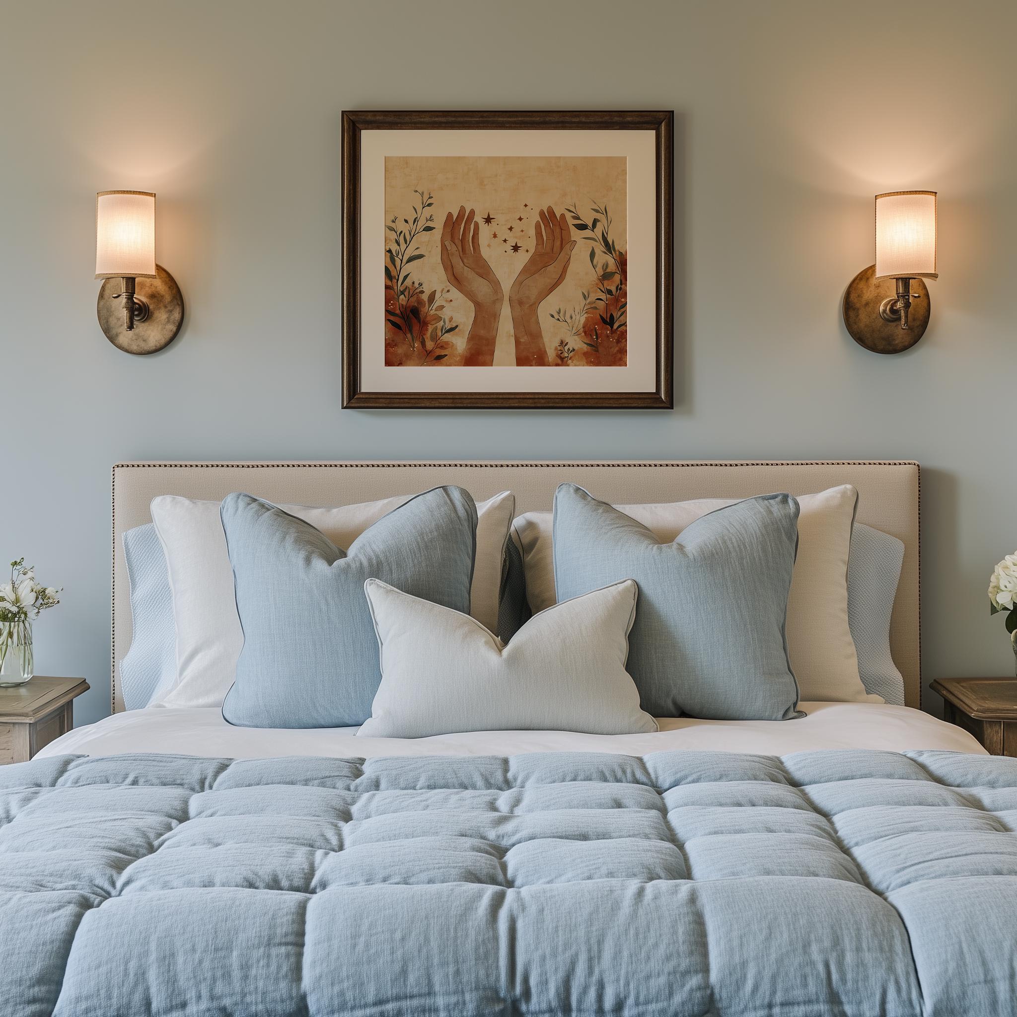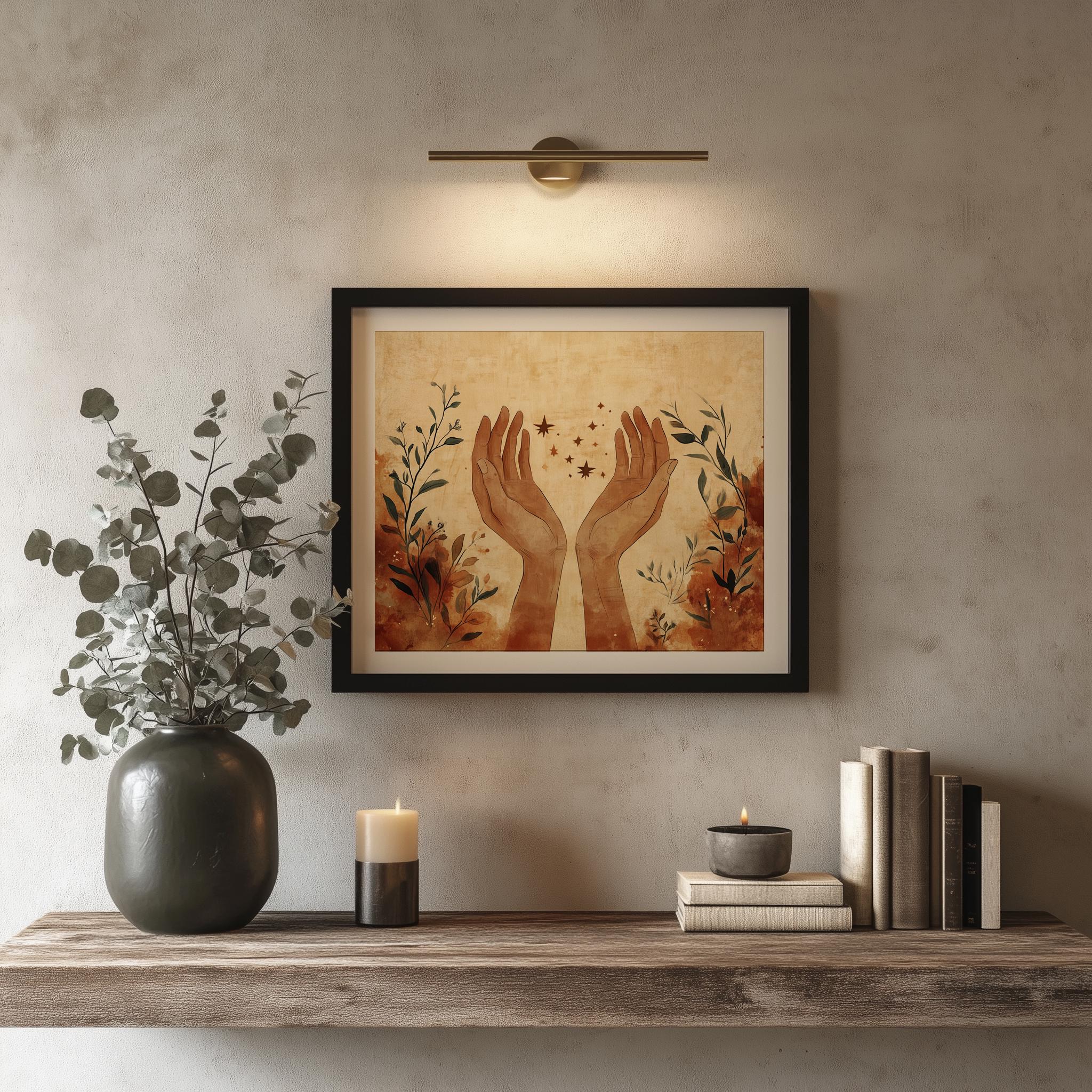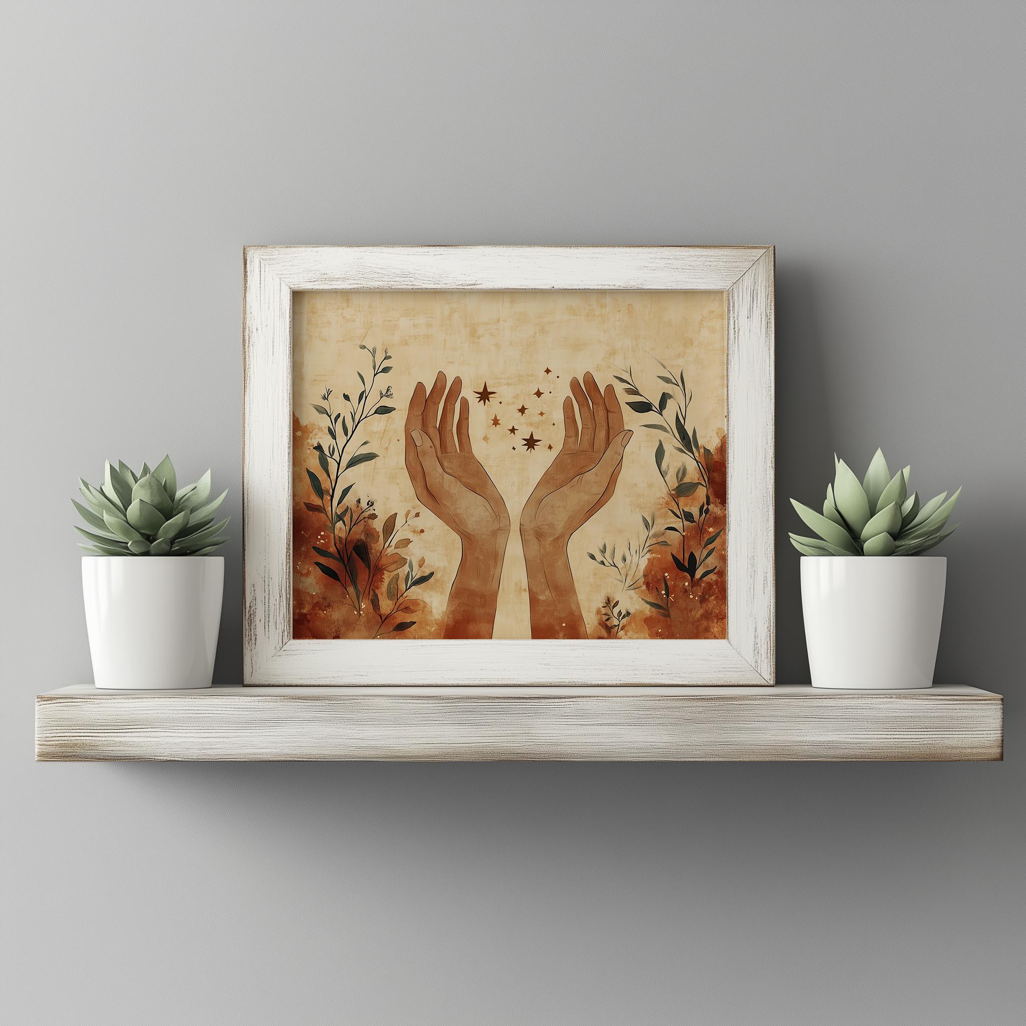 Minimalistic Boho Printable Art - Elegant Sketch of Open Hands This stunning piece features an elegant sketch of open hands, embodying a sense of serenity and connection. Crafted in earthy tones, this modern abstract art print is perfect for adding a touch of minimalistic boho decor to your bedroom or any living space. The digital download format allows you to instantly elevate your wall decor with contemporary elegance, making it an ideal choice for those who appreciate the beauty of simplicity and artistic expression. Perfect for year-round decoration, enhancing your space with warmth and tranquility.