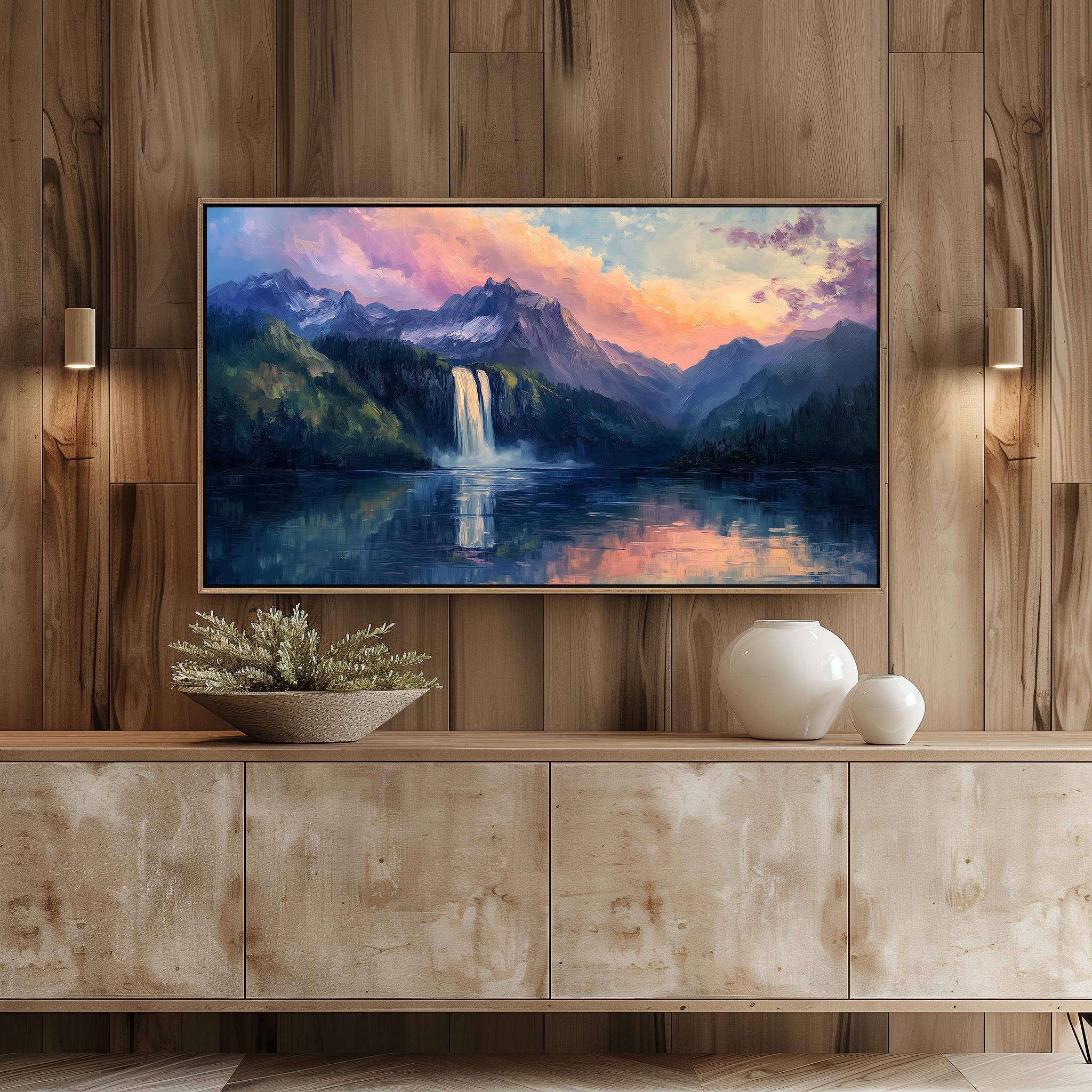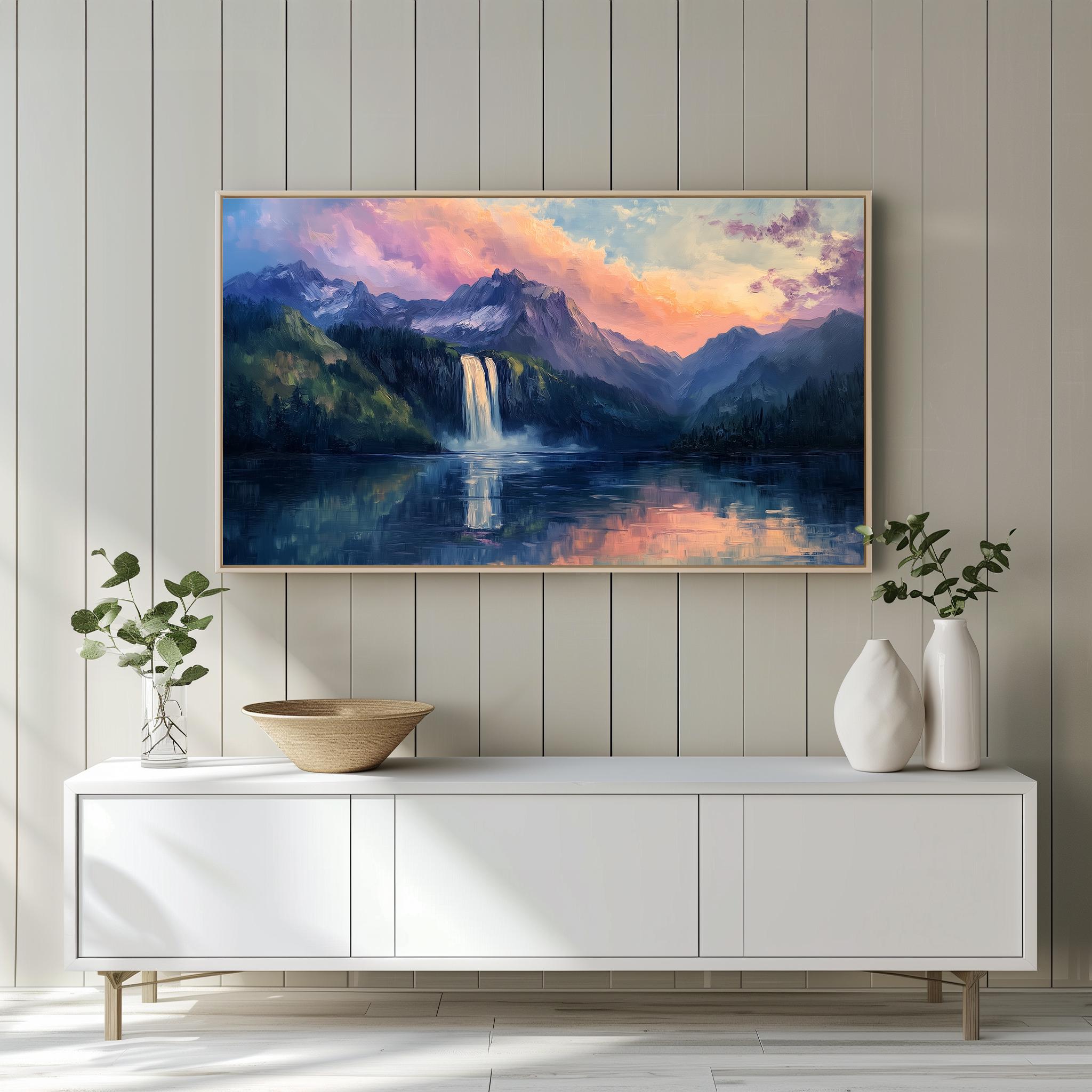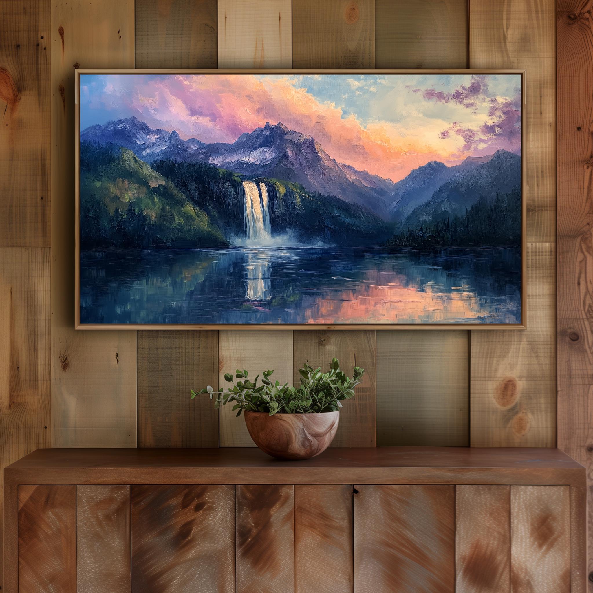 Mountain Waterfall Sunrise TV Art Bring the tranquility of nature into your living space with this stunning Mountain Waterfall Sunrise TV Art. This digital download features a serene landscape painting that captures the beauty of a cascading waterfall bathed in the warm hues of a sunrise. Perfect for your Samsung Frame TV, this artwork transforms your wall into a picturesque escape, evoking feelings of peace and rustic charm. Perfect for any season, this artwork enhances your home decor year-round.