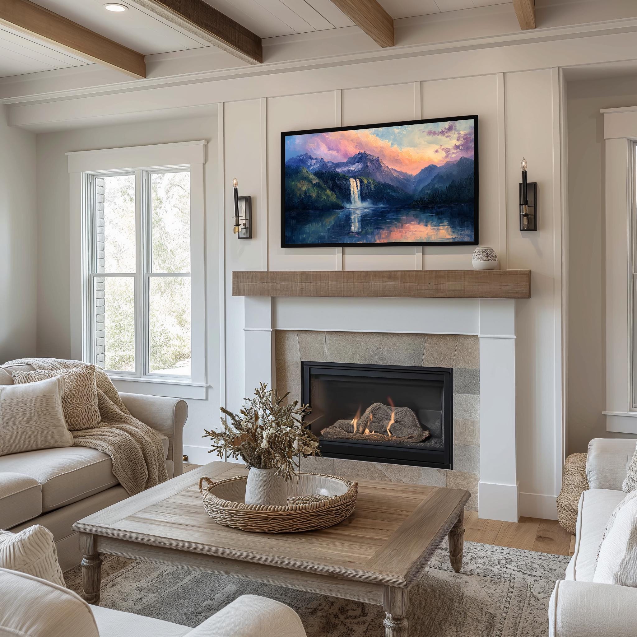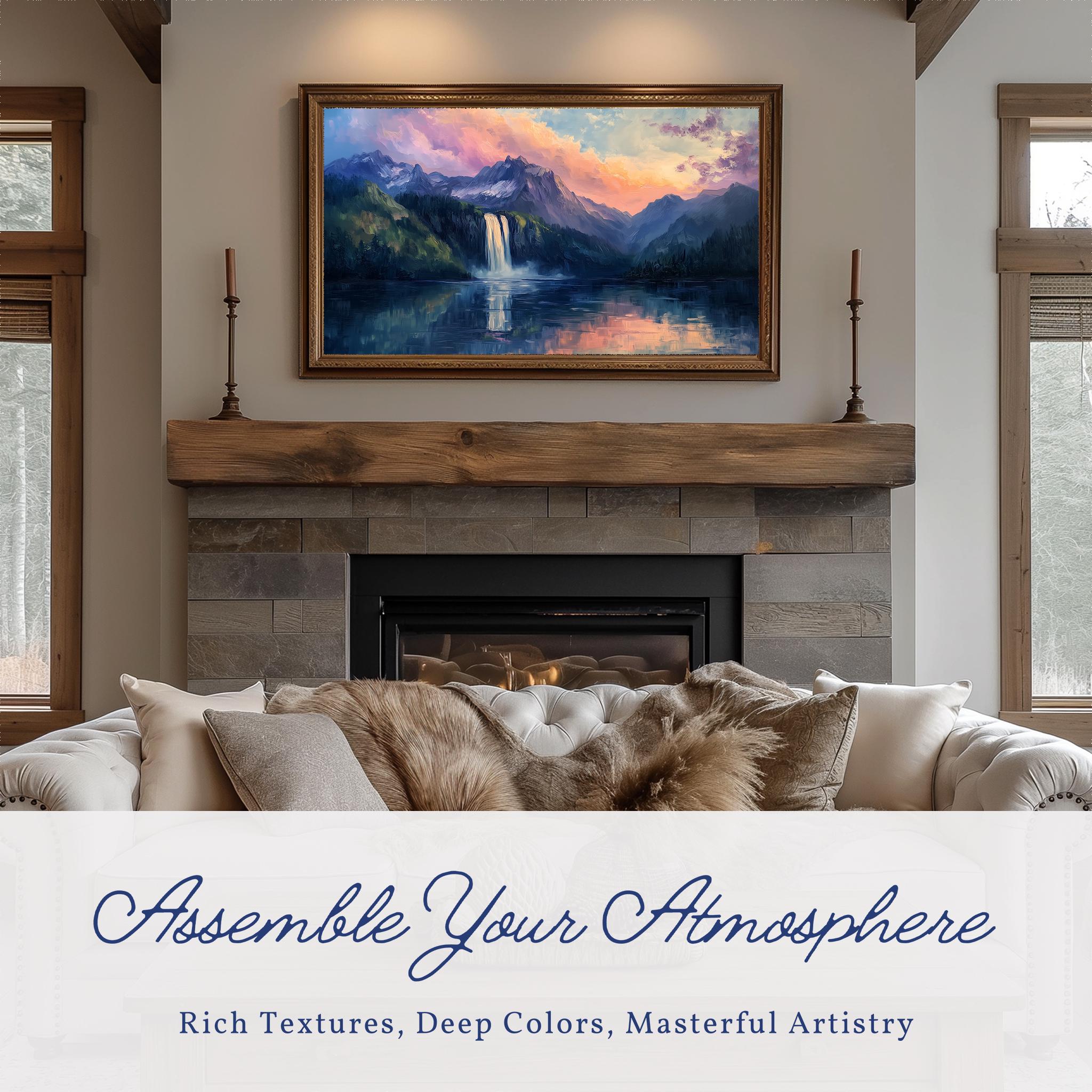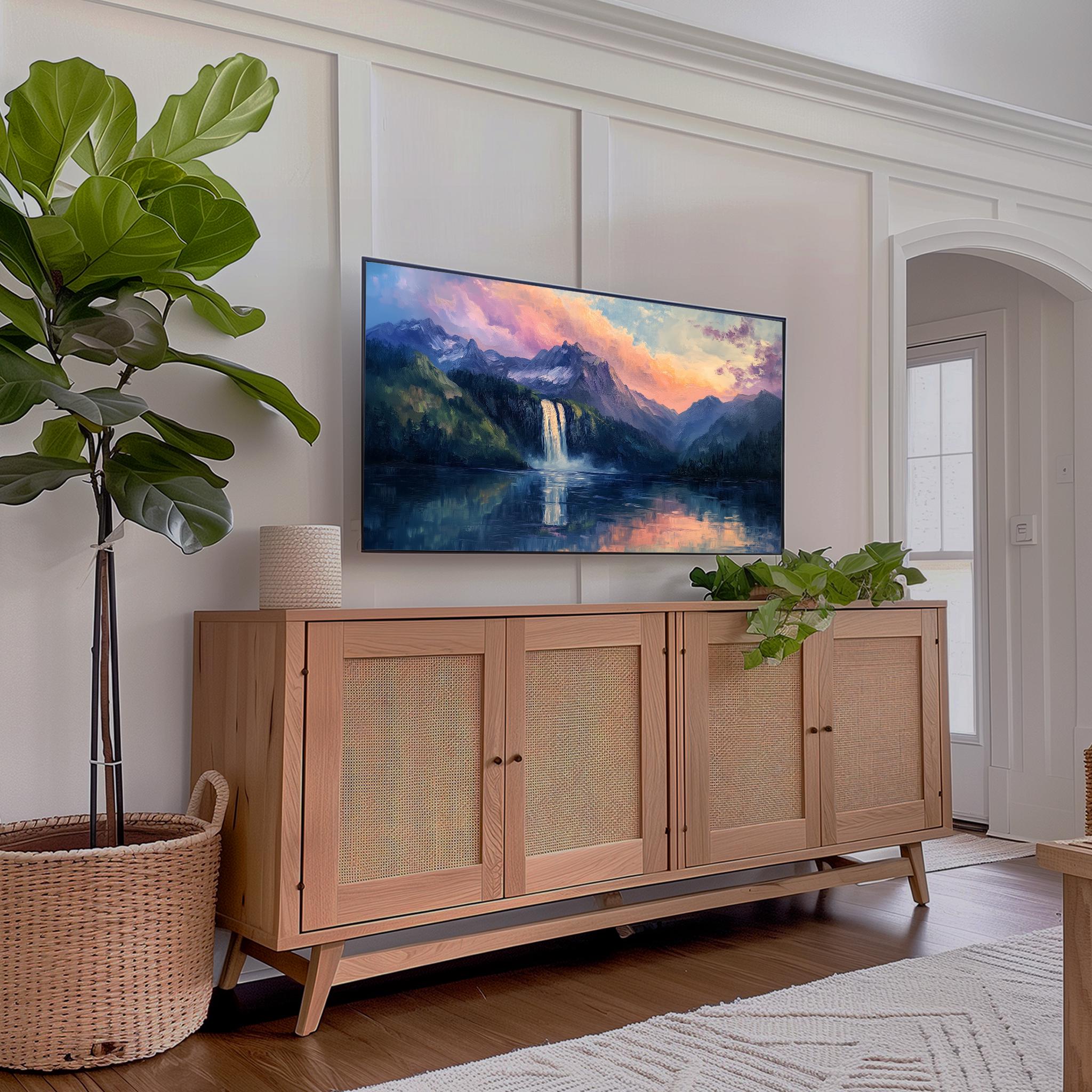 Mountain Waterfall Sunrise TV Art Bring the tranquility of nature into your living space with this stunning Mountain Waterfall Sunrise TV Art. This digital download features a serene landscape painting that captures the beauty of a cascading waterfall bathed in the warm hues of a sunrise. Perfect for your Samsung Frame TV, this artwork transforms your wall into a picturesque escape, evoking feelings of peace and rustic charm. Perfect for any season, this artwork enhances your home decor year-round.
