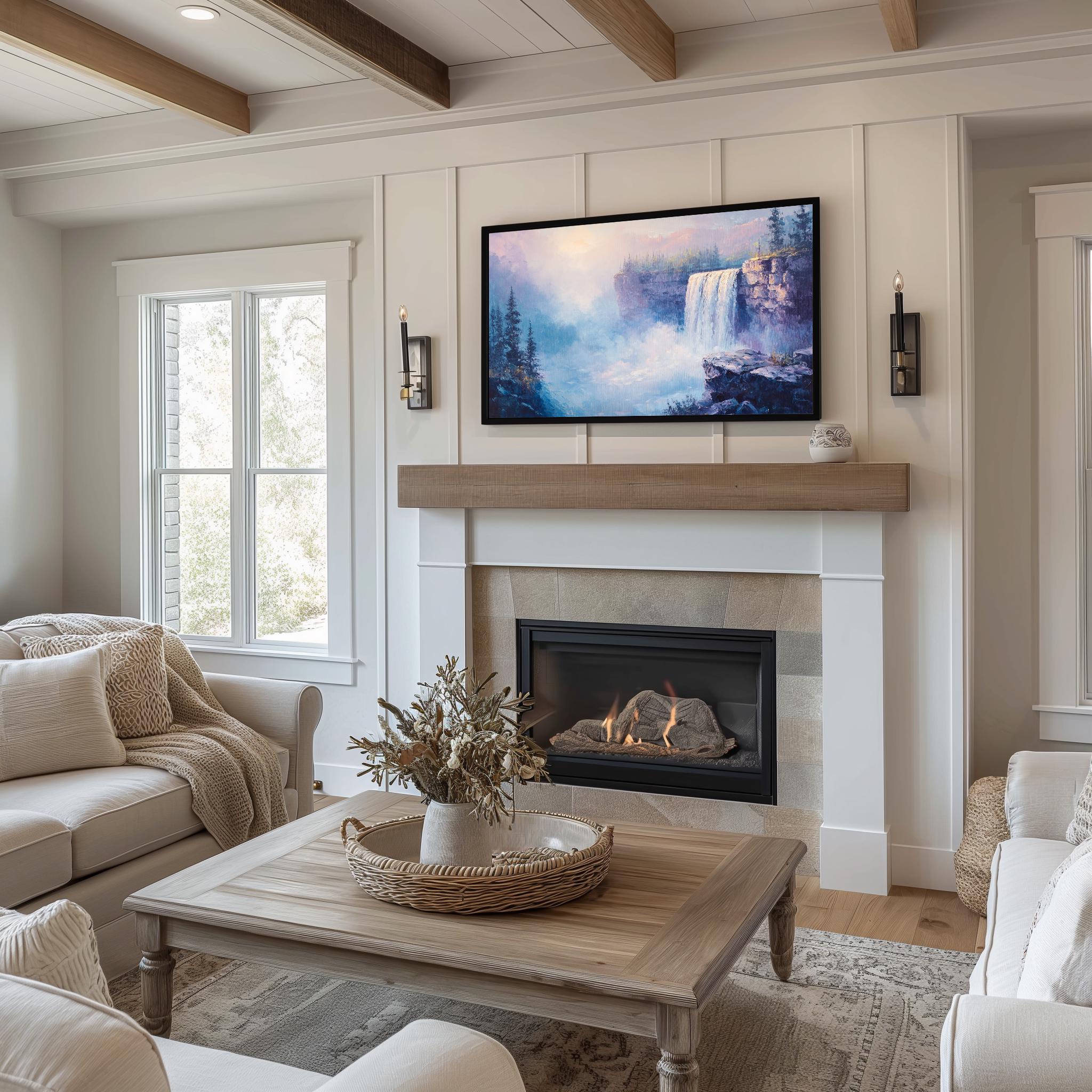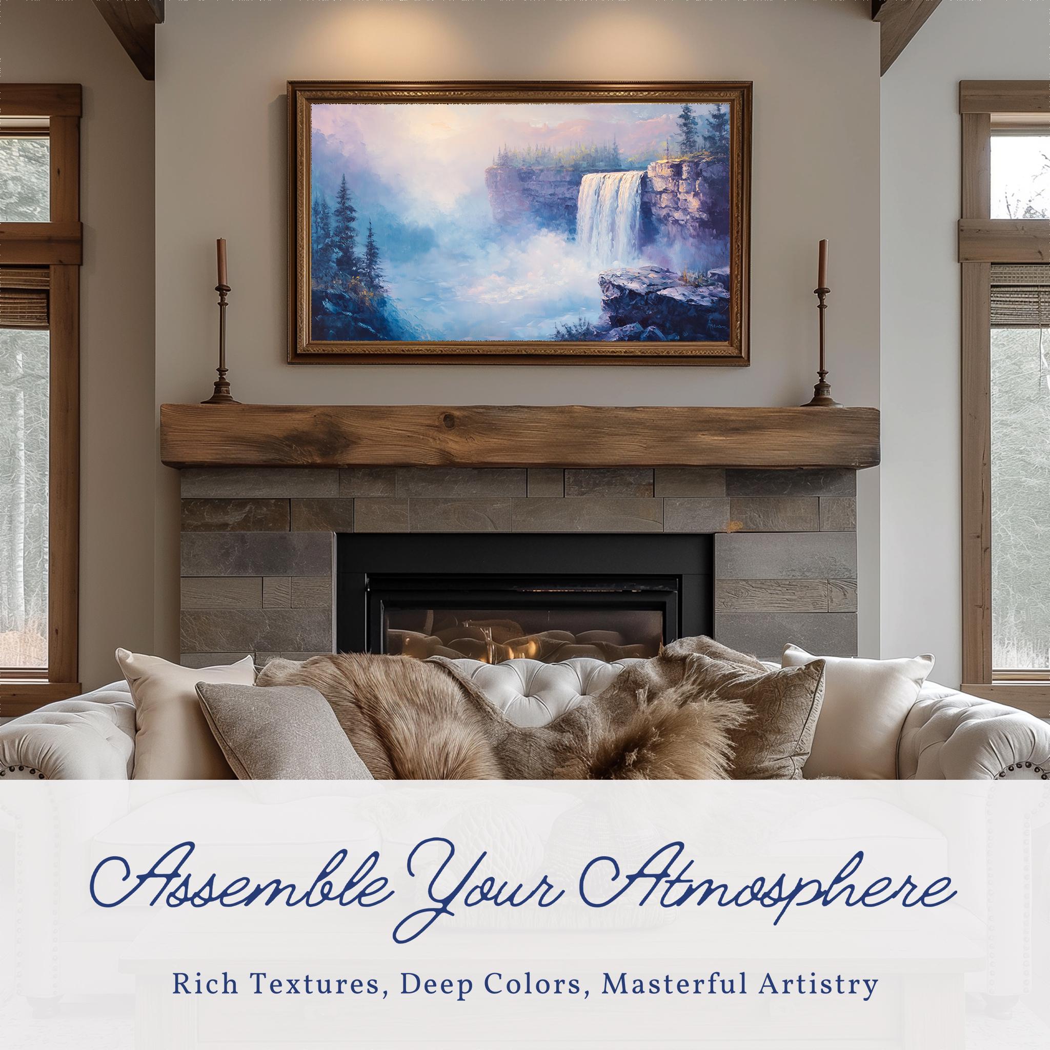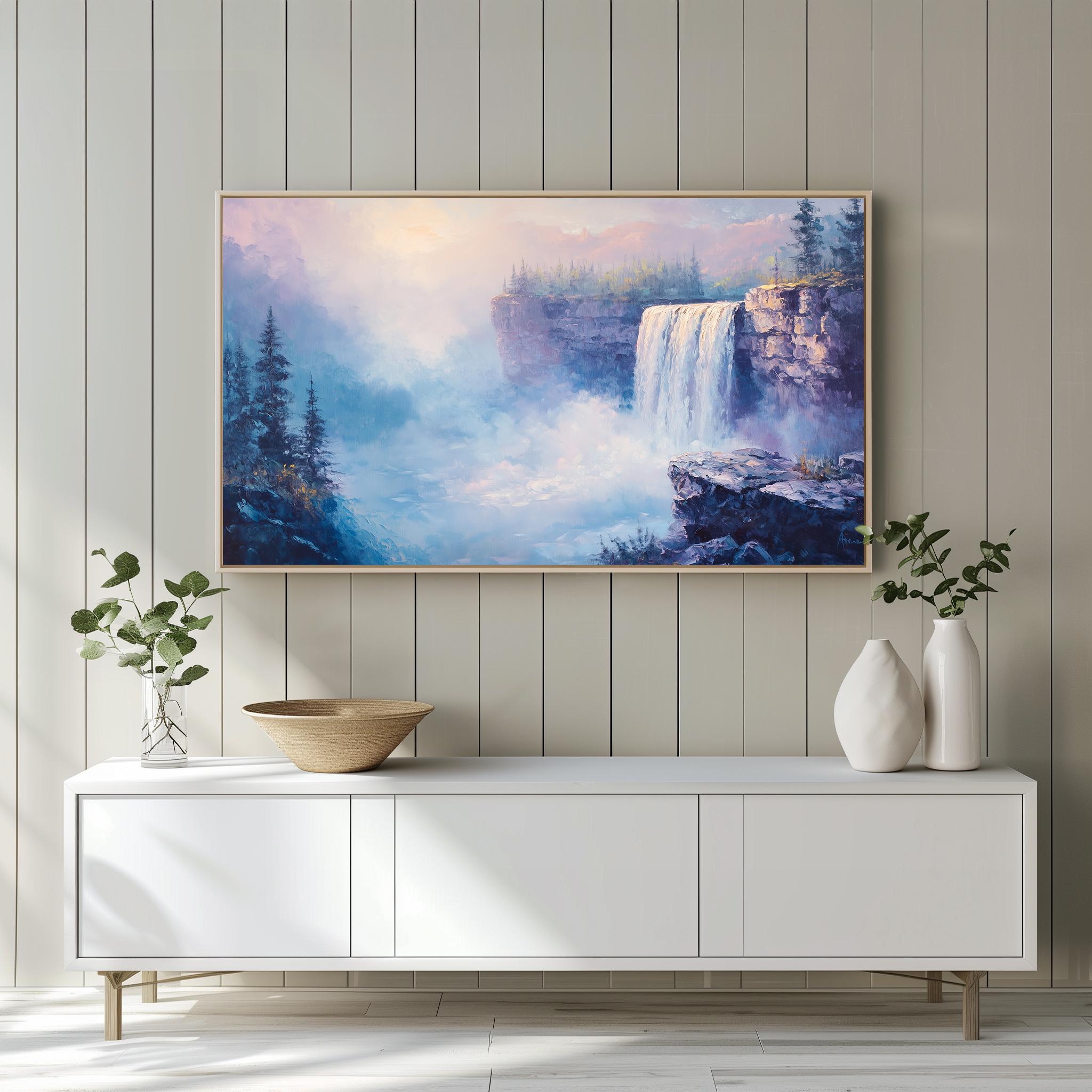 Majestic Waterfall Frame TV Art Transform your living space with this breathtaking digital download art piece featuring a grand waterfall nestled in a tranquil landscape. Perfectly designed for Samsung Frame TVs, this scenic wall decor brings the serene beauty of nature into your home, creating a peaceful ambiance that complements any room. Perfect for all seasons, this artwork invites a sense of calm and connection to nature year-round.