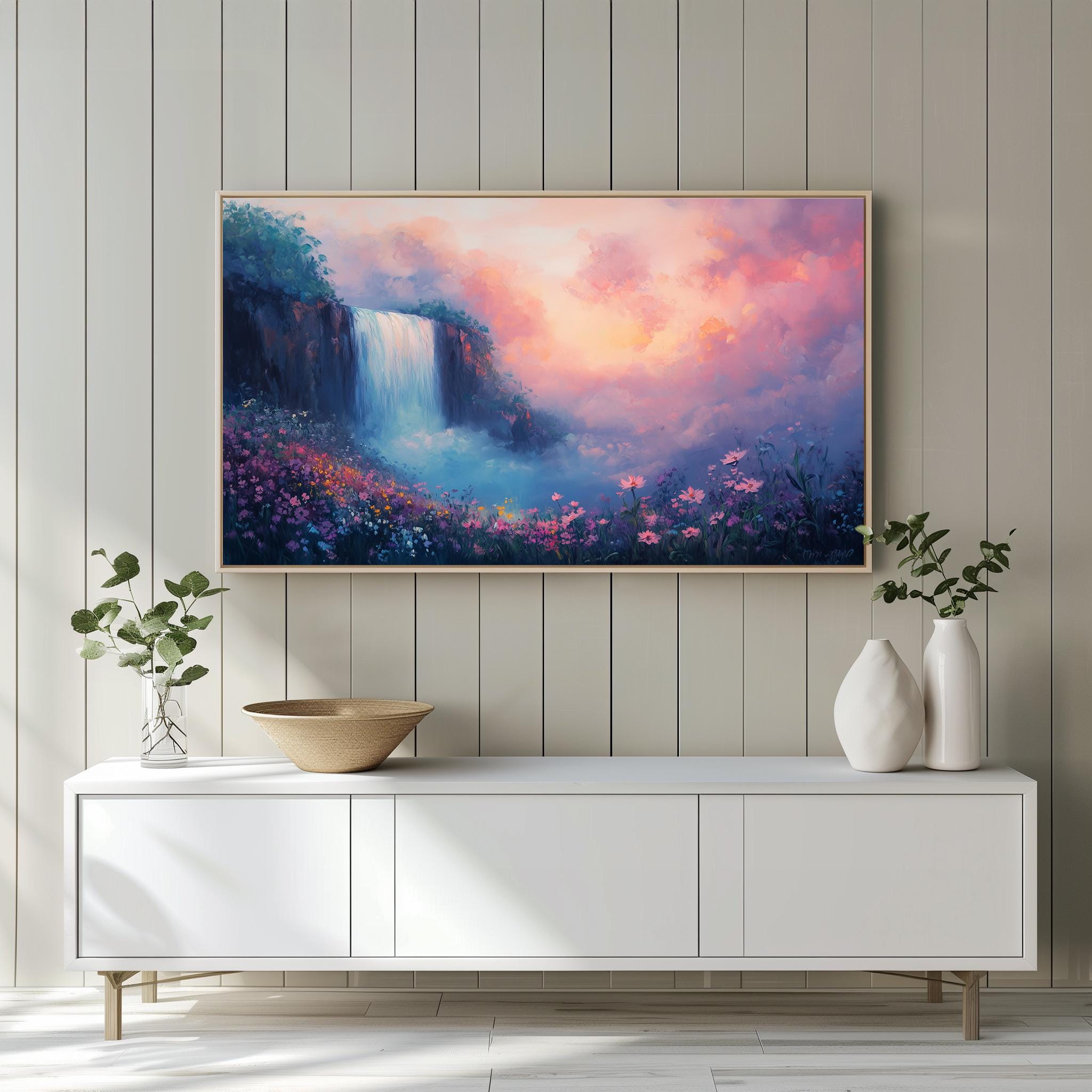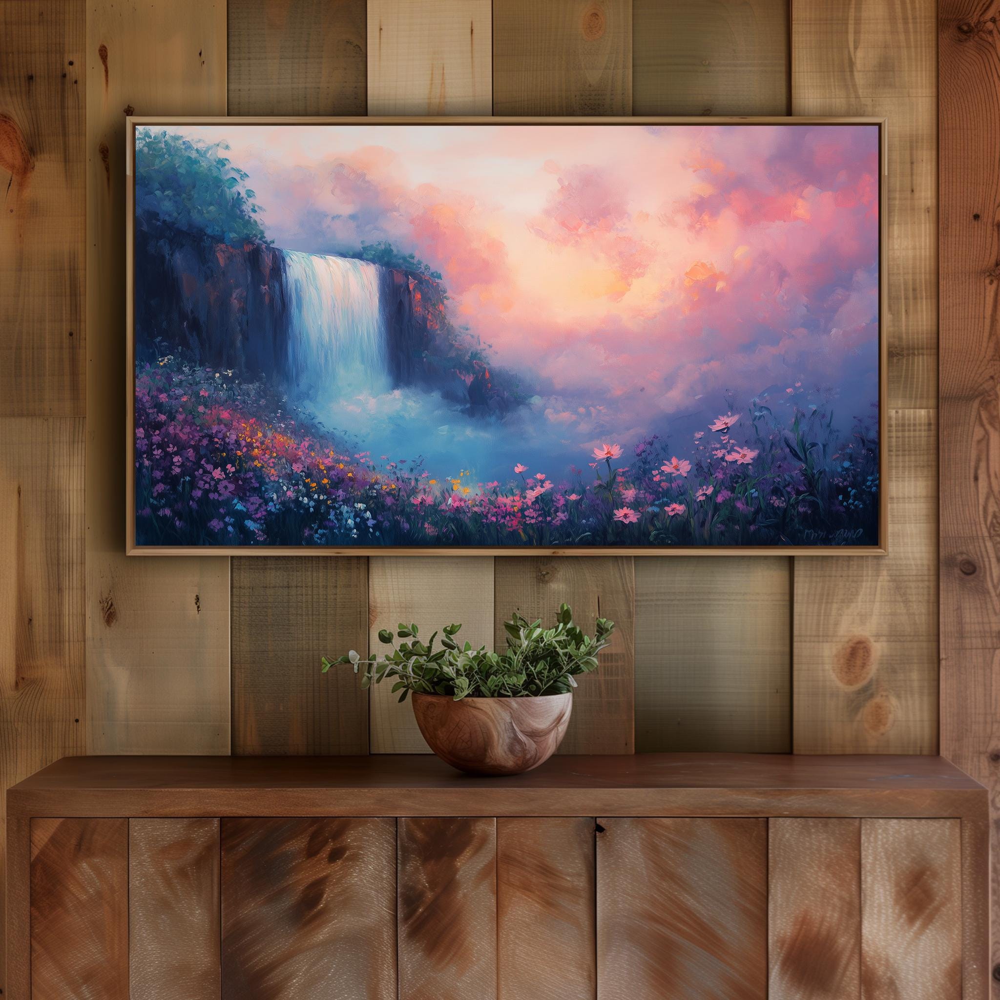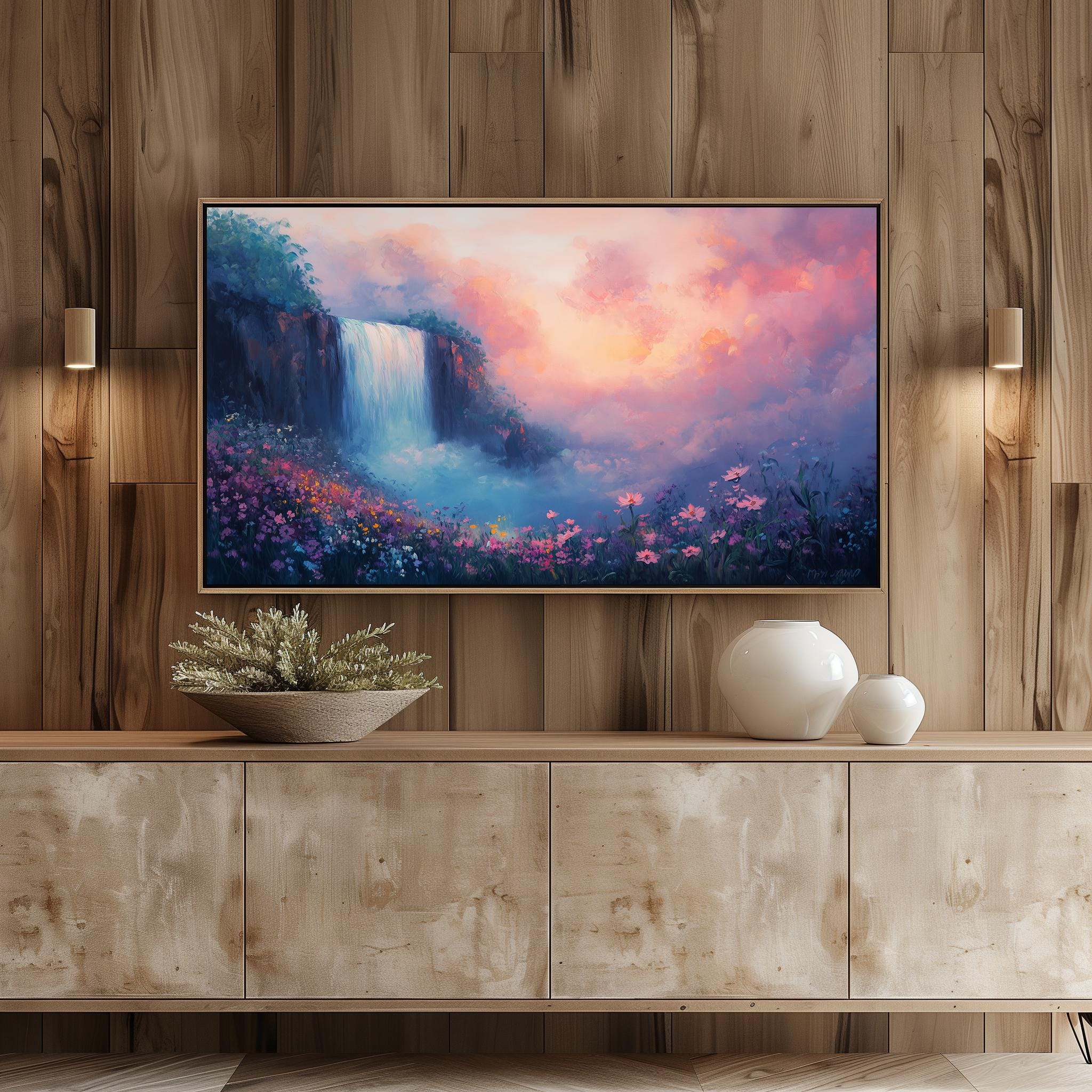 Vibrant Waterfall Landscape TV Art - A Breathtaking Escape into Nature Immerse yourself in the serene beauty of our Vibrant Waterfall Landscape TV Art. This digital download captures the essence of cascading waterfalls framed by a stunning sunset sky. Perfect for any wall decor, this artwork not only enhances your living space but also brings the tranquility of nature indoors. Ideal for those who appreciate colorful landscapes, it's a perfect fit for your Samsung TV as well as rustic homes. Let the vibrant hues and dynamic scenery transform your environment into a peaceful retreat. Perfect for Spring Refresh