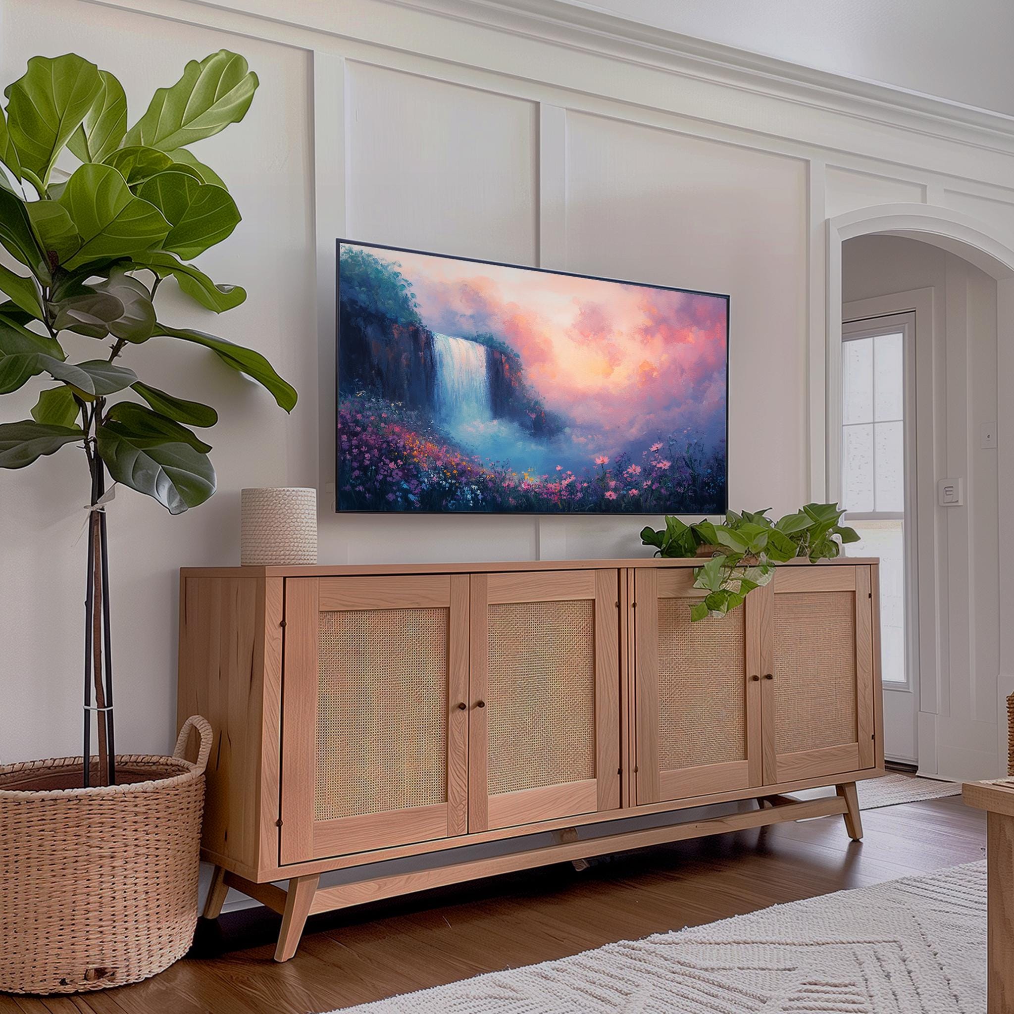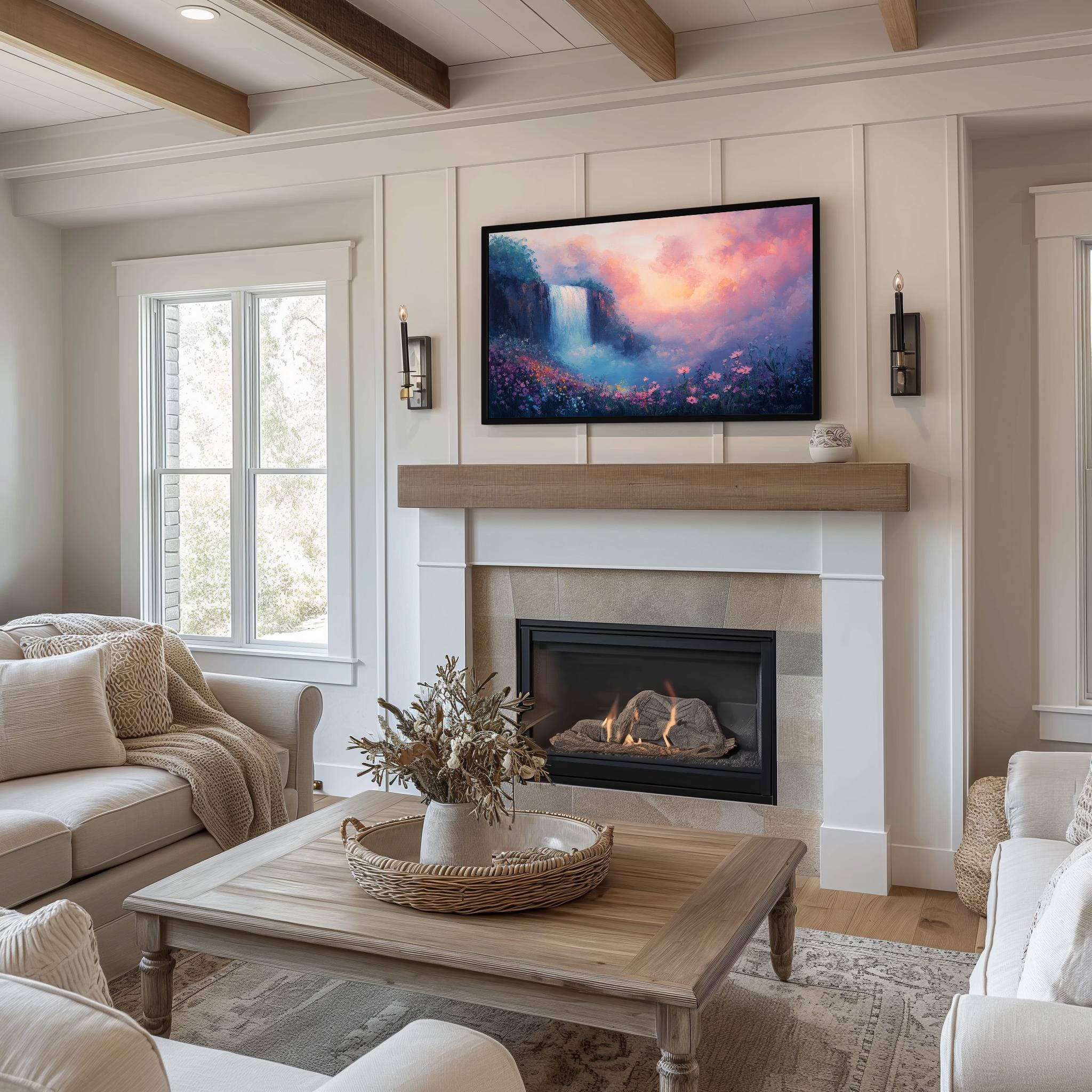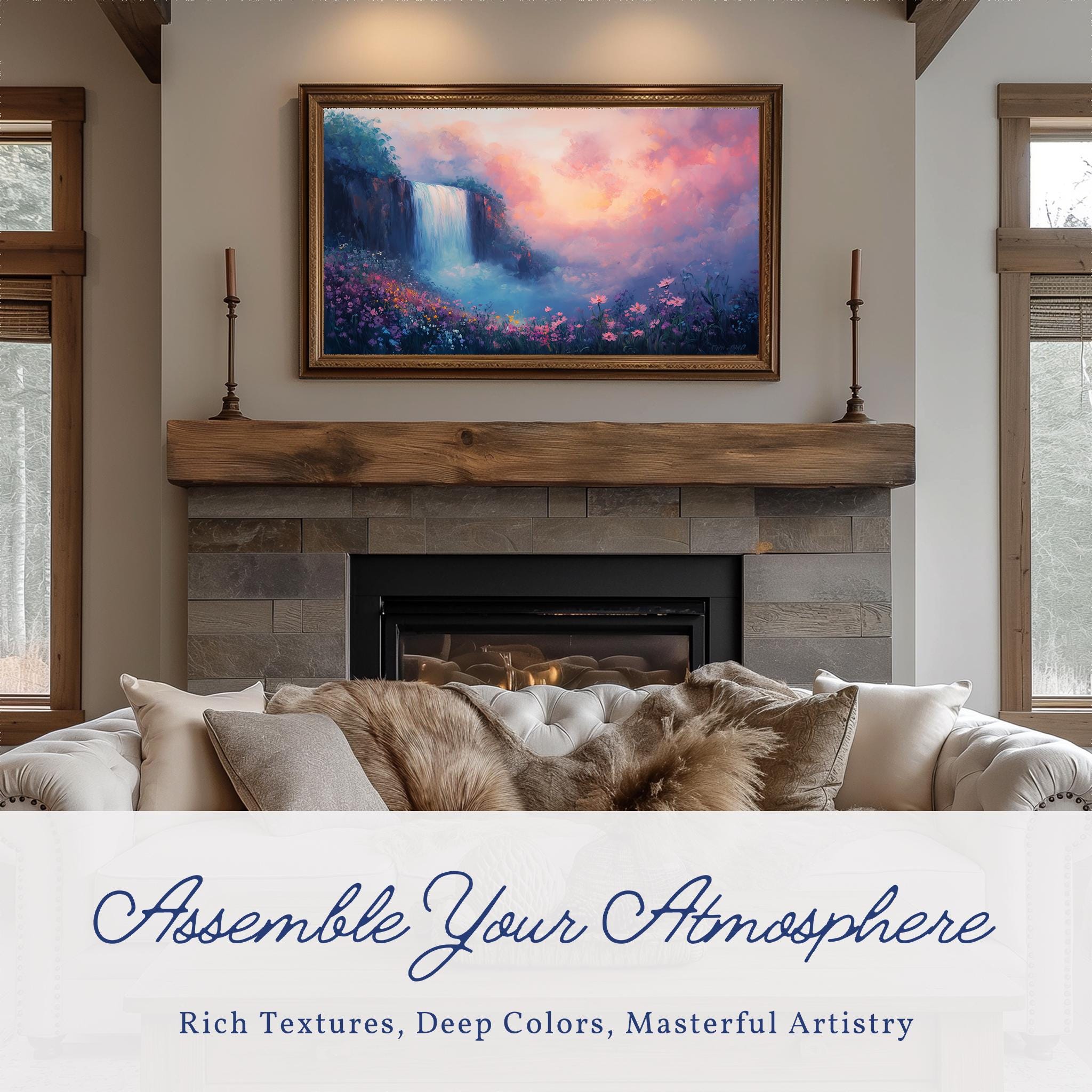 Vibrant Waterfall Landscape TV Art - A Breathtaking Escape into Nature Immerse yourself in the serene beauty of our Vibrant Waterfall Landscape TV Art. This digital download captures the essence of cascading waterfalls framed by a stunning sunset sky. Perfect for any wall decor, this artwork not only enhances your living space but also brings the tranquility of nature indoors. Ideal for those who appreciate colorful landscapes, it's a perfect fit for your Samsung TV as well as rustic homes. Let the vibrant hues and dynamic scenery transform your environment into a peaceful retreat. Perfect for Spring Refresh