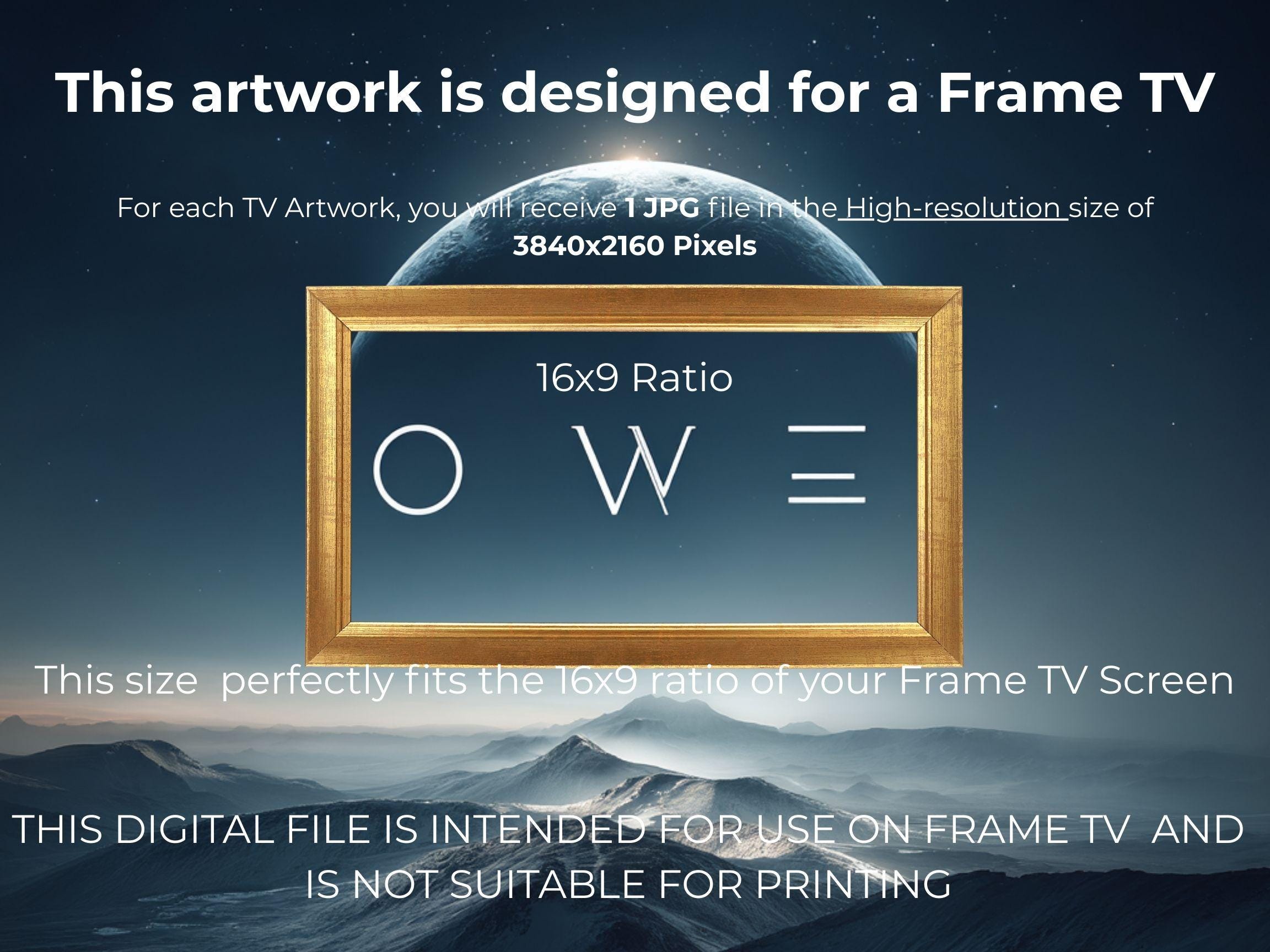 With this purchase from OtherWorld Editions, you will receive 1 high-resolution JPG file sized at 3840 x 2160 pixels (16:9 ratio). This size is specifically designed to fit Samsung Frame TVs perfectly but can also be displayed on most modern widescreen TVs.