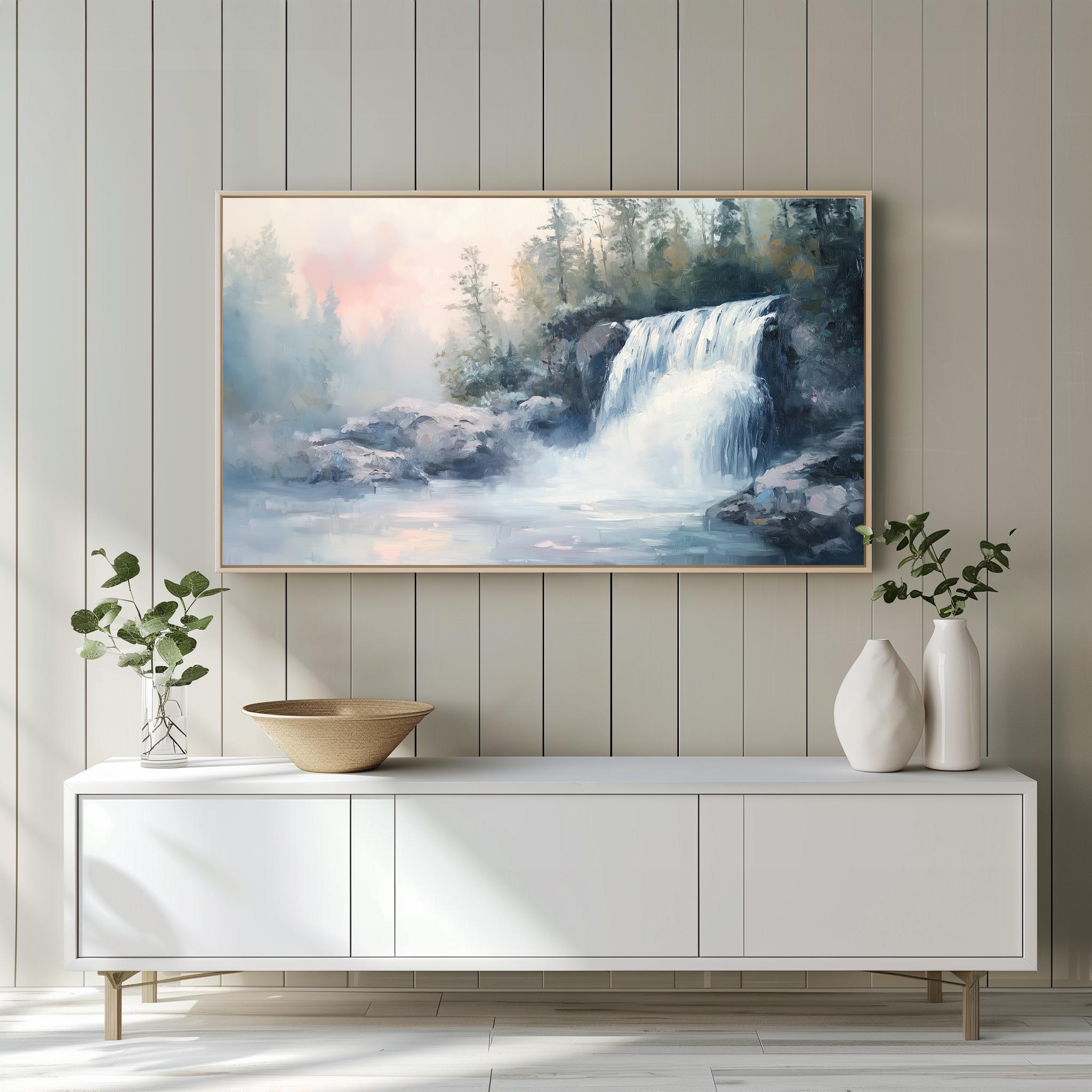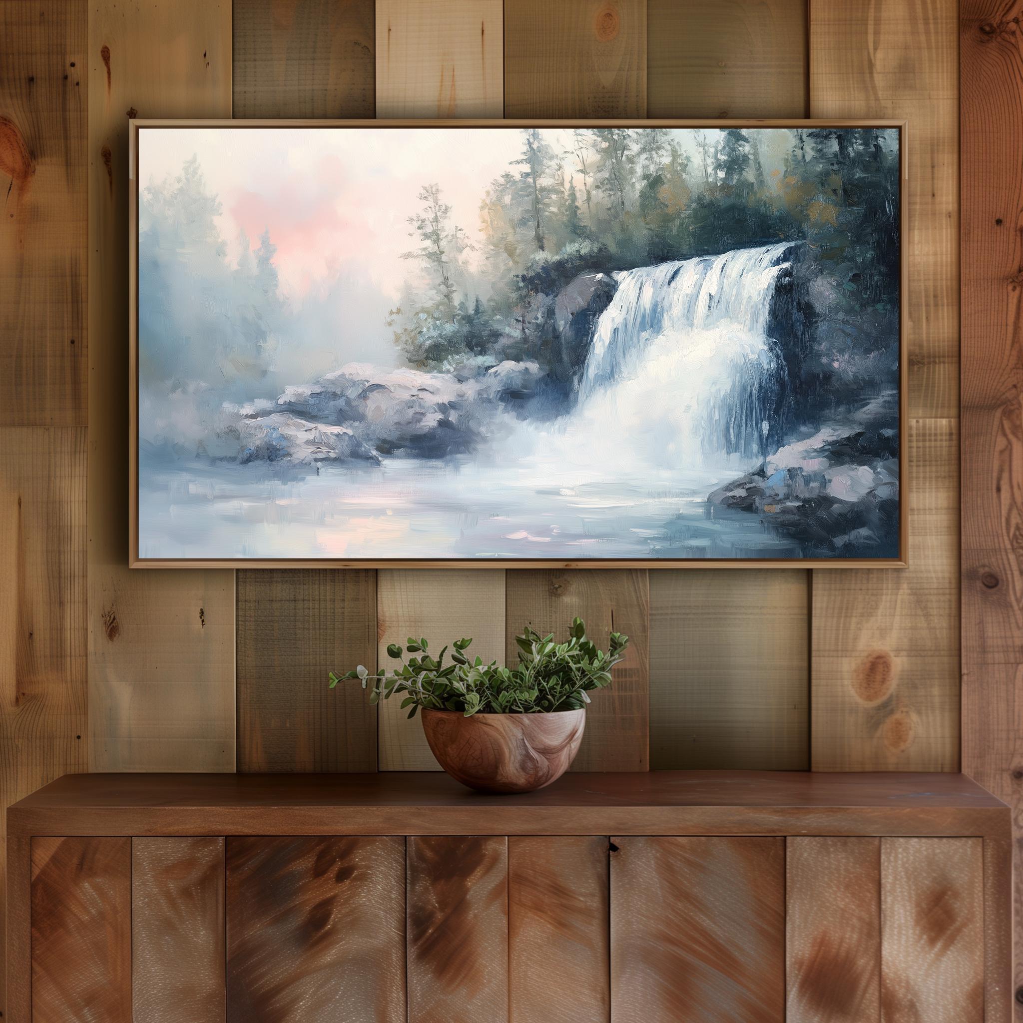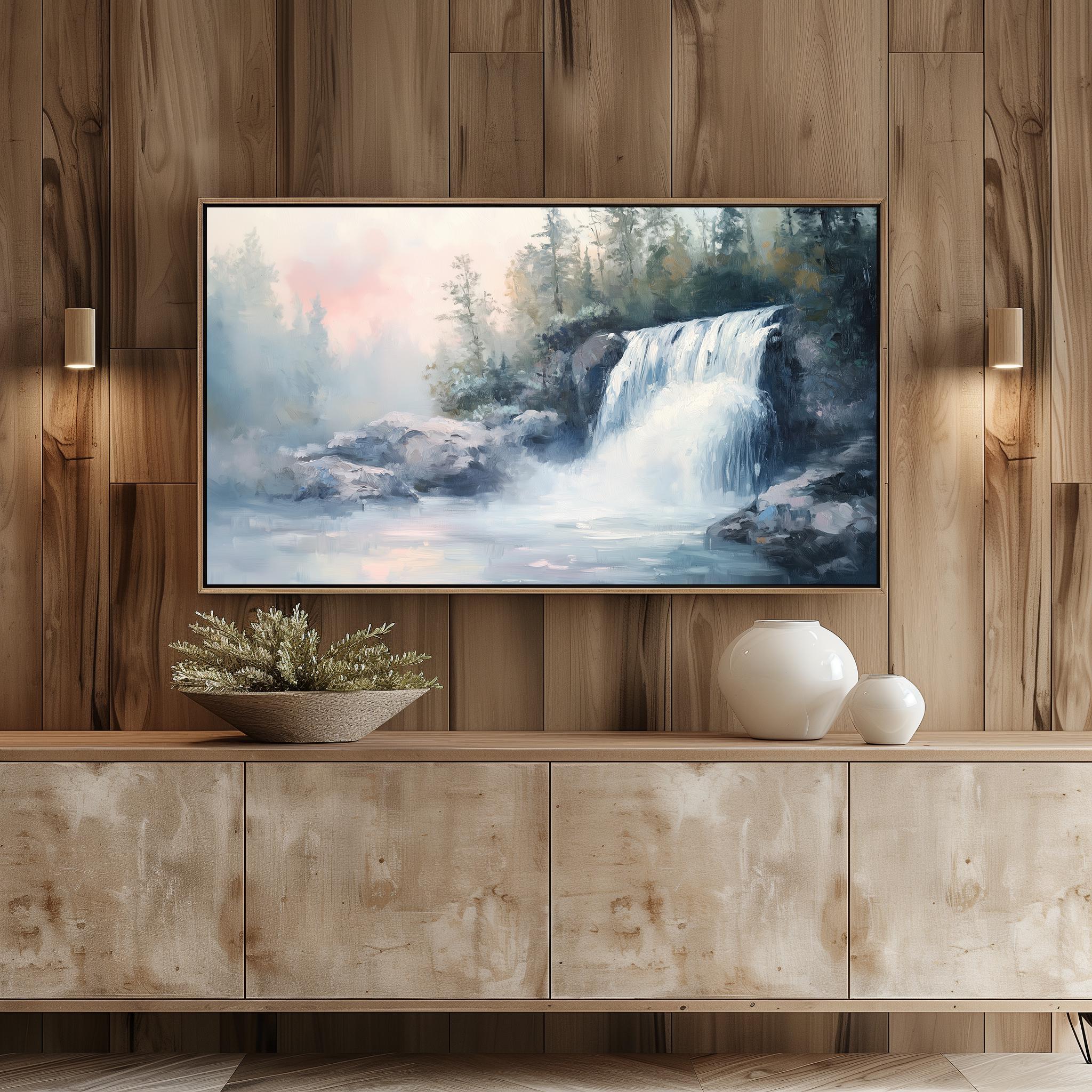 Rustic Waterfall Landscape TV Art - A Serene Escape into Nature's Beauty Immerse yourself in the tranquil beauty of our Rustic Waterfall Landscape TV Art. This captivating artwork features a breathtaking scene of cascading water amidst a vibrant forest, perfect for creating a serene atmosphere in any room. Ideal for your Samsung Frame TV, this digital download allows you to showcase an exquisite oil painting that captures the essence of autumn, making your space feel warm and inviting. Autumn