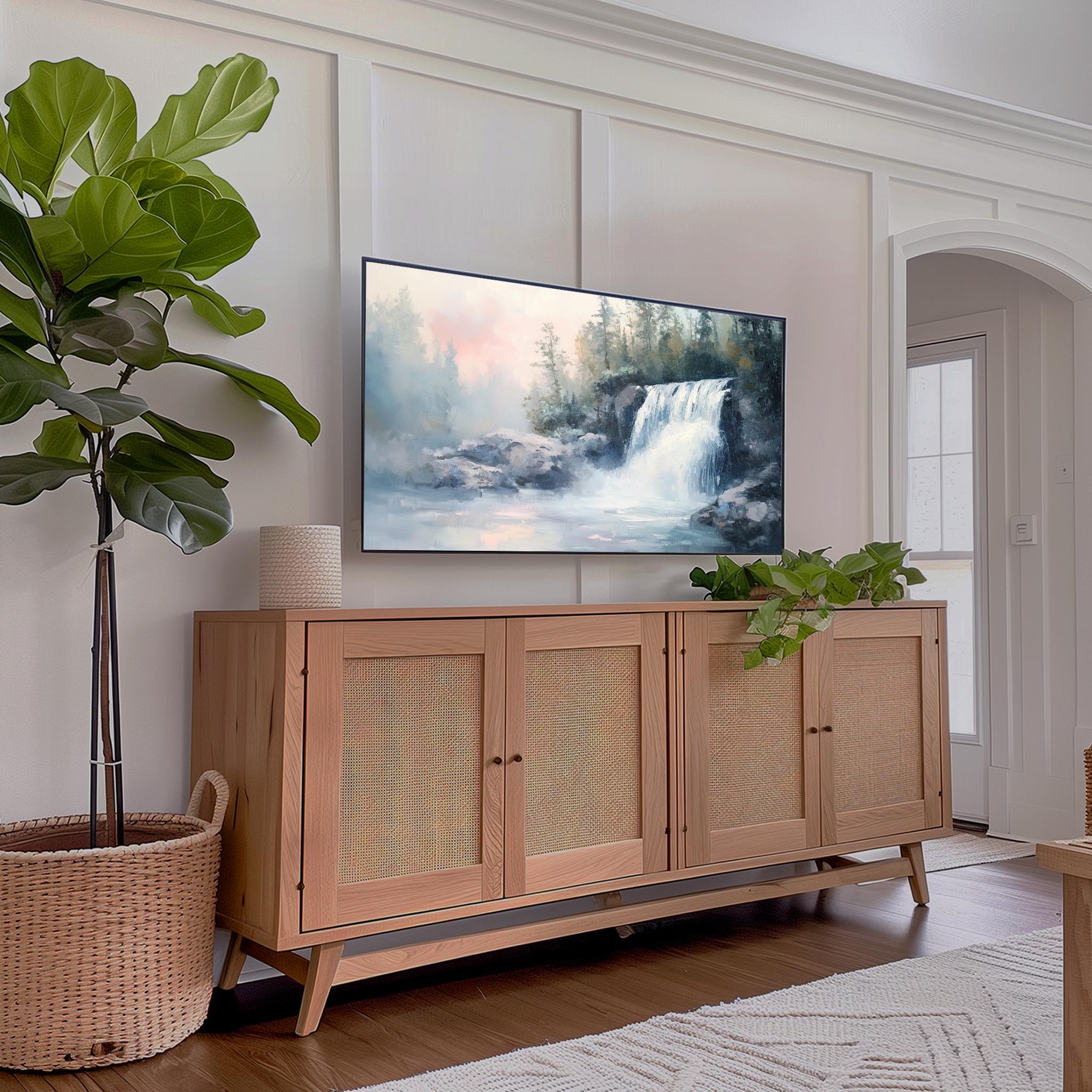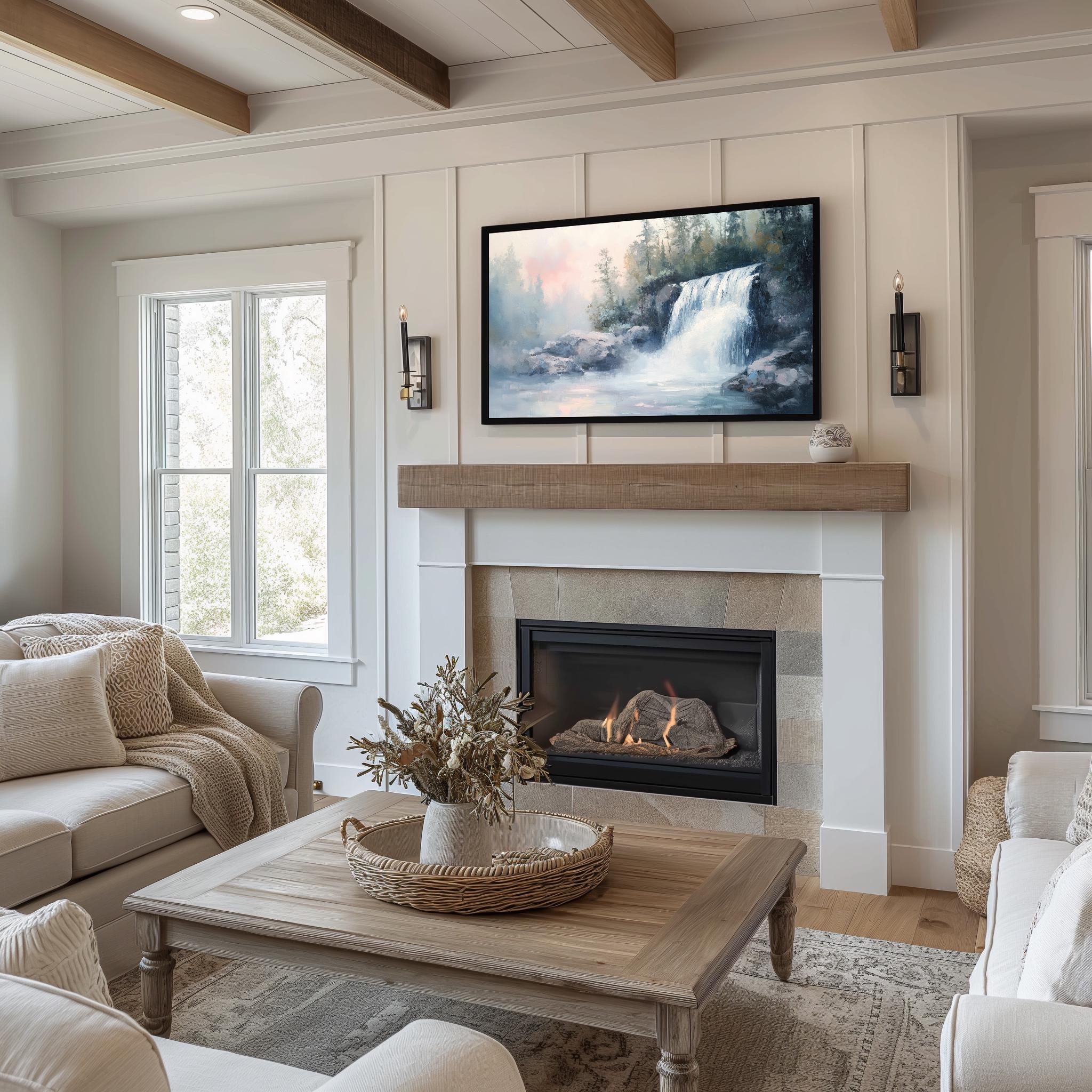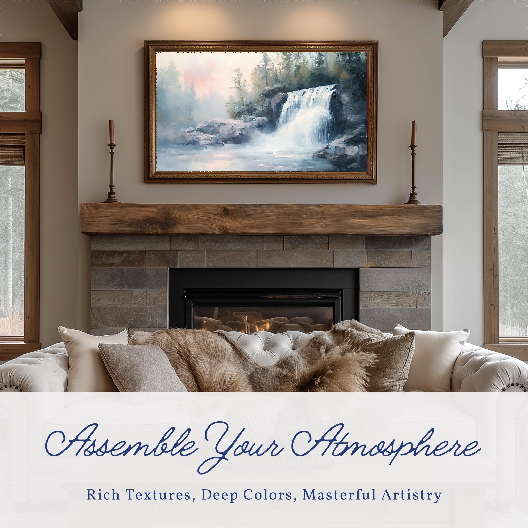 Rustic Waterfall Landscape TV Art - A Serene Escape into Nature's Beauty Immerse yourself in the tranquil beauty of our Rustic Waterfall Landscape TV Art. This captivating artwork features a breathtaking scene of cascading water amidst a vibrant forest, perfect for creating a serene atmosphere in any room. Ideal for your Samsung Frame TV, this digital download allows you to showcase an exquisite oil painting that captures the essence of autumn, making your space feel warm and inviting. Autumn