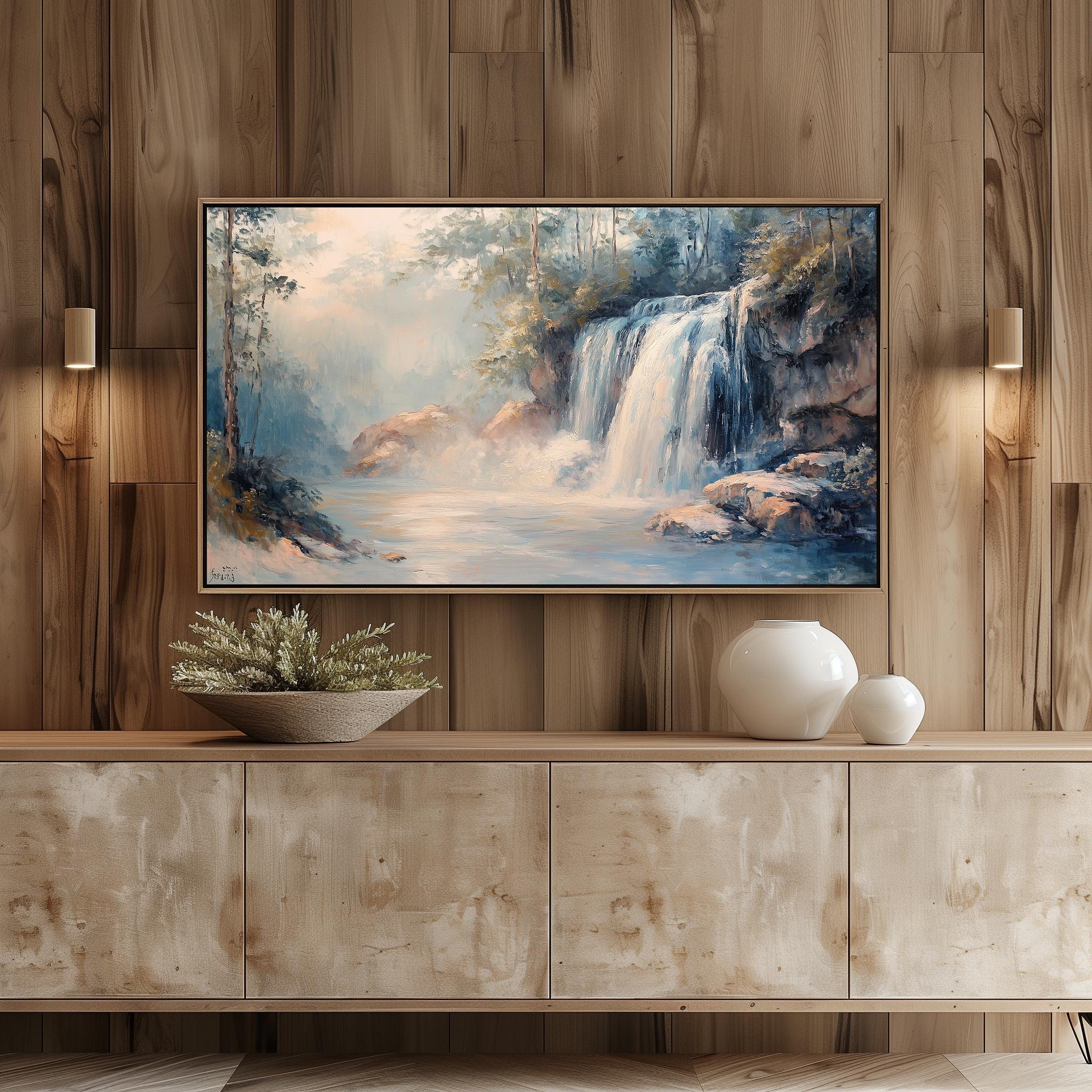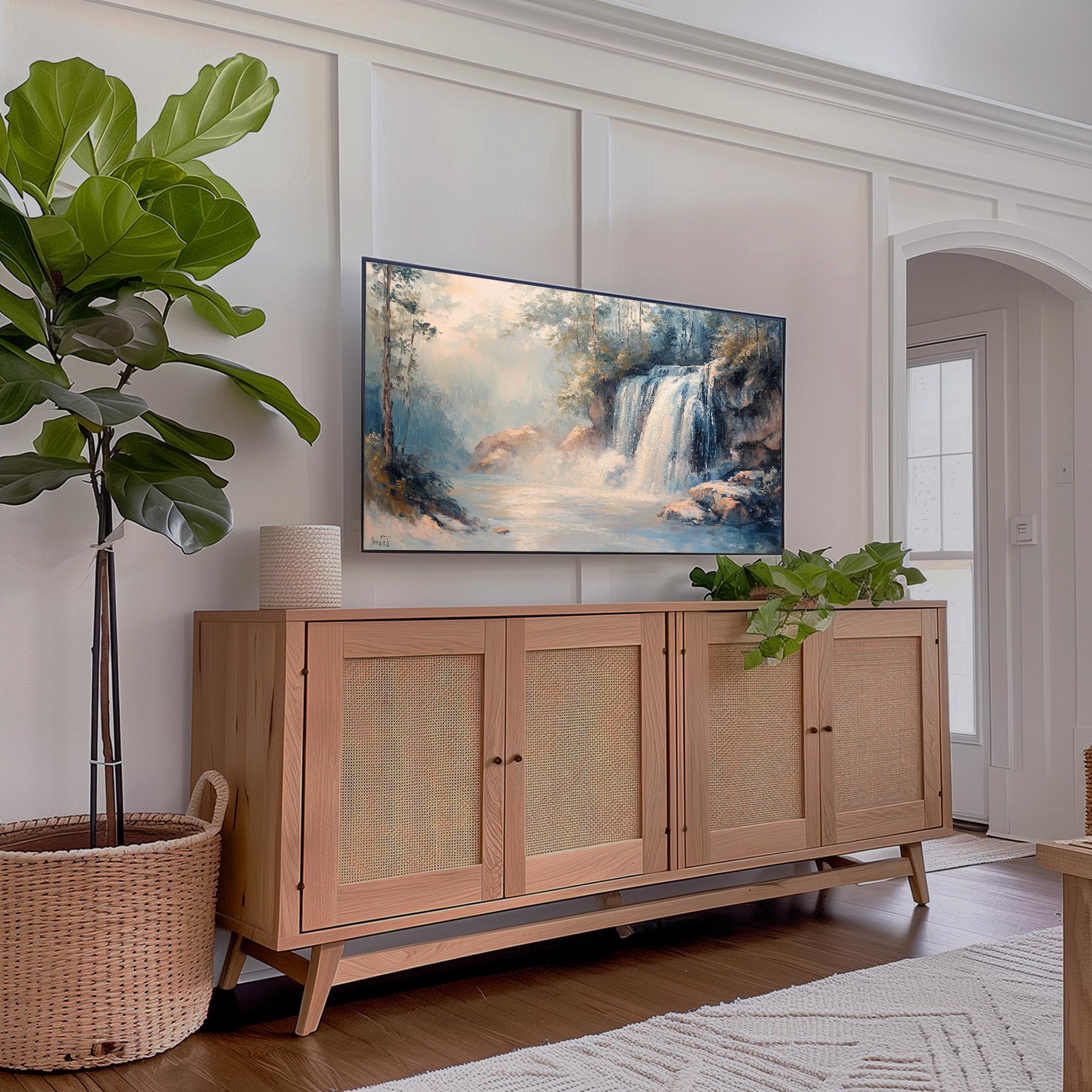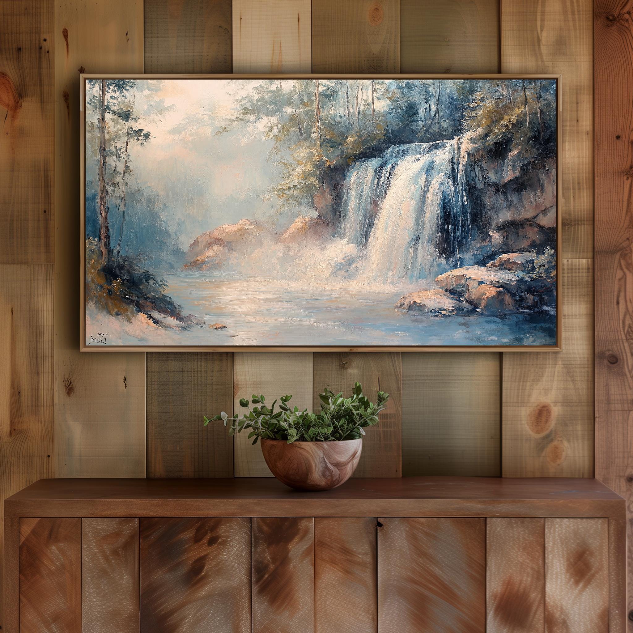 Cascading Waterfall TV Art - A Serene Escape into Nature Transform your living space with this exquisite Rustic Nature Oil Painting, featuring a breathtaking Rocky Landscape that brings the beauty of the outdoors into your home. Perfect for Frame TVs, this digital download allows you to effortlessly showcase stunning art that enhances your decor while providing a calming atmosphere. Perfect for every season, this art piece adds a refreshing touch to your home all year round.