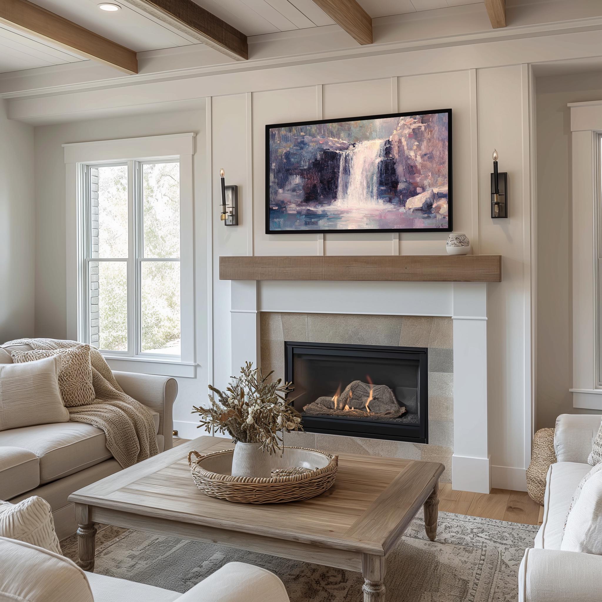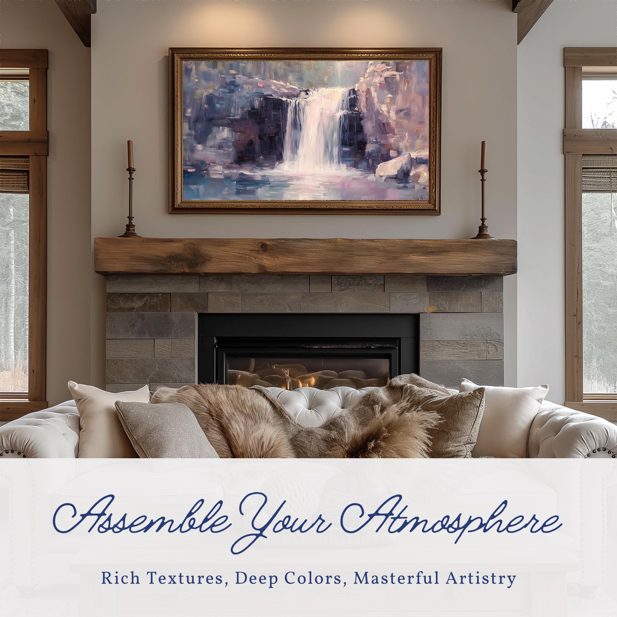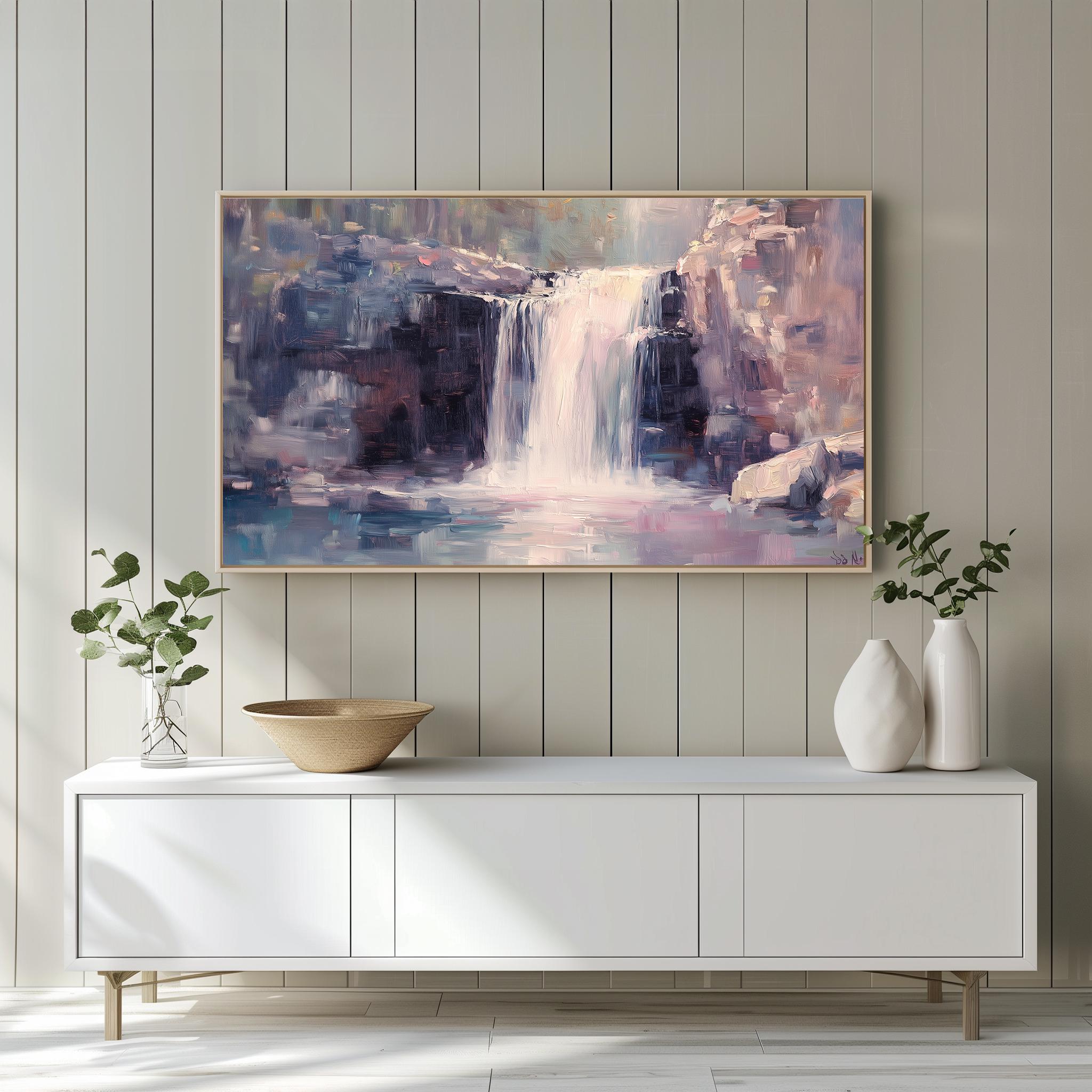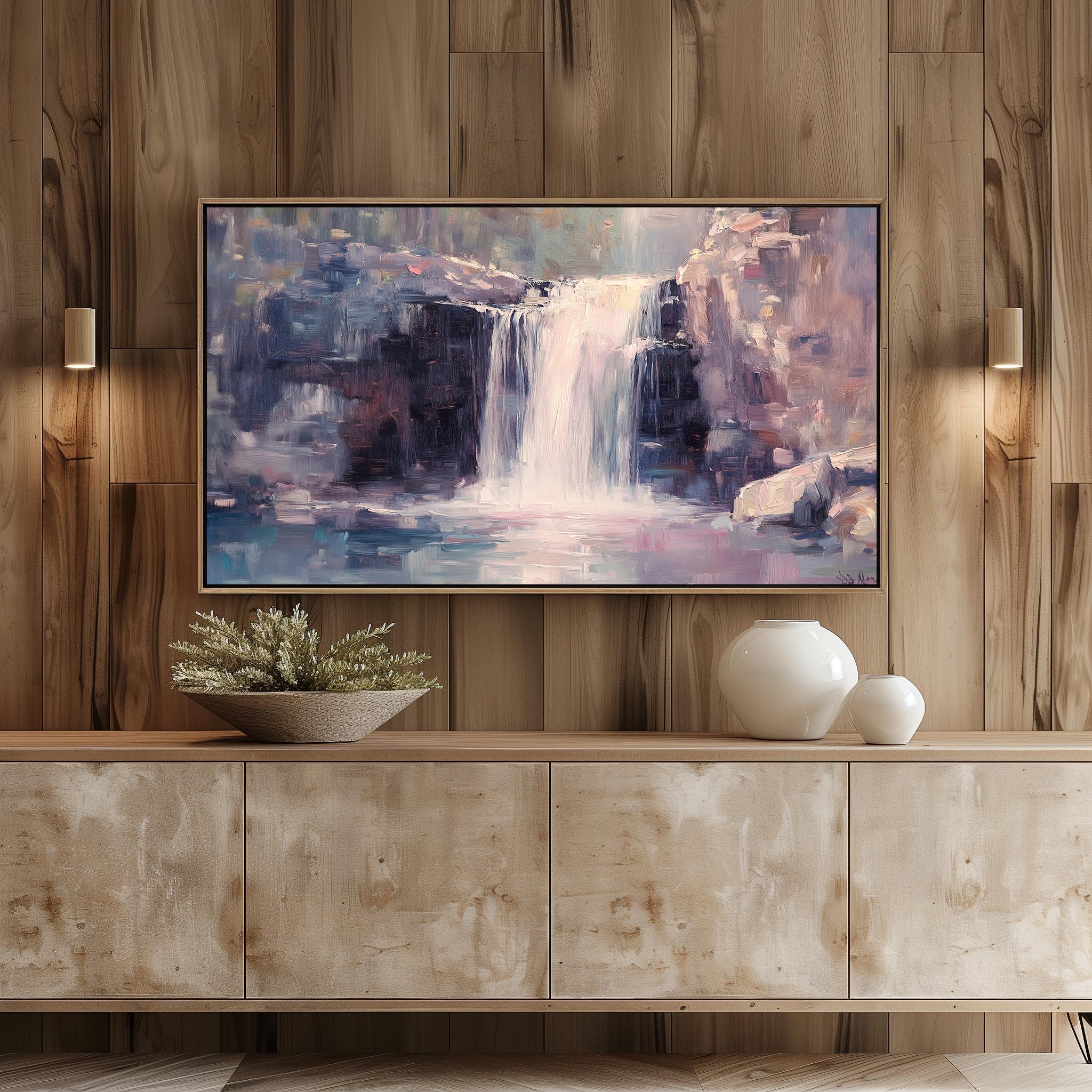 Rustic Waterfall Samsung Frame TV Art Transform your living space with this stunning oil painting of a majestic waterfall cascading through a rocky landscape. This digital download is perfect for enhancing the ambiance of your home while showcasing the beauty of nature. Ideal for Frame TV displays, it adds a touch of rustic charm and serenity to any room. Perfect for autumn, bringing warm tones and a sense of tranquility to your decor.