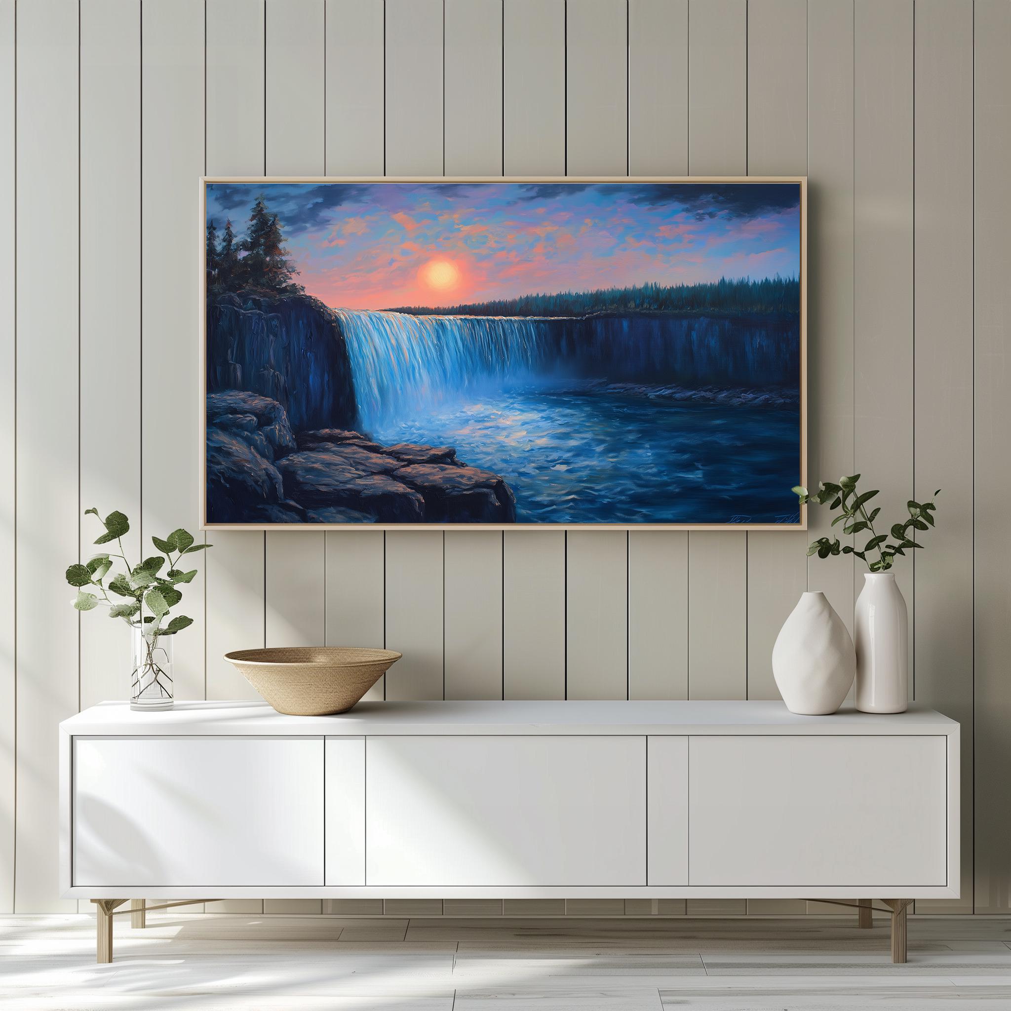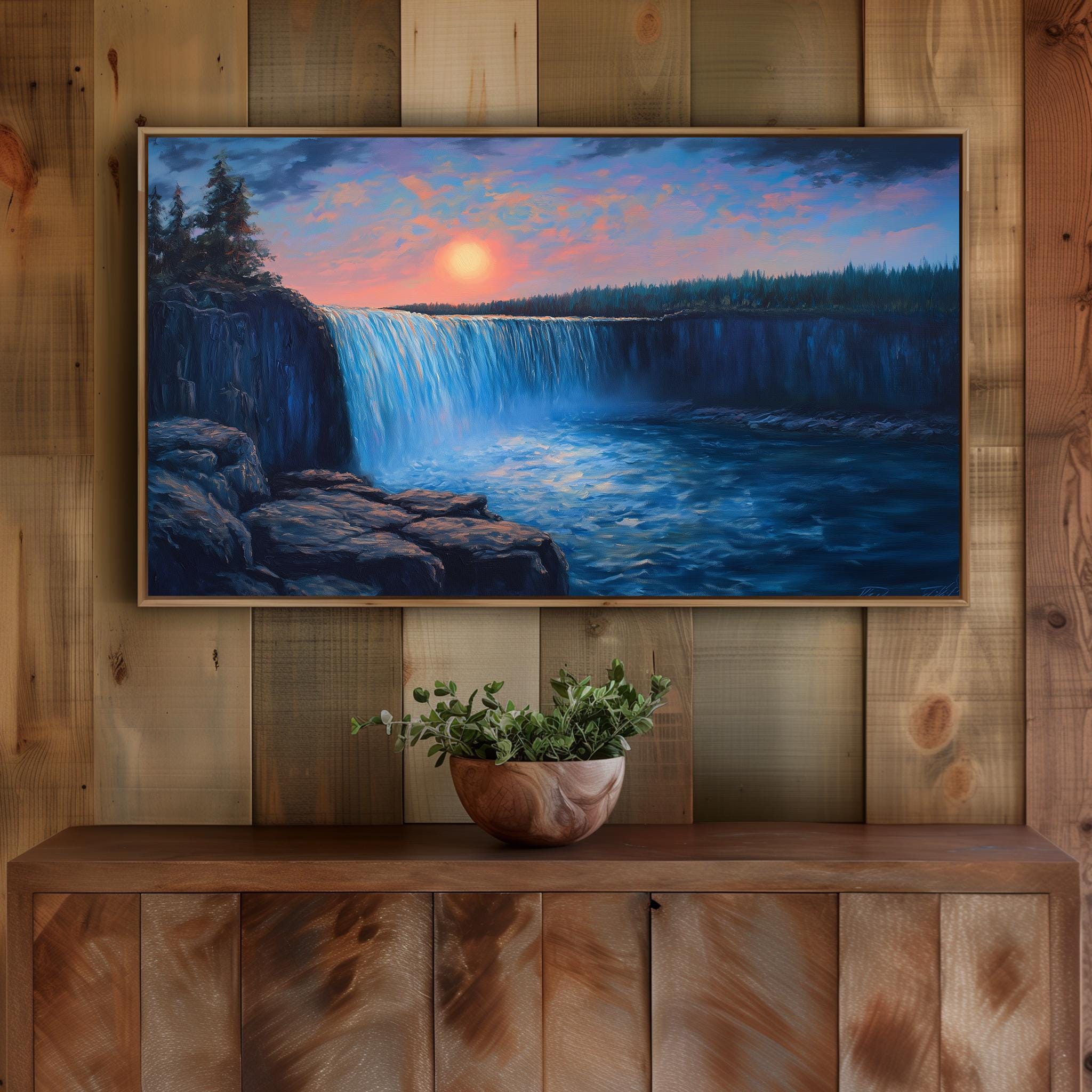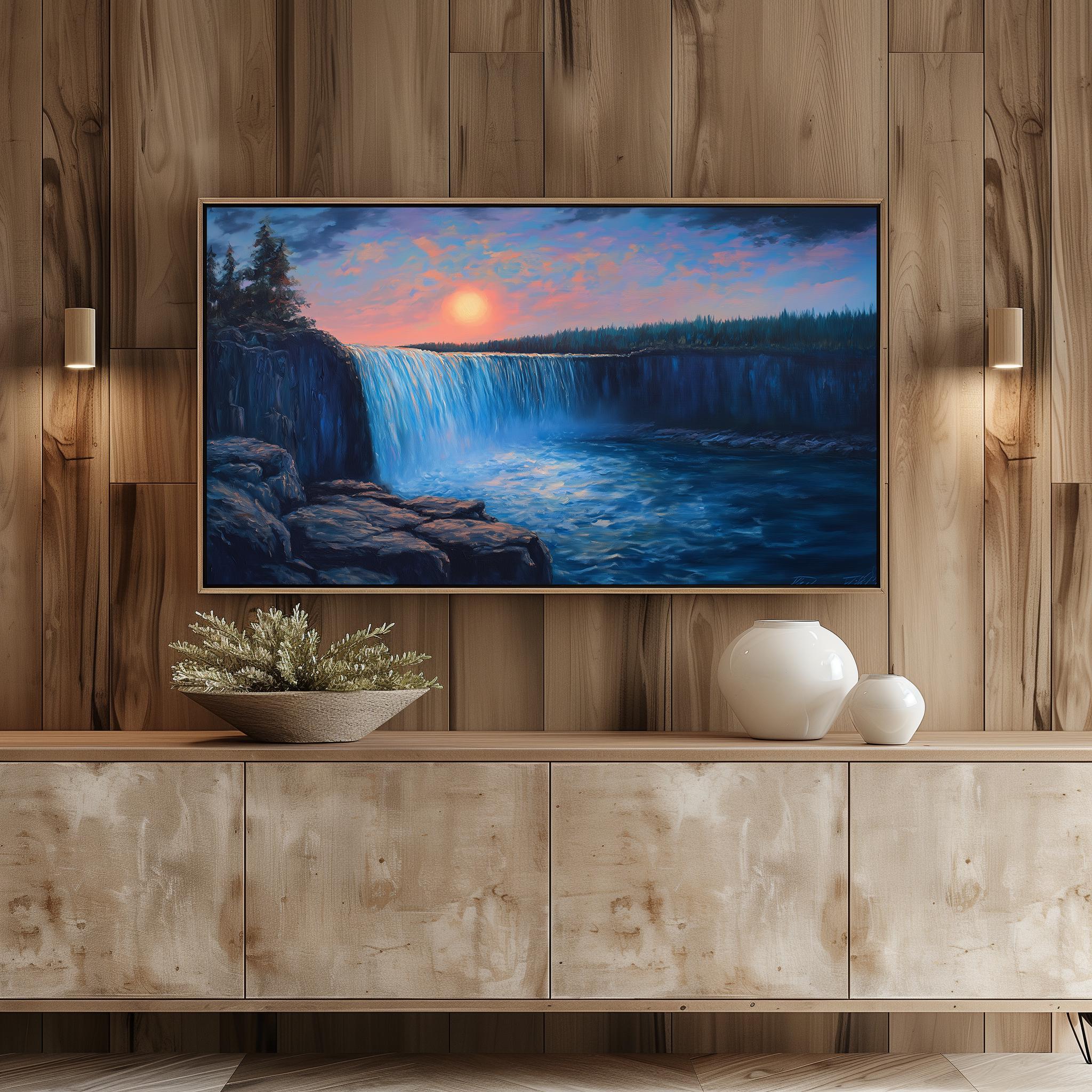 Waterfall Sunset Frame TV Art, a Serene Escape Transform your living space with this breathtaking Waterfall Sunset Frame TV Art. This serene landscape painting captures the tranquil beauty of nature, featuring a stunning waterfall scene bathed in warm sunset hues. Perfect for adding a touch of rustic charm to your home decor, this digital download is designed to fit seamlessly on your Samsung Frame TV, providing a captivating visual experience that brings the outdoors inside. Perfect for year-round display, bringing a sense of peace and tranquility to every season.