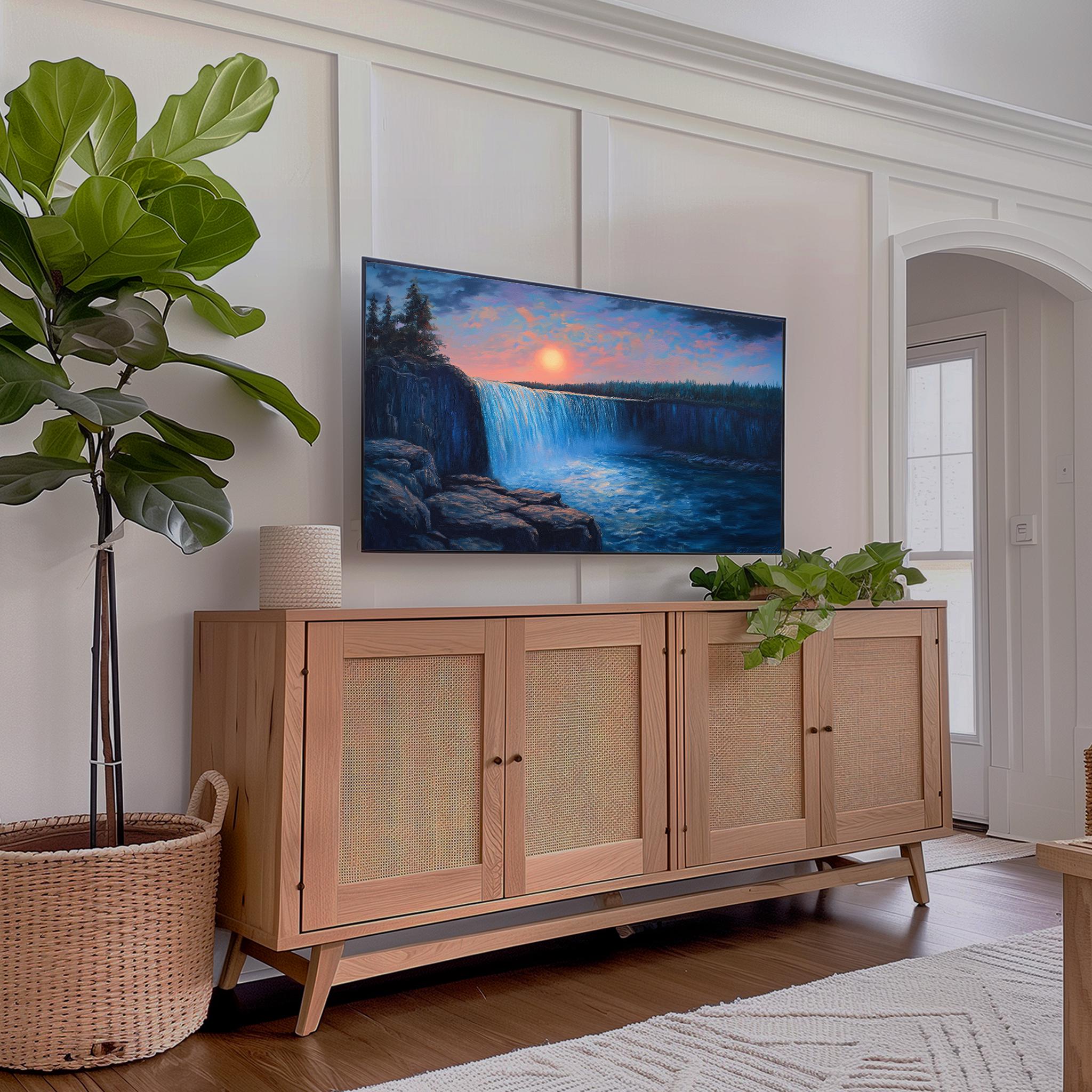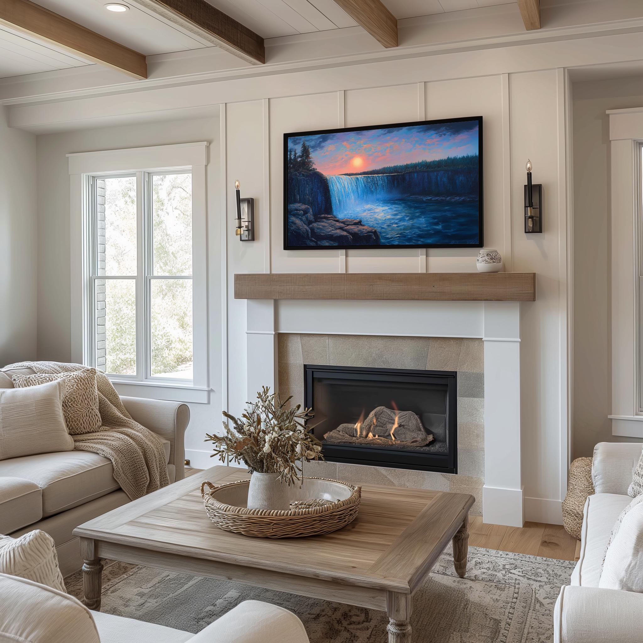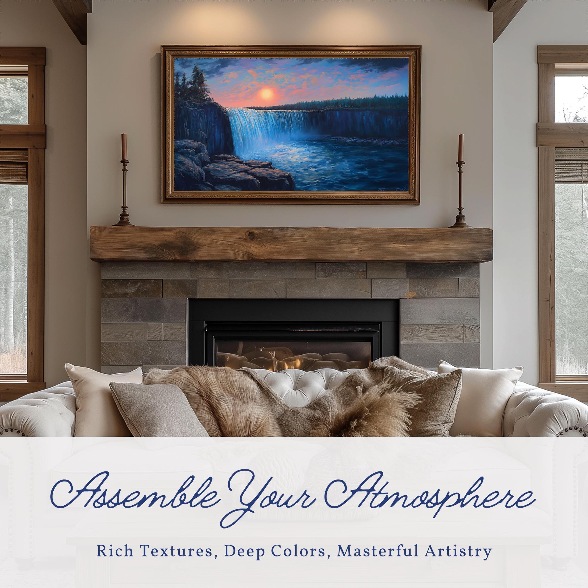 Waterfall Sunset Frame TV Art, a Serene Escape Transform your living space with this breathtaking Waterfall Sunset Frame TV Art. This serene landscape painting captures the tranquil beauty of nature, featuring a stunning waterfall scene bathed in warm sunset hues. Perfect for adding a touch of rustic charm to your home decor, this digital download is designed to fit seamlessly on your Samsung Frame TV, providing a captivating visual experience that brings the outdoors inside. Perfect for year-round display, bringing a sense of peace and tranquility to every season.