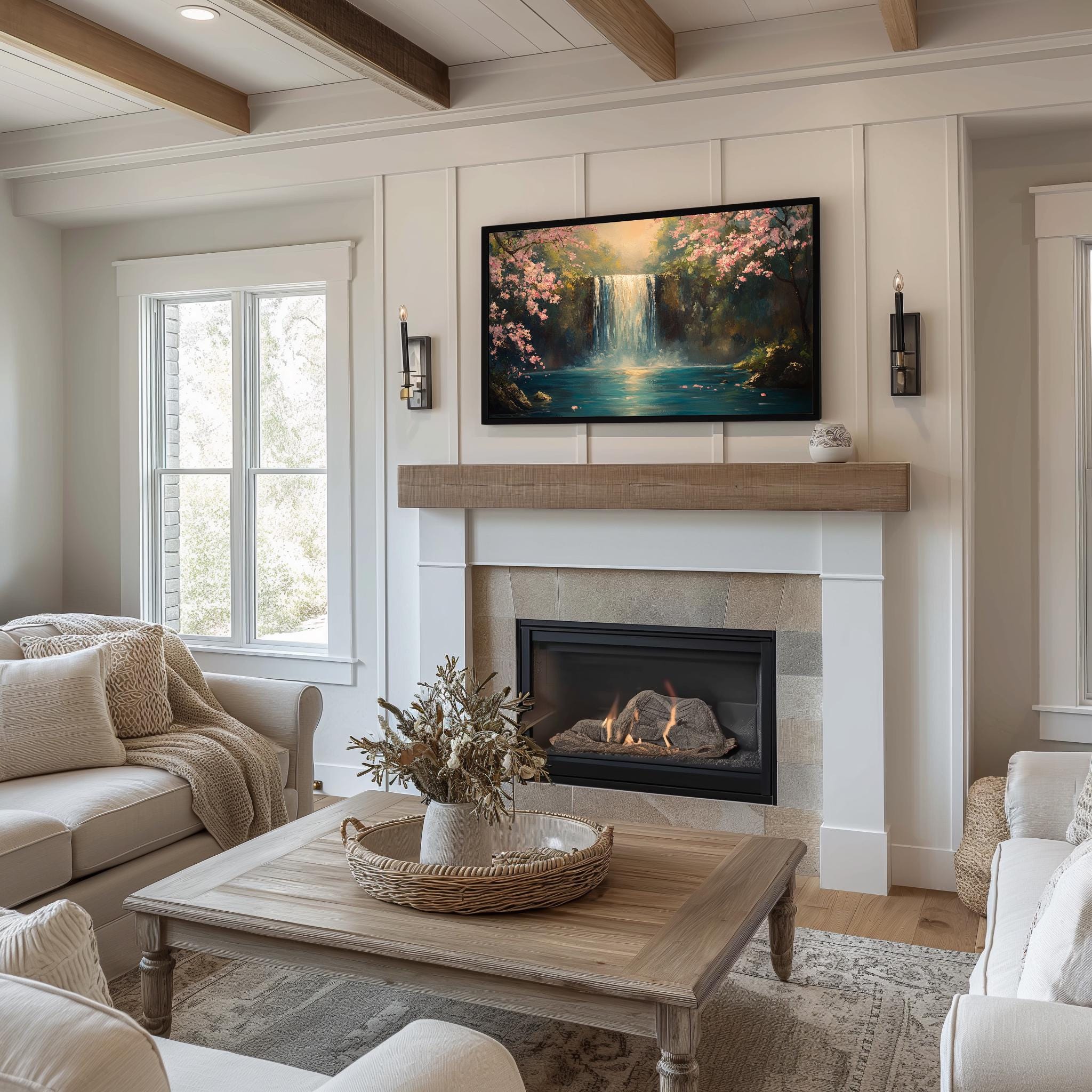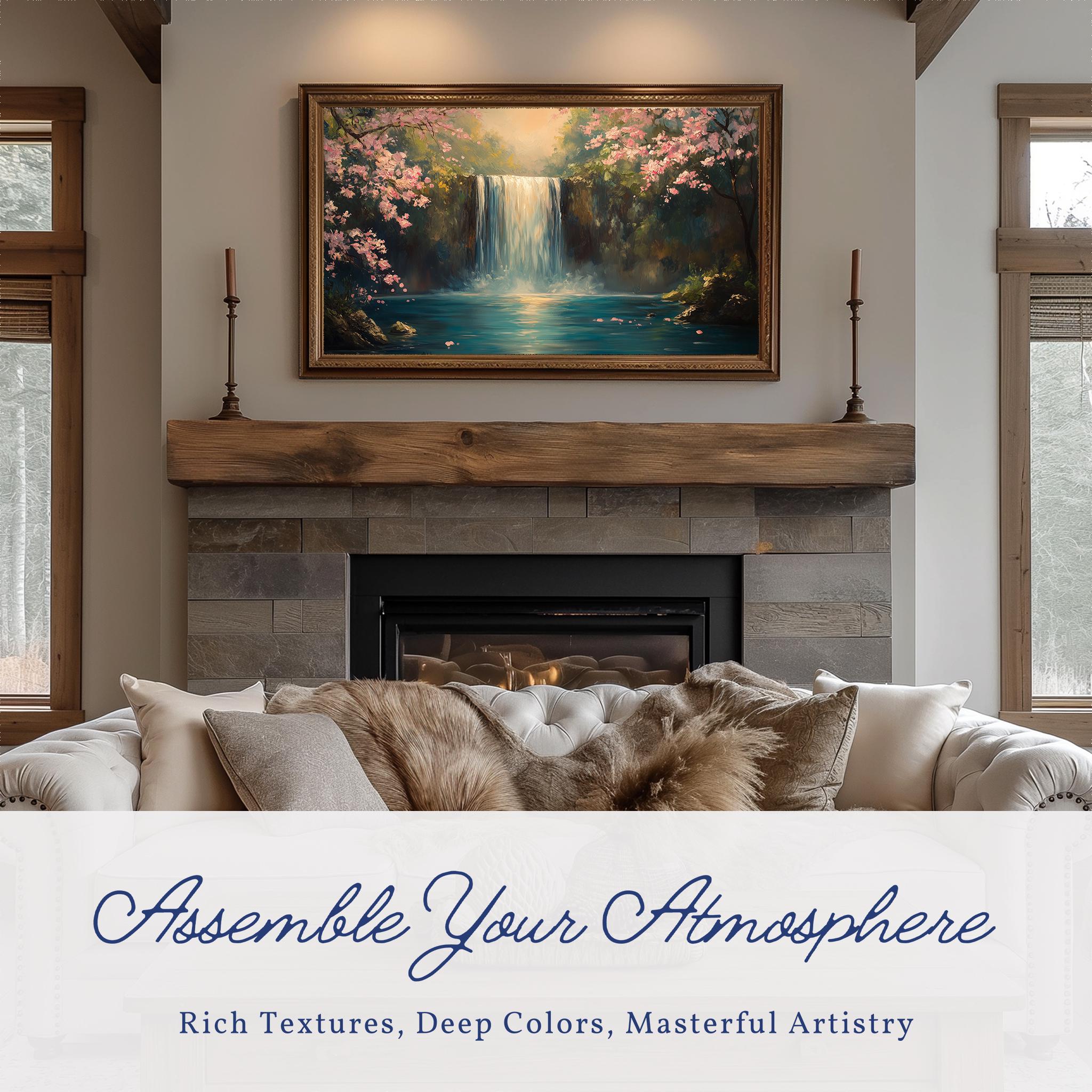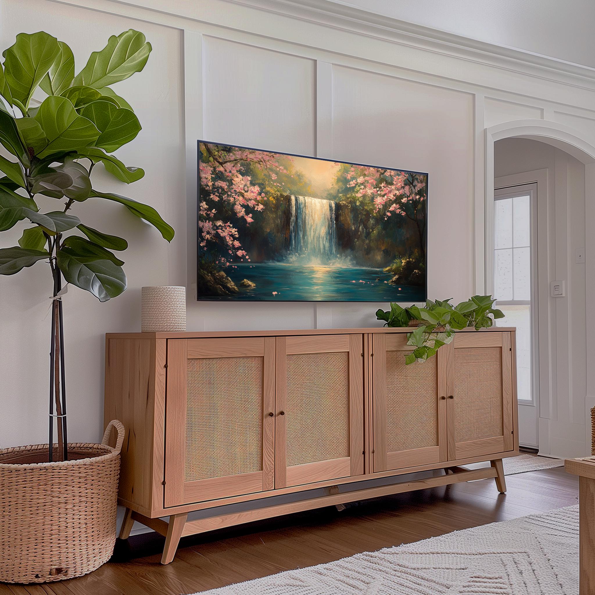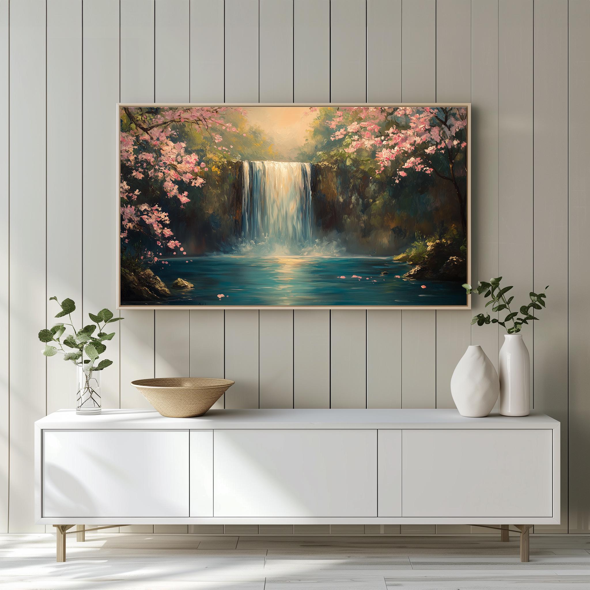 Serene Waterfall Landscape Frame TV Art Transform your living space with this breathtaking tall waterfall painting art, perfect for enhancing your TV wall decor. This digital download brings the tranquility of nature indoors, making it an ideal choice for those who appreciate rustic cottagecore aesthetics. Let the serene beauty of this landscape art elevate your home ambiance, creating a peaceful retreat. Spring