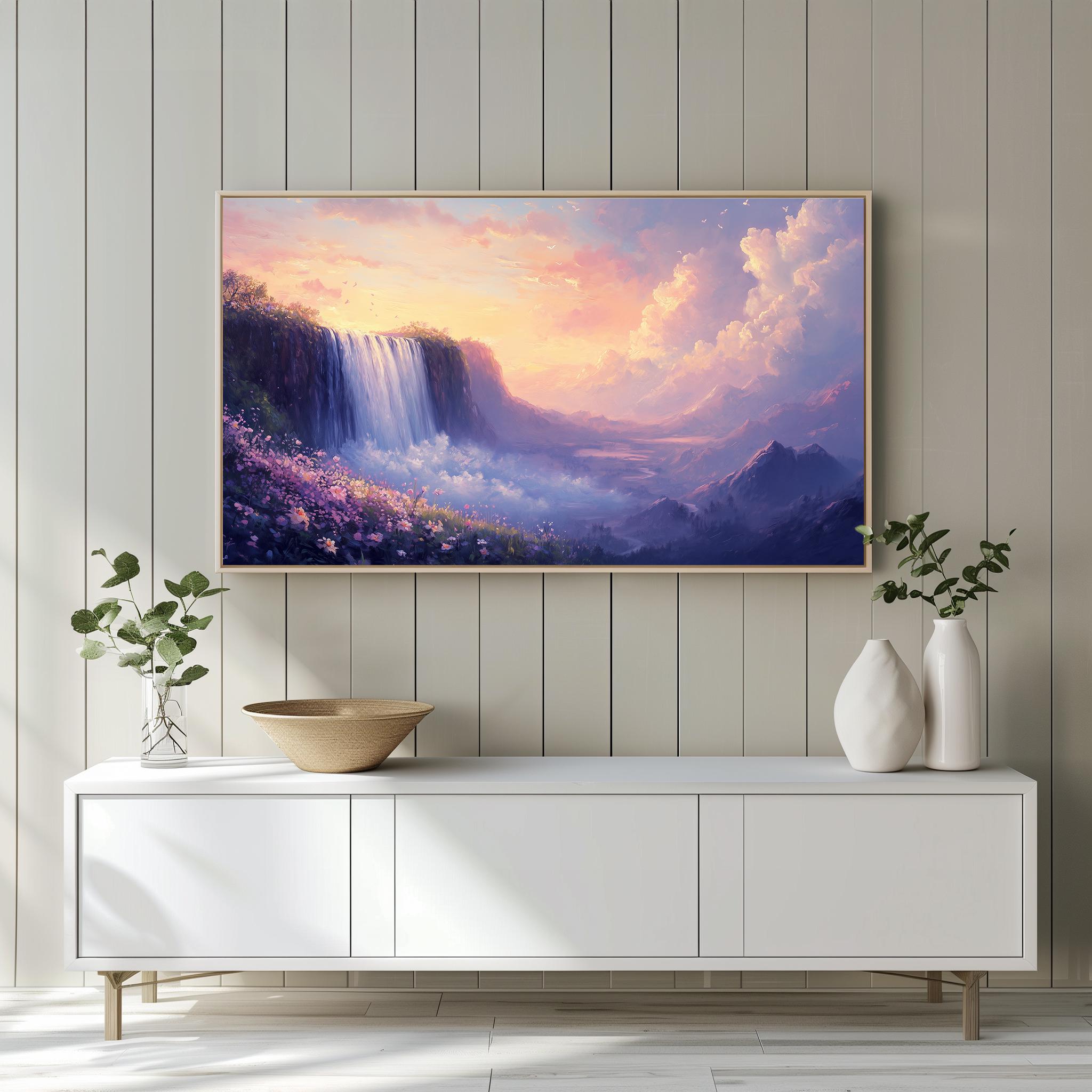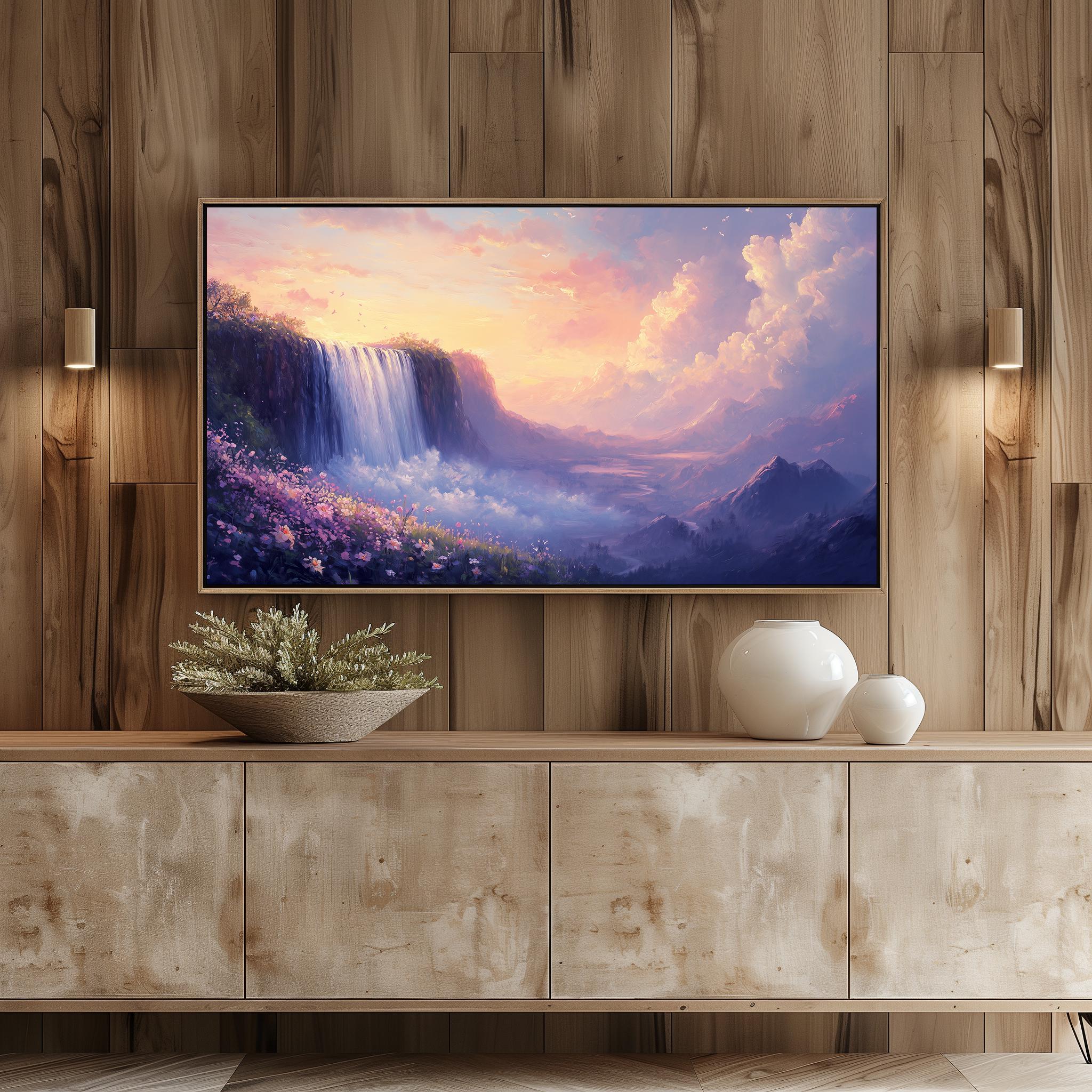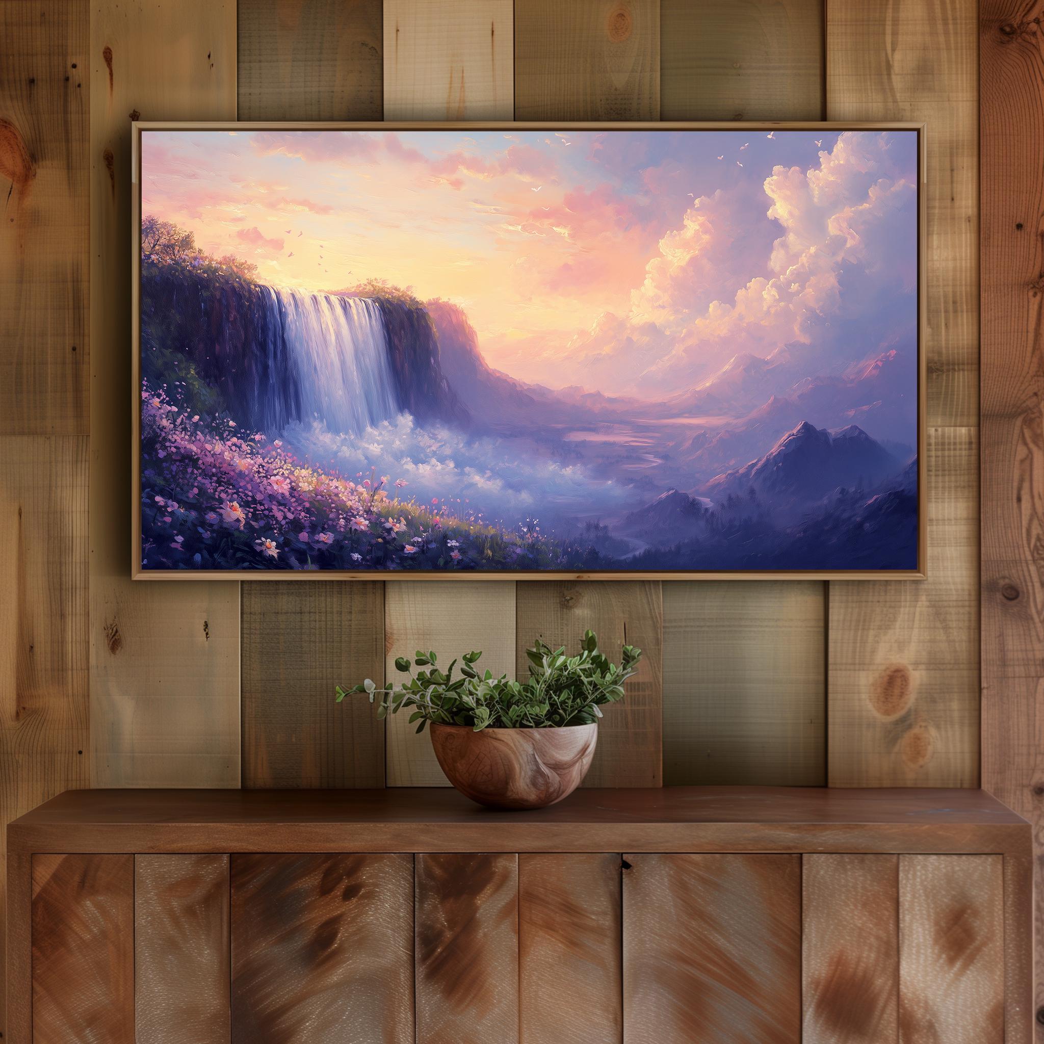 Waterfall Sunset Frame TV Art - A Serene Escape Immerse yourself in the breathtaking beauty of nature with our Waterfall Sunset Frame TV Art. This stunning landscape painting captures the tranquility of a cascading waterfall set against a vibrant sunset. Perfect for enhancing your home decor, this digital download transforms your Samsung Frame TV into a captivating scenic view, inviting the essence of serene landscapes into your living space. Ideal for art lovers looking to bring a touch of nature's beauty indoors. Ideal for year-round enjoyment, bringing warmth and tranquility to any season.