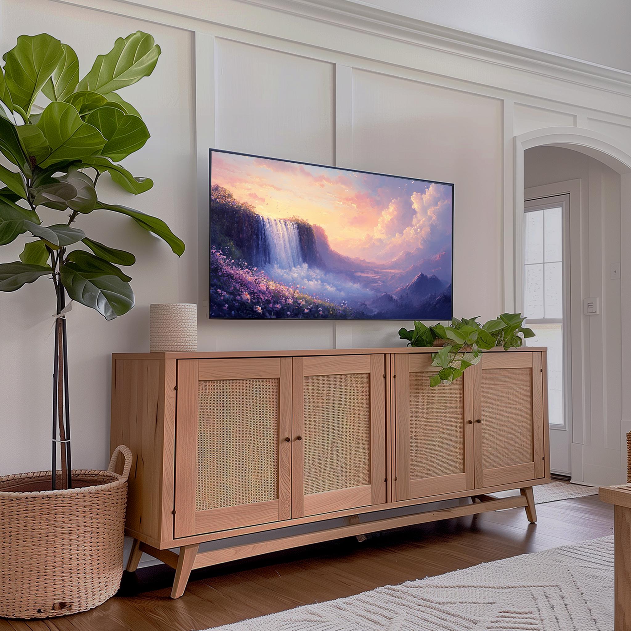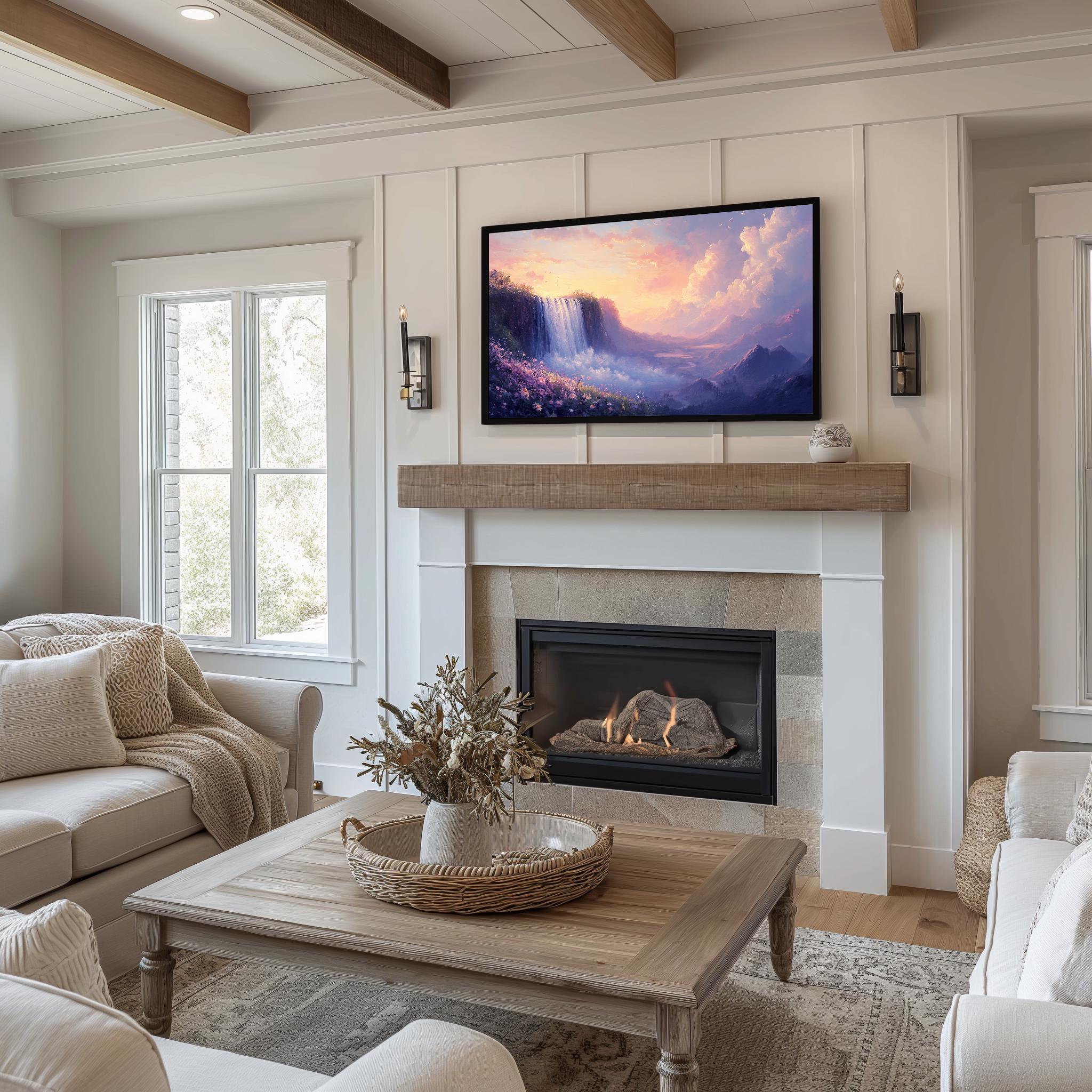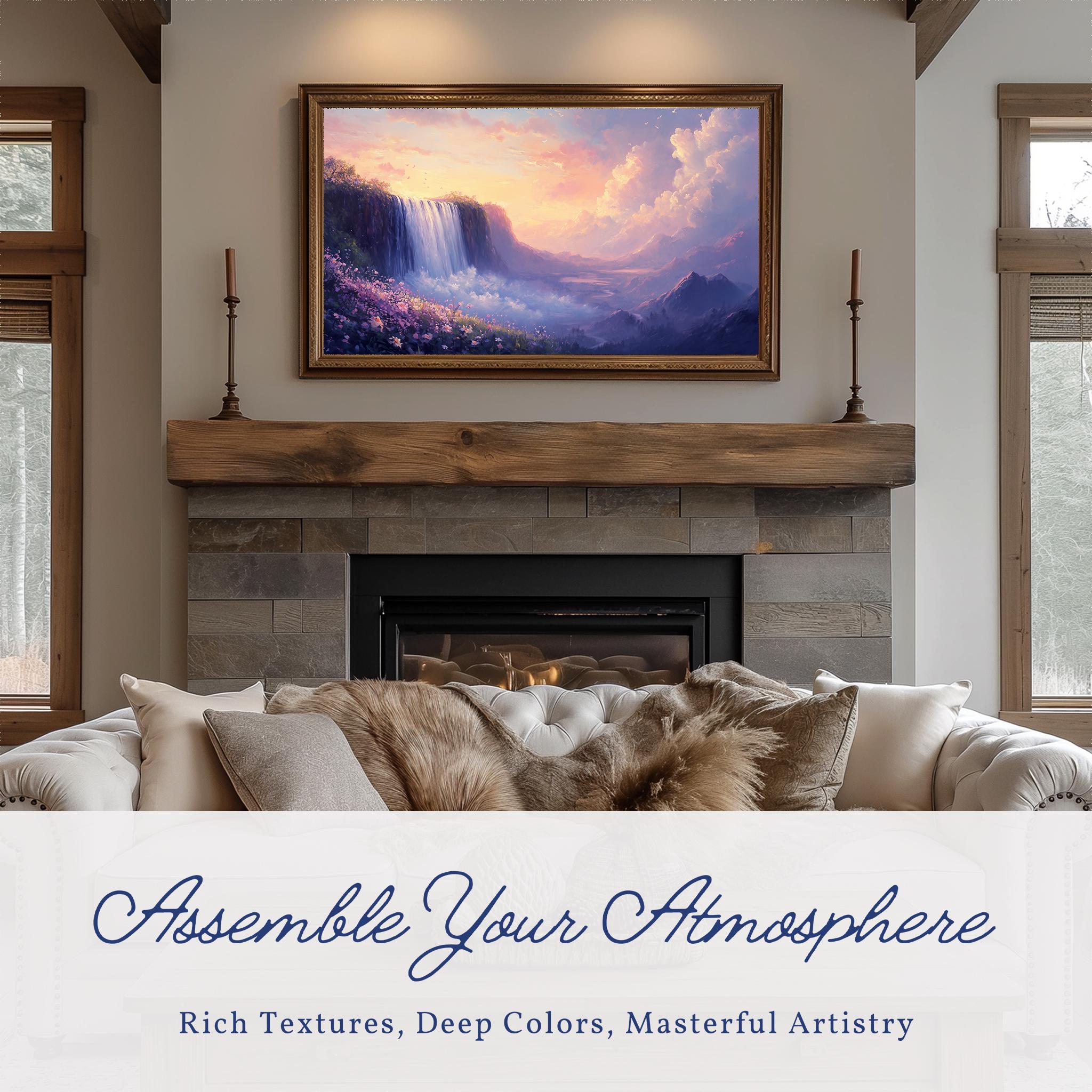 Waterfall Sunset Frame TV Art - A Serene Escape Immerse yourself in the breathtaking beauty of nature with our Waterfall Sunset Frame TV Art. This stunning landscape painting captures the tranquility of a cascading waterfall set against a vibrant sunset. Perfect for enhancing your home decor, this digital download transforms your Samsung Frame TV into a captivating scenic view, inviting the essence of serene landscapes into your living space. Ideal for art lovers looking to bring a touch of nature's beauty indoors. Ideal for year-round enjoyment, bringing warmth and tranquility to any season.
