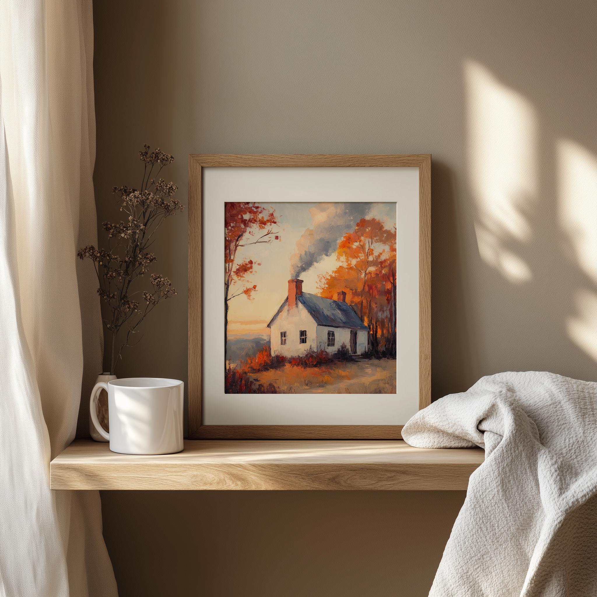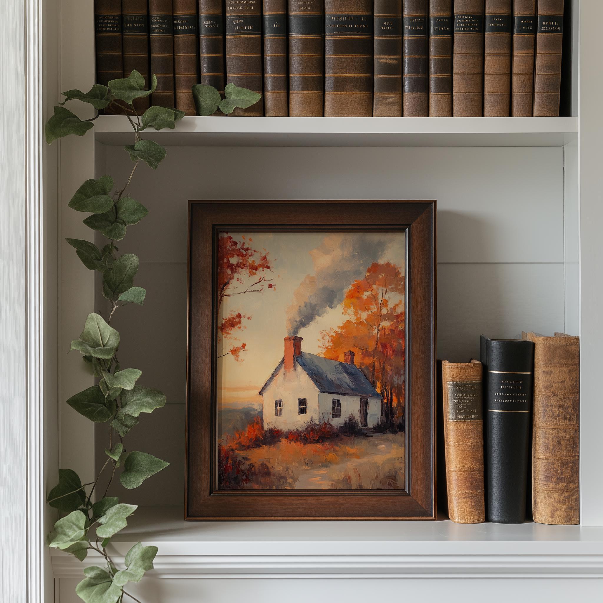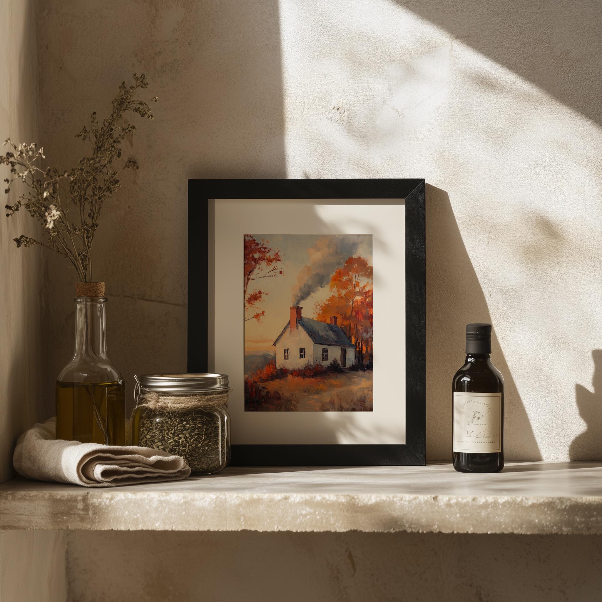 Rustic Autumn Cottage Painting: Vintage Countryside Landscape (Digital Print)
