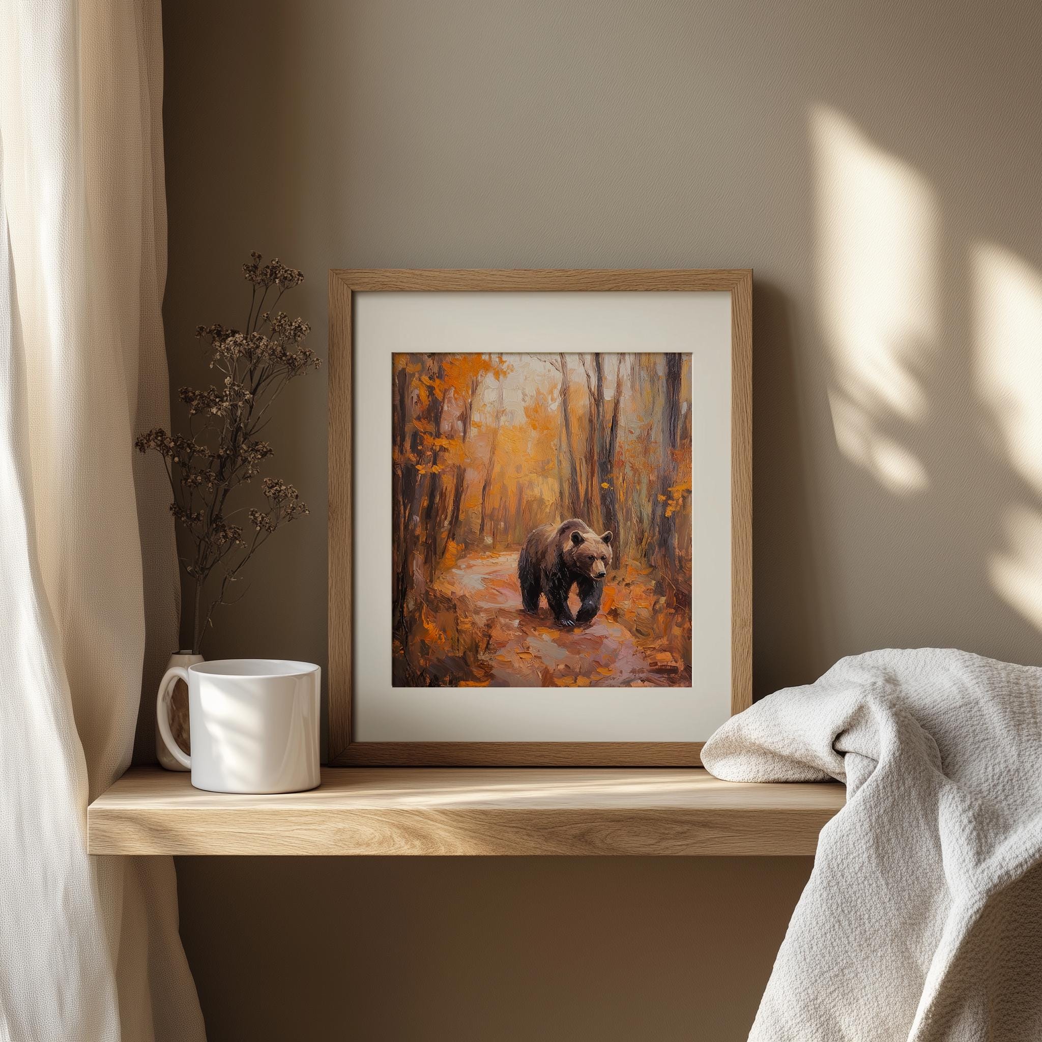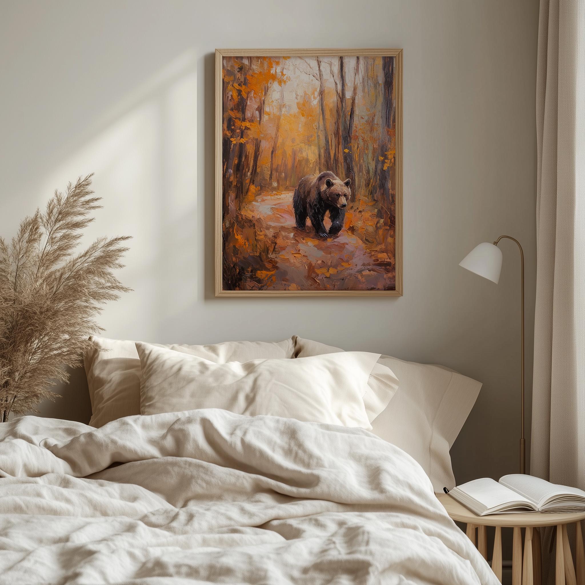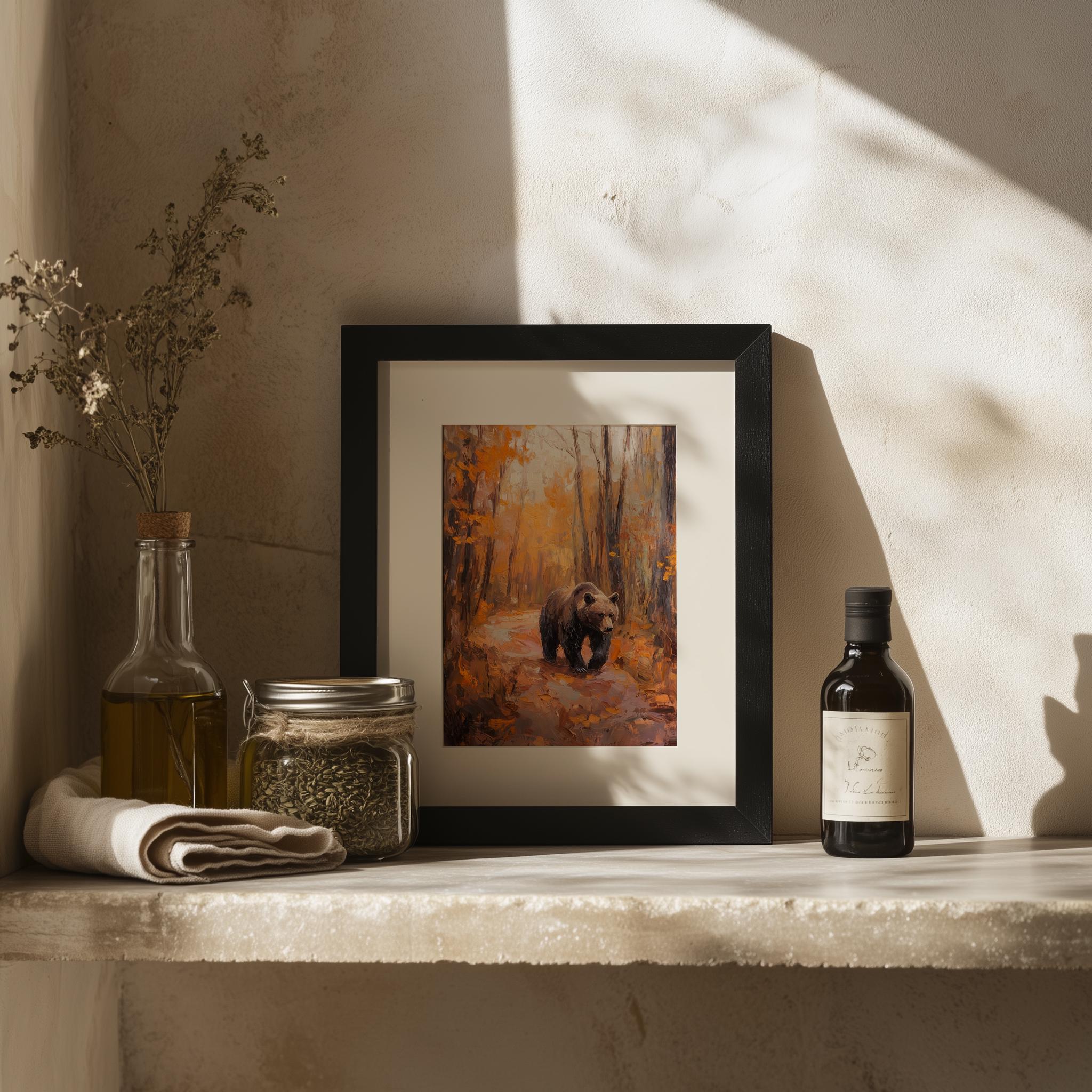 Autumn Forest Path with Bear - A Serene Escape into Nature's Embrace This stunning art print captures the essence of a tranquil autumn forest path, where a majestic bear roams amidst the vibrant fall foliage. Perfect for adding a touch of rustic charm to your home, this artwork embodies the spirit of wildlife and the beauty of nature. Ideal for cottagecore enthusiasts, this piece brings warmth and earthiness to your decor, making it a perfect focal point for any room. Fall