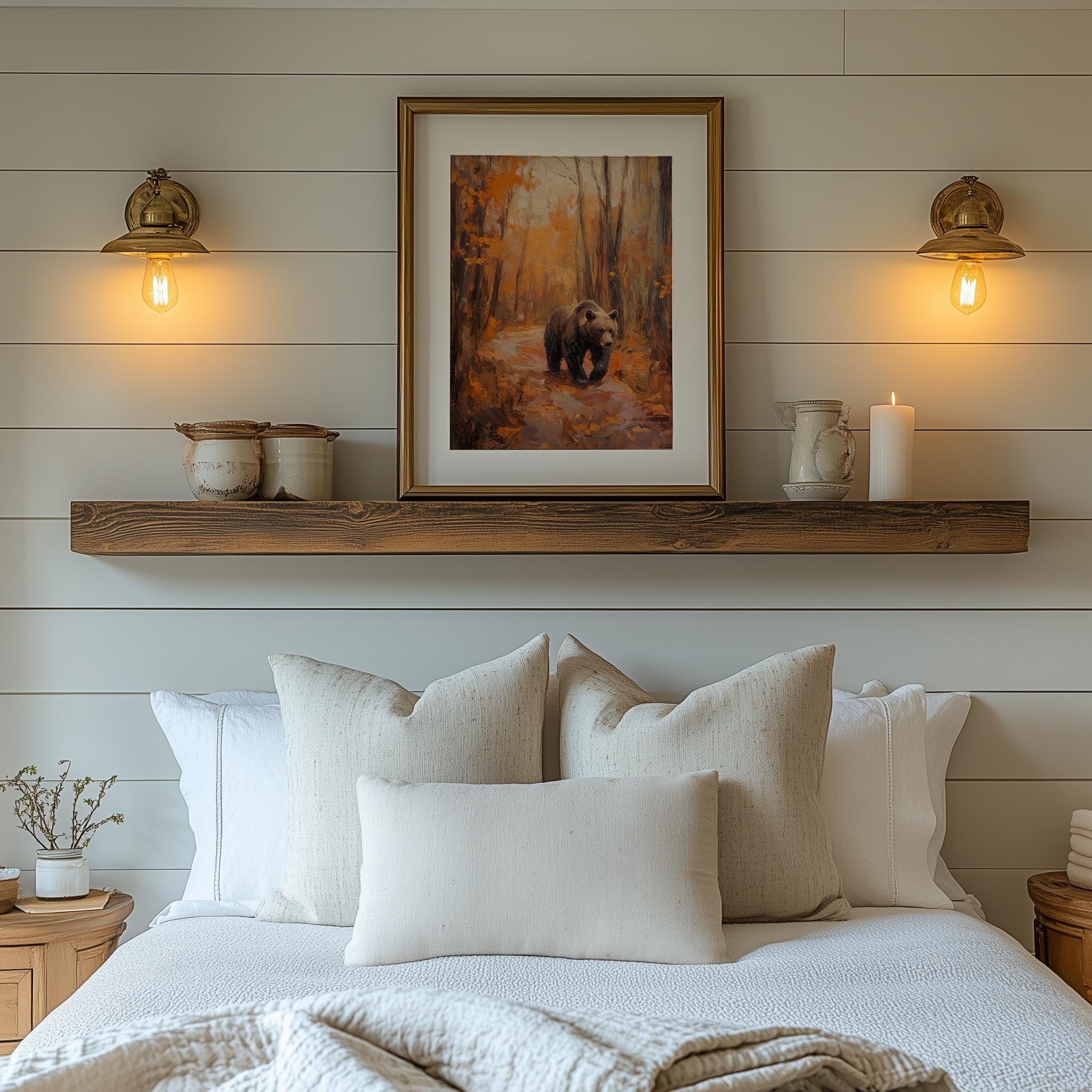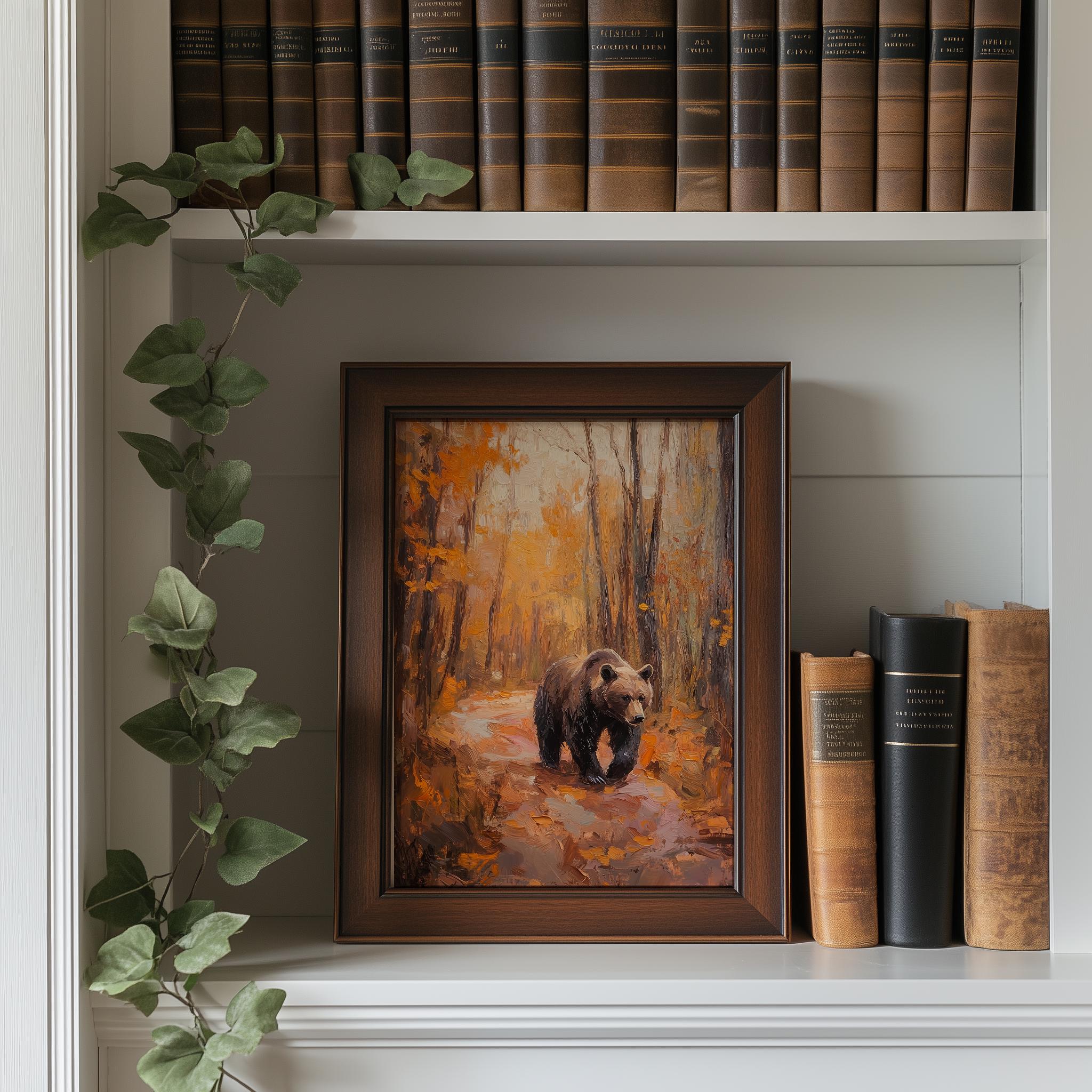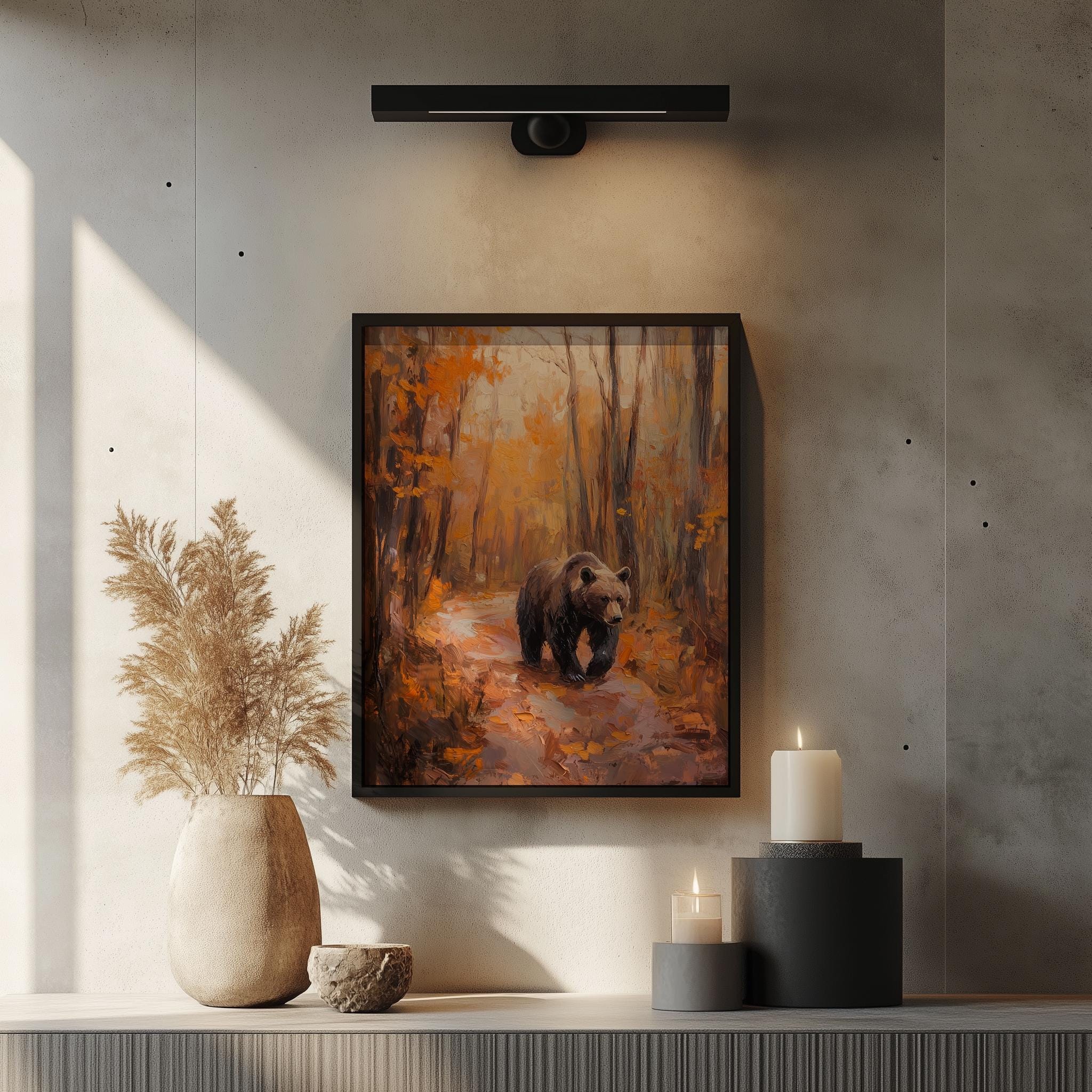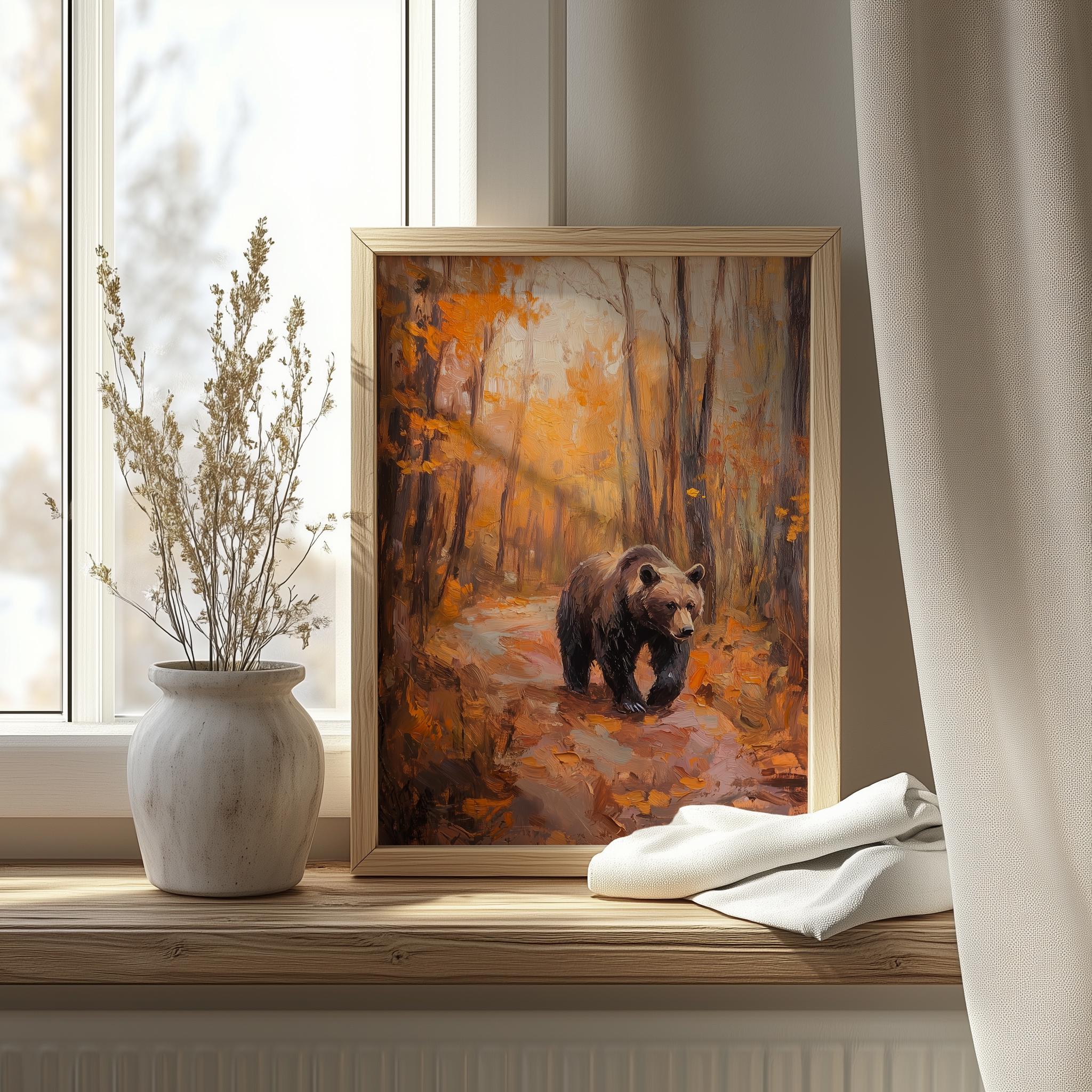 Autumn Forest Path with Bear - A Serene Escape into Nature's Embrace This stunning art print captures the essence of a tranquil autumn forest path, where a majestic bear roams amidst the vibrant fall foliage. Perfect for adding a touch of rustic charm to your home, this artwork embodies the spirit of wildlife and the beauty of nature. Ideal for cottagecore enthusiasts, this piece brings warmth and earthiness to your decor, making it a perfect focal point for any room. Fall