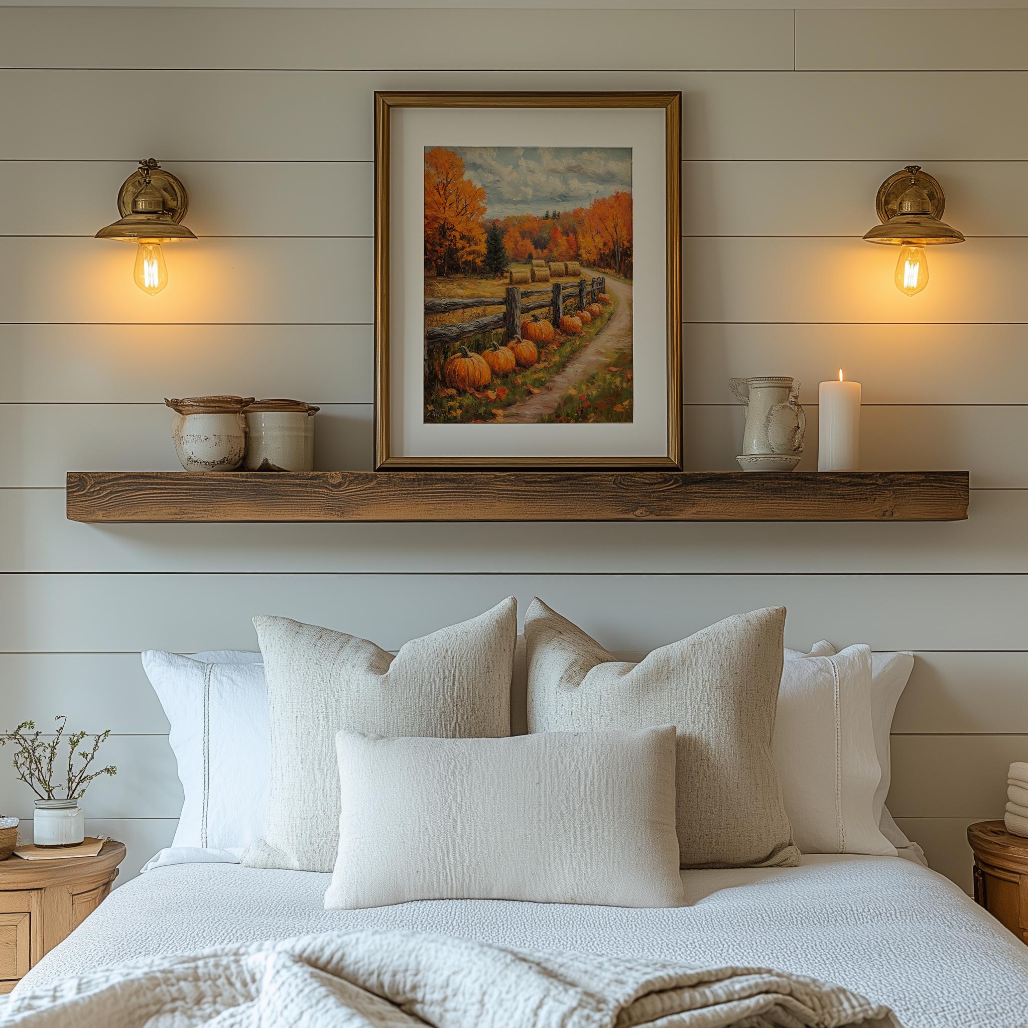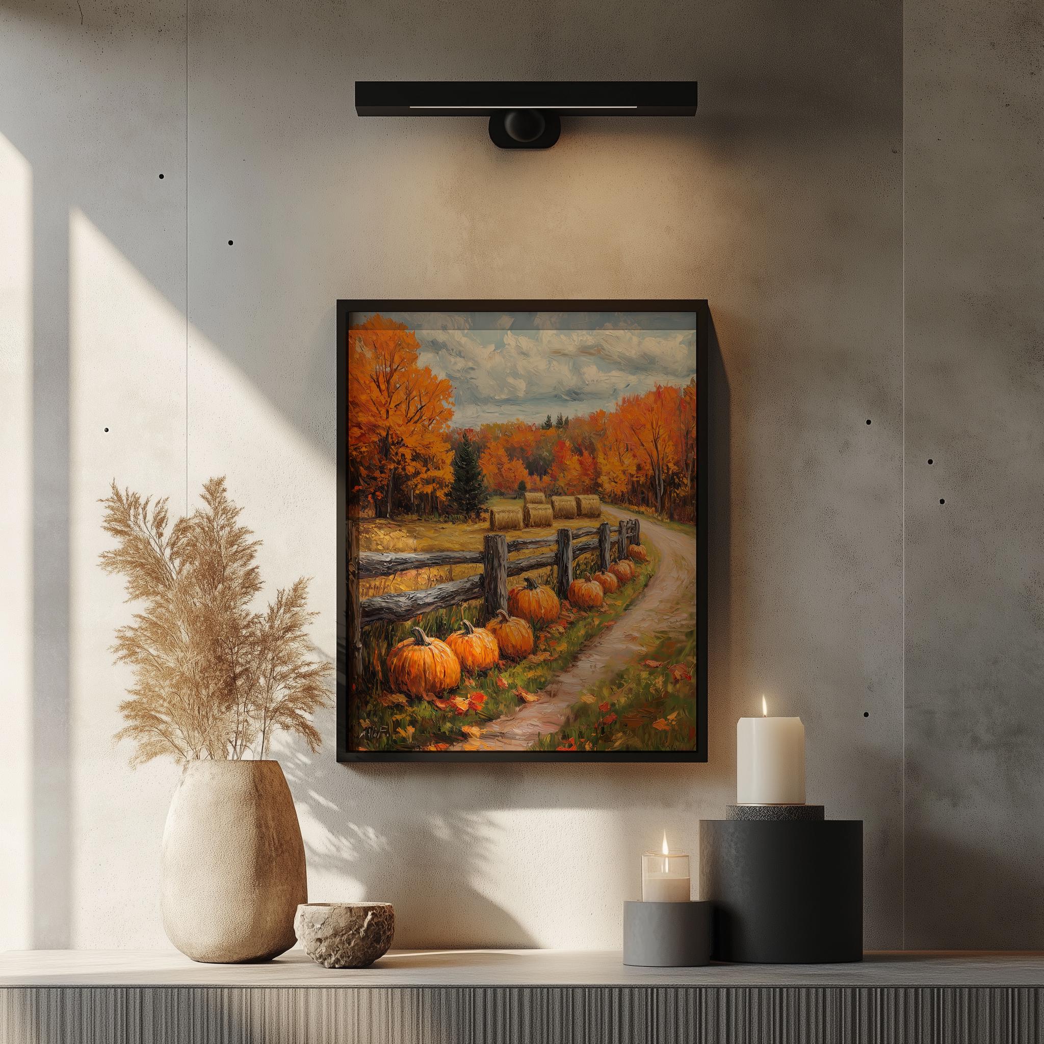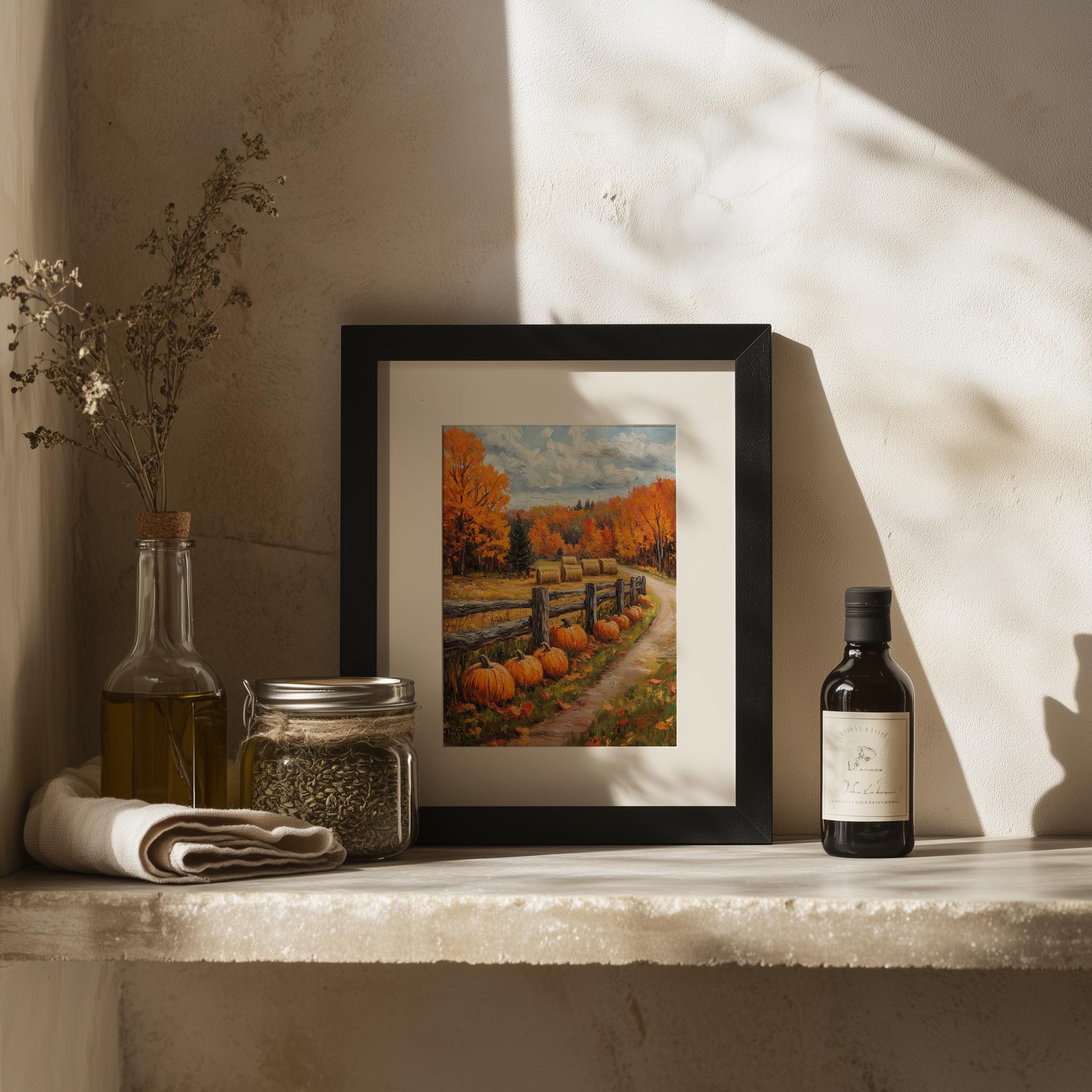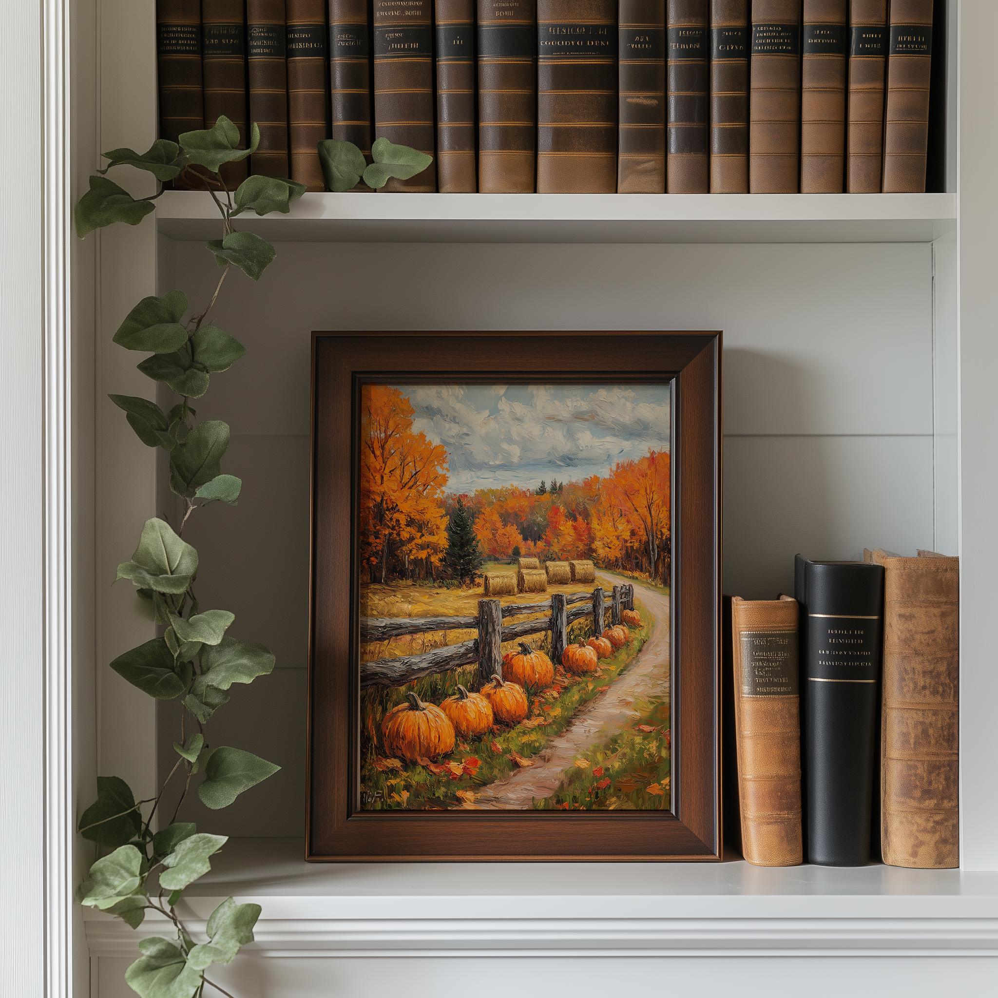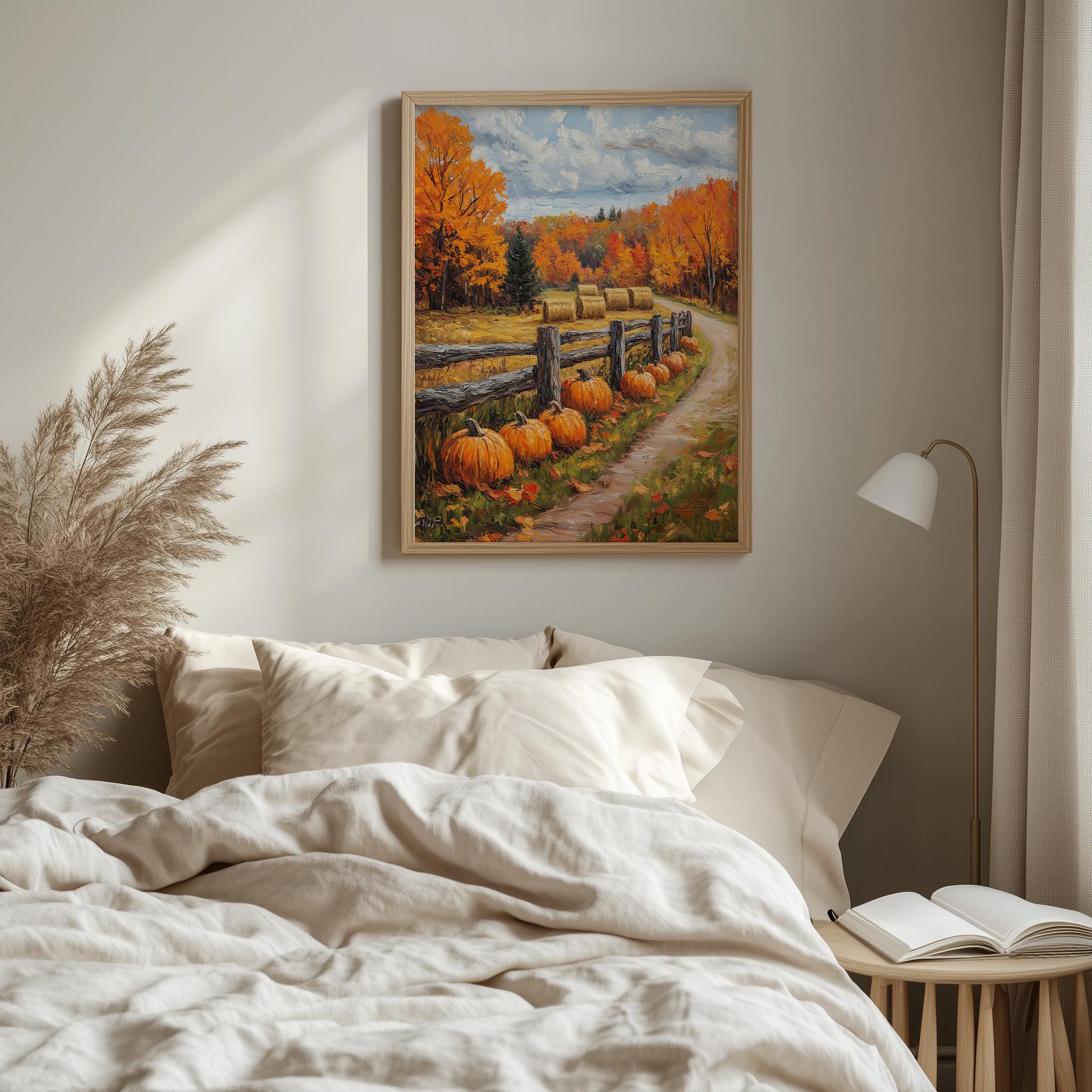 Rustic Autumn Country Lane - Printable Wooden Fence Landscape Art Immerse yourself in the serene beauty of fall with this enchanting landscape art featuring a wooden fence along a tranquil country lane. This printable piece captures the essence of autumn, showcasing earthy tones and the rustic charm of the countryside, making it a perfect addition to your home decor. Autumn