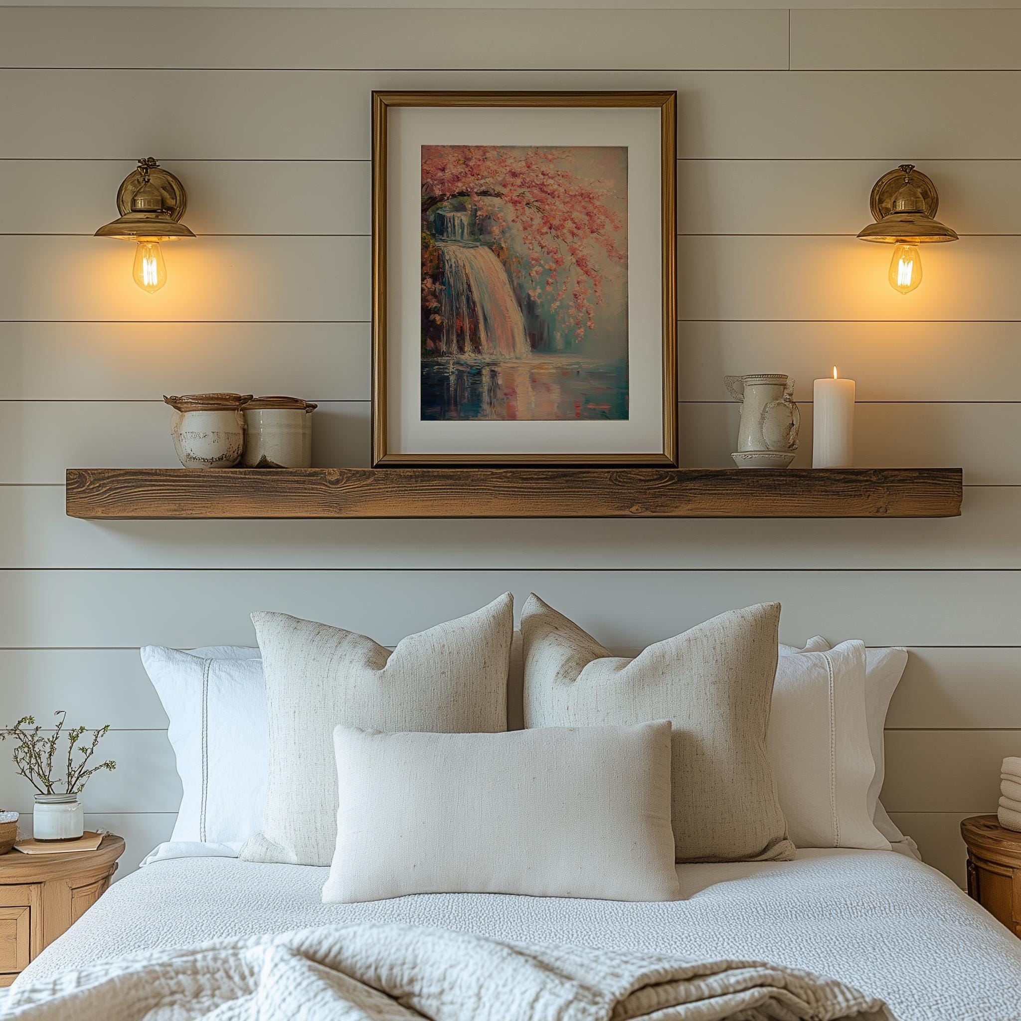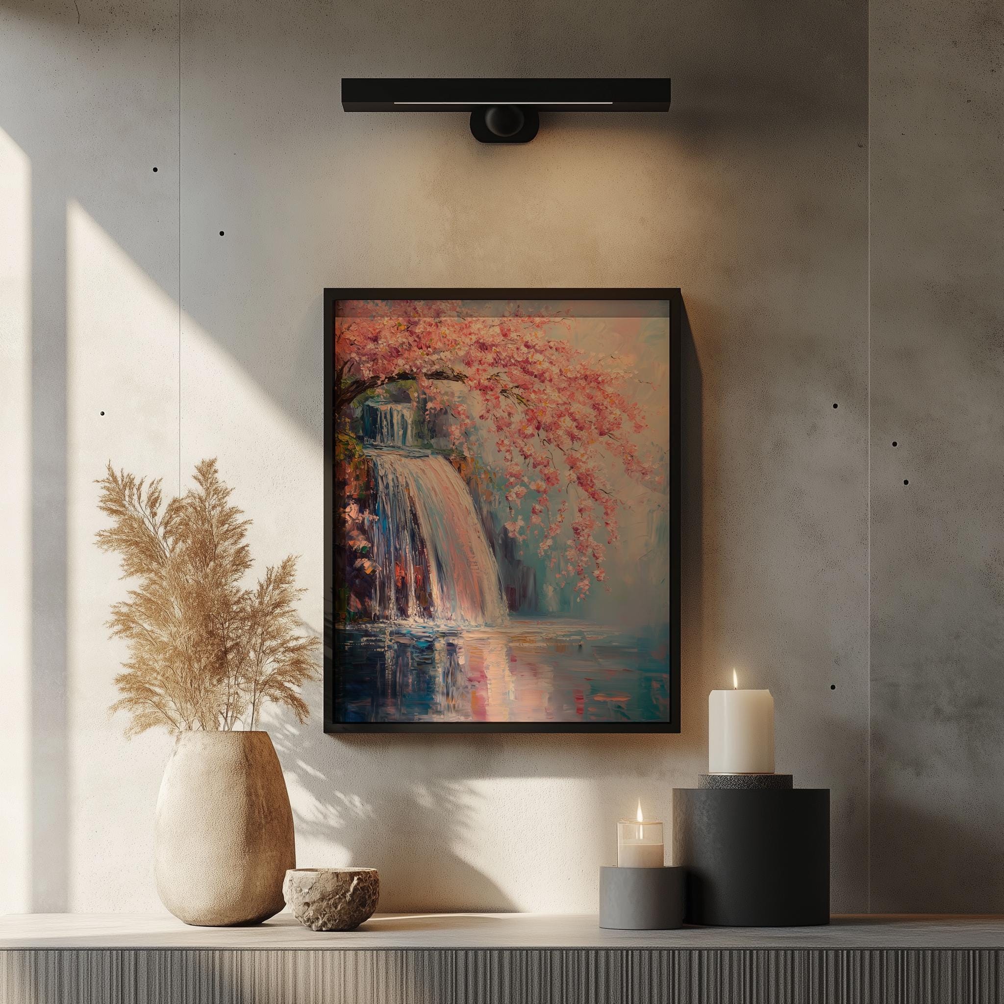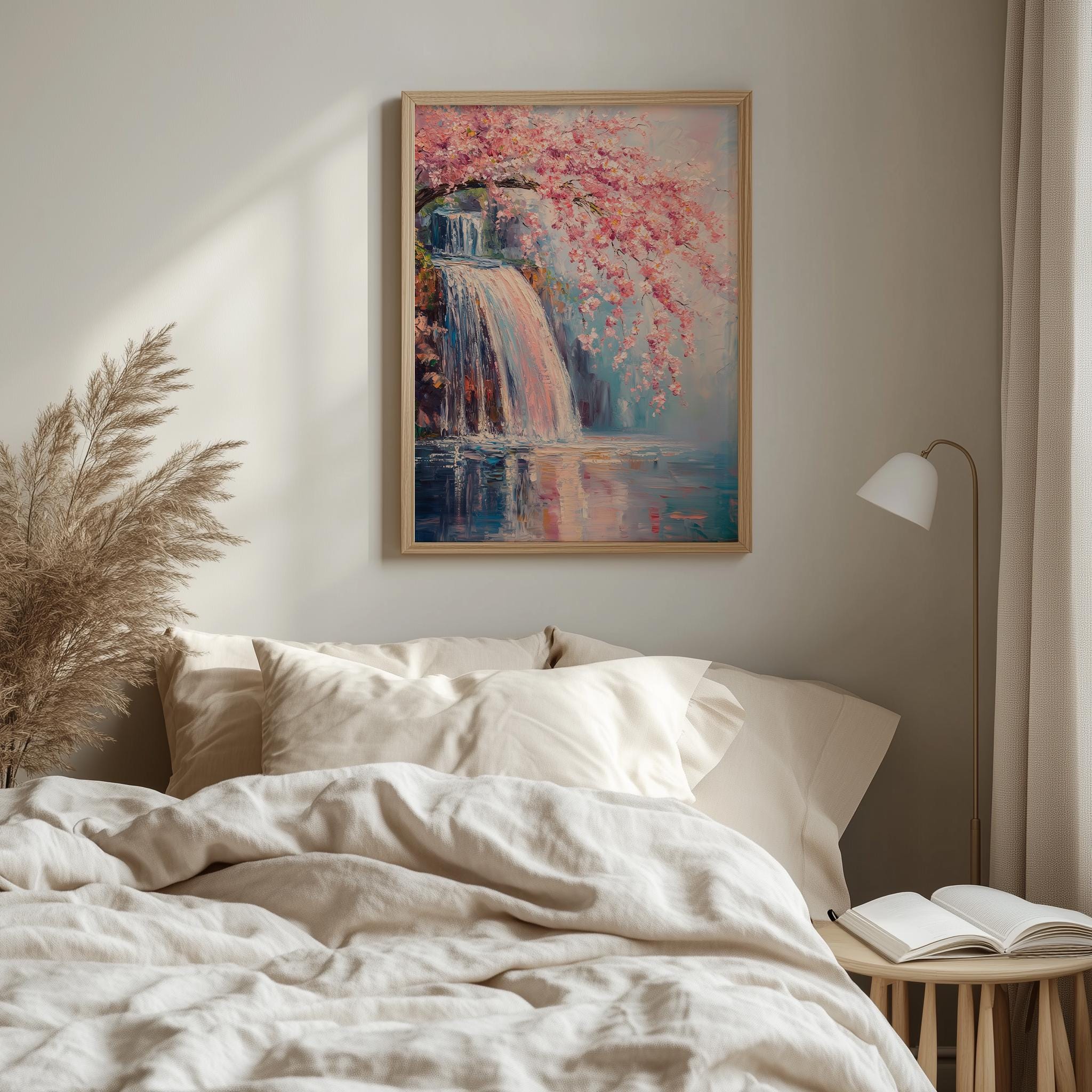 Cherry Blossoms and Waterfall Painting - Soft Glow Earthy Spring Wall Art This stunning digital art print captures the serene beauty of cherry blossoms cascading over a tranquil waterfall, enveloped in a soft, warm glow. Perfect for bringing a touch of nature into your space, this printable decor piece embodies the essence of spring and the cozy charm of cottagecore aesthetics. Ideal for anyone looking to add a vintage style art piece to their home, this watercolor-inspired landscape invites tranquility and joy into any room. Spring