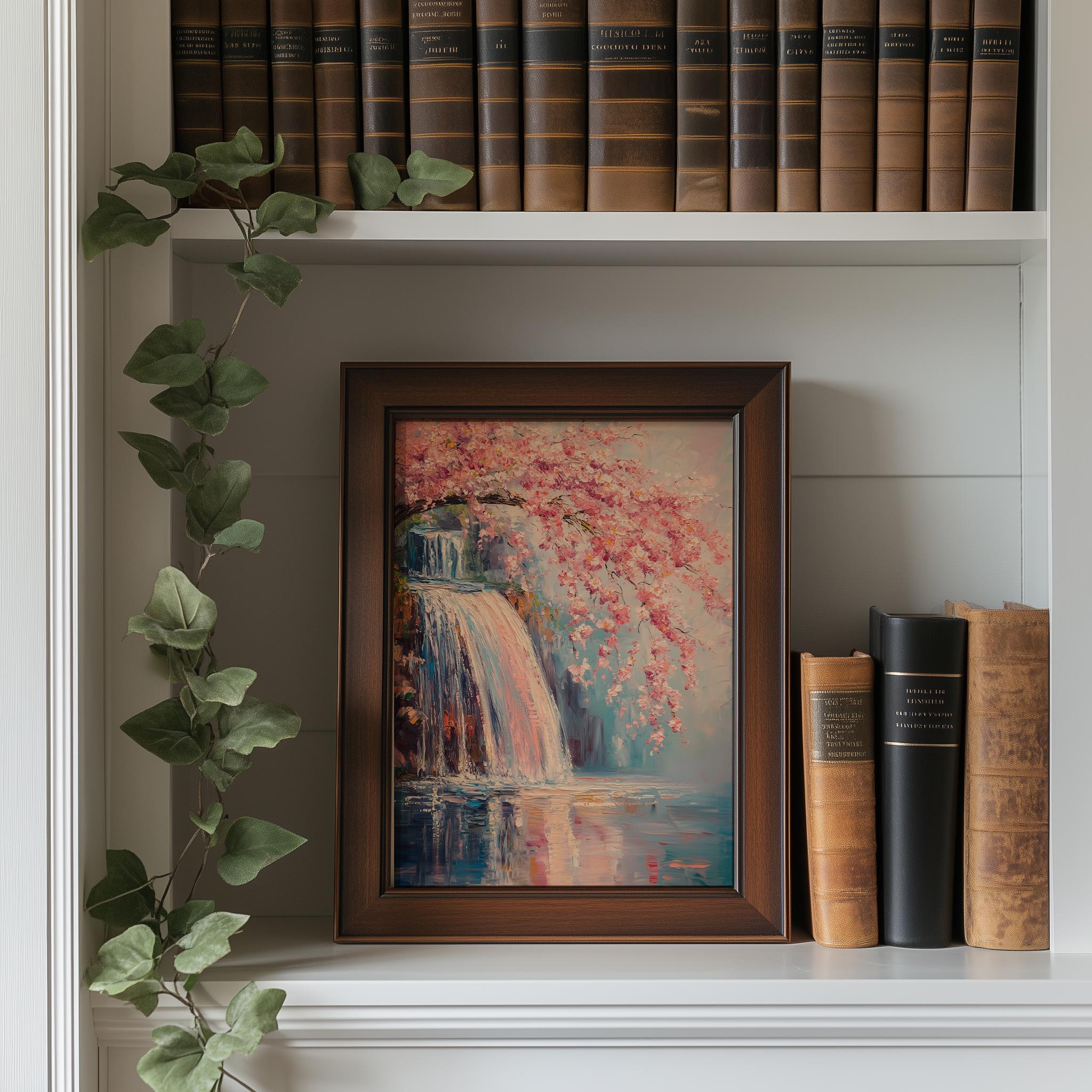 Cherry Blossom Waterfall Painting: Earthy Cottagecore Spring Wall Art (Digital Print)