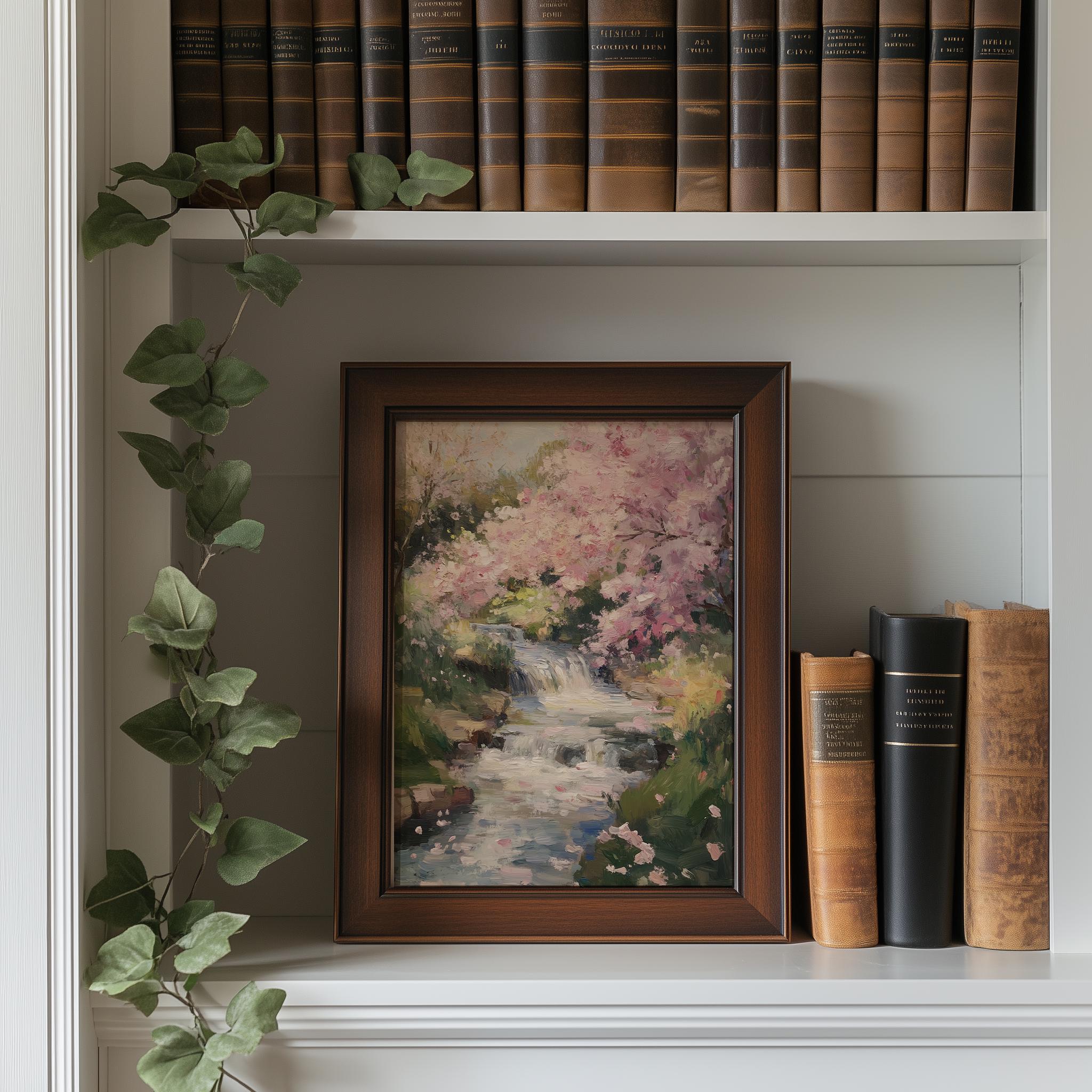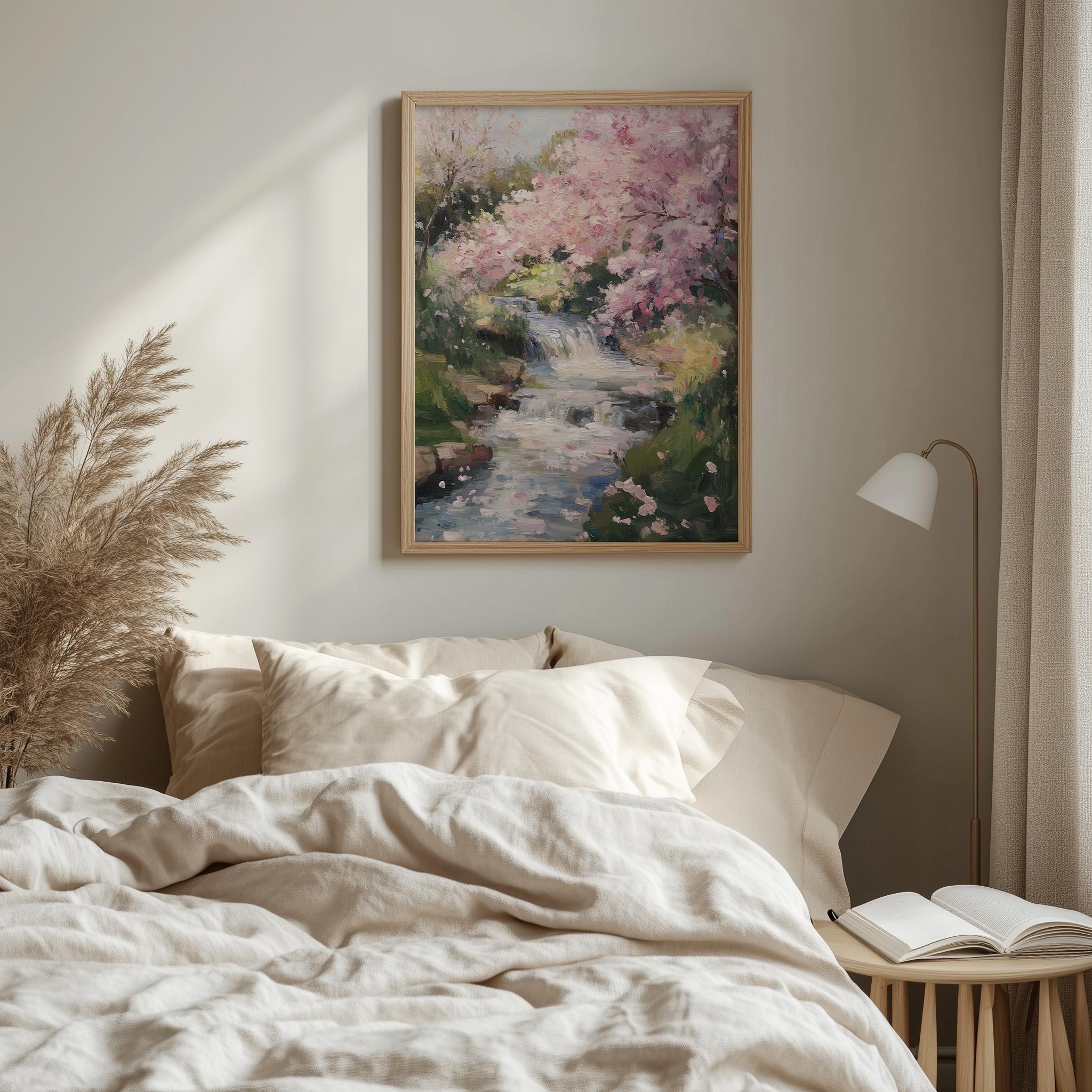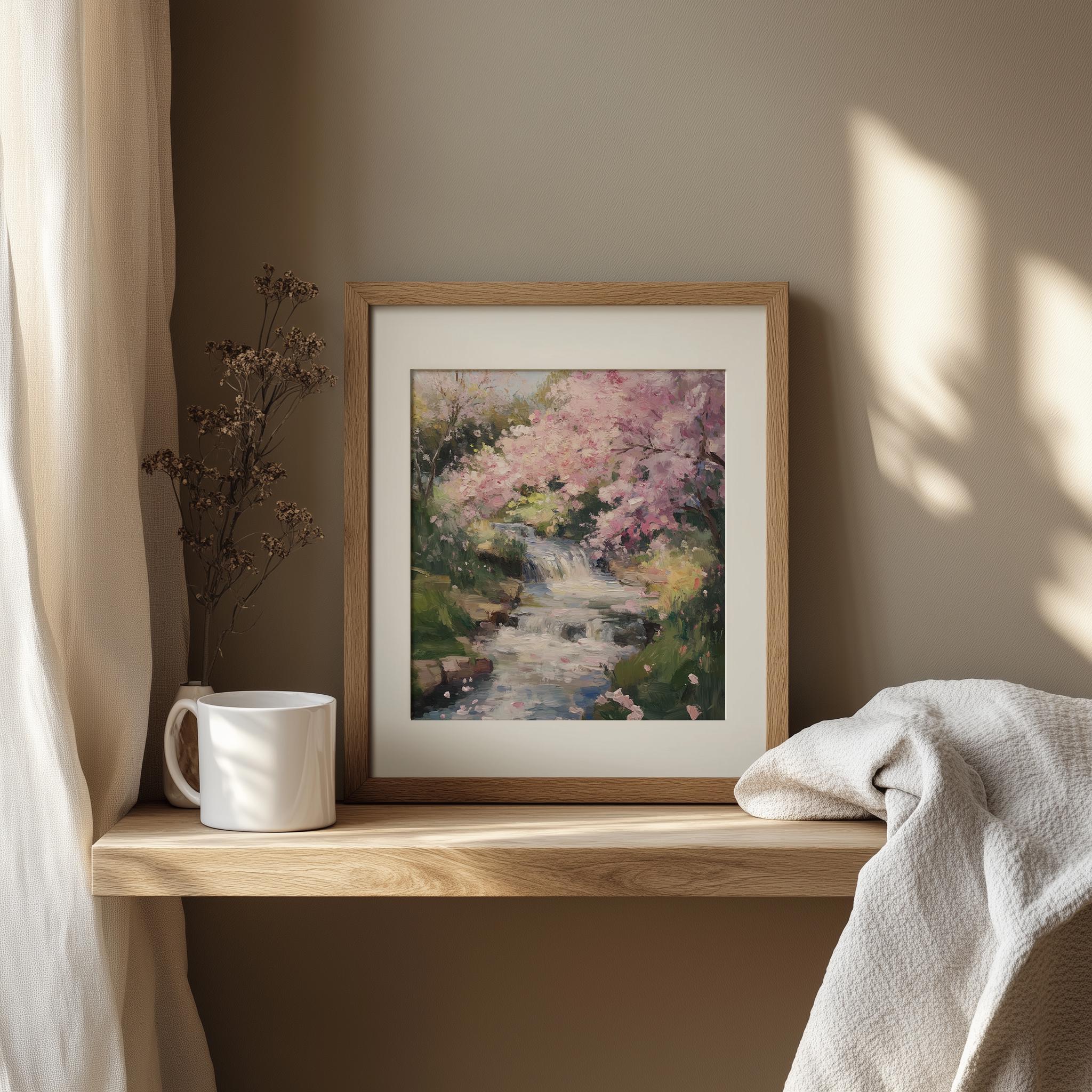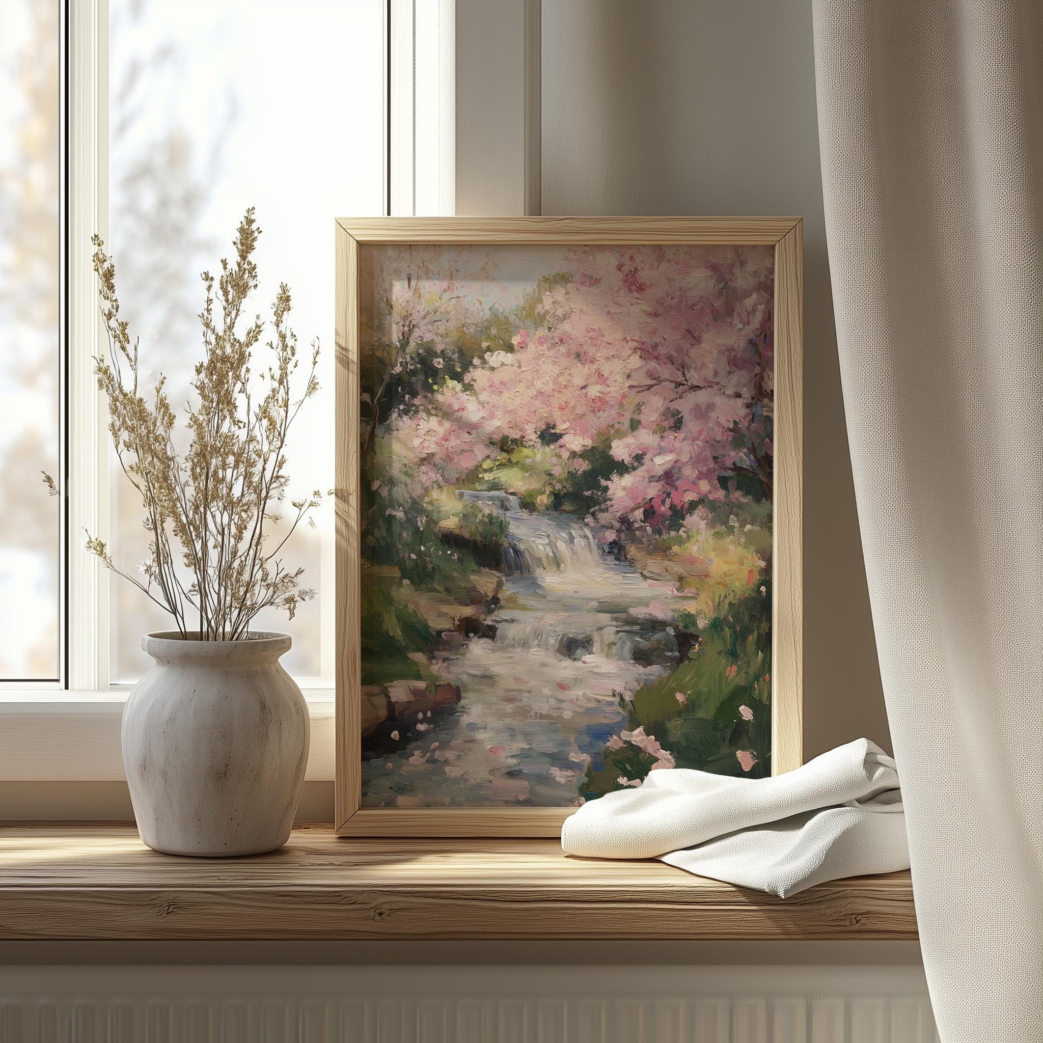 Spring Cherry Blossom Stream - Printable Wall Art, Vintage Landscape Painting Immerse yourself in the serene beauty of nature with this stunning digital print featuring a cascading waterfall framed by delicate cherry blossom trees. This vintage landscape painting captures the essence of spring, making it a perfect addition to your home decor. Ideal for those who appreciate rustic cottagecore aesthetics, this artwork brings a touch of tranquility and charm to any space. Spring