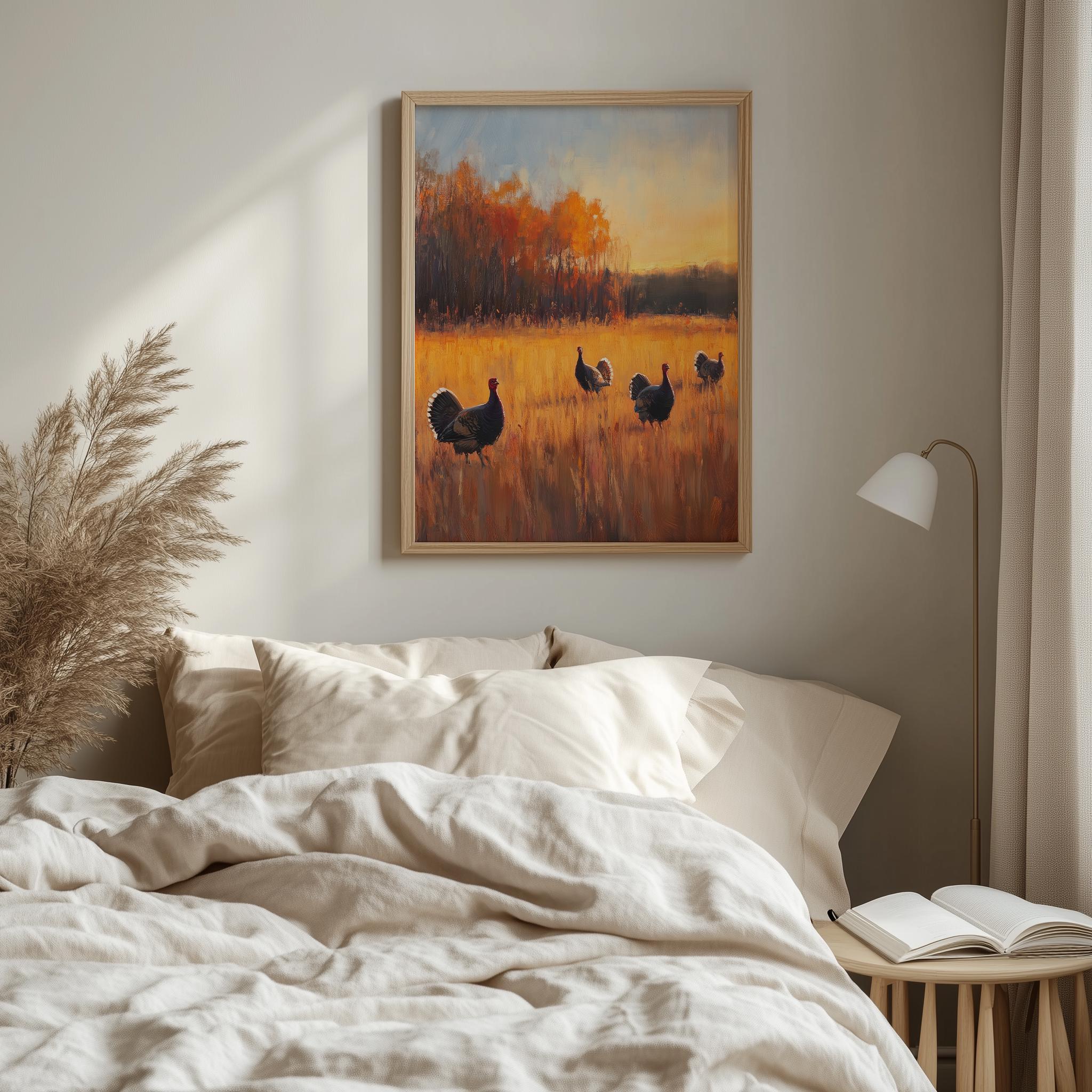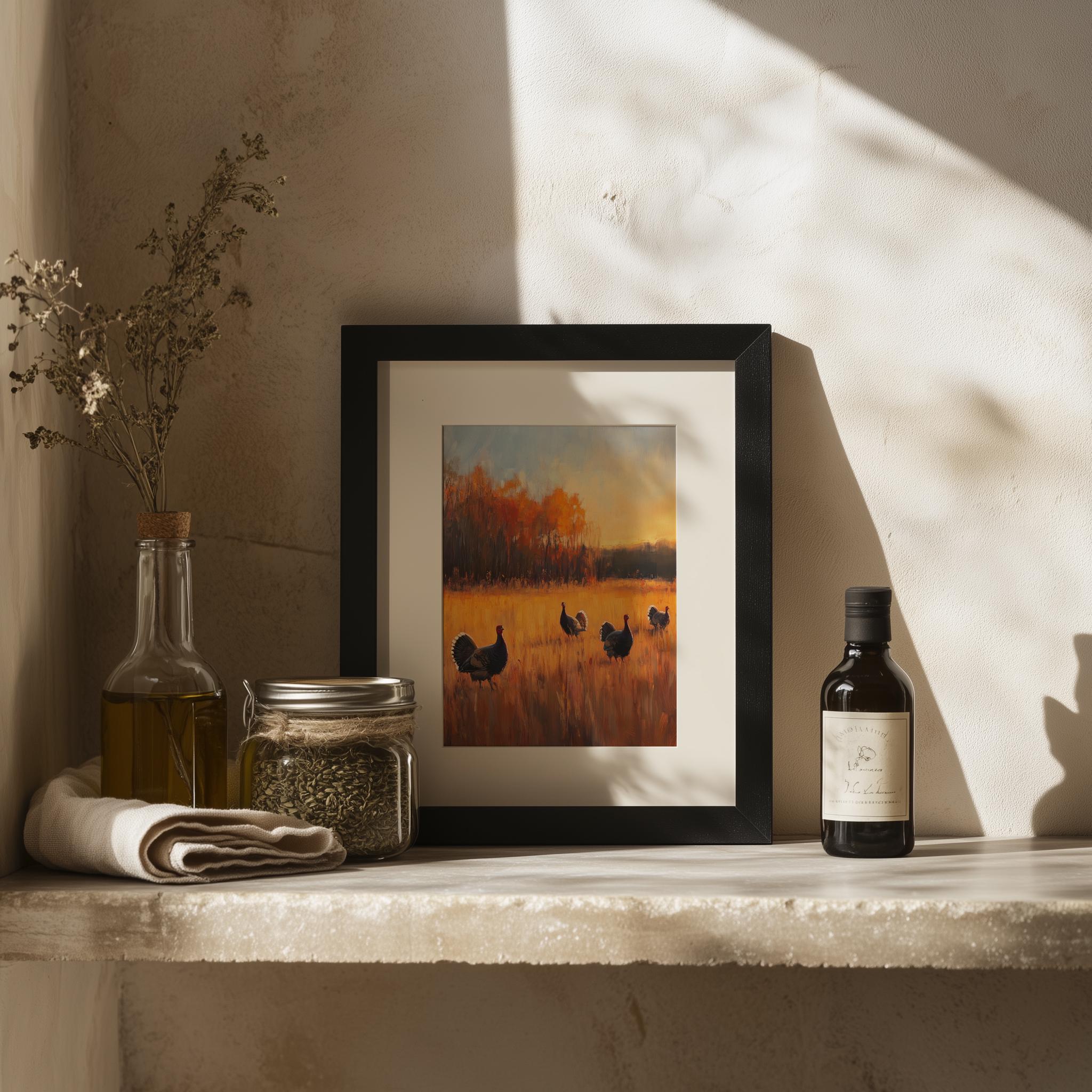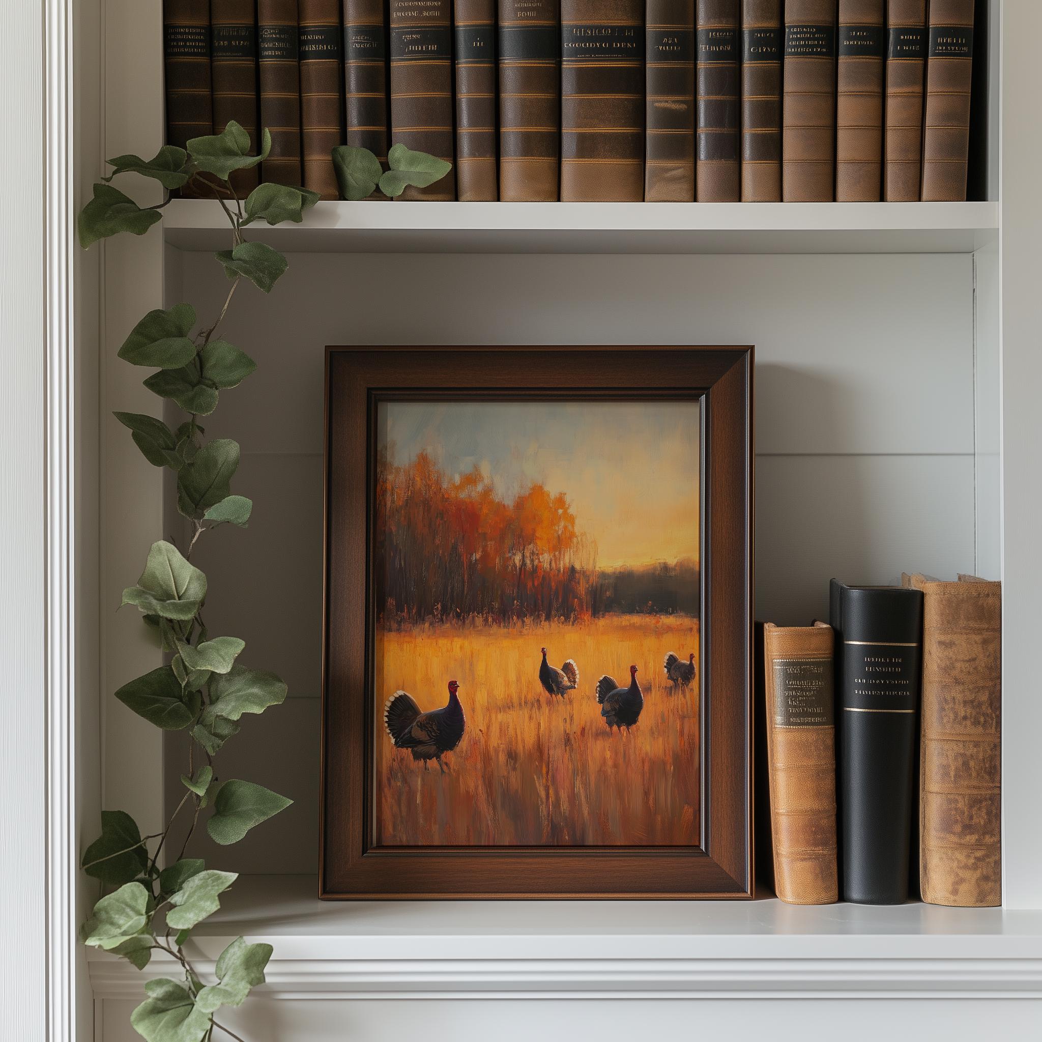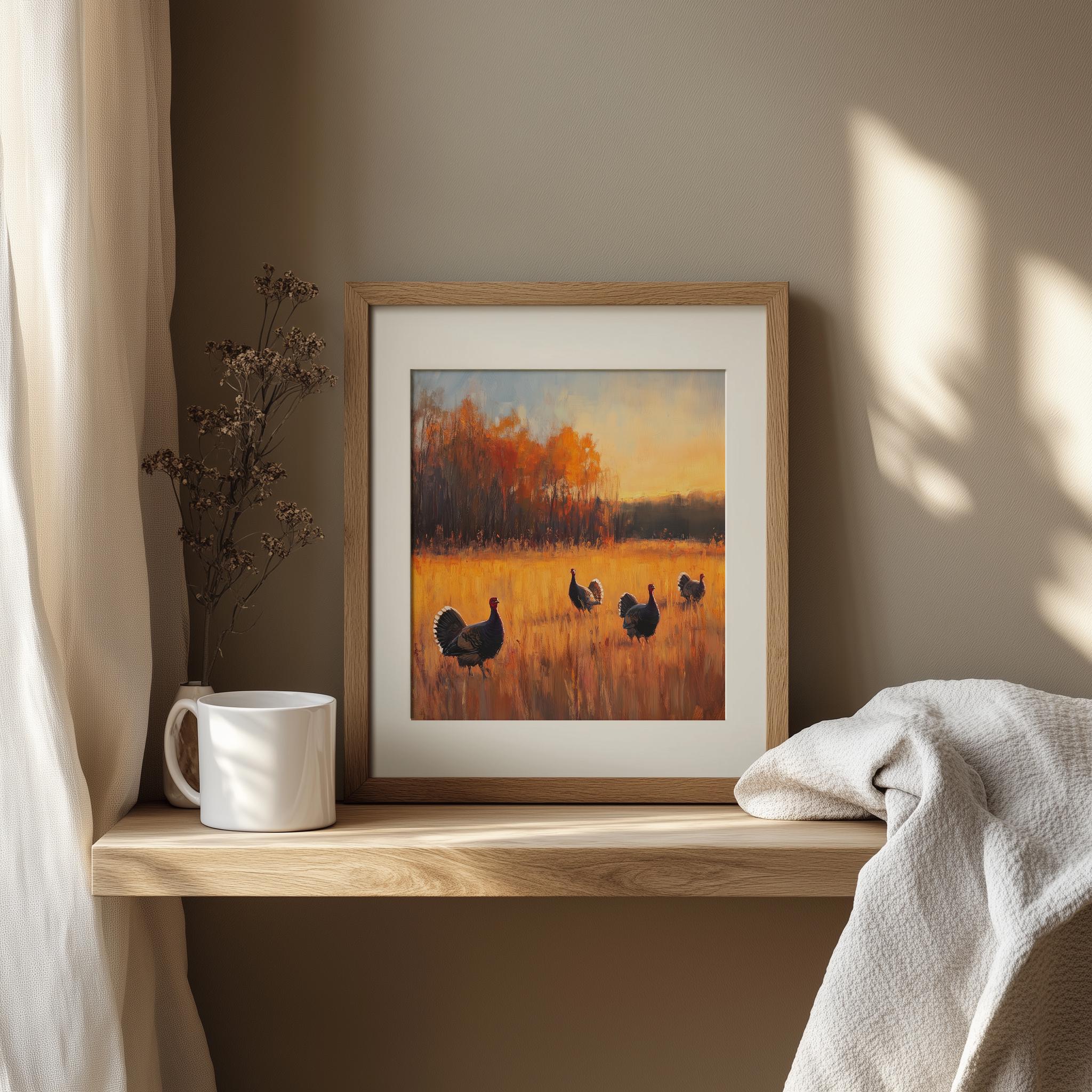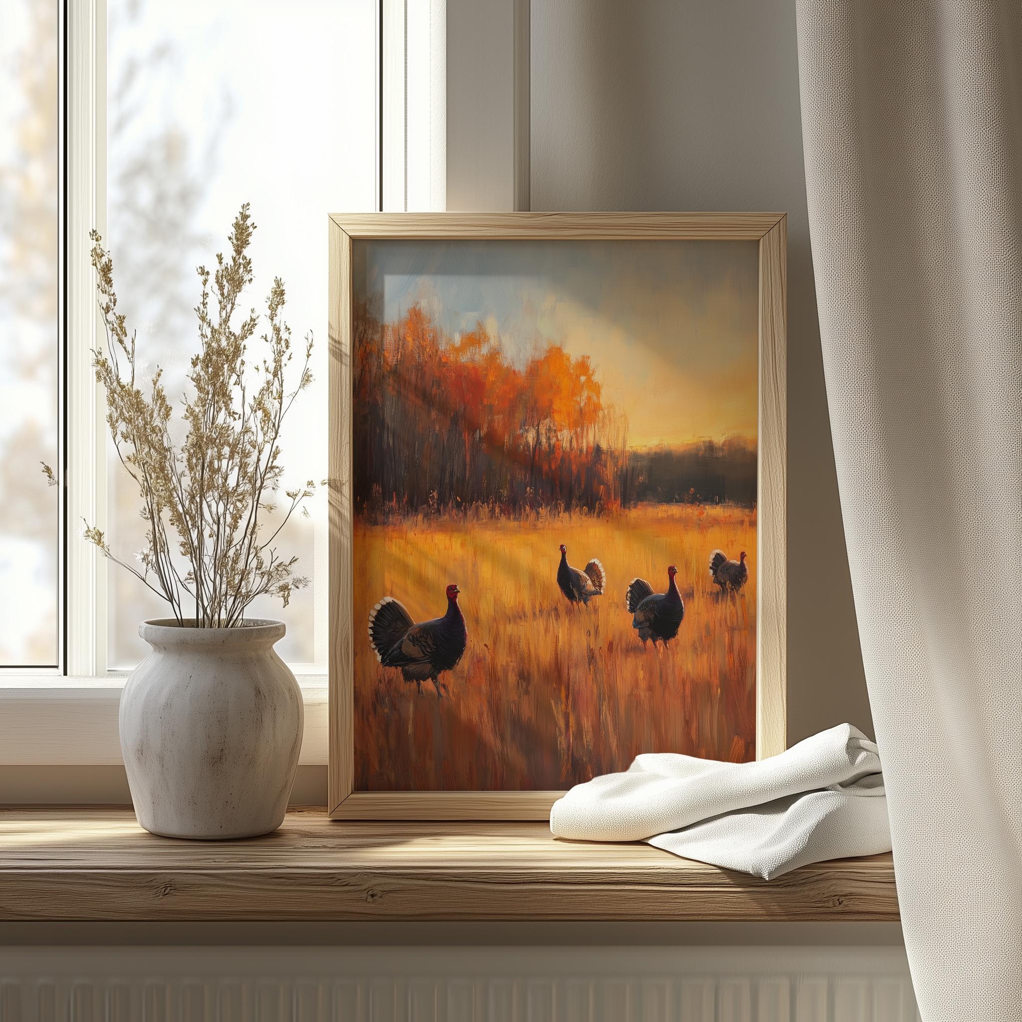 Wild Turkeys Sunset Landscape Art Print: Rustic Meadow Scene (Digital Download)