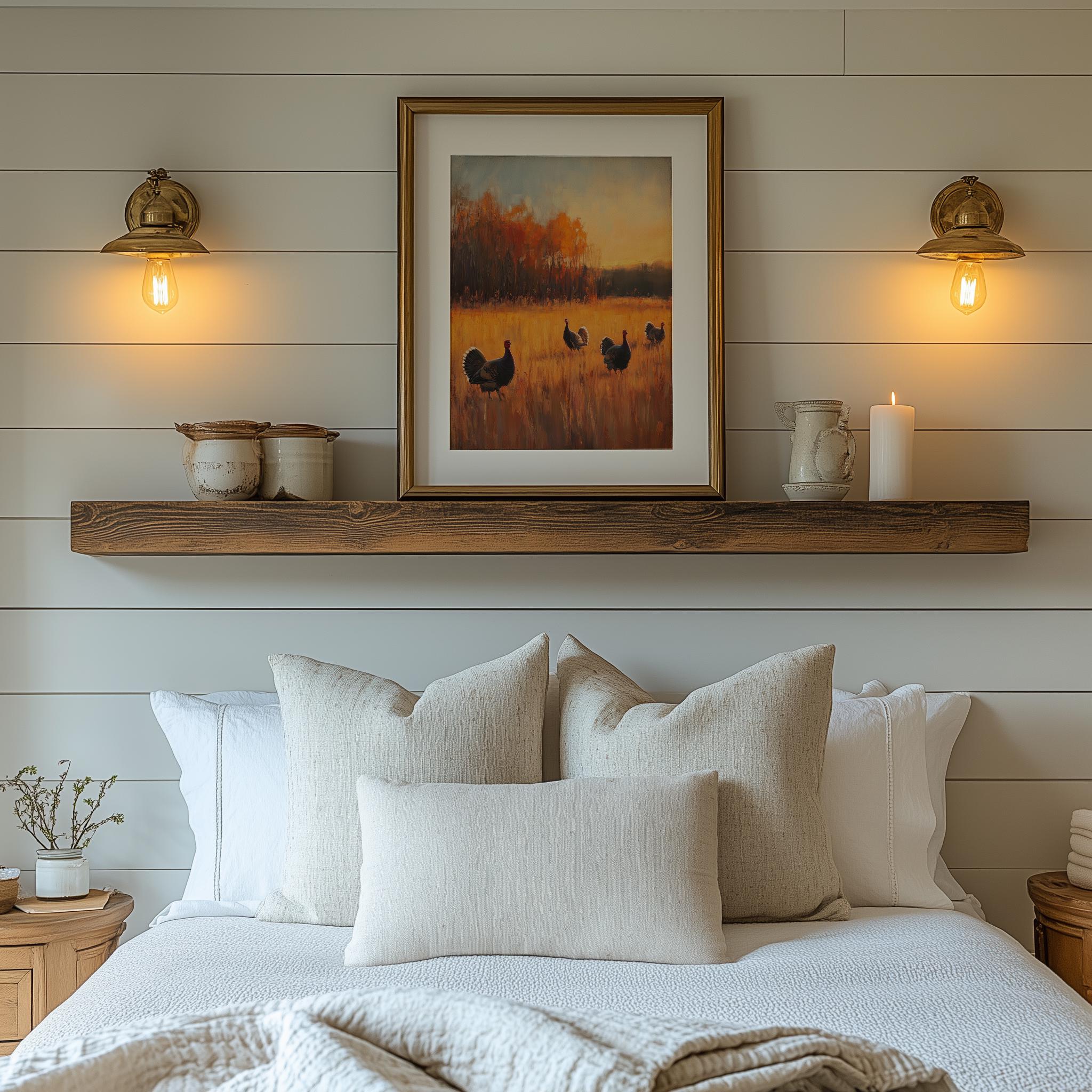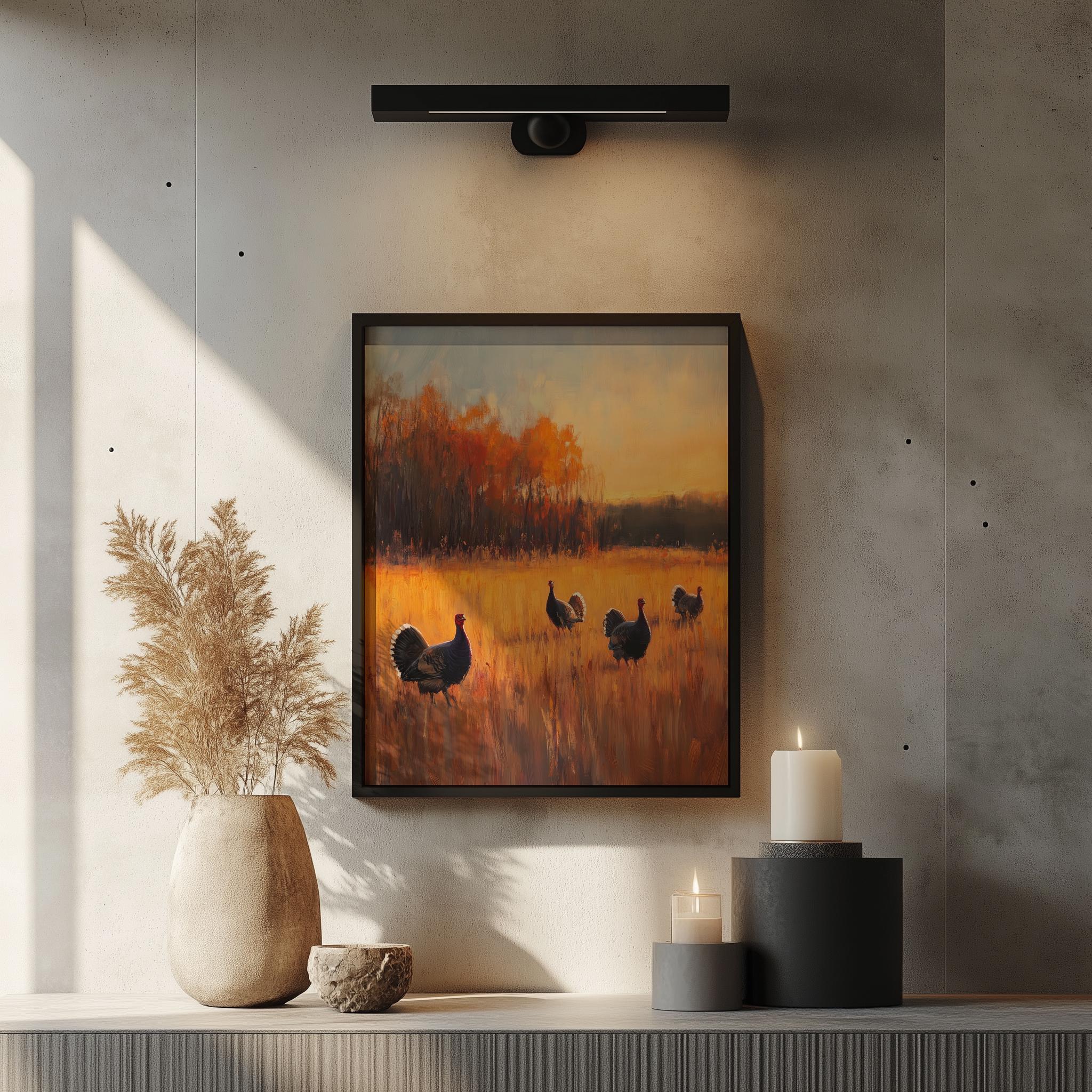 Autumn Wild Turkeys in Meadow - Rustic Sunset Landscape Art Capture the essence of fall with this stunning depiction of wild turkeys grazing peacefully in a sunlit meadow. The warm hues of the sunset blend beautifully with the rich colors of autumn foliage, making this piece a perfect addition to your rustic decor. Ideal for nature lovers and those who appreciate the charm of cottagecore aesthetics, this printable art will bring a touch of tranquility and warmth to any space. Fall
