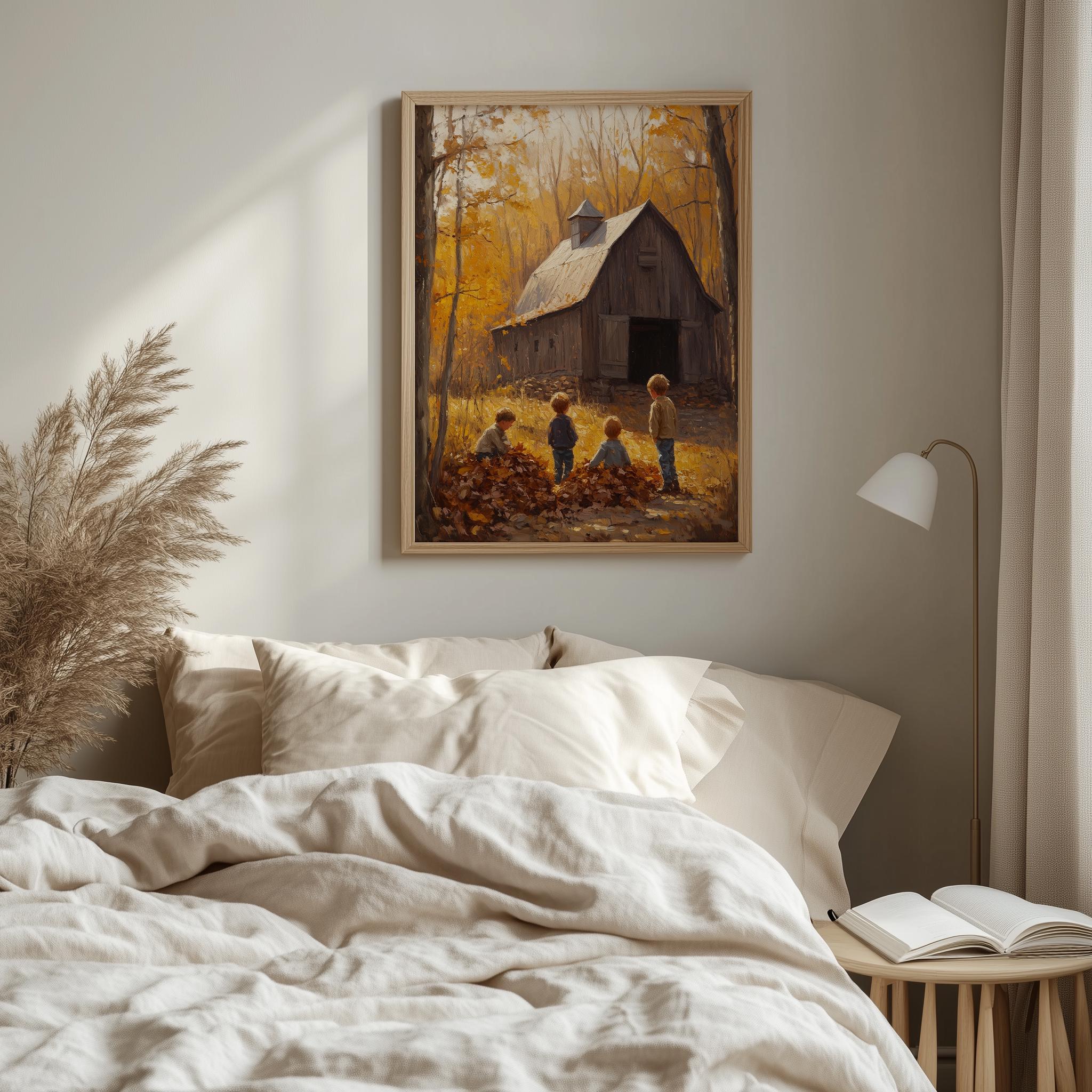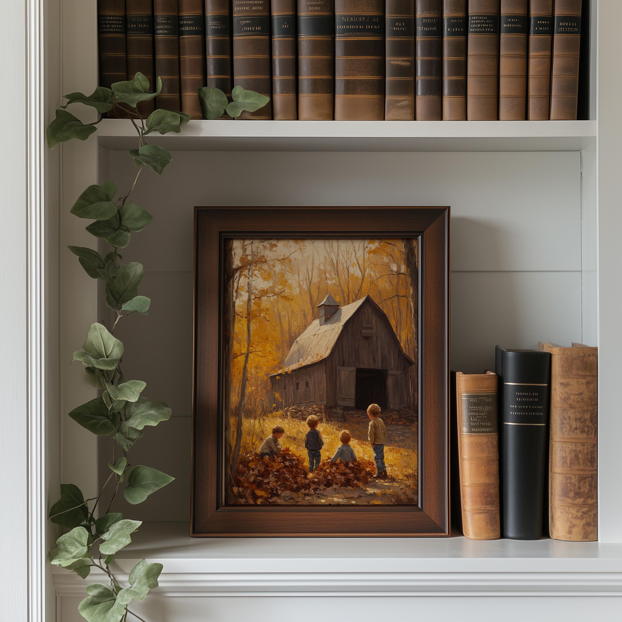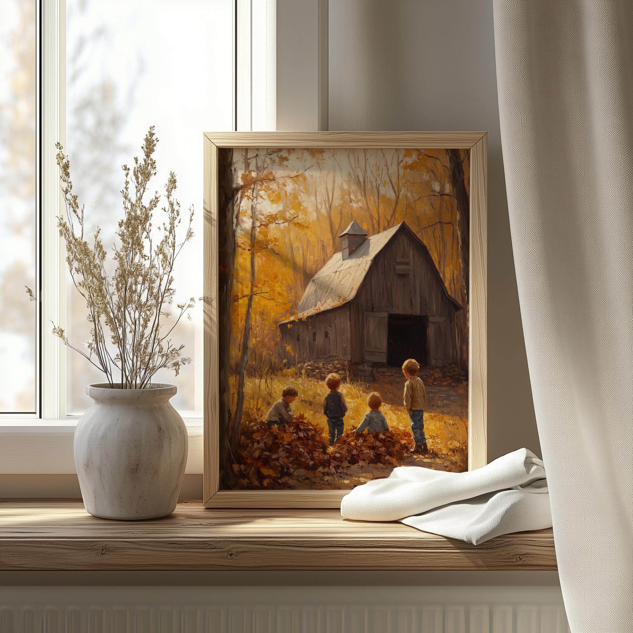 Rustic Autumn Barn Scene - Children Playing in Leaves, Vintage Fall Landscape Art, Printable Wall Decor Step into a cozy fall day with this enchanting artwork that captures the essence of autumn. Delight in the whimsical scene of children joyfully playing in a cascade of colorful leaves, set against the backdrop of a charming vintage barn. This printable wall decor piece brings warmth and nostalgia to your space, perfect for creating a serene and inviting atmosphere in your home. Fall